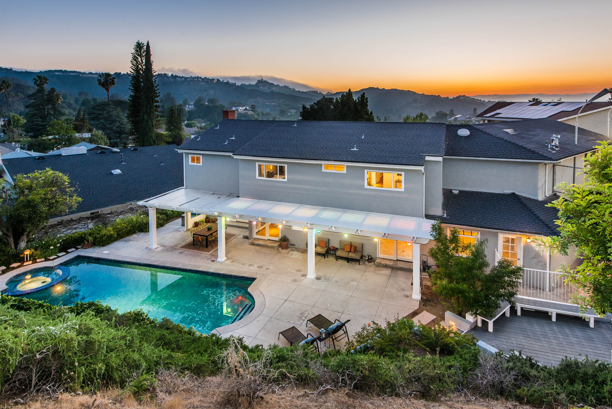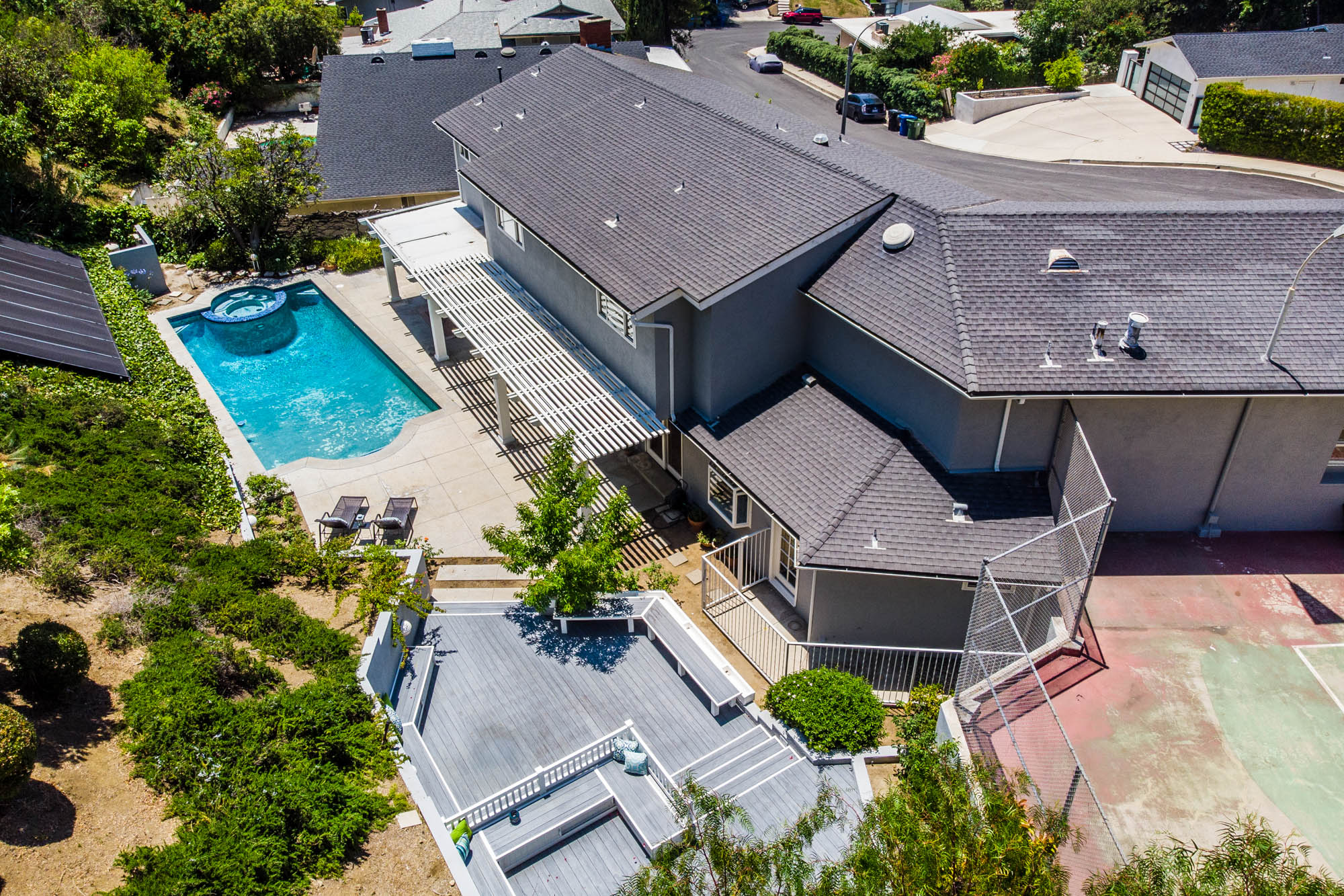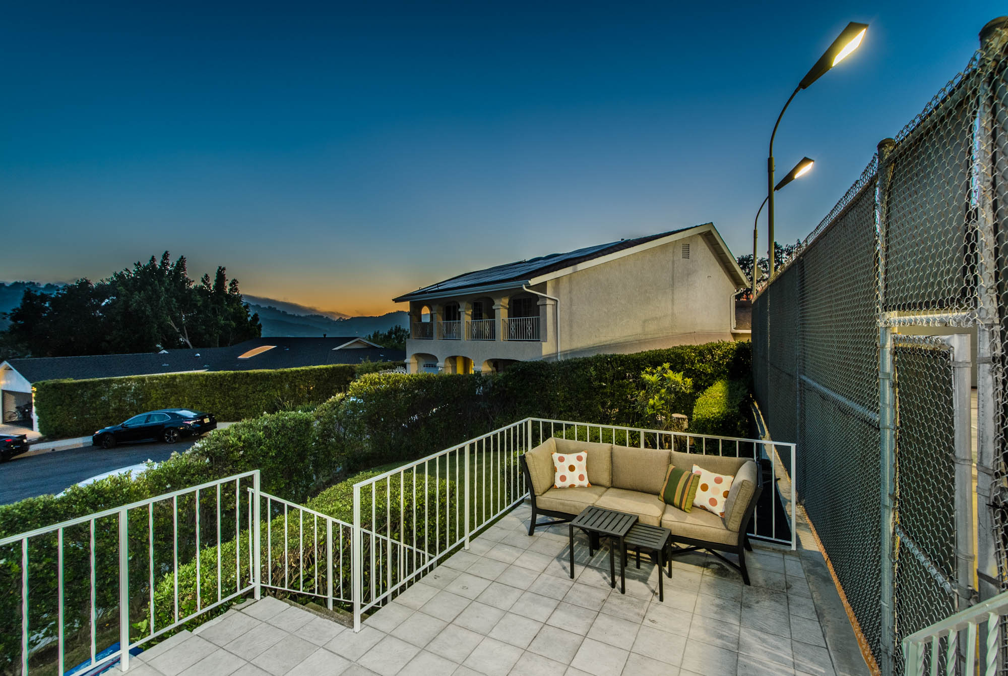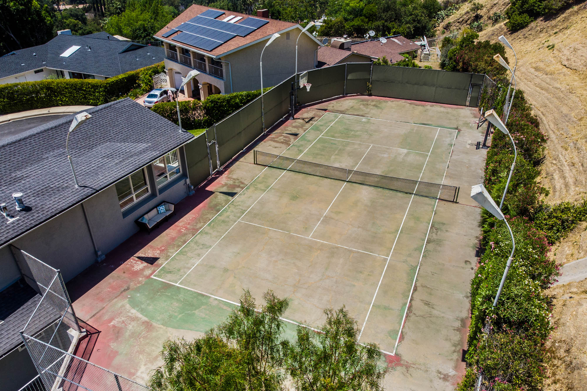 Perched on the end of the cul-de-sac, sitting on a double lot of almost 50,000 sft in the highly desirable Carpenter Charter School District is this magnificent two-story view home in the Dona’s. The one and only home with a tennis court in Laurelwood. The double door entry leads to a foyer with a grand staircase, illuminated with natural light pouring through the abundant windows. The living room features a wood burning fireplace and sliding glass doors which lead to the covered patio and sparkling solar powered pool & spa. The upgraded kitchen offers a subzero refrigerator, granite counters & backsplash, and plentiful cabinetry. Located off either side of the kitchen you will find the spacious dining room, and a breakfast nook, perfect for all your meals large or small. The first of 5 bedrooms and 5 bathrooms are conveniently located downstairs, making the ideal guest room or maid’s quarters. Upstairs, the master suite has a walk-in closet and en-suite bath with dual sinks, jetted tub, and a separate shower. As a unique bonus, there is a huge appx 1,200 sft entertaining space upstairs that includes a wet bar, pool table, and has french doors which lead out to a patio, grassy area, and the tennis court. The backyard is an entertainer’s dream with multiple patios, a solar heated pool, spa, and of course, the full-size tennis court. Additional features include a 3 car extra deep and wide garage, solar panels which makes this a green home, dual zoned HVAC with smart thermostats, central vacuum system, and much more. Ideally located for access to the Westside, this is an incredible property!