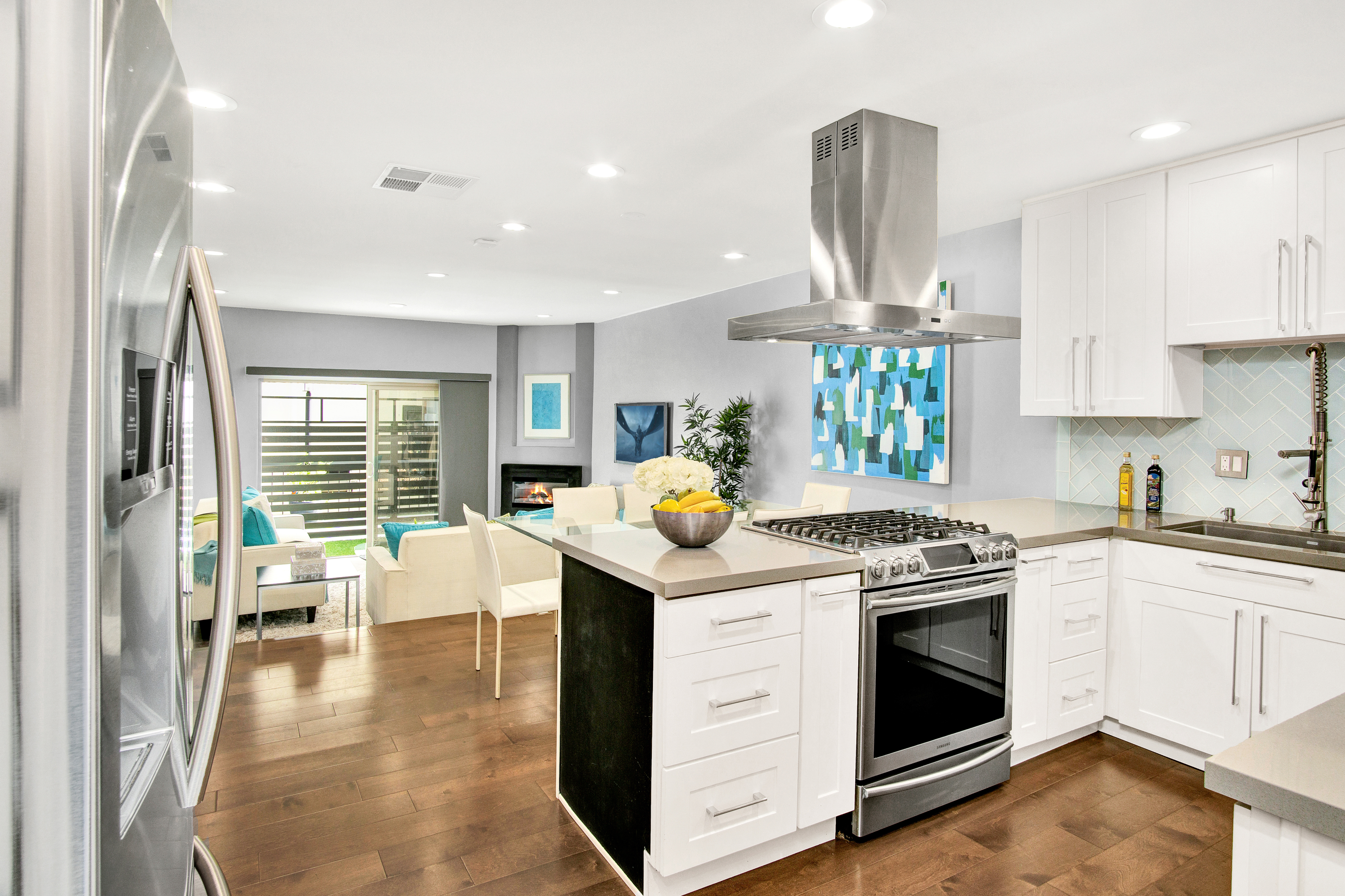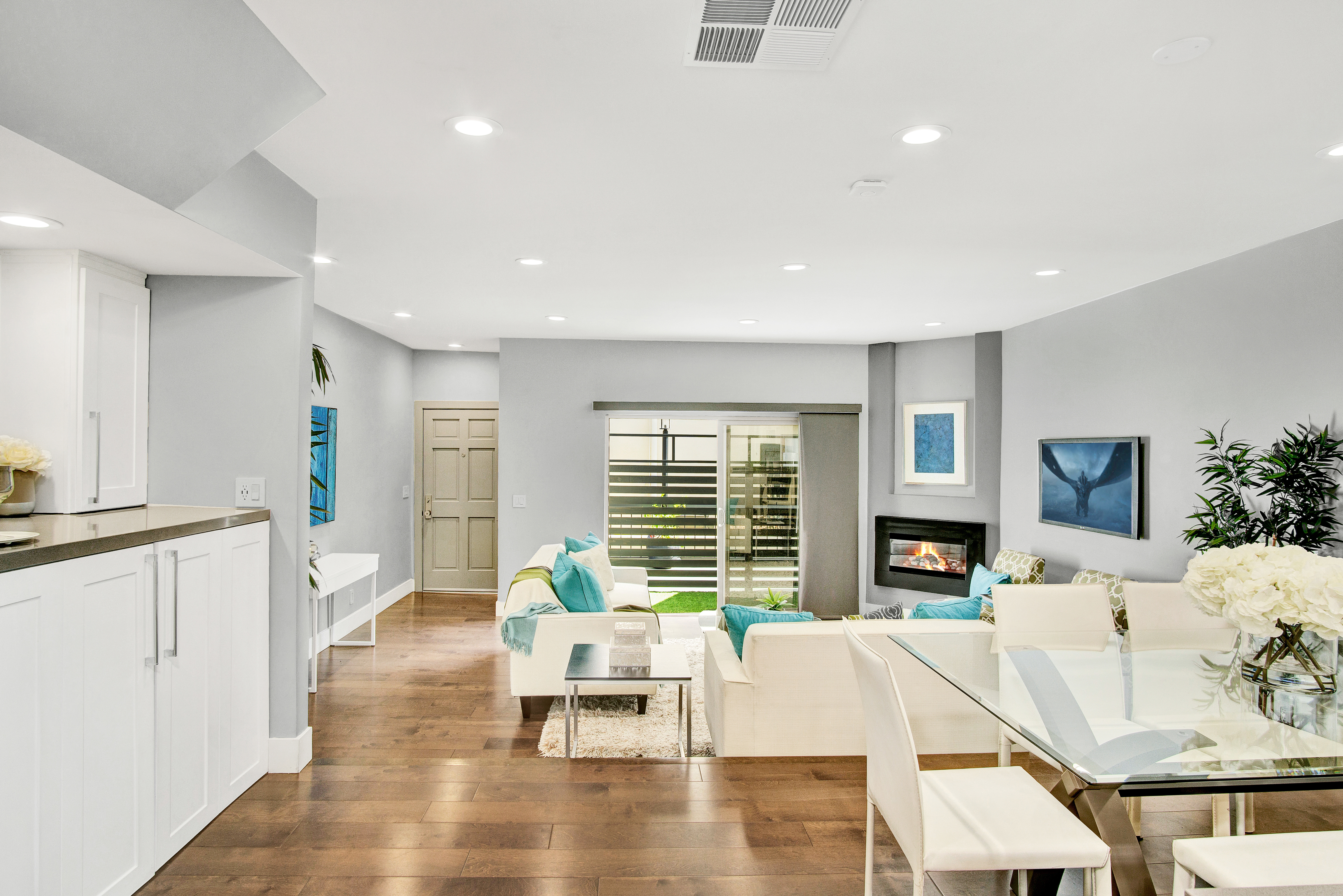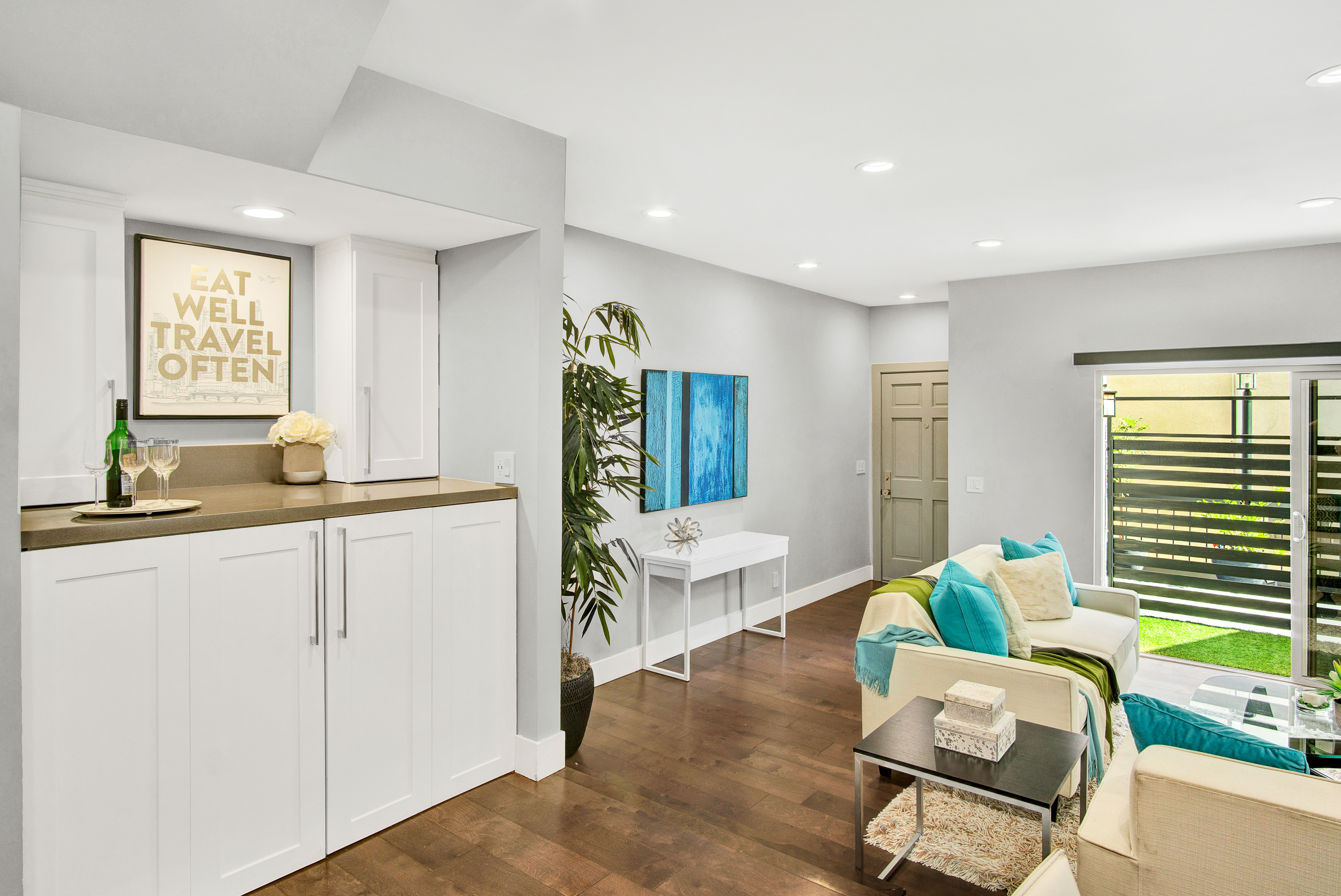 Masterfully renovated 3 bed, 3 bath townhome-style condo in the Carpenter School District in Colfax Meadows. The open floorplan effortlessly blends the living room, dining room, and kitchen, creating the perfect entertaining space. The living room offers a remote controlled gas fire place and sliding door to a private patio. Step up to the dining room with bar and built-in wine cooler. The dining room is open to the light and bright kitchen with Silestone quartz countertops, glass tile backsplash, and stainless steel appliances. The first of the 3 bedrooms is located on the first floor, making it an ideal office space or guest room. Upstairs, the master retreat is a dream with custom closets and a large balcony. The master bath offers sleek vanity with dual sinks and oversized walk in shower with 2 rainfall shower heads. The second upstairs bedroom is spacious with an attached full bath. Other amenities of this home include hardwood flooring throughout, dual pane windows and doors, side-by-side washer/dryer, recessed LED lighting, and side-by-side parking. The unit has also been upgraded with a number of smart home features, including programmable scene lighting, smart doorbell and thermostat, Nest Protect smoke detectors, and programmable "master control" switches. Moments from Tujunga Village, the studios, and the shops and restaurants of Ventura Boulevard. This condo offers the best of Studio City living!