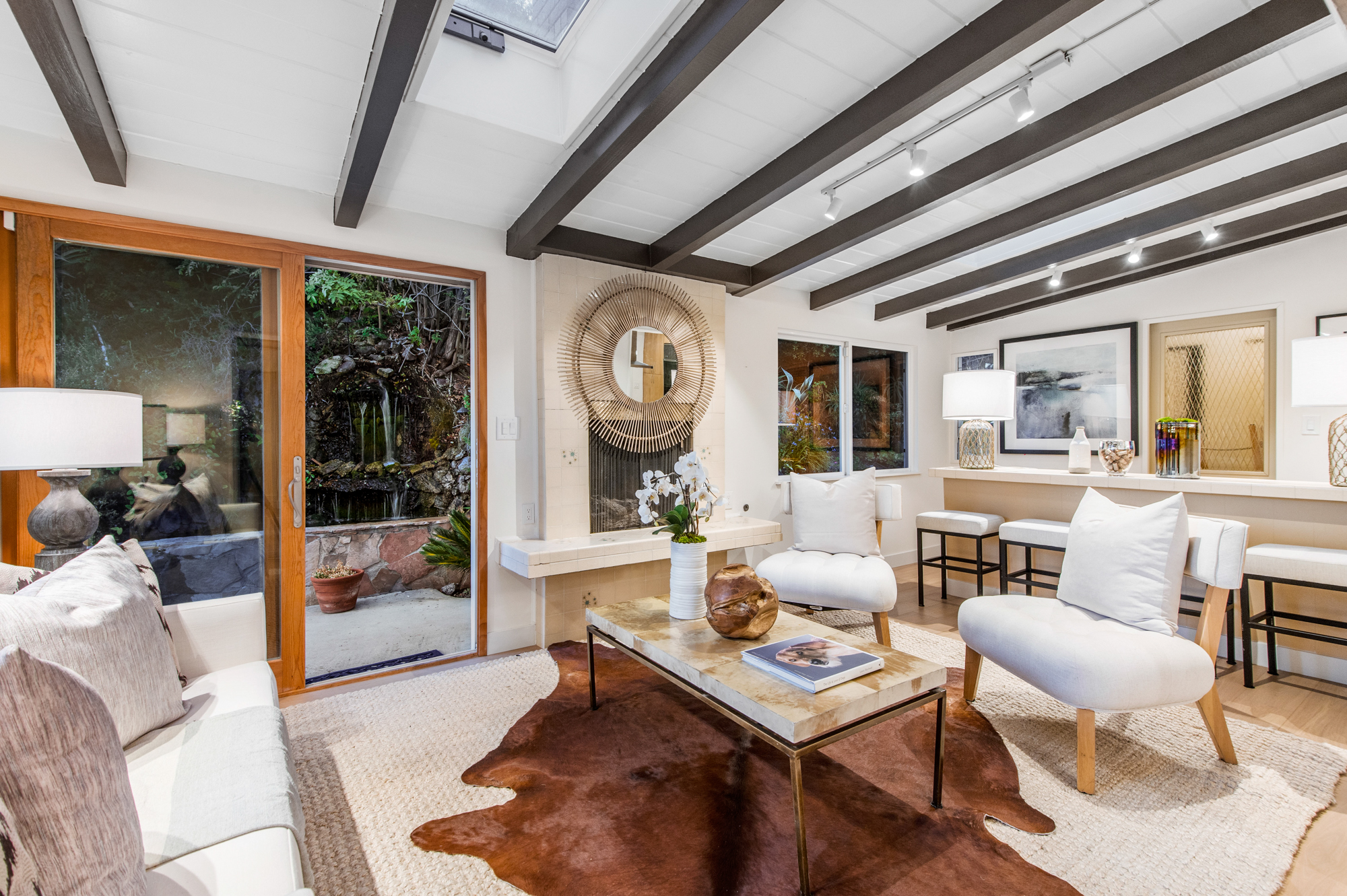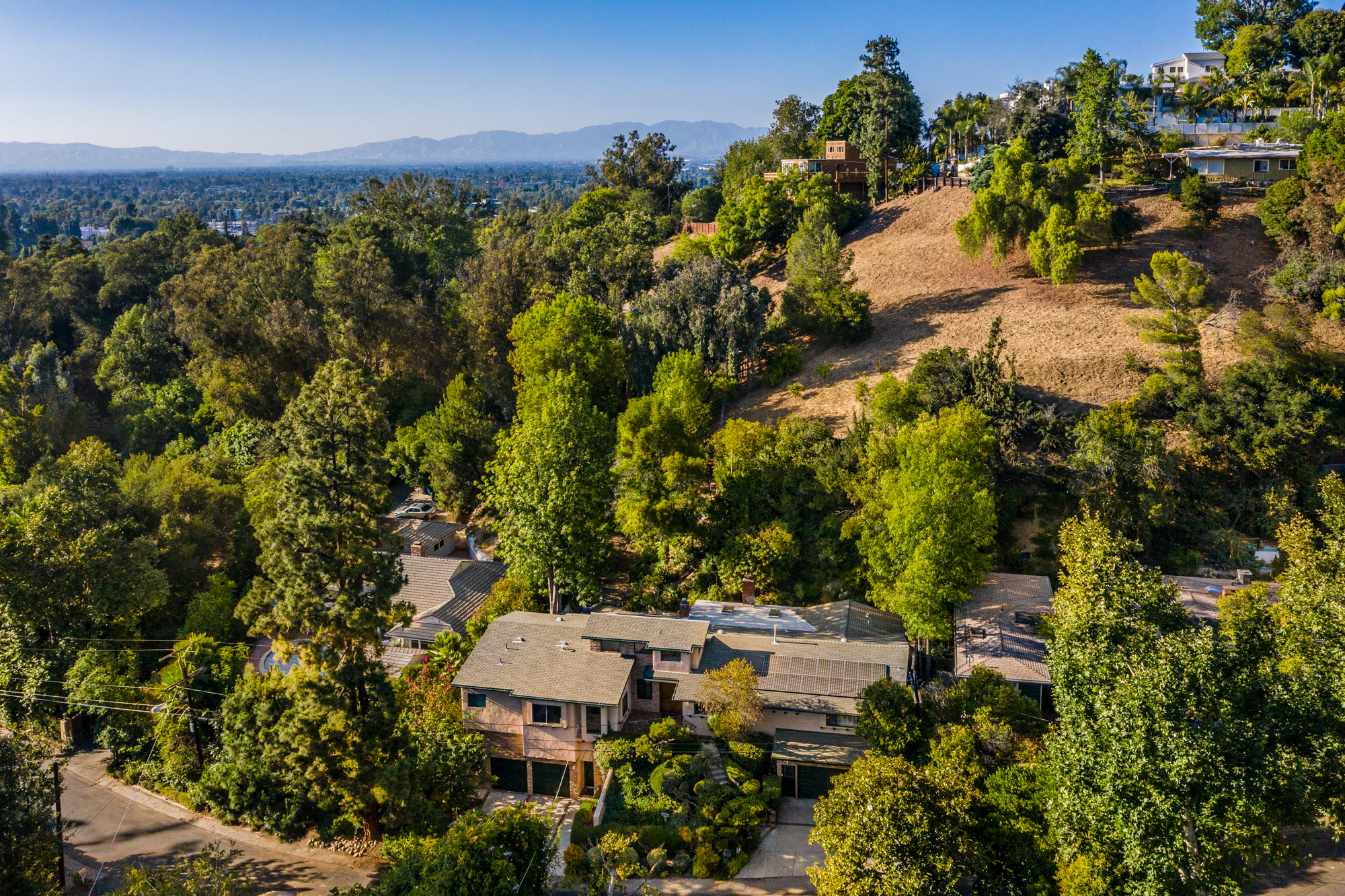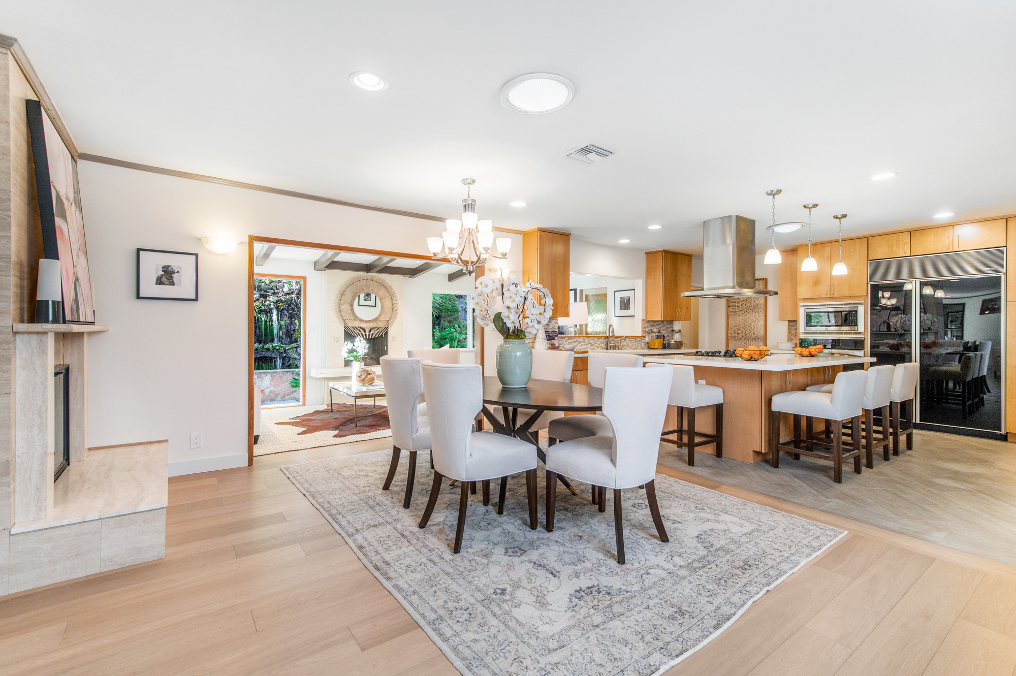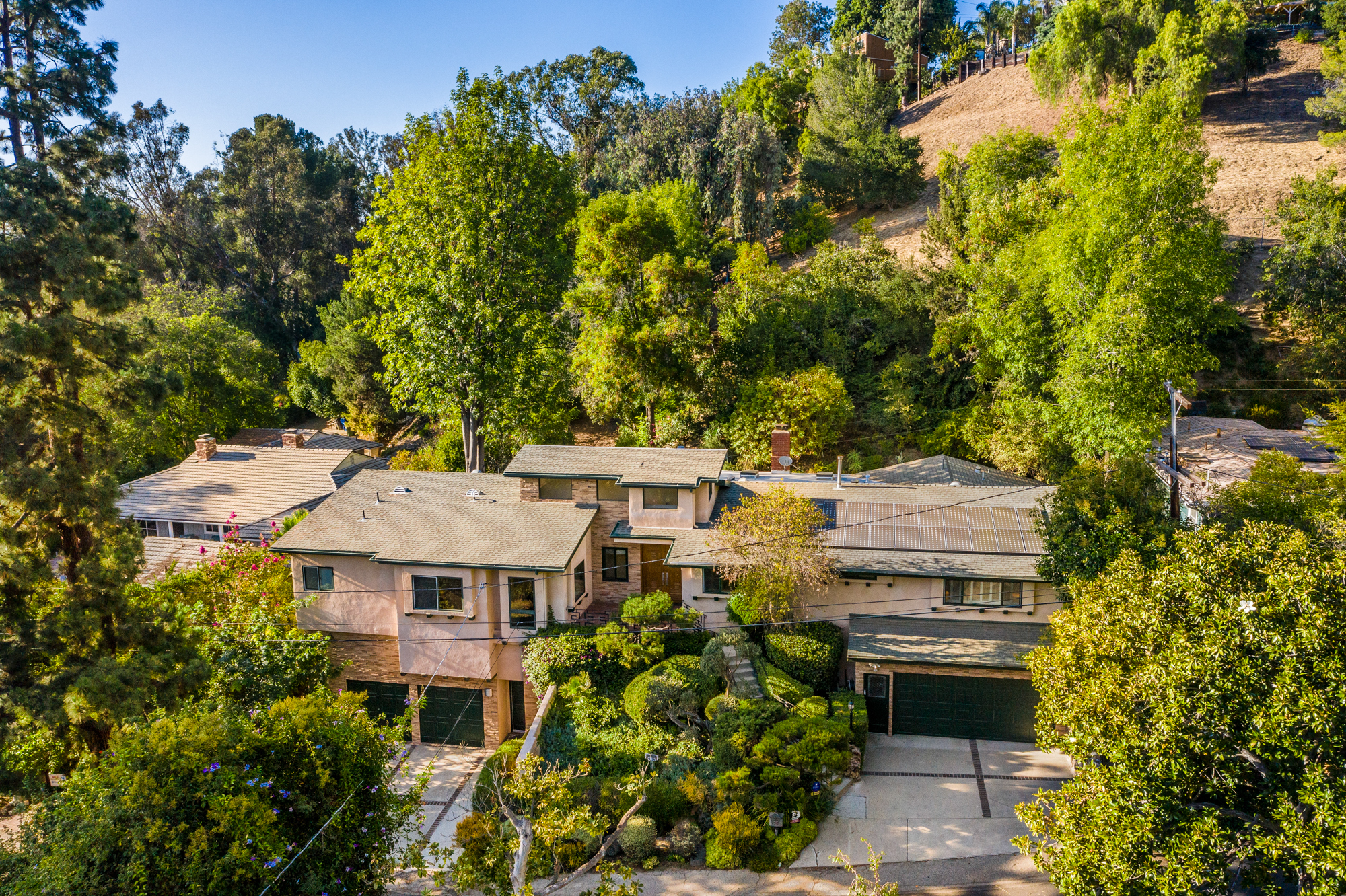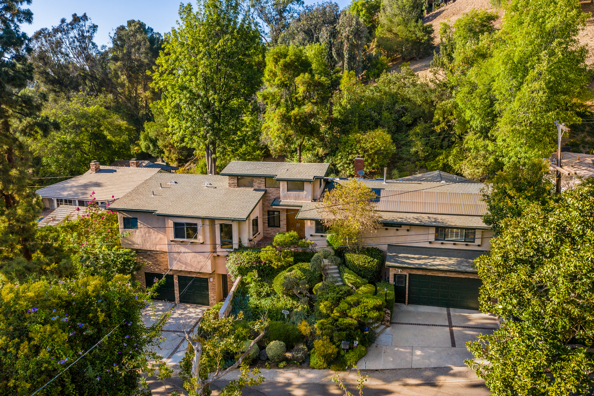 South of the Boulevard at the end of a peaceful cul-de-sac in Studio City sits this truly unique property re-designed and expanded by prominent architect James Heimler in 2008. Inside, the home’s open floor plan is light and bright, illuminated by solar tubes, sky lights, and large windows. The beautifully updated chef’s kitchen opens to both the dining and family rooms, creating the ideal flow for entertaining. The kitchen has a large center island with breakfast bar, high end appliances, caesarstone countertops, and plentiful storage. The formal living room shares a see through fireplace with the dining room and has sliding glass doors leading to the backyard. The family room offers another fireplace and has a large wet bar. The home affords two wings, each with its own master suite. The second wing also has a living area, kitchenette, and a guest room, making it ideal for guests staying short or long term. The additional bedrooms are all well appointed. Down the beautifully crafted stairs you will find an amazing bonus space with high ceilings, loft, and private bath. This space has its own separate entrance and is perfect for a home theatre, rec room, or studio. Not to be outdone, the backyard is a lush paradise with citrus trees, spa, koi pond, and dog run. Additional features include solar panels, automatic irrigation system, 220v power in garage for electric vehicles, and more. Moments from the famed trails of Fryman Canyon and the award winning Carpenter Avenue School, and minutes from the boutiques, restaurants, and shops along Ventura Blvd.