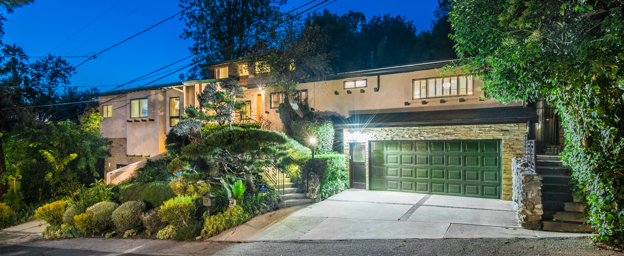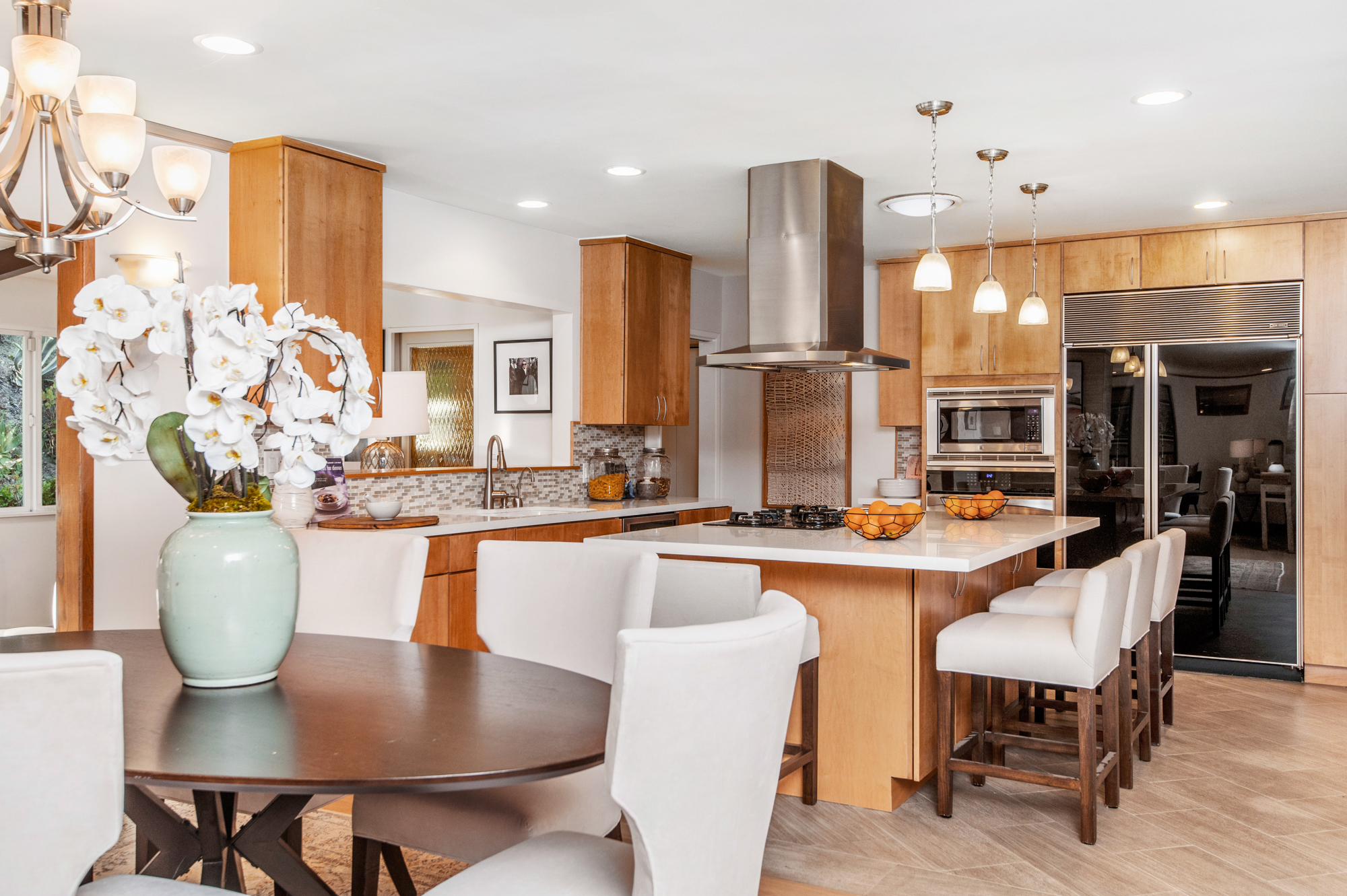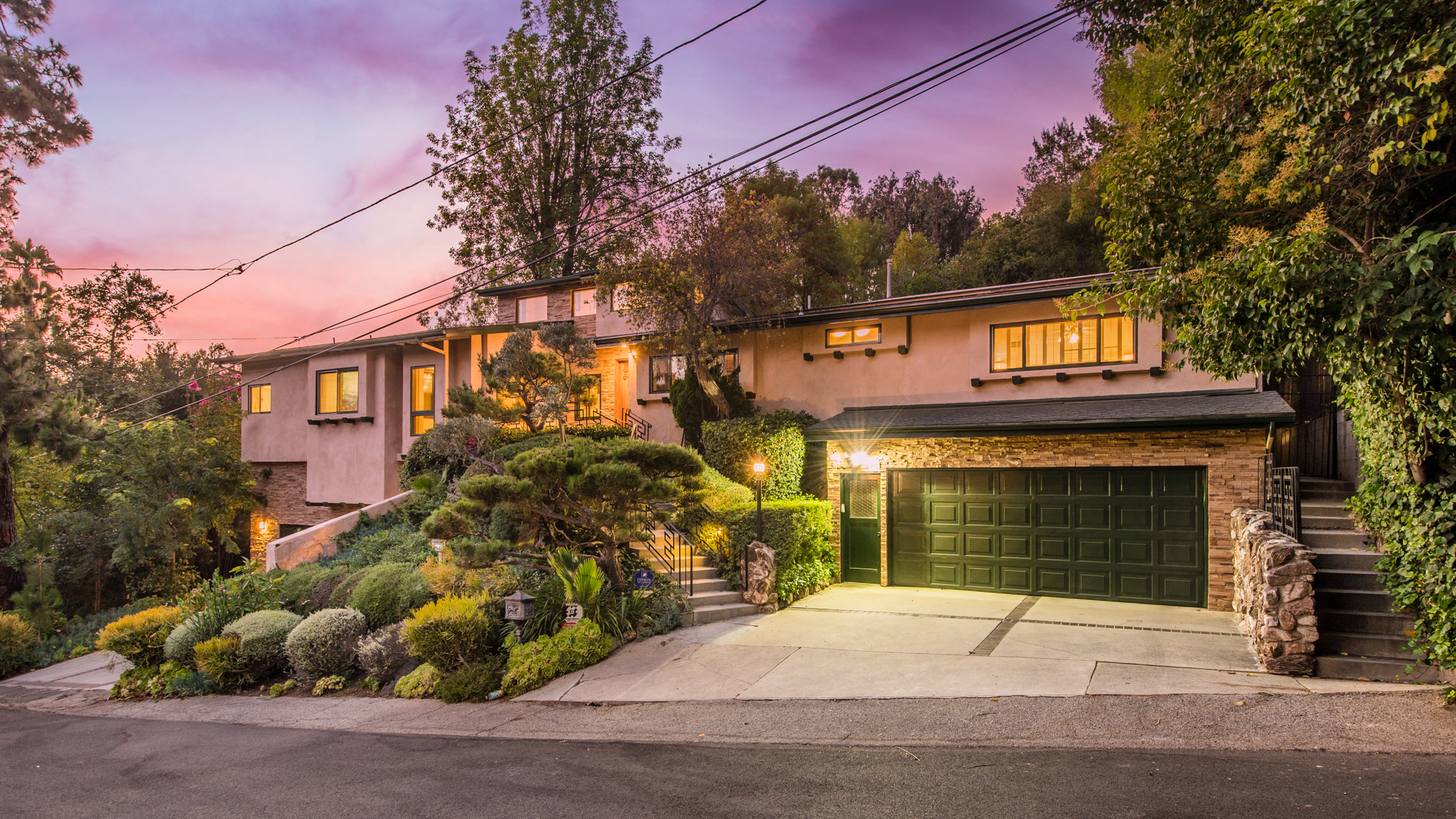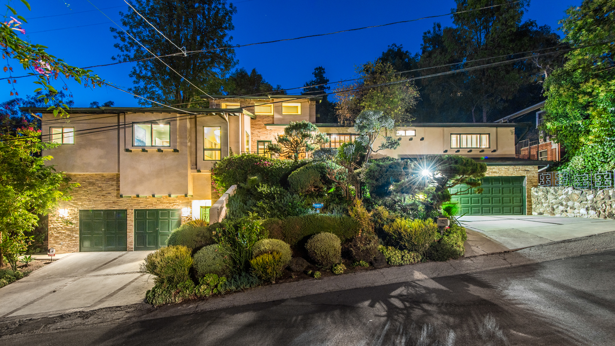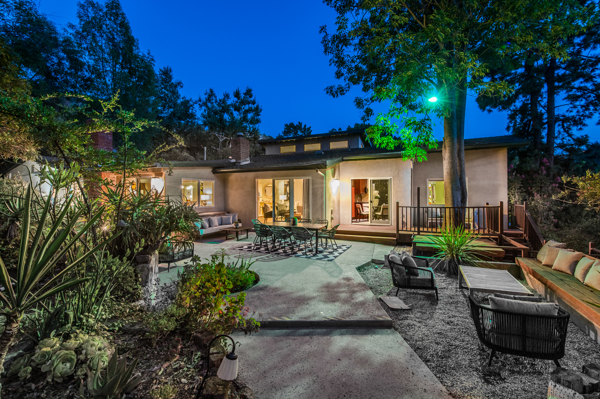 South of the Boulevard at the end of a peaceful cul-de-sac in Studio City sits this truly unique property re-designed and expanded by prominent architect James Heimler in 2008. Inside, the home’s open floor plan is light and bright, illuminated by solar tubes, sky lights, and large windows. The beautifully updated chef’s kitchen opens to both the dining and family rooms, creating the ideal flow for entertaining. The kitchen has a large center island with breakfast bar, high end appliances, caesarstone countertops, and plentiful storage. The formal living room shares a see through fireplace with the dining room and has sliding glass doors leading to the backyard. The family room offers another fireplace and has a large wet bar. The home affords two wings, each with its own master suite. The second wing also has a living area, kitchenette, and a guest room, making it ideal for guests staying short or long term. The additional bedrooms are all well appointed. Down the beautifully crafted stairs you will find an amazing bonus space with high ceilings, loft, and private bath. This space has its own separate entrance and is perfect for a home theatre, rec room, or studio. Not to be outdone, the backyard is a lush paradise with citrus trees, spa, koi pond, and dog run. Additional features include solar panels, automatic irrigation system, 220v power in garage for electric vehicles, and more. Moments from the famed trails of Fryman Canyon and the award winning Carpenter Avenue School, and minutes from the boutiques, restaurants, and shops along Ventura Blvd.