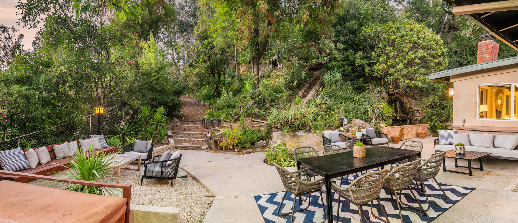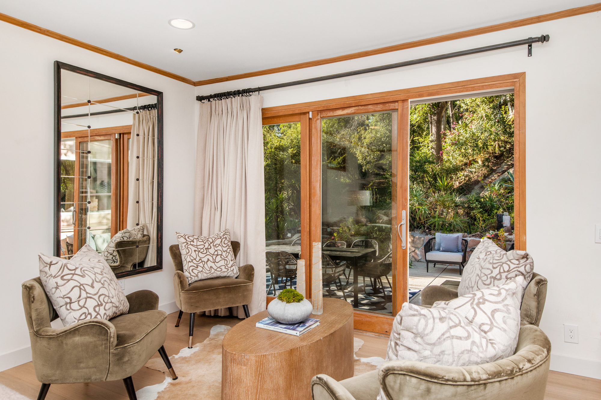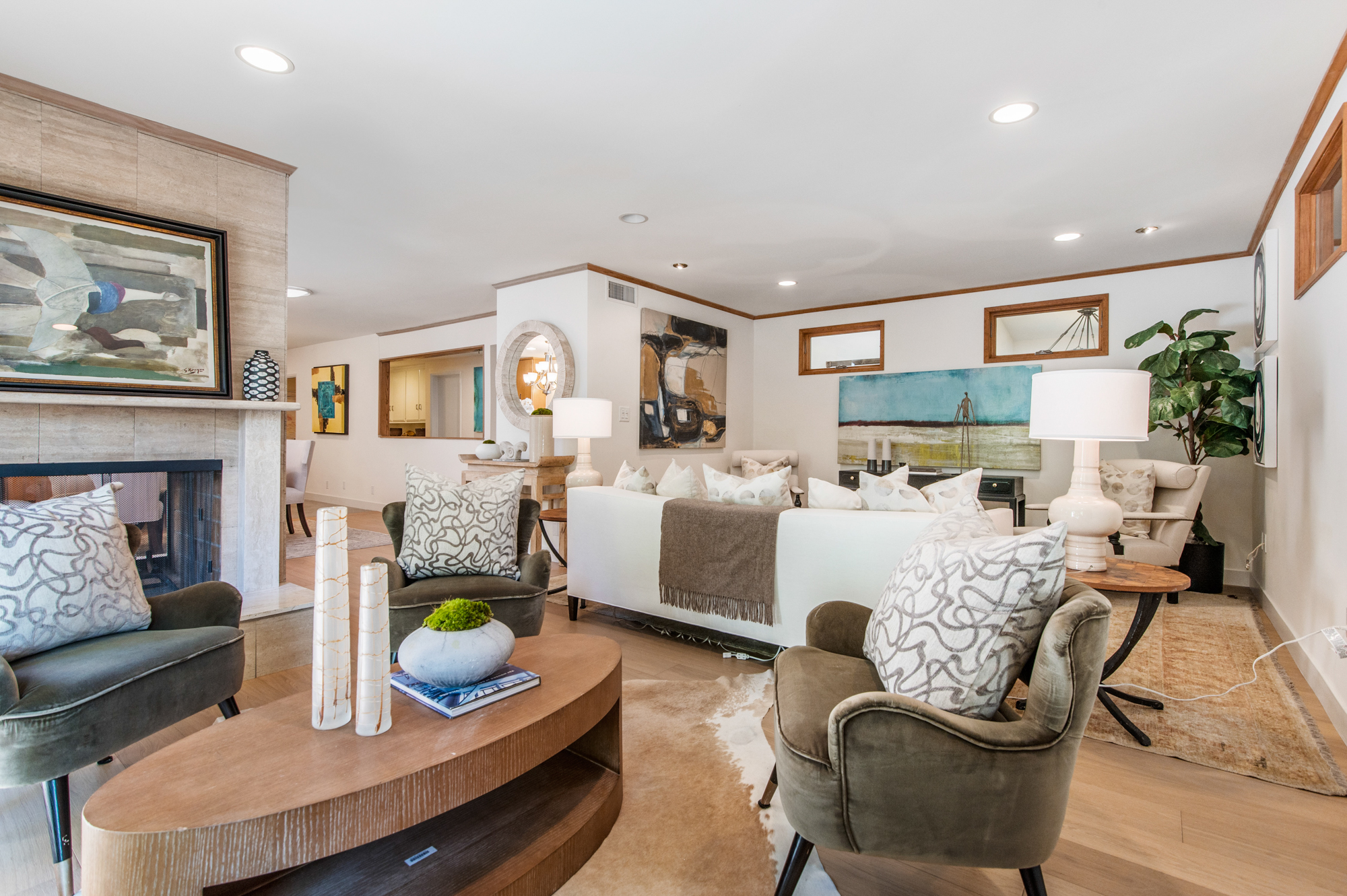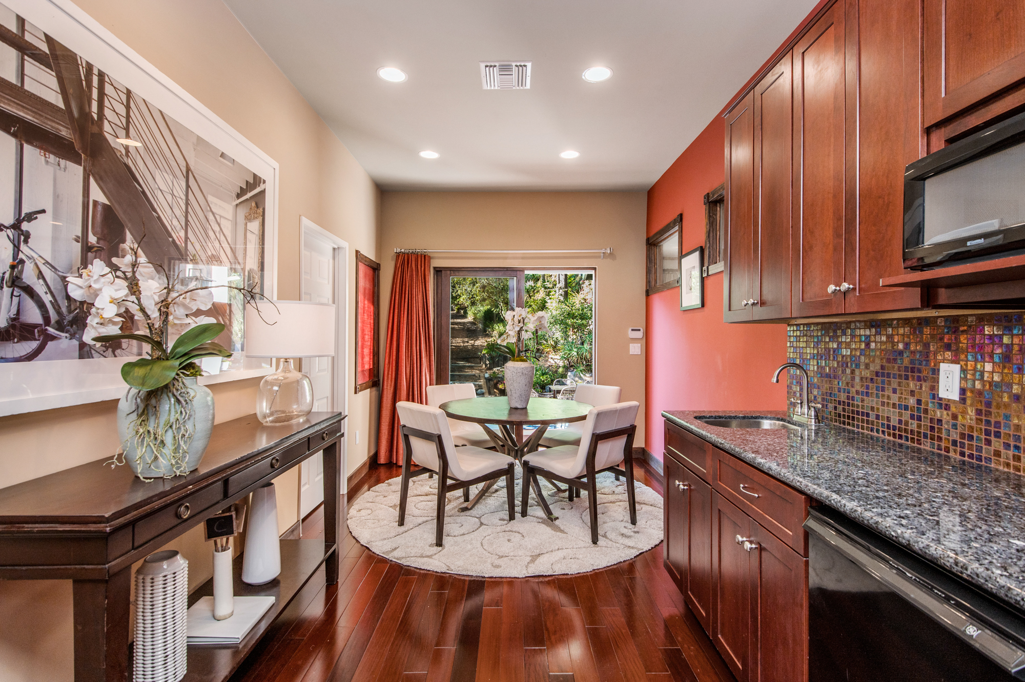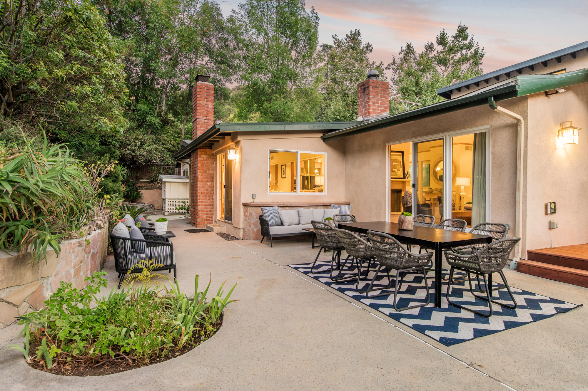 South of the Boulevard at the end of a peaceful cul-de-sac in Studio City sits this truly unique property re-designed and expanded by prominent architect James Heimler in 2008. Inside, the home’s open floor plan is light and bright, illuminated by solar tubes, sky lights, and large windows. The beautifully updated chef’s kitchen opens to both the dining and family rooms, creating the ideal flow for entertaining. The kitchen has a large center island with breakfast bar, high end appliances, caesarstone countertops, and plentiful storage. The formal living room shares a see through fireplace with the dining room and has sliding glass doors leading to the backyard. The family room offers another fireplace and has a large wet bar. The home affords two wings, each with its own master suite. The second wing also has a living area, kitchenette, and a guest room, making it ideal for guests staying short or long term. The additional bedrooms are all well appointed. Down the beautifully crafted stairs you will find an amazing bonus space with high ceilings, loft, and private bath. This space has its own separate entrance and is perfect for a home theatre, rec room, or studio. Not to be outdone, the backyard is a lush paradise with citrus trees, spa, koi pond, and dog run. Additional features include solar panels, automatic irrigation system, 220v power in garage for electric vehicles, and more. Moments from the famed trails of Fryman Canyon and the award winning Carpenter Avenue School, and minutes from the boutiques, restaurants, and shops along Ventura Blvd.