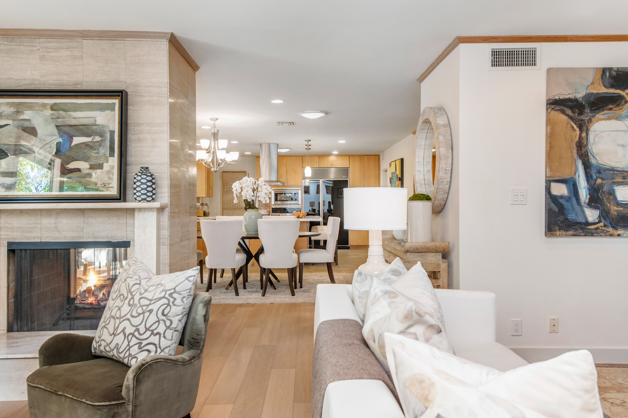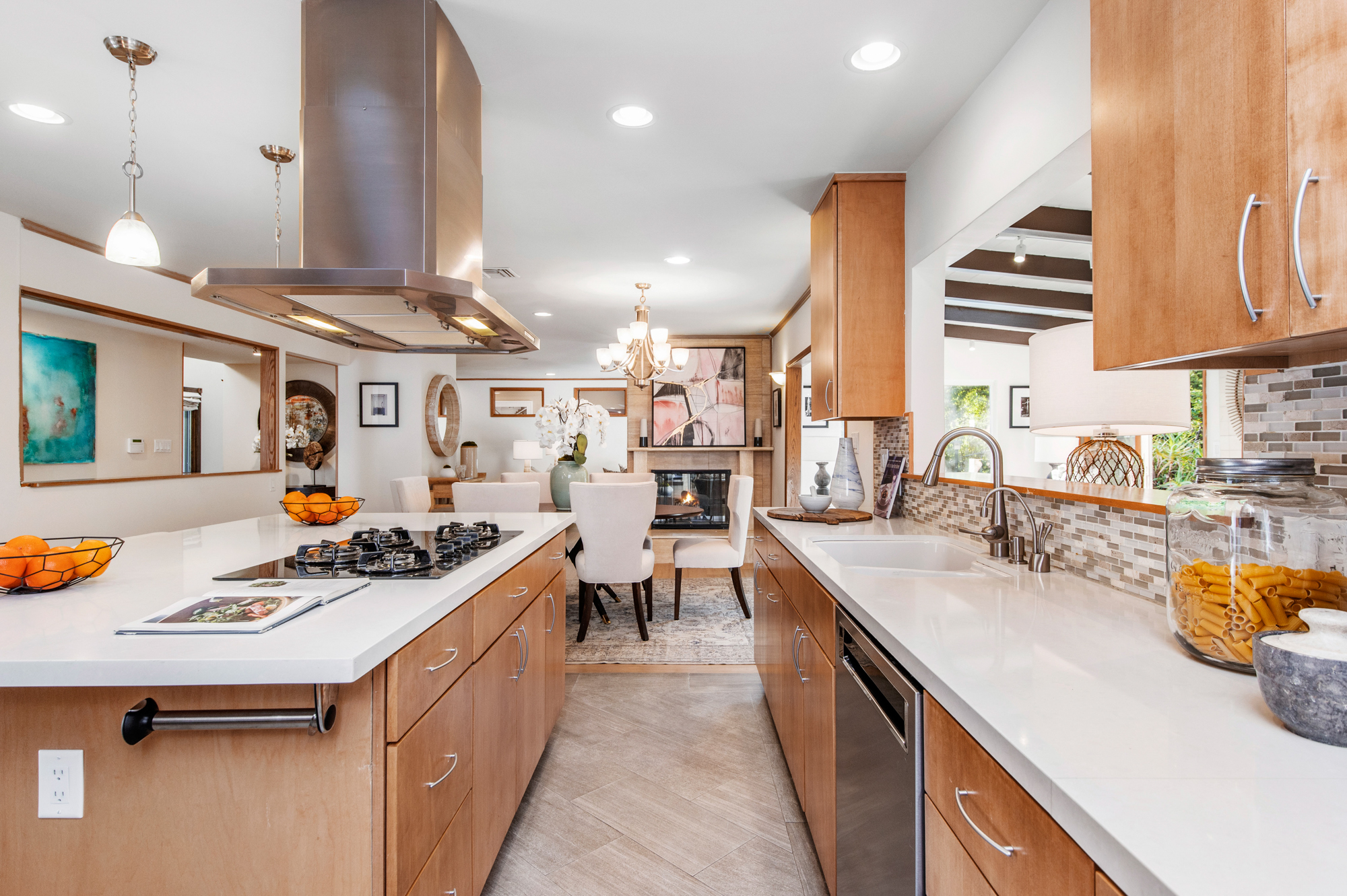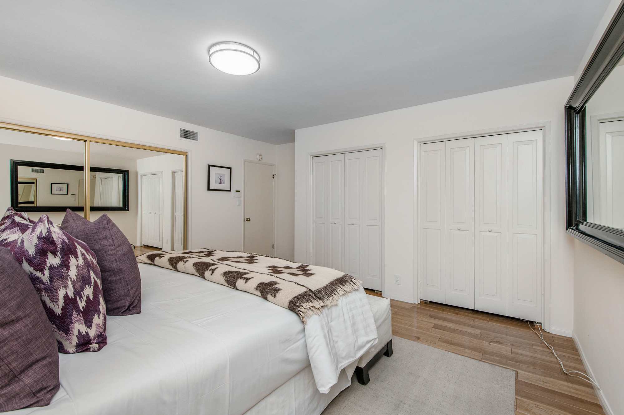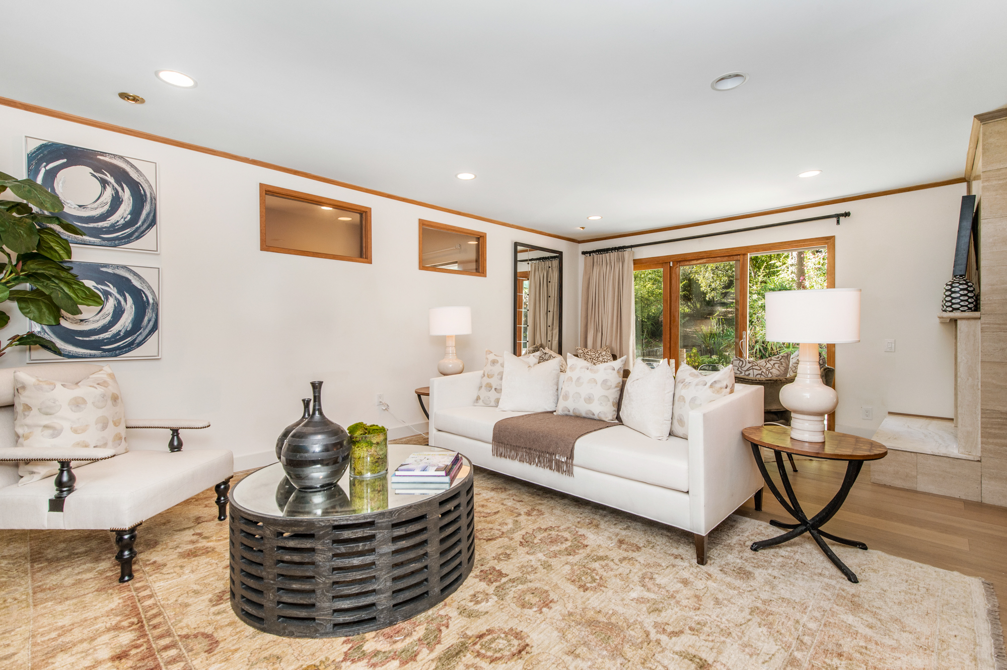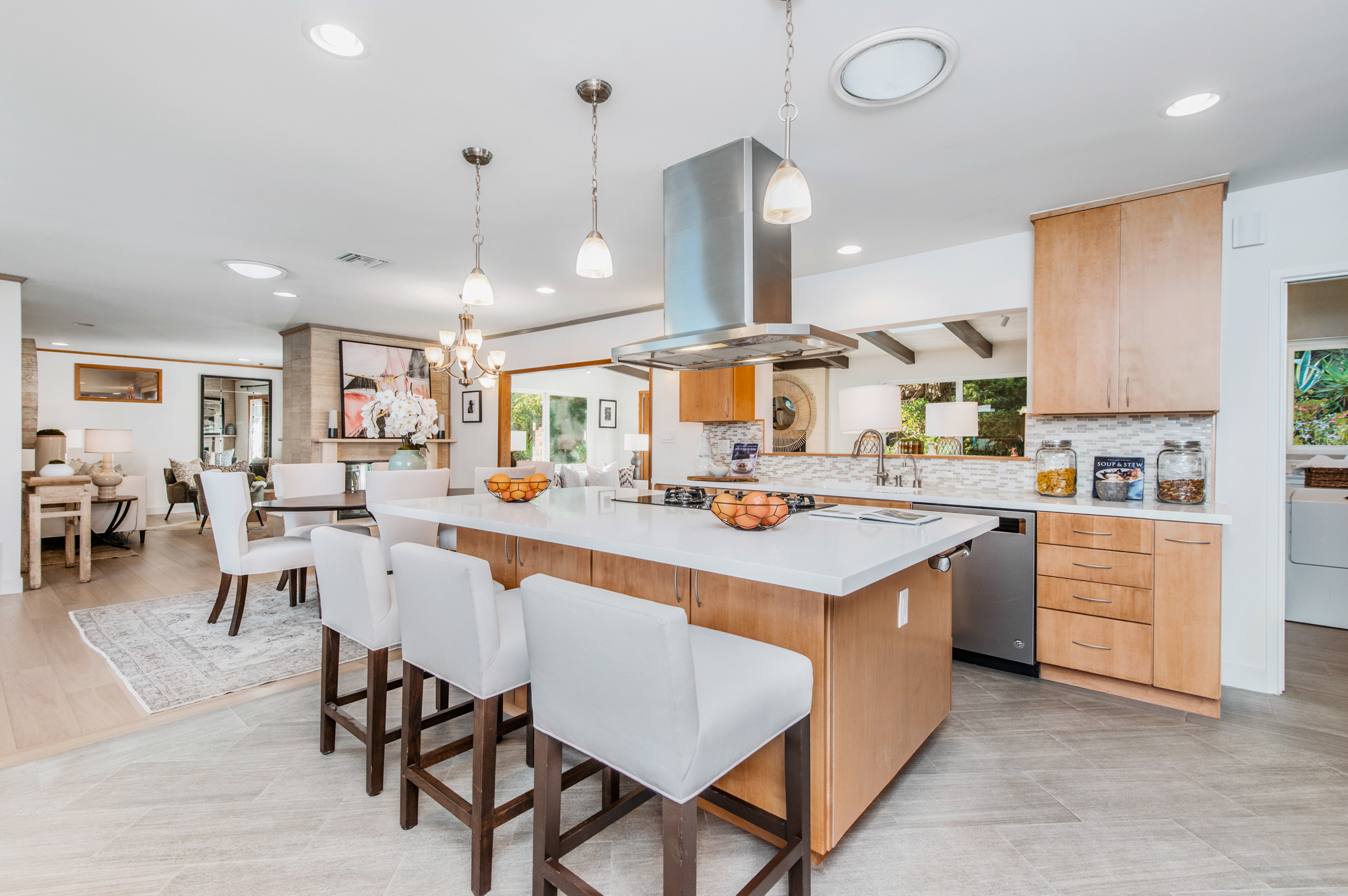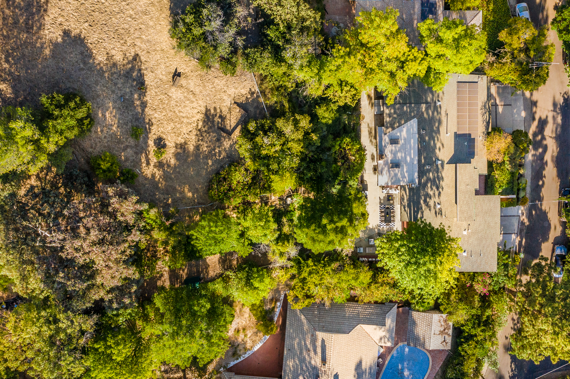 South of the Boulevard at the end of a peaceful cul-de-sac in Studio City sits this truly unique property re-designed and expanded by prominent architect James Heimler in 2008. Inside, the home’s open floor plan is light and bright, illuminated by solar tubes, sky lights, and large windows. The beautifully updated chef’s kitchen opens to both the dining and family rooms, creating the ideal flow for entertaining. The kitchen has a large center island with breakfast bar, high end appliances, caesarstone countertops, and plentiful storage. The formal living room shares a see through fireplace with the dining room and has sliding glass doors leading to the backyard. The family room offers another fireplace and has a large wet bar. The home affords two wings, each with its own master suite. The second wing also has a living area, kitchenette, and a guest room, making it ideal for guests staying short or long term. The additional bedrooms are all well appointed. Down the beautifully crafted stairs you will find an amazing bonus space with high ceilings, loft, and private bath. This space has its own separate entrance and is perfect for a home theatre, rec room, or studio. Not to be outdone, the backyard is a lush paradise with citrus trees, spa, koi pond, and dog run. Additional features include solar panels, automatic irrigation system, 220v power in garage for electric vehicles, and more. Moments from the famed trails of Fryman Canyon and the award winning Carpenter Avenue School, and minutes from the boutiques, restaurants, and shops along Ventura Blvd.