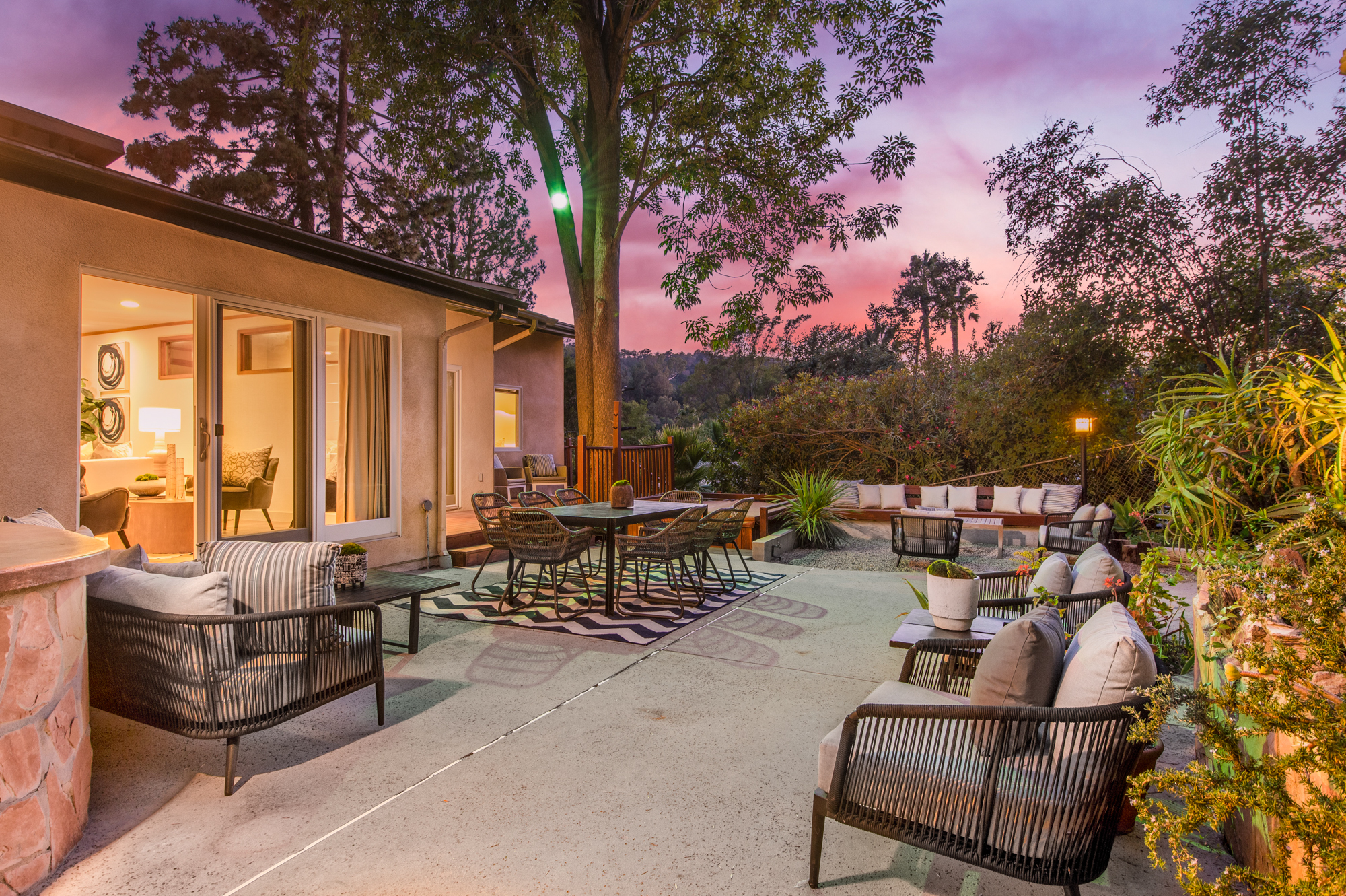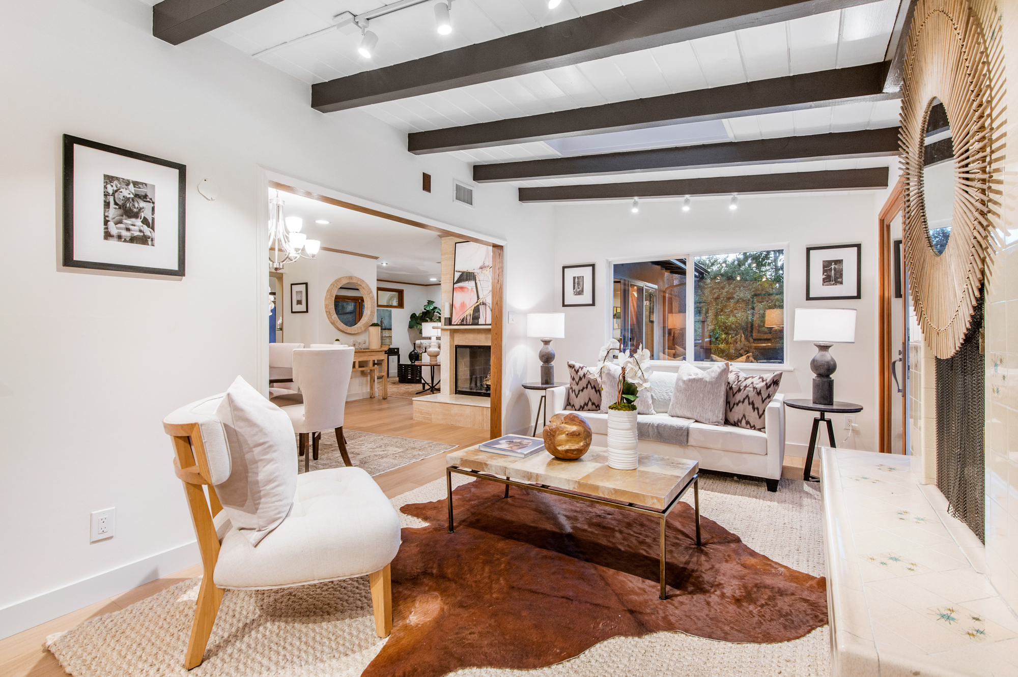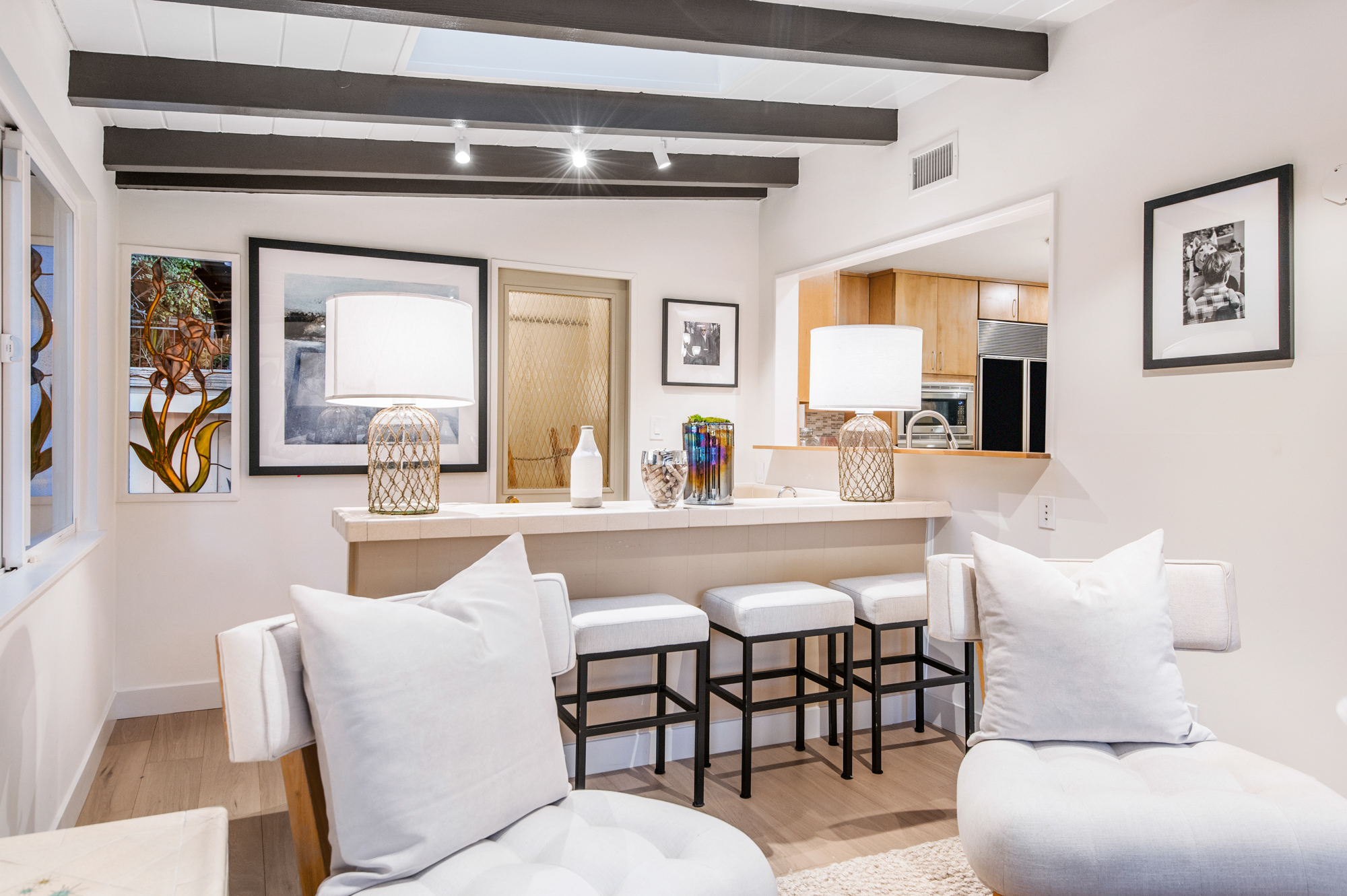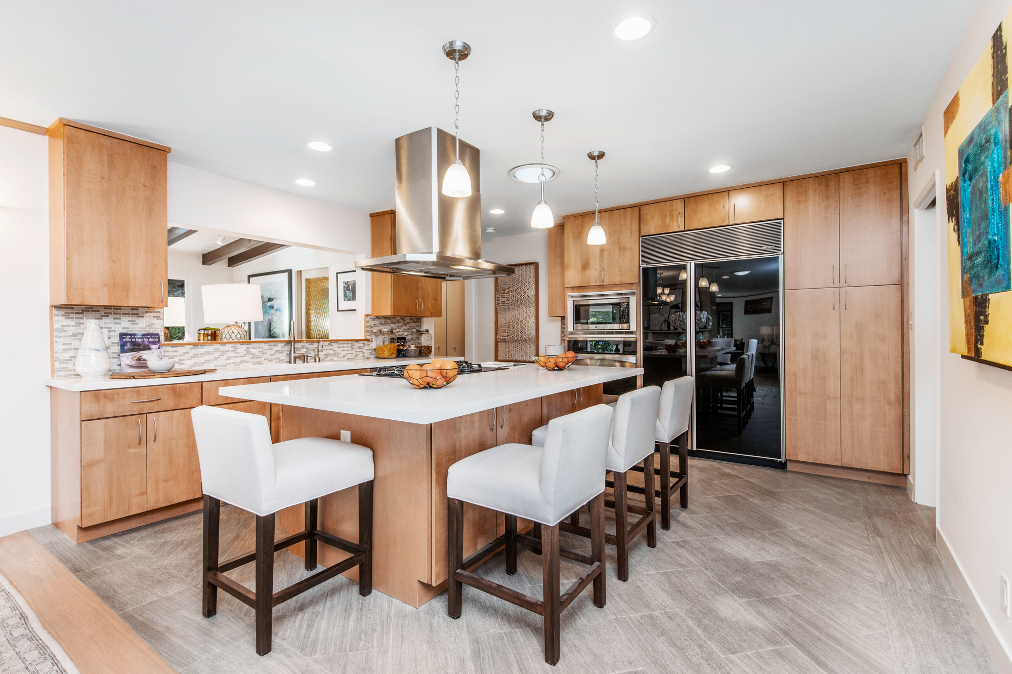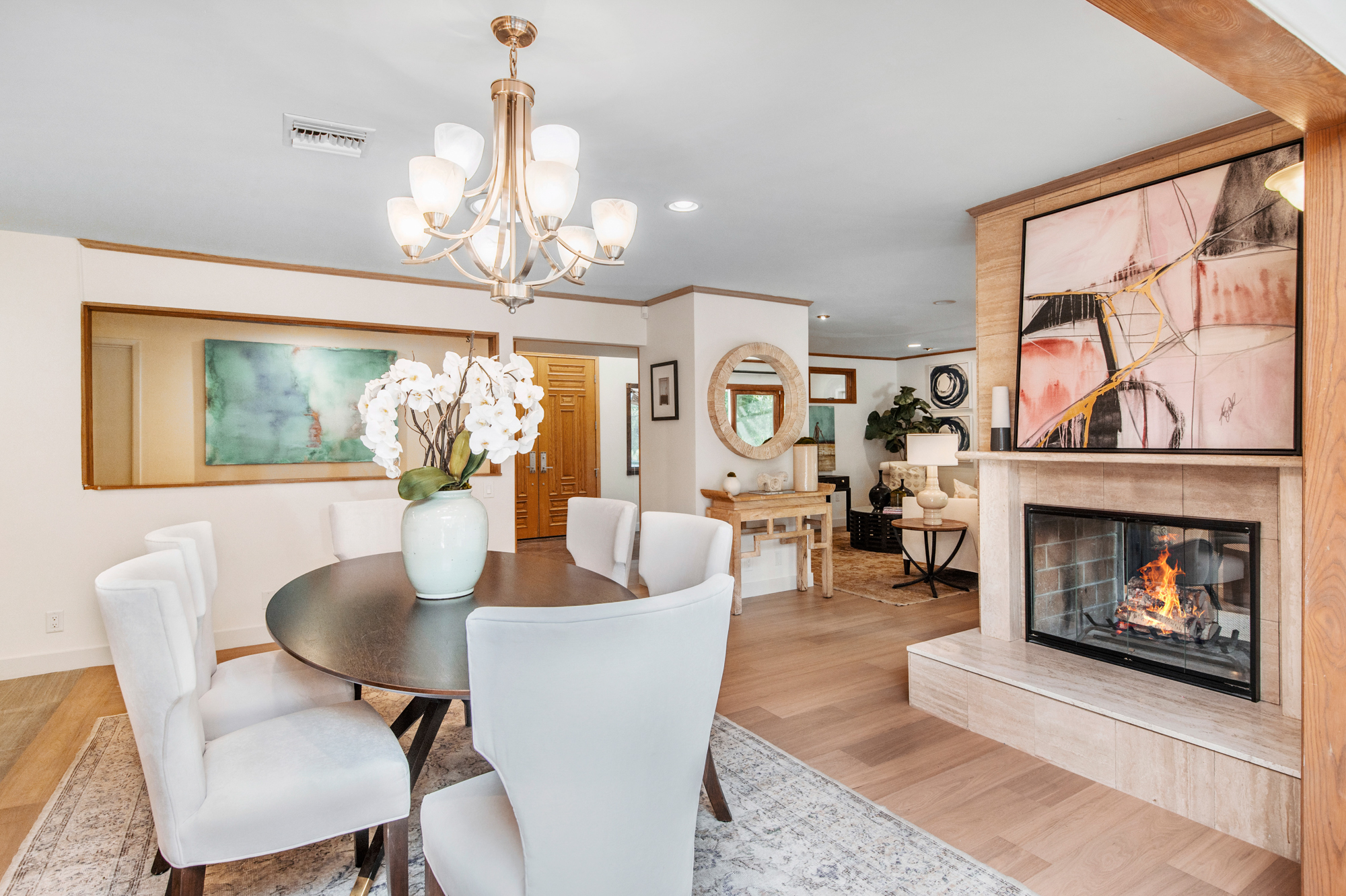 South of the Boulevard at the end of a peaceful cul-de-sac in Studio City sits this truly unique property re-designed and expanded by prominent architect James Heimler in 2008. Inside, the home’s open floor plan is light and bright, illuminated by solar tubes, sky lights, and large windows. The beautifully updated chef’s kitchen opens to both the dining and family rooms, creating the ideal flow for entertaining. The kitchen has a large center island with breakfast bar, high end appliances, caesarstone countertops, and plentiful storage. The formal living room shares a see through fireplace with the dining room and has sliding glass doors leading to the backyard. The family room offers another fireplace and has a large wet bar. The home affords two wings, each with its own master suite. The second wing also has a living area, kitchenette, and a guest room, making it ideal for guests staying short or long term. The additional bedrooms are all well appointed. Down the beautifully crafted stairs you will find an amazing bonus space with high ceilings, loft, and private bath. This space has its own separate entrance and is perfect for a home theatre, rec room, or studio. Not to be outdone, the backyard is a lush paradise with citrus trees, spa, koi pond, and dog run. Additional features include solar panels, automatic irrigation system, 220v power in garage for electric vehicles, and more. Moments from the famed trails of Fryman Canyon and the award winning Carpenter Avenue School, and minutes from the boutiques, restaurants, and shops along Ventura Blvd.