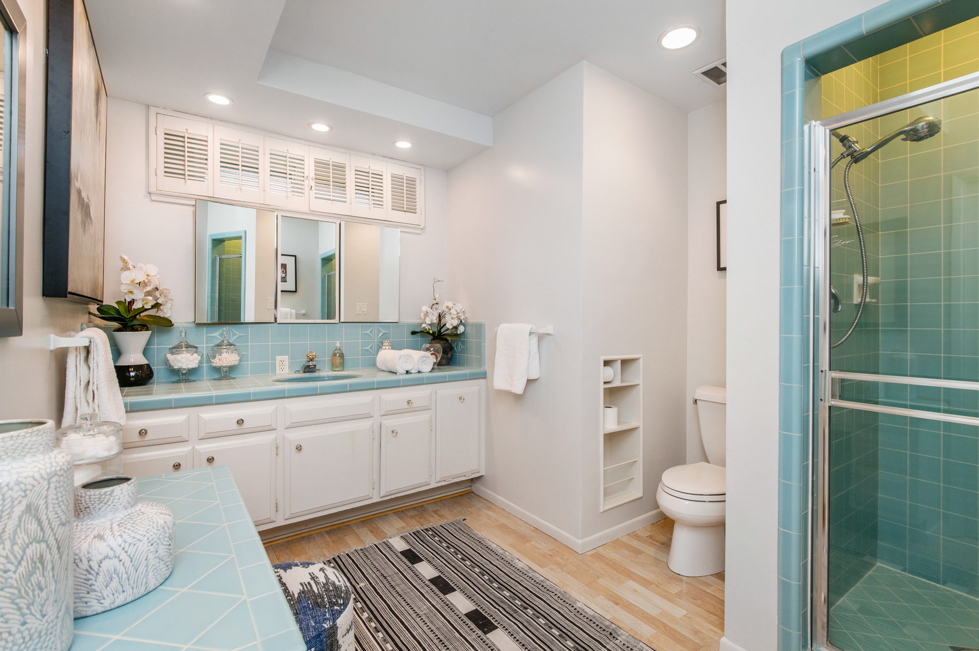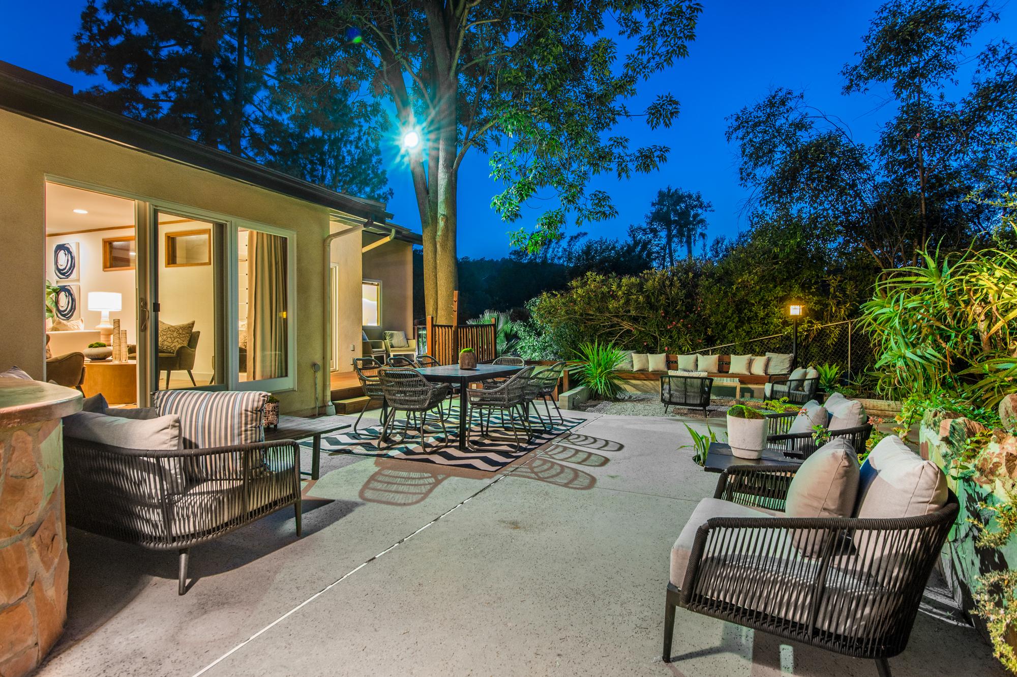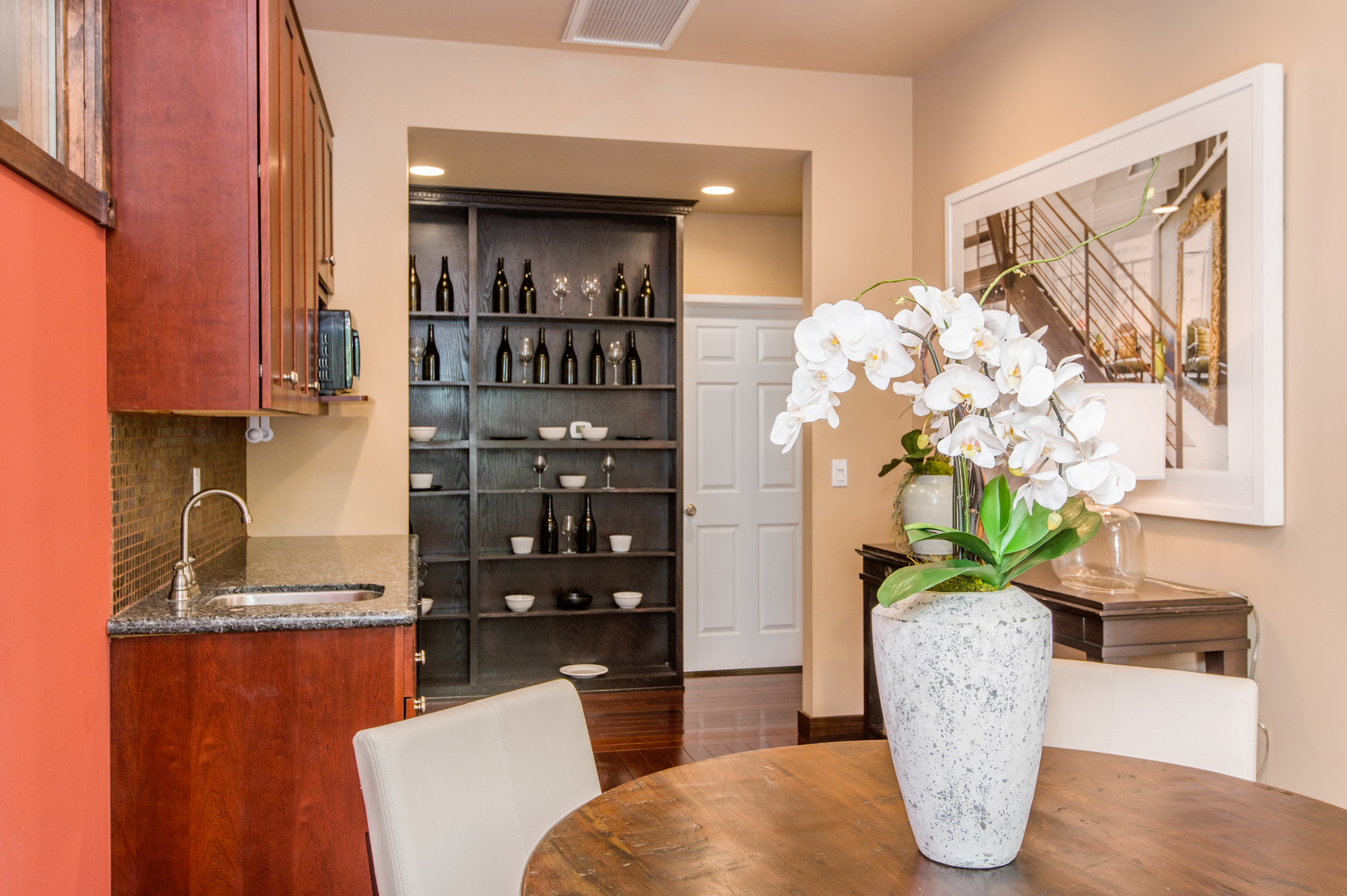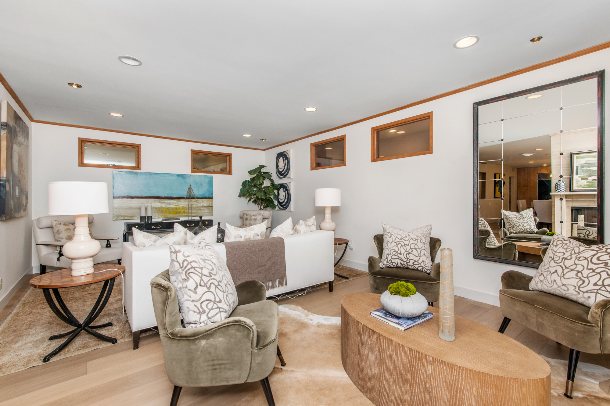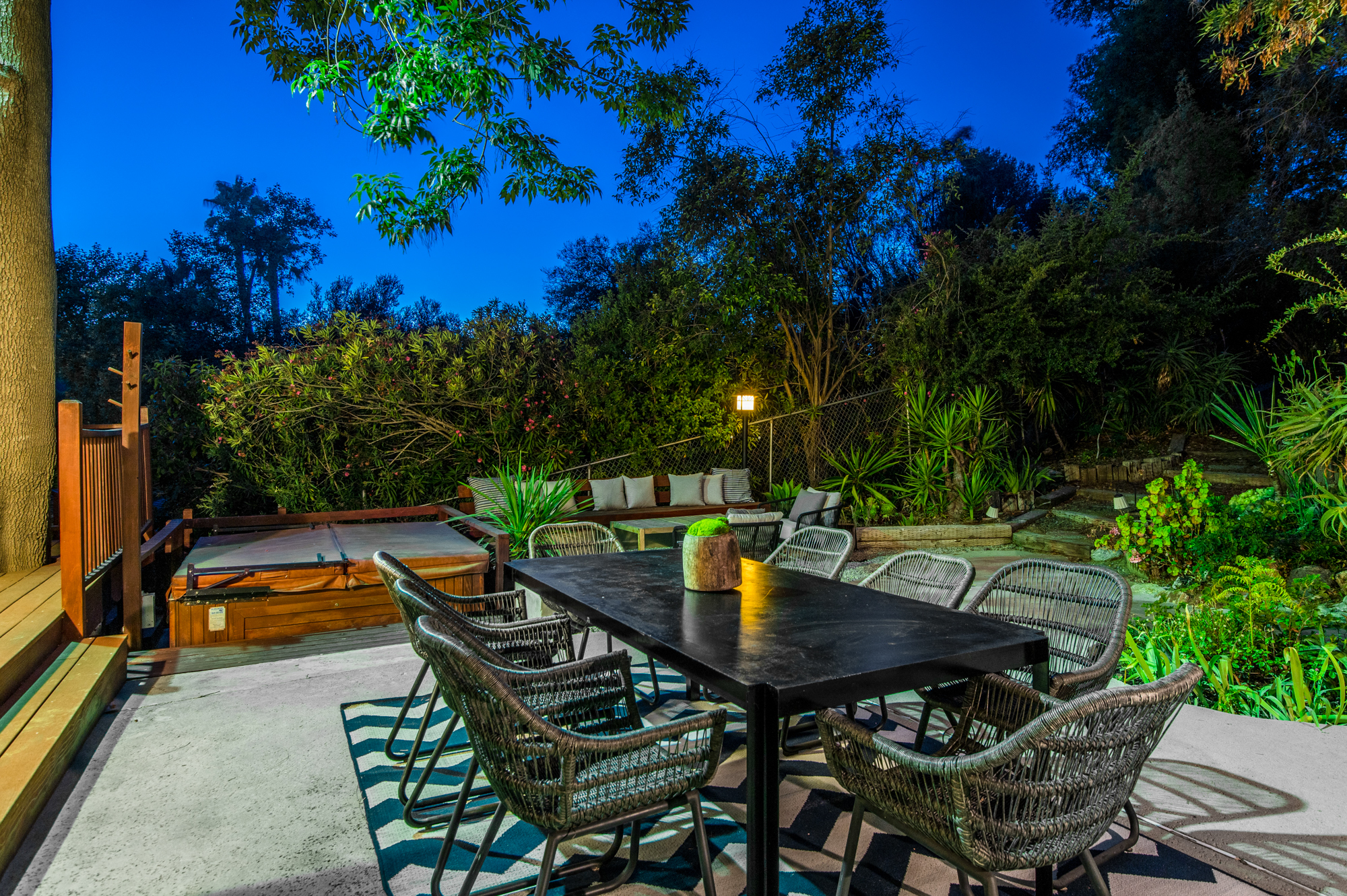 South of the Boulevard at the end of a peaceful cul-de-sac in Studio City sits this truly unique property re-designed and expanded by prominent architect James Heimler in 2008. Inside, the home’s open floor plan is light and bright, illuminated by solar tubes, sky lights, and large windows. The beautifully updated chef’s kitchen opens to both the dining and family rooms, creating the ideal flow for entertaining. The kitchen has a large center island with breakfast bar, high end appliances, caesarstone countertops, and plentiful storage. The formal living room shares a see through fireplace with the dining room and has sliding glass doors leading to the backyard. The family room offers another fireplace and has a large wet bar. The home affords two wings, each with its own master suite. The second wing also has a living area, kitchenette, and a guest room, making it ideal for guests staying short or long term. The additional bedrooms are all well appointed. Down the beautifully crafted stairs you will find an amazing bonus space with high ceilings, loft, and private bath. This space has its own separate entrance and is perfect for a home theatre, rec room, or studio. Not to be outdone, the backyard is a lush paradise with citrus trees, spa, koi pond, and dog run. Additional features include solar panels, automatic irrigation system, 220v power in garage for electric vehicles, and more. Moments from the famed trails of Fryman Canyon and the award winning Carpenter Avenue School, and minutes from the boutiques, restaurants, and shops along Ventura Blvd.