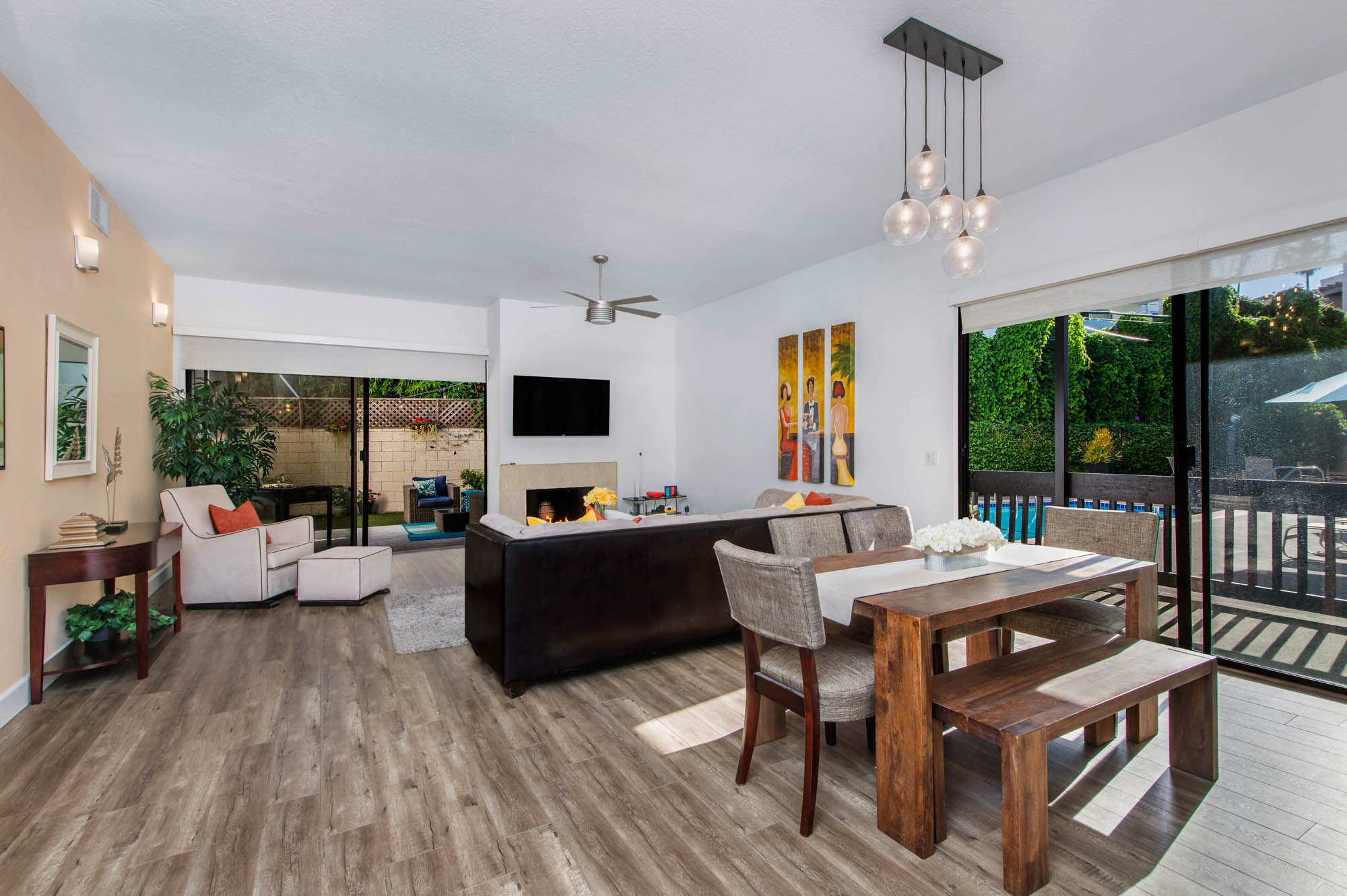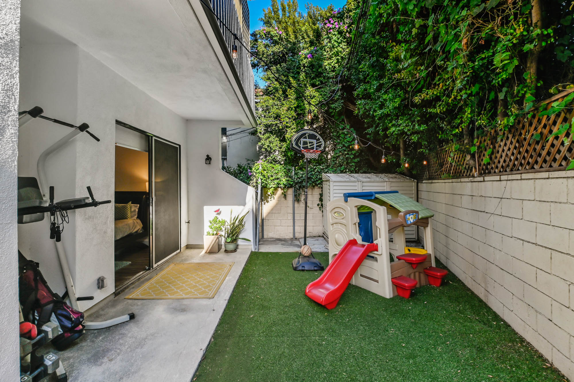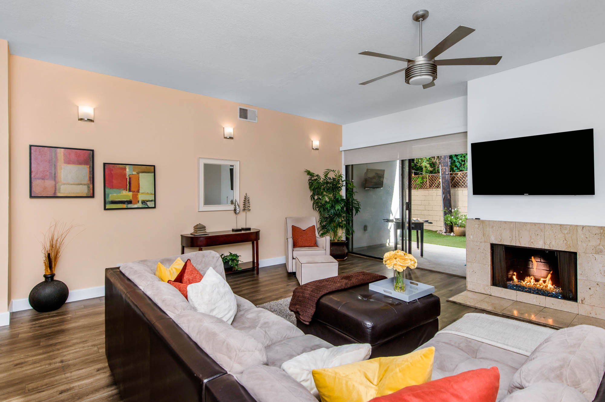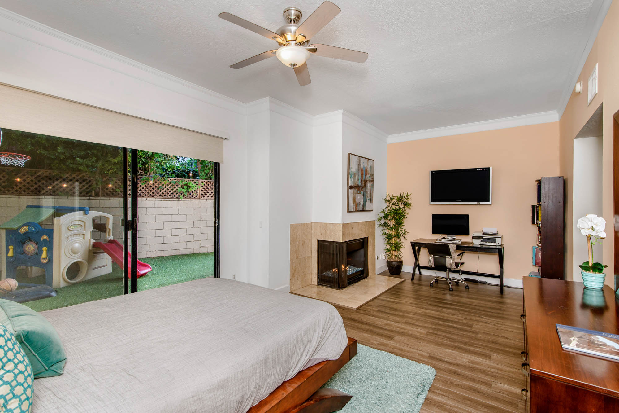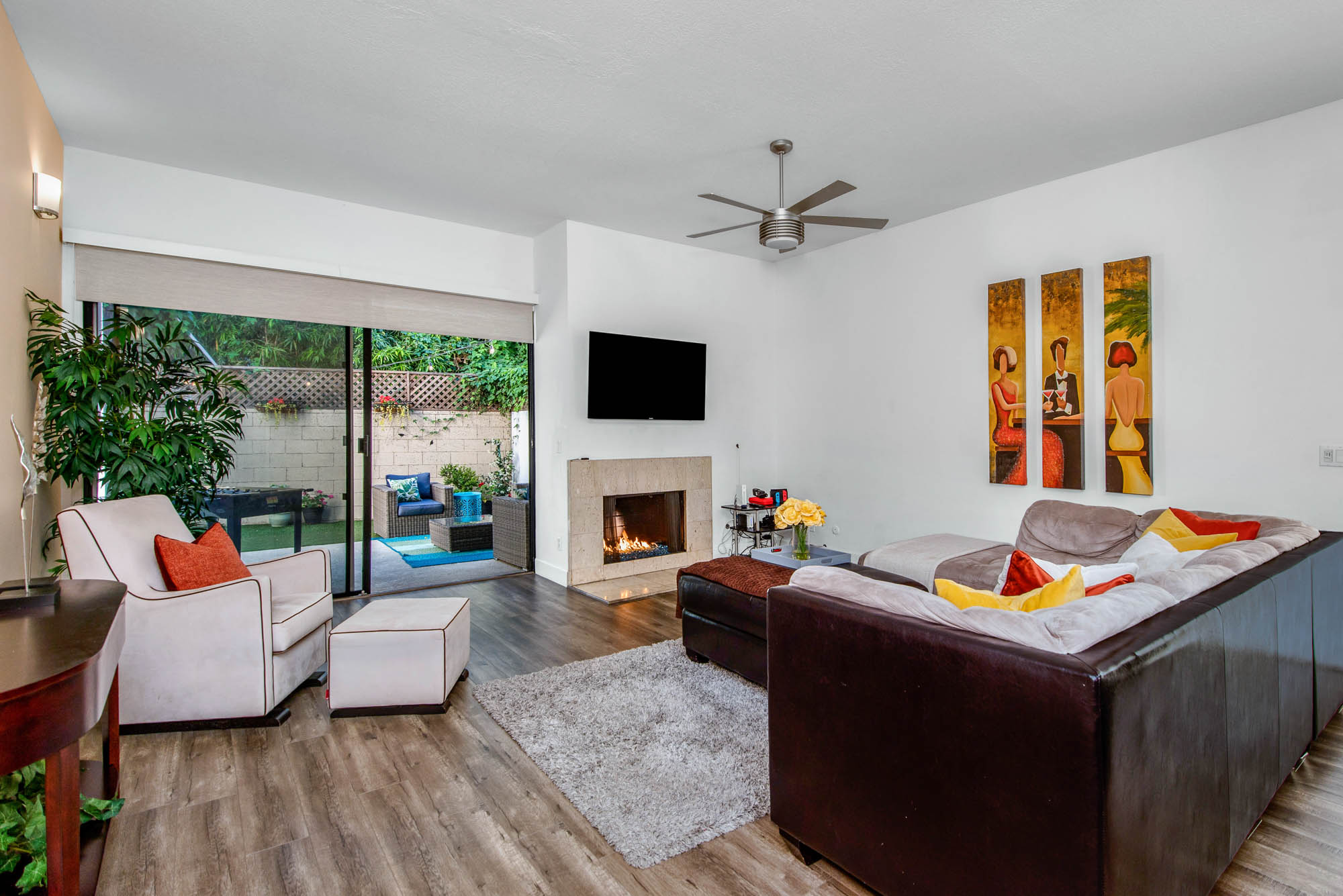 Located in Carpenter School District in one of the best pockets of Studio City is this 2 bed, 2 bath condo with rare private outdoor area. This light and bring home offers 1,359 square feet of living space, accentuated by high ceilings and an abundance of natural light. The spacious living/dining room offers a crushed glass fireplace and two sets of sliding doors, one to your large private “backyard,” and another to a patio which opens directly to the updated pool area. The remodeled kitchen has quartz counters and backsplash, plenty of storage, newer appliances, breakfast nook, and breakfast bar that opens to the dining area and living room. The master suite is large enough for a sitting area or office nook and has a fireplace as well as its own access to the backyard. The master bath has dual vanities, a walk in shower, and separate soaker tub. The most coveted feature of this home is the backyard space with large grassy turf and multiple seating areas, something you won’t find in any other local condo. Additional features include recently renovated common spaces, heated pool, subterranean gated parking, newer HVAC unit, custom door and window shades, and more. Moments from the famed Studio City Farmer’s Market, CBS lot, and the shops and restaurants of Ventura Blvd. This rare find won’t last long!
