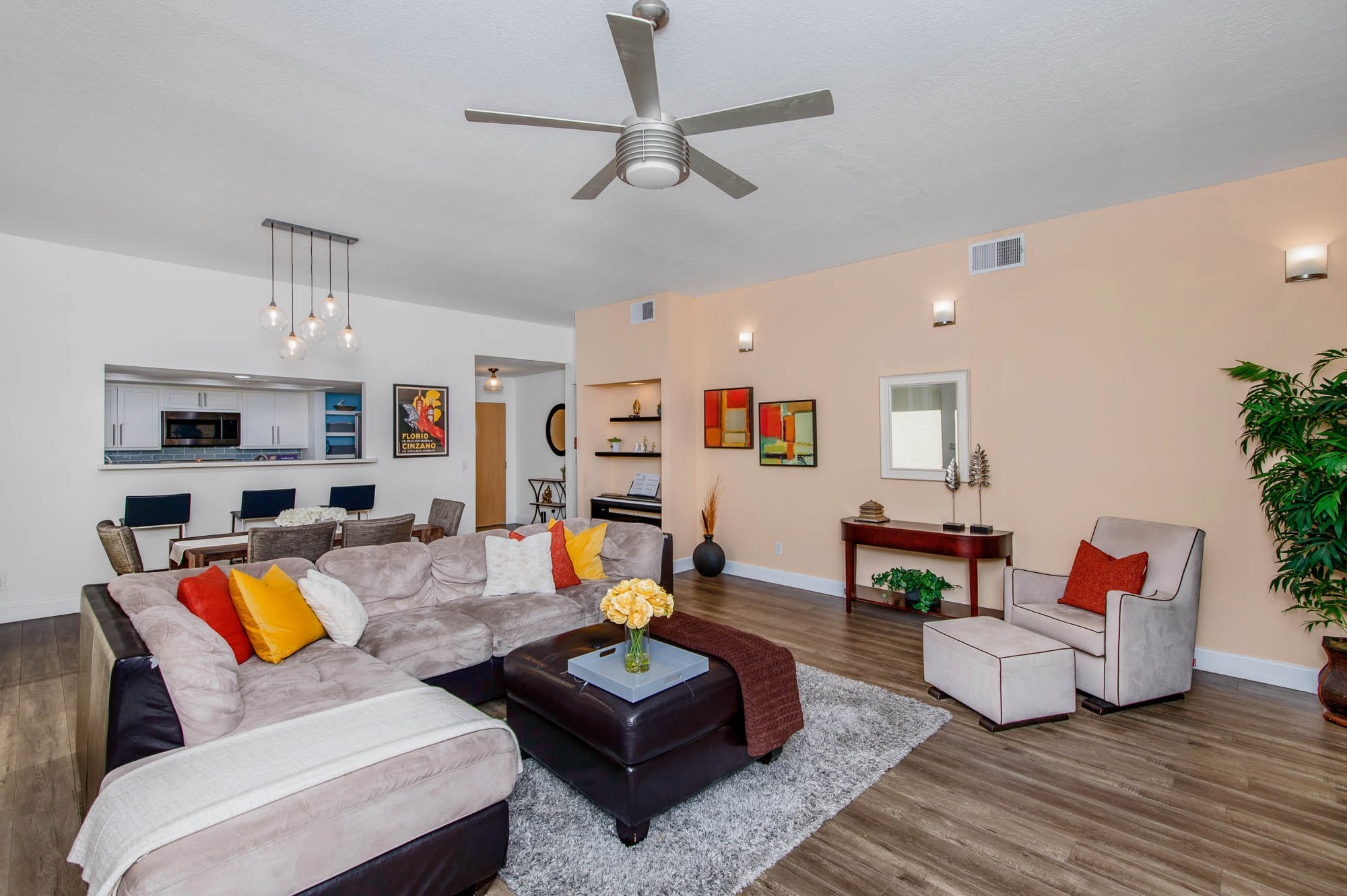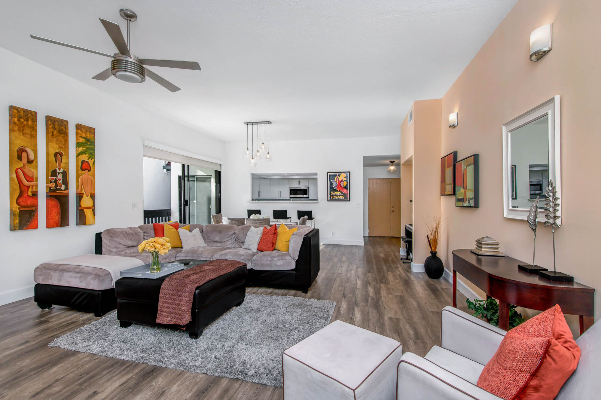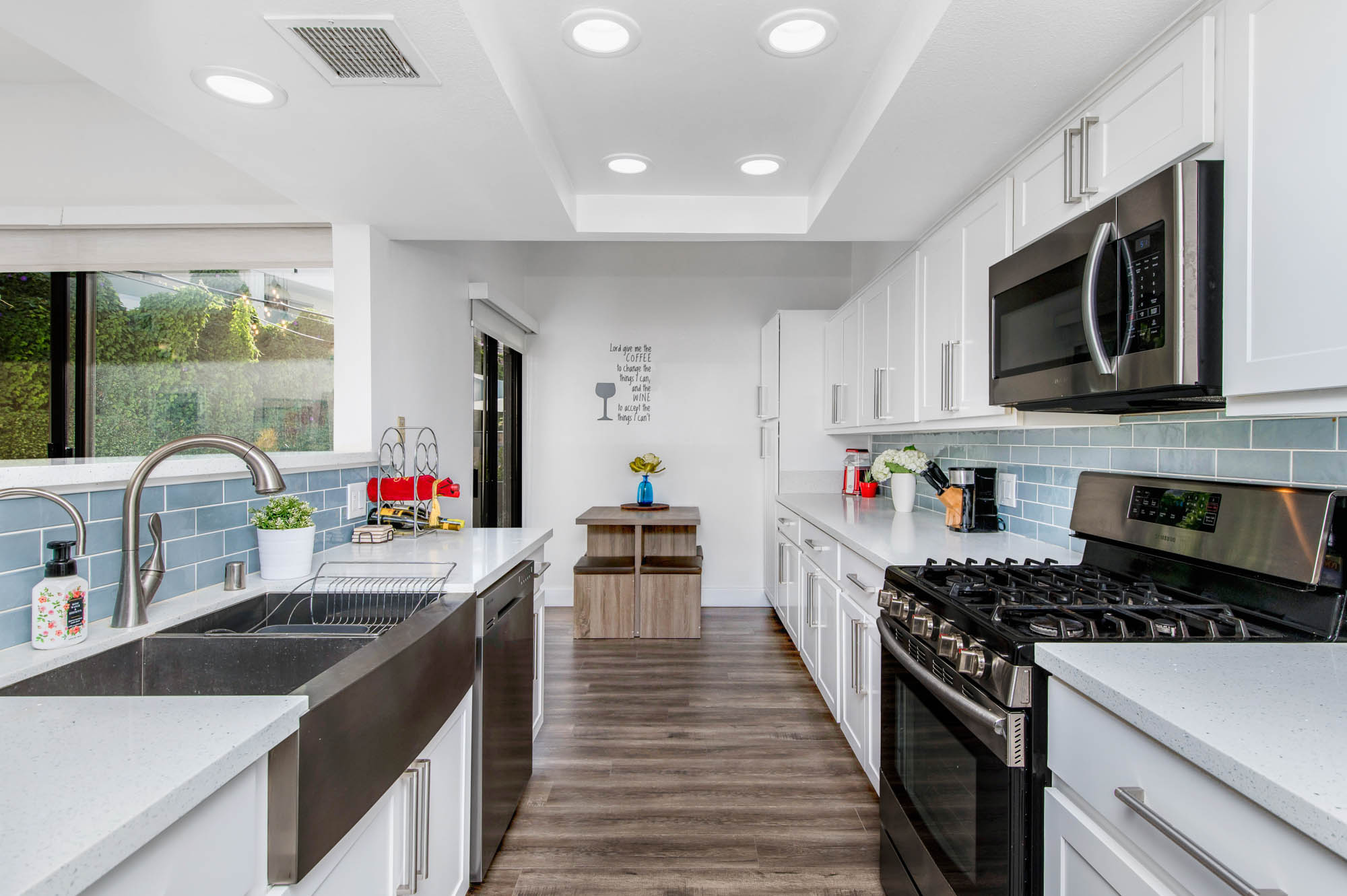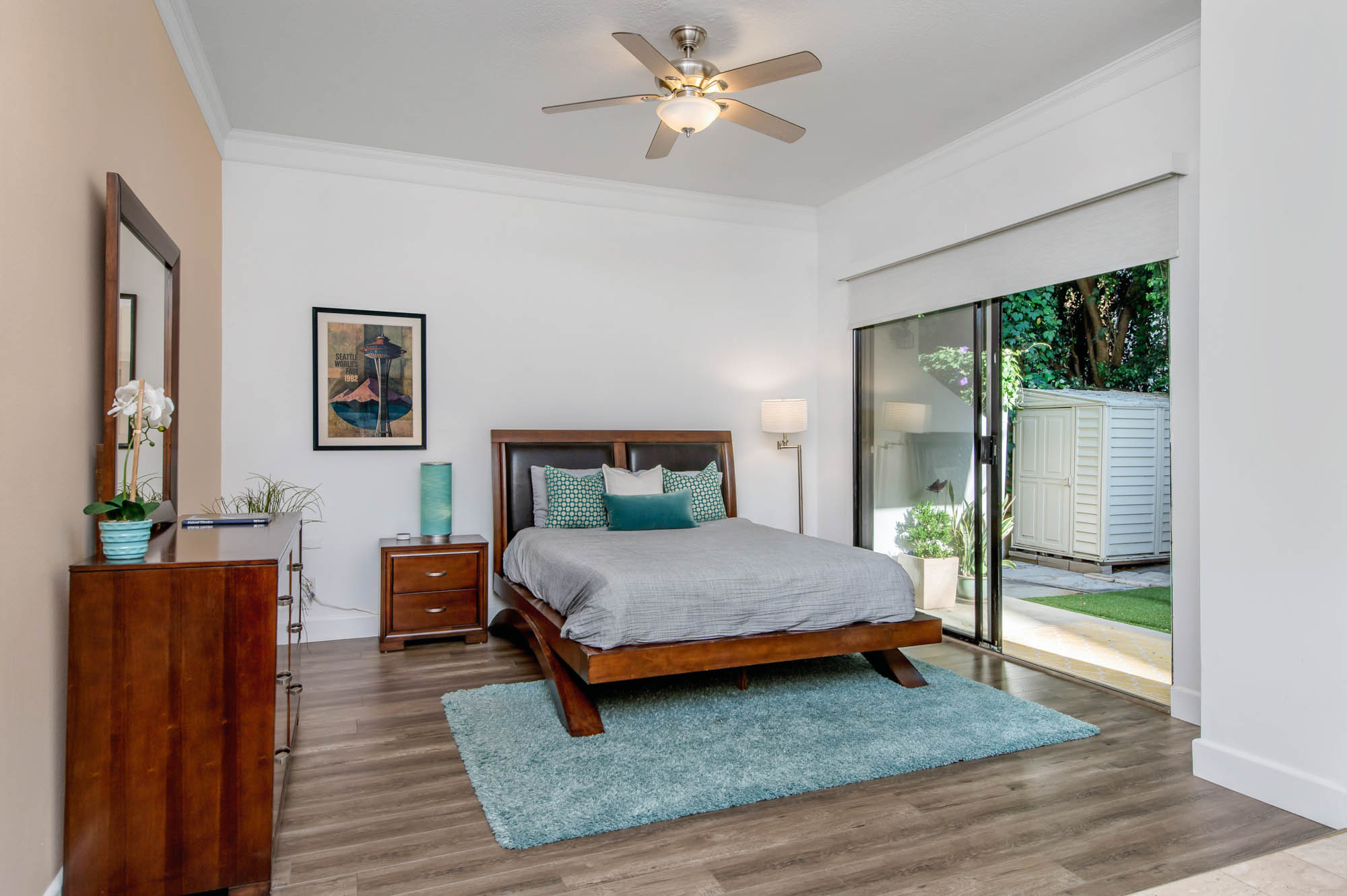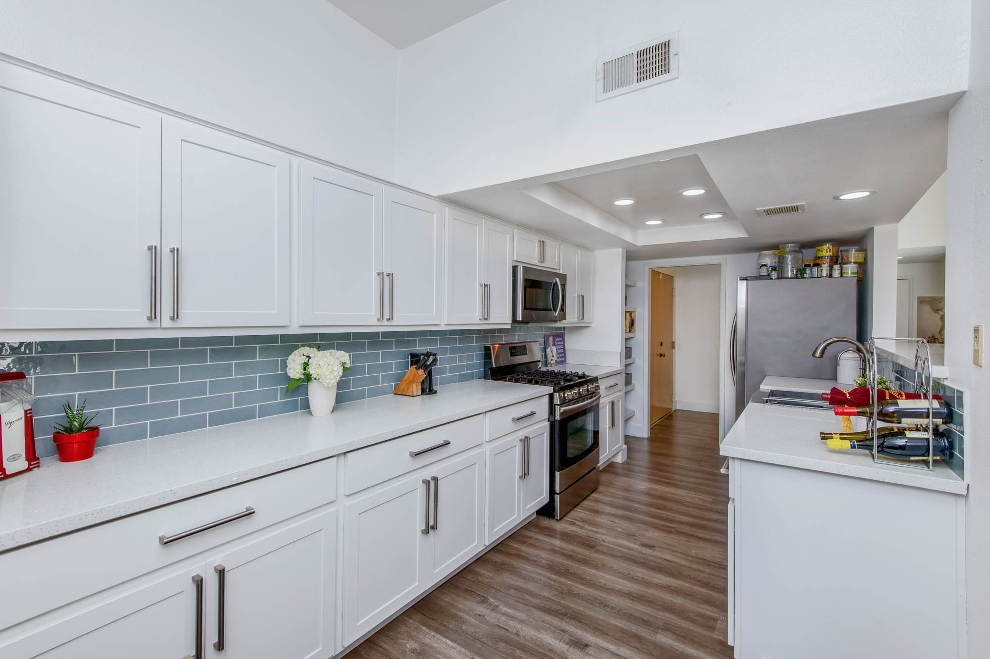 Located in Carpenter School District in one of the best pockets of Studio City is this 2 bed, 2 bath condo with rare private outdoor area. This light and bring home offers 1,359 square feet of living space, accentuated by high ceilings and an abundance of natural light. The spacious living/dining room offers a crushed glass fireplace and two sets of sliding doors, one to your large private “backyard,” and another to a patio which opens directly to the updated pool area. The remodeled kitchen has quartz counters and backsplash, plenty of storage, newer appliances, breakfast nook, and breakfast bar that opens to the dining area and living room. The master suite is large enough for a sitting area or office nook and has a fireplace as well as its own access to the backyard. The master bath has dual vanities, a walk in shower, and separate soaker tub. The most coveted feature of this home is the backyard space with large grassy turf and multiple seating areas, something you won’t find in any other local condo. Additional features include recently renovated common spaces, heated pool, subterranean gated parking, newer HVAC unit, custom door and window shades, and more. Moments from the famed Studio City Farmer’s Market, CBS lot, and the shops and restaurants of Ventura Blvd. This rare find won’t last long!
