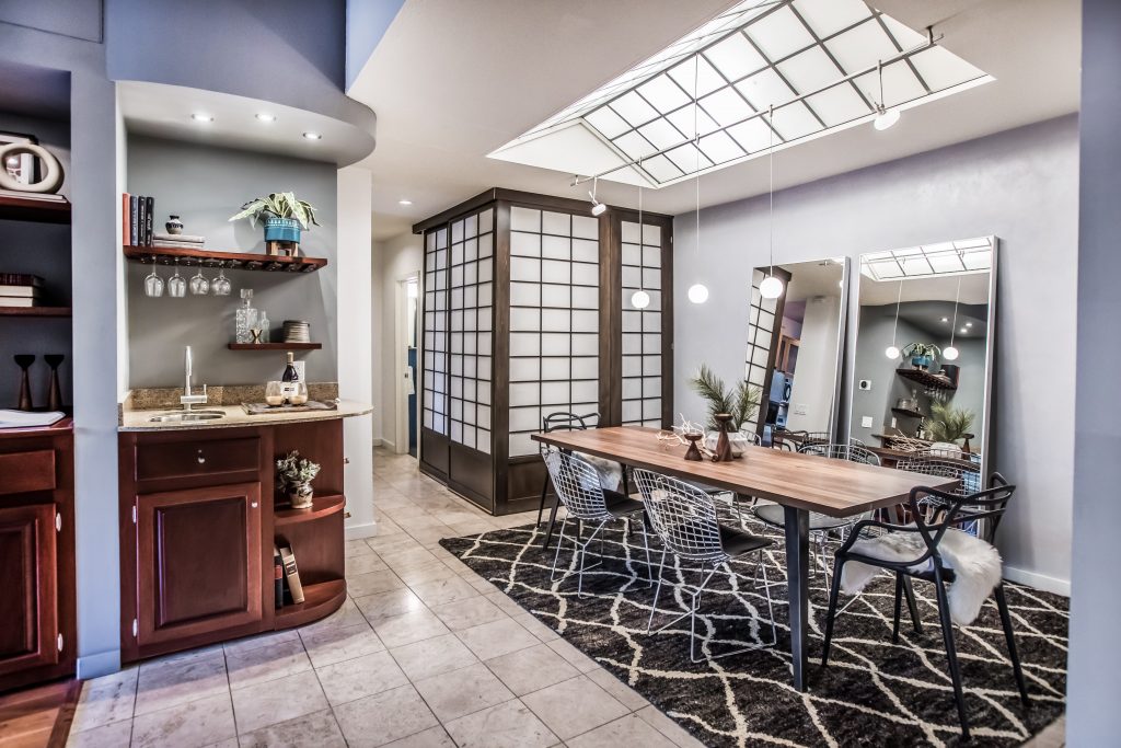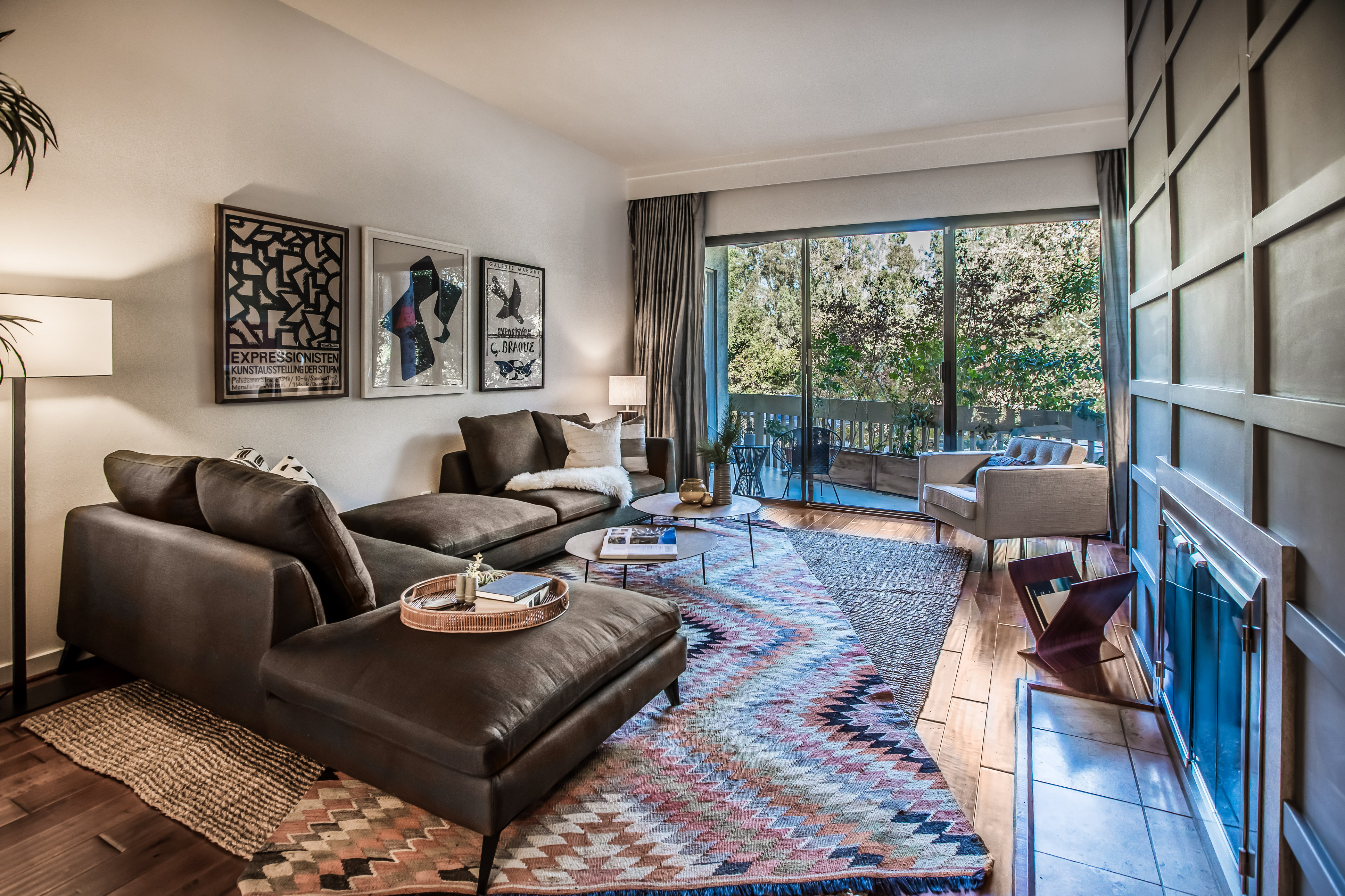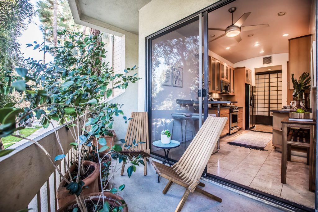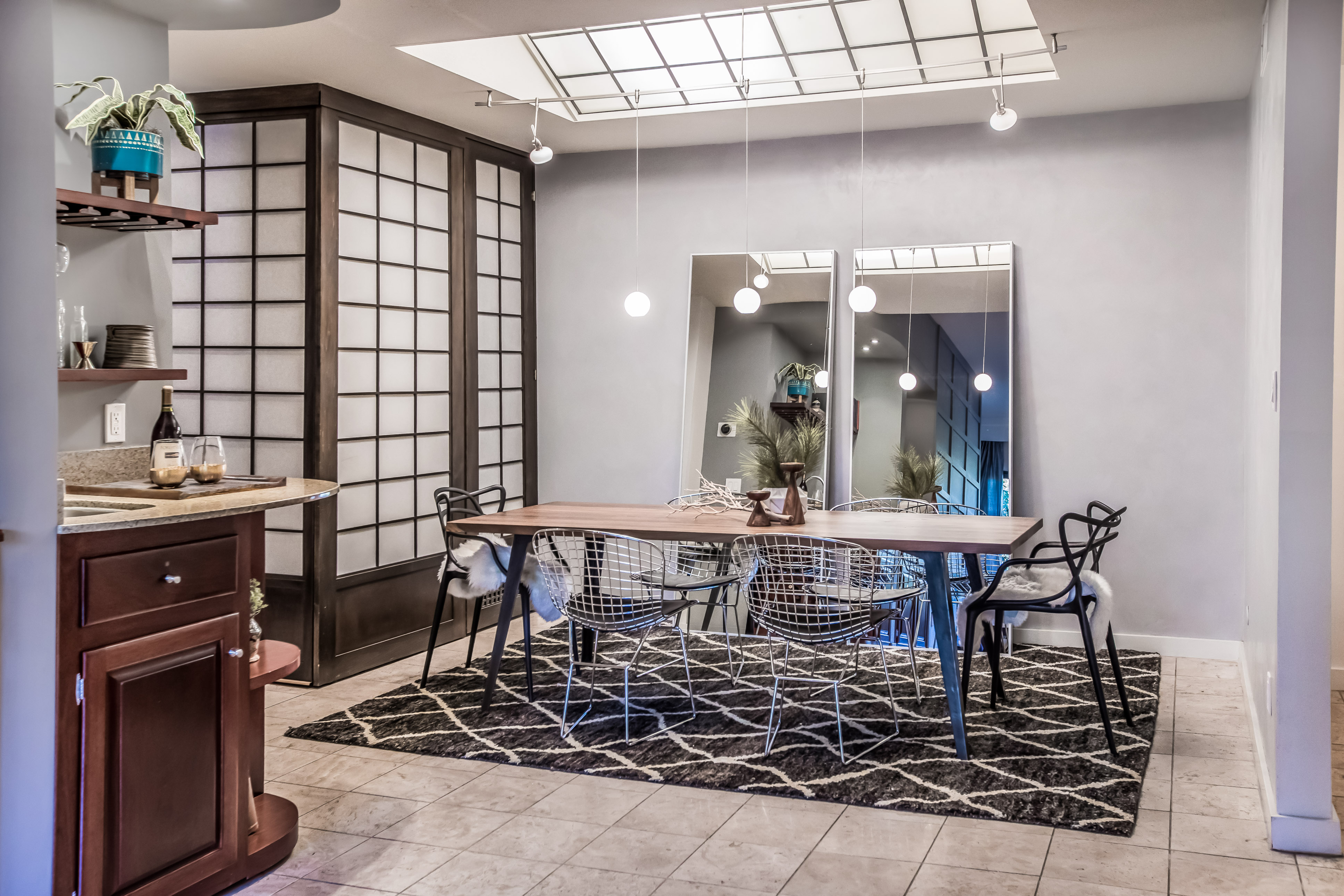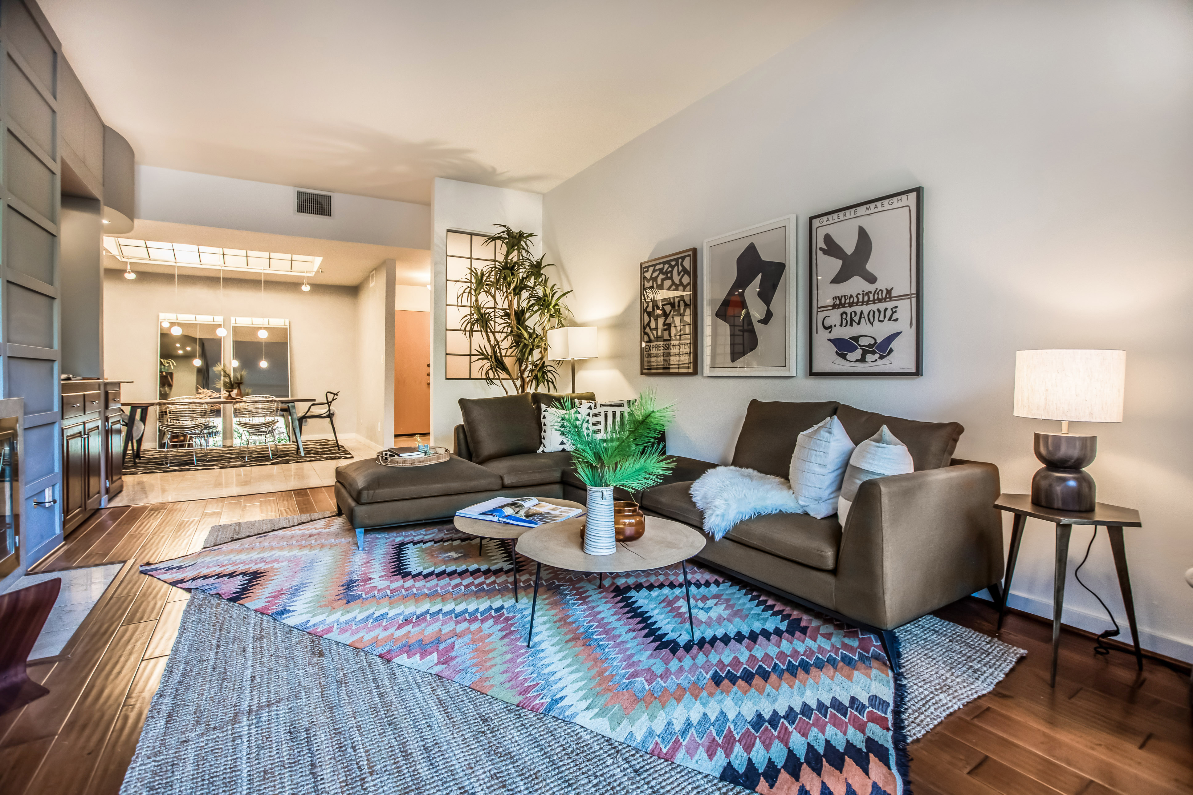 view. The dining room accentuates feng shui design elements with a pitched ceiling, custom lighting, and shoji screens. The kitchen offers stainless steel appliances, Caesarstone countertops, and a breakfast bar that opens to the balcony. The master suite boasts luxury with a custom California walk-in closet, high ceilings, fireplace, and balcony as well as an en-suite bathroom with new tile, dual sinks, soaking tub and a separate shower. This gorgeous home offers high ceilings throughout and an abundance of natural light. Travertine flooring in the foyer, kitchen, master bath, and dining room. With amenities such as washer and dryer in the unit, side by side parking, and low HOA fees that include EQ Insurance. It truly is the best condo on the market!