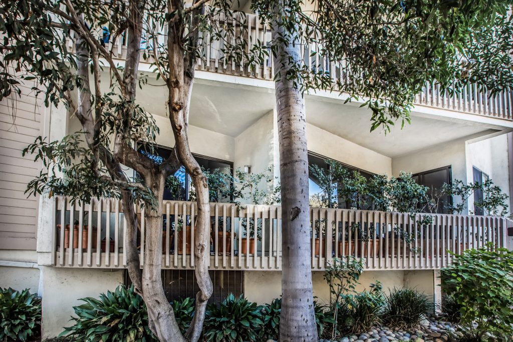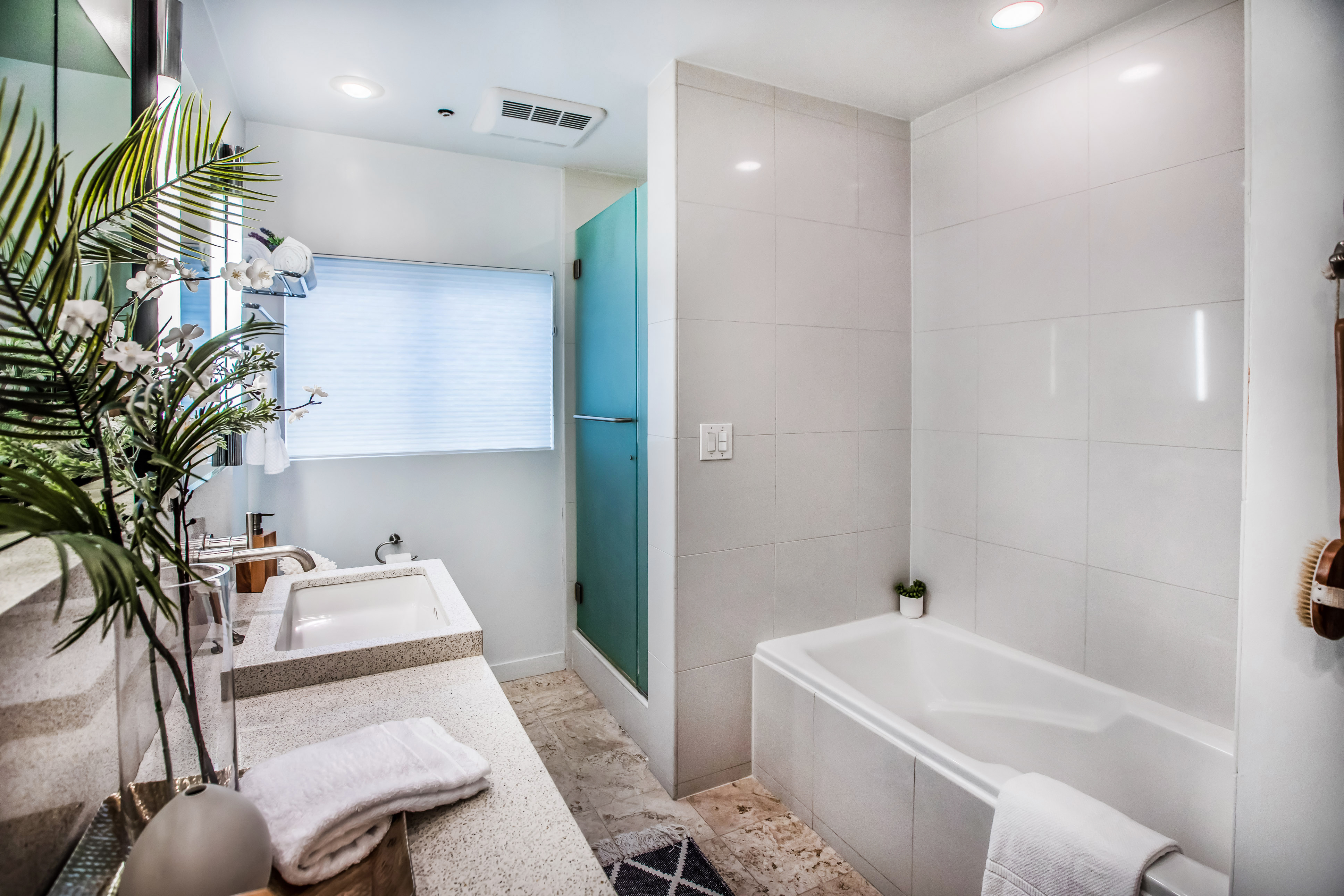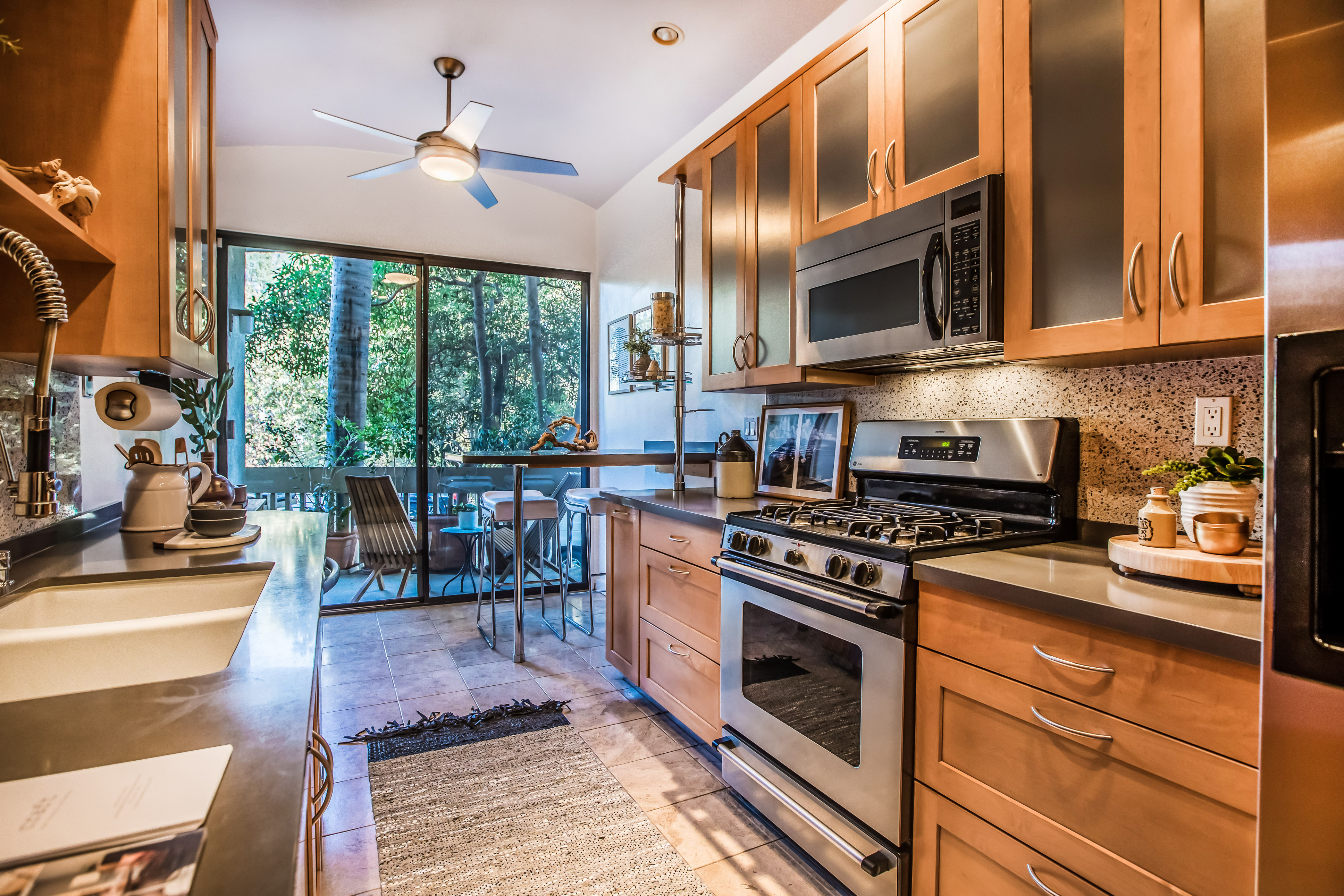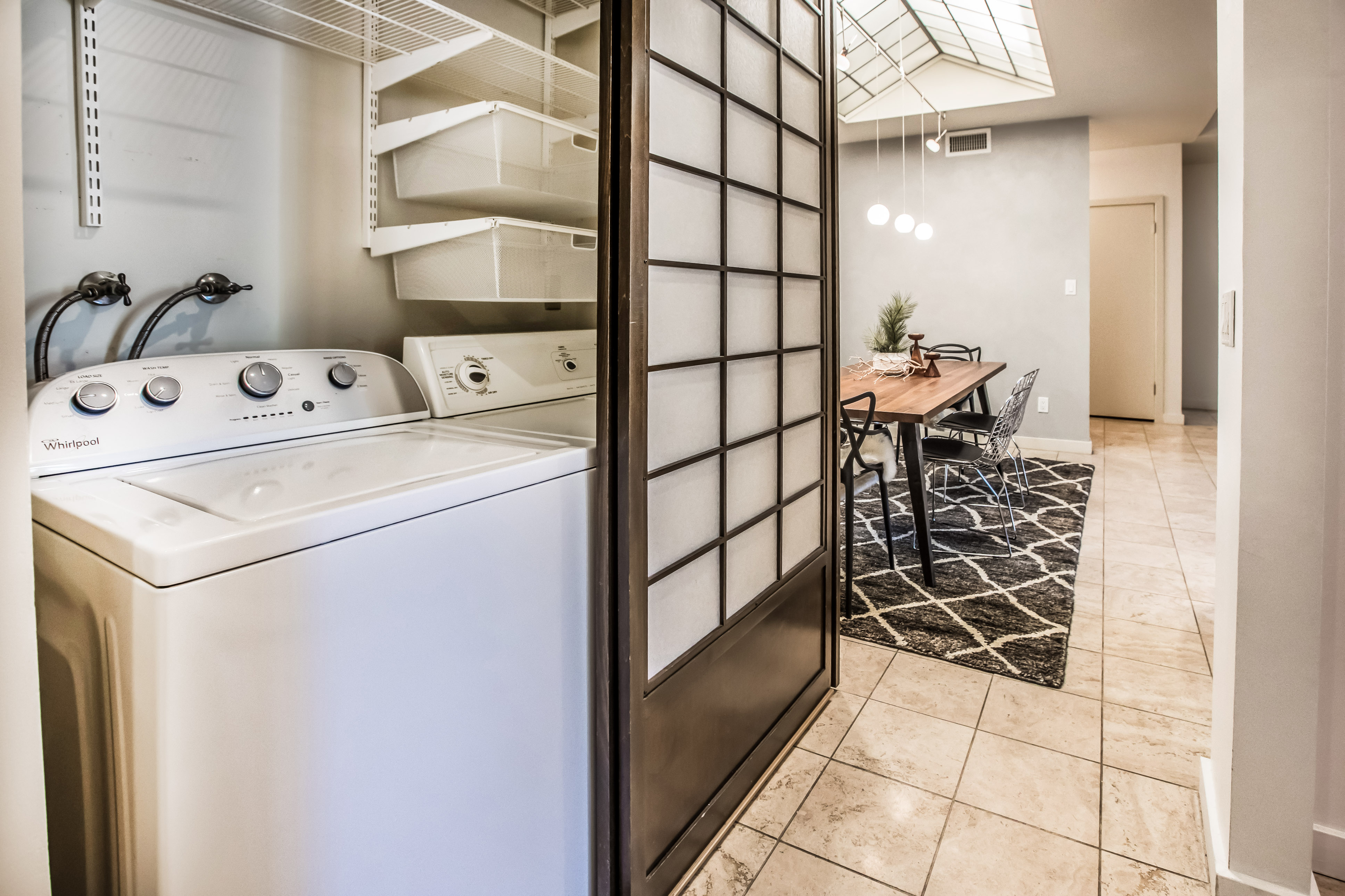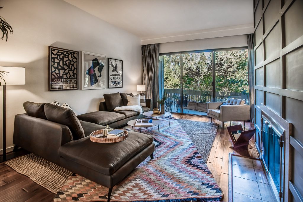 view. The dining room accentuates feng shui design elements with a pitched ceiling, custom lighting, and shoji screens. The kitchen offers stainless steel appliances, Caesarstone countertops, and a breakfast bar that opens to the balcony. The master suite boasts luxury with a custom California walk-in closet, high ceilings, fireplace, and balcony as well as an en-suite bathroom with new tile, dual sinks, soaking tub and a separate shower. This gorgeous home offers high ceilings throughout and an abundance of natural light. Travertine flooring in the foyer, kitchen, master bath, and dining room. With amenities such as washer and dryer in the unit, side by side parking, and low HOA fees that include EQ Insurance. It truly is the best condo on the market!