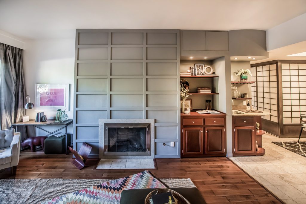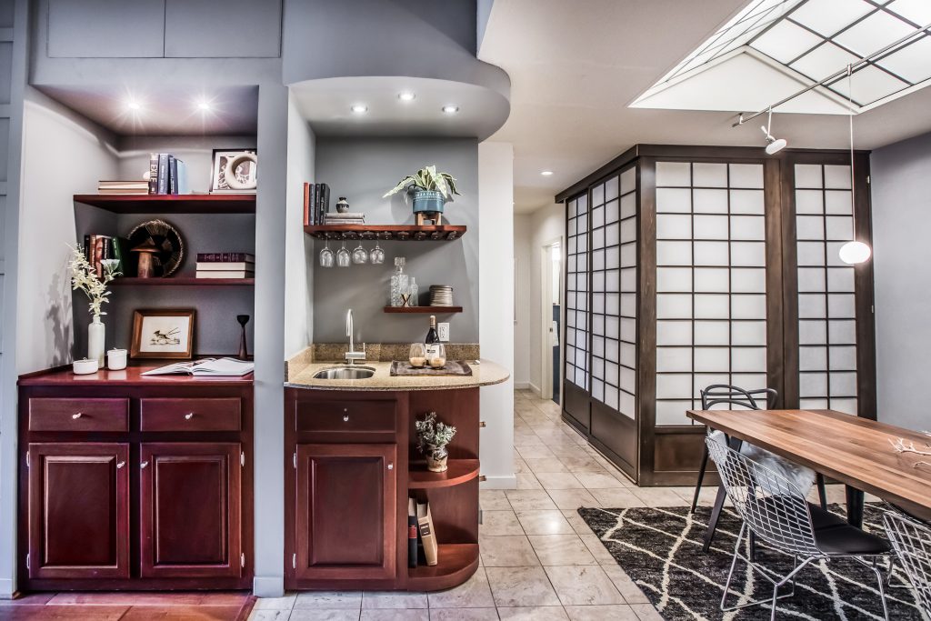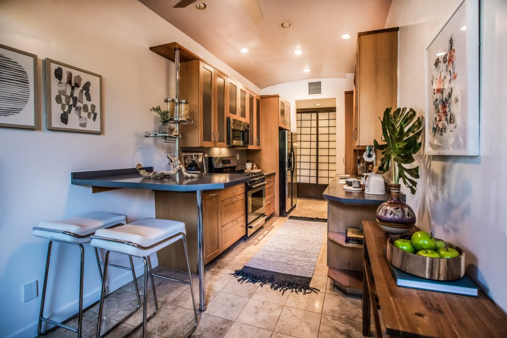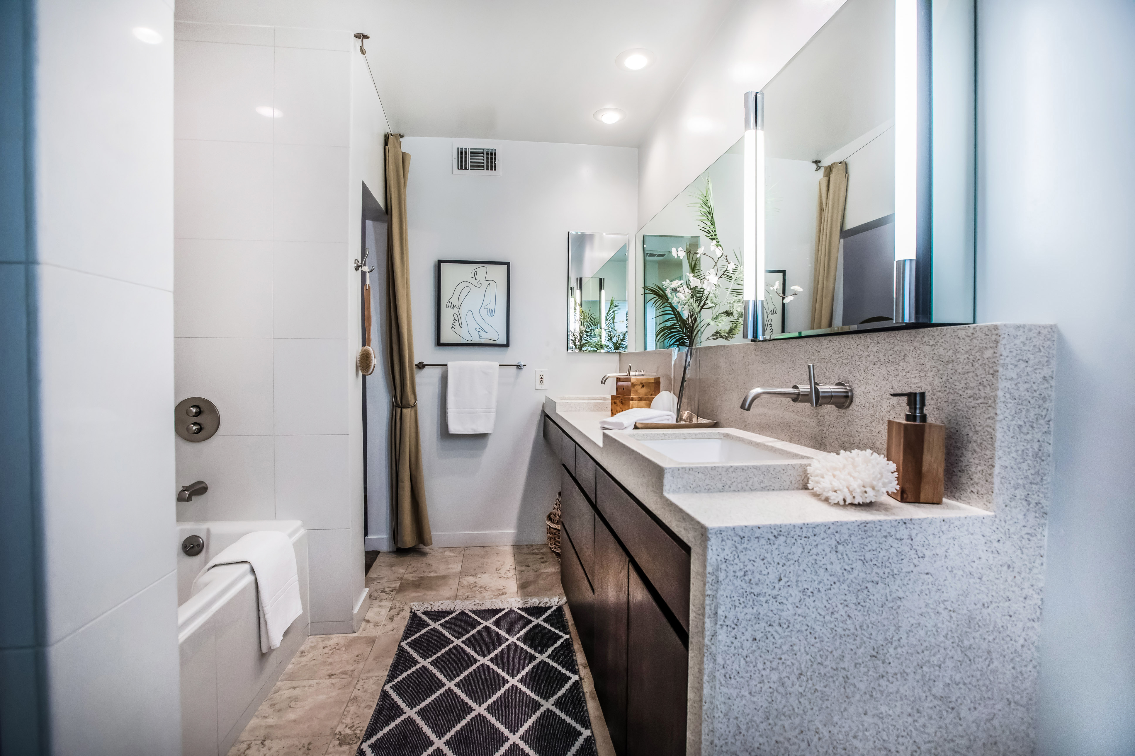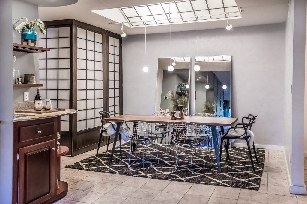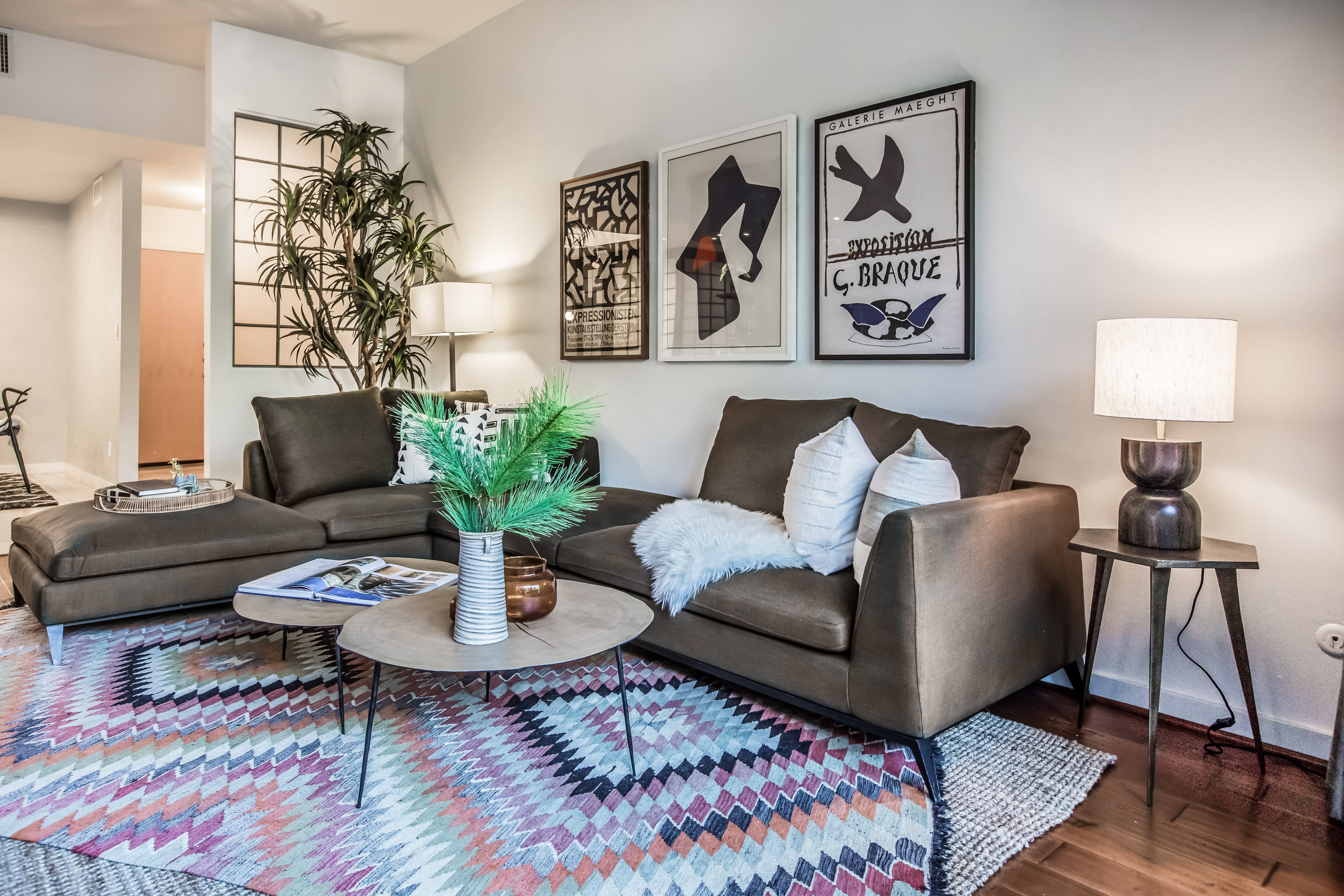 view. The dining room accentuates feng shui design elements with a pitched ceiling, custom lighting, and shoji screens. The kitchen offers stainless steel appliances, Caesarstone countertops, and a breakfast bar that opens to the balcony. The master suite boasts luxury with a custom California walk-in closet, high ceilings, fireplace, and balcony as well as an en-suite bathroom with new tile, dual sinks, soaking tub and a separate shower. This gorgeous home offers high ceilings throughout and an abundance of natural light. Travertine flooring in the foyer, kitchen, master bath, and dining room. With amenities such as washer and dryer in the unit, side by side parking, and low HOA fees that include EQ Insurance. It truly is the best condo on the market!