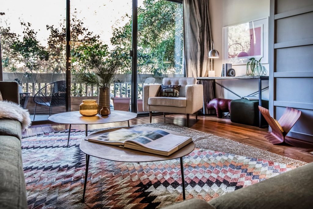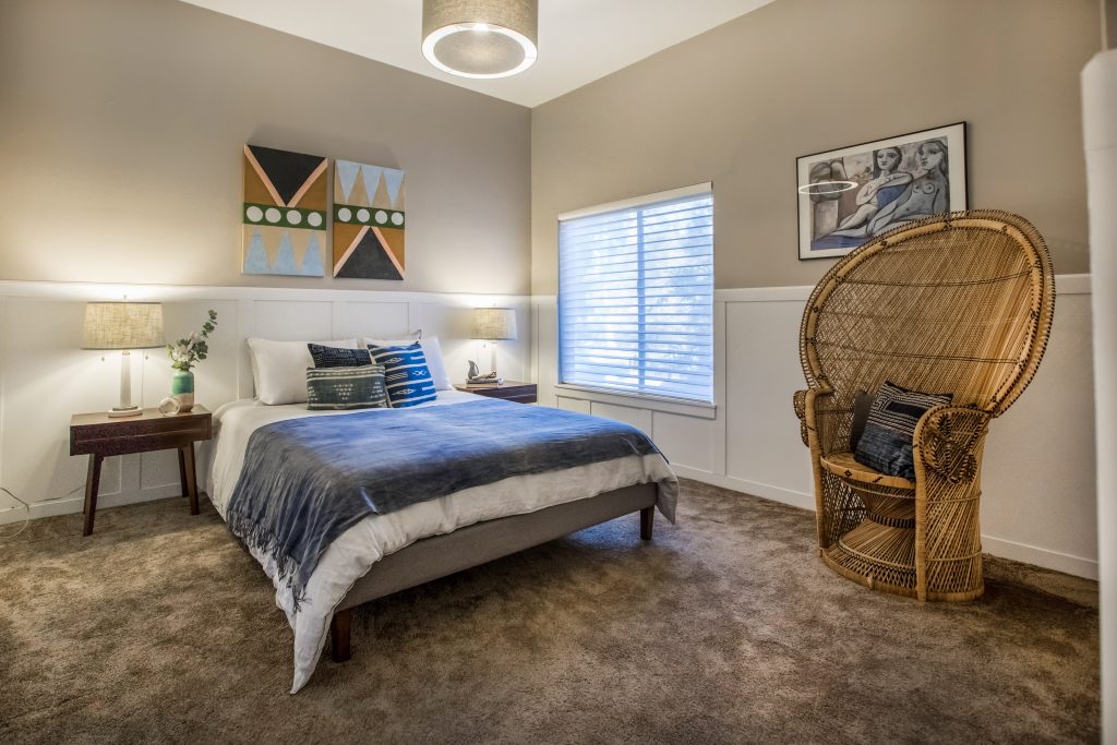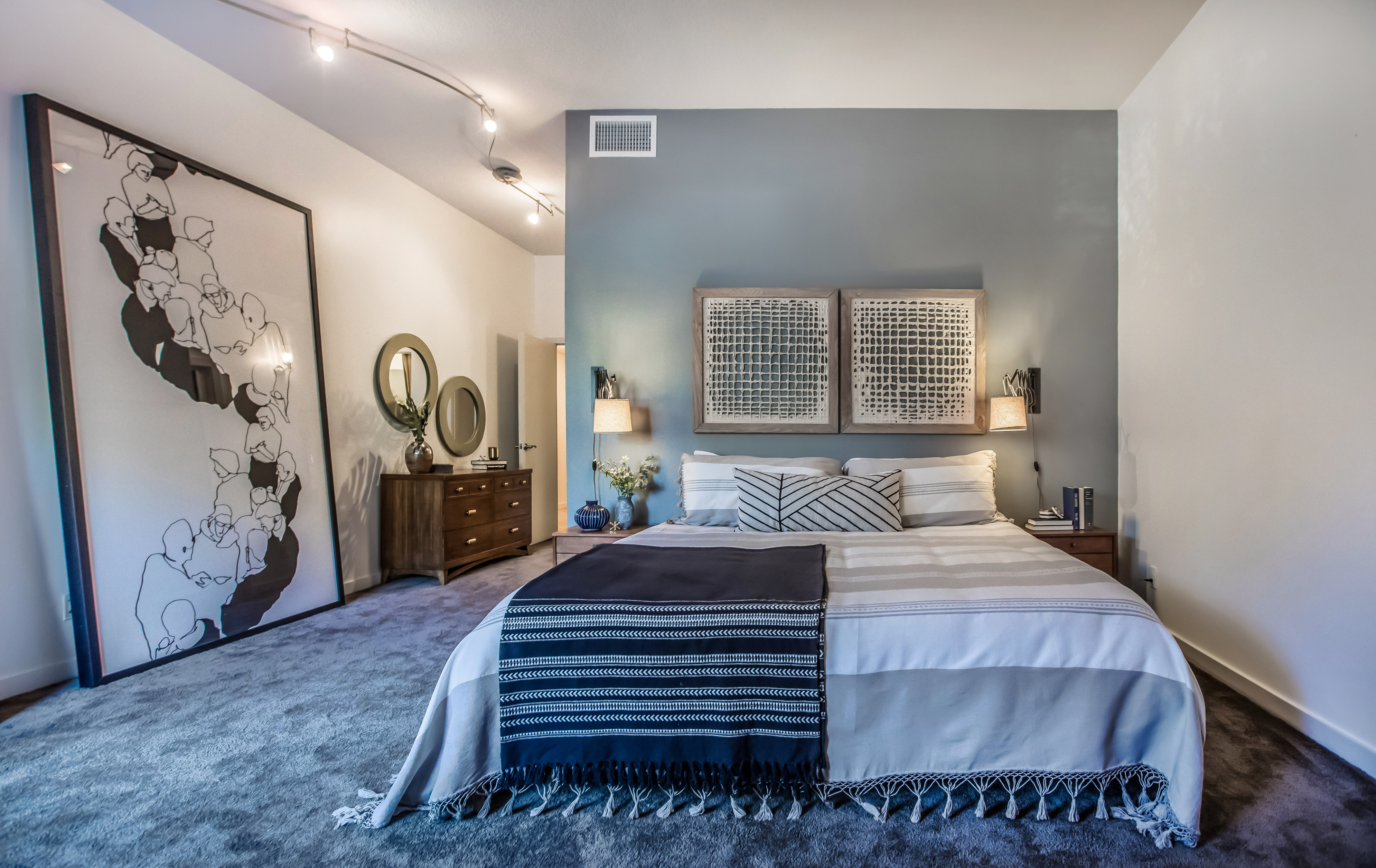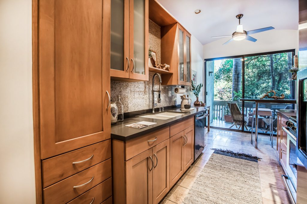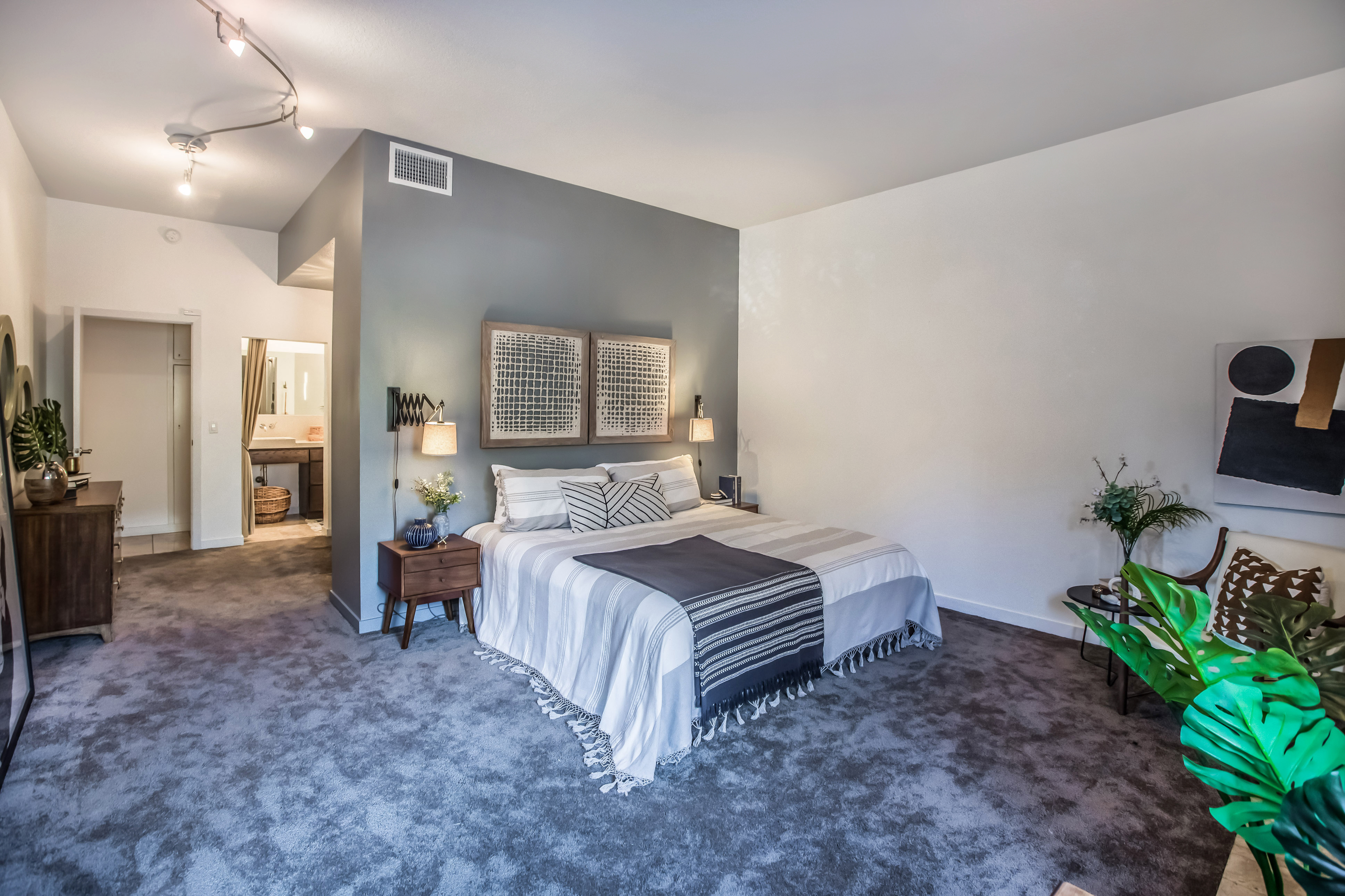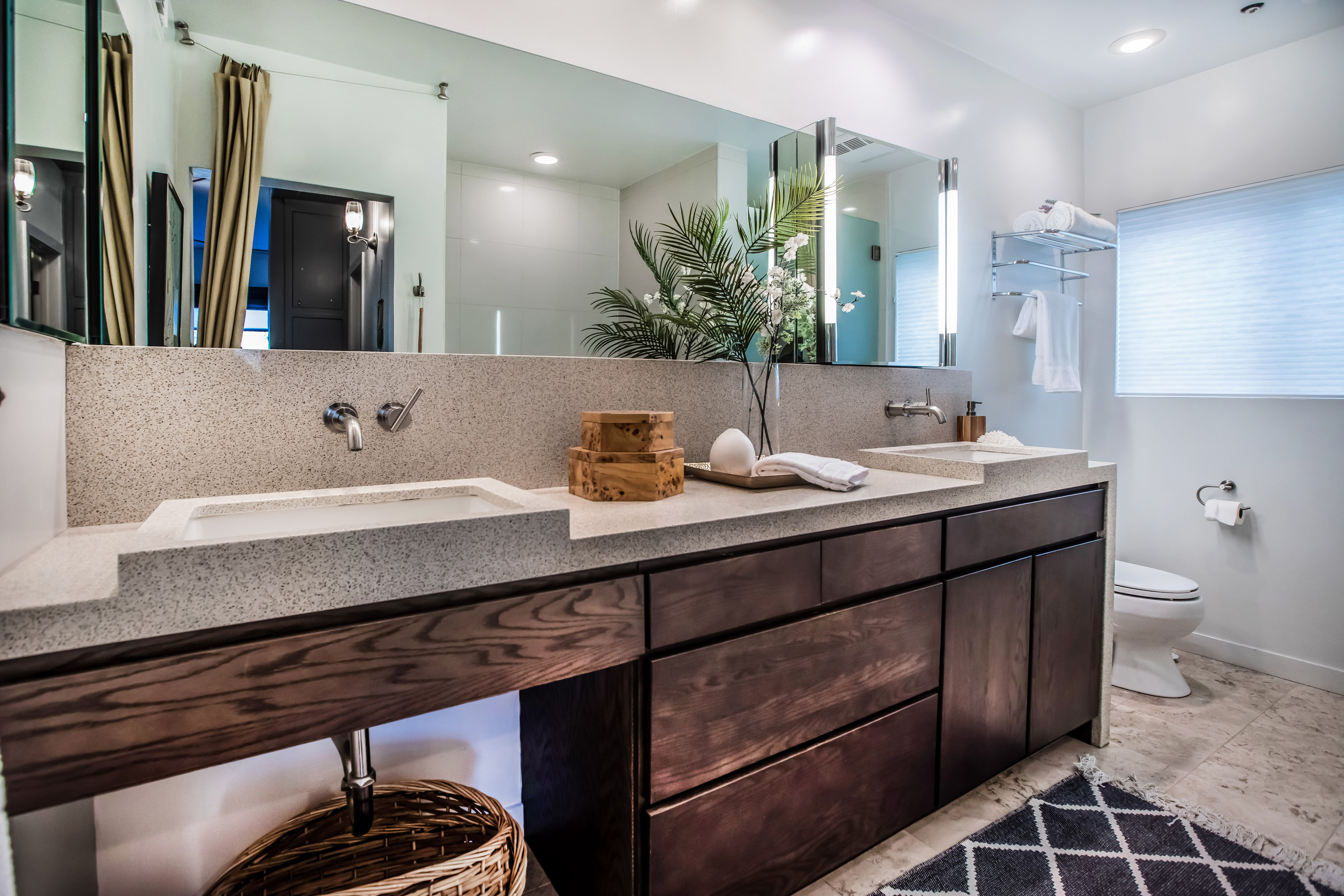 view. The dining room accentuates feng shui design elements with a pitched ceiling, custom lighting, and shoji screens. The kitchen offers stainless steel appliances, Caesarstone countertops, and a breakfast bar that opens to the balcony. The master suite boasts luxury with a custom California walk-in closet, high ceilings, fireplace, and balcony as well as an en-suite bathroom with new tile, dual sinks, soaking tub and a separate shower. This gorgeous home offers high ceilings throughout and an abundance of natural light. Travertine flooring in the foyer, kitchen, master bath, and dining room. With amenities such as washer and dryer in the unit, side by side parking, and low HOA fees that include EQ Insurance. It truly is the best condo on the market!