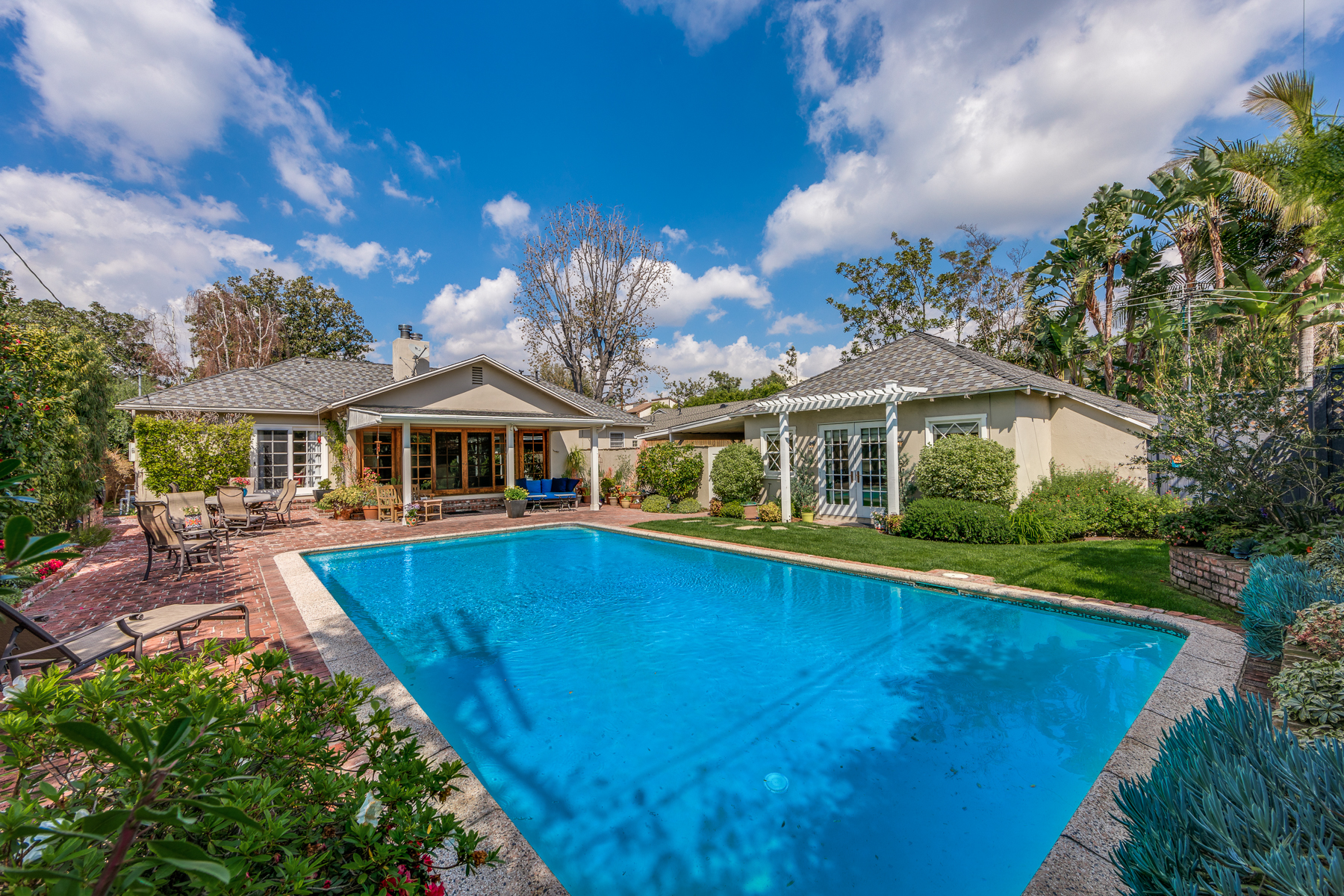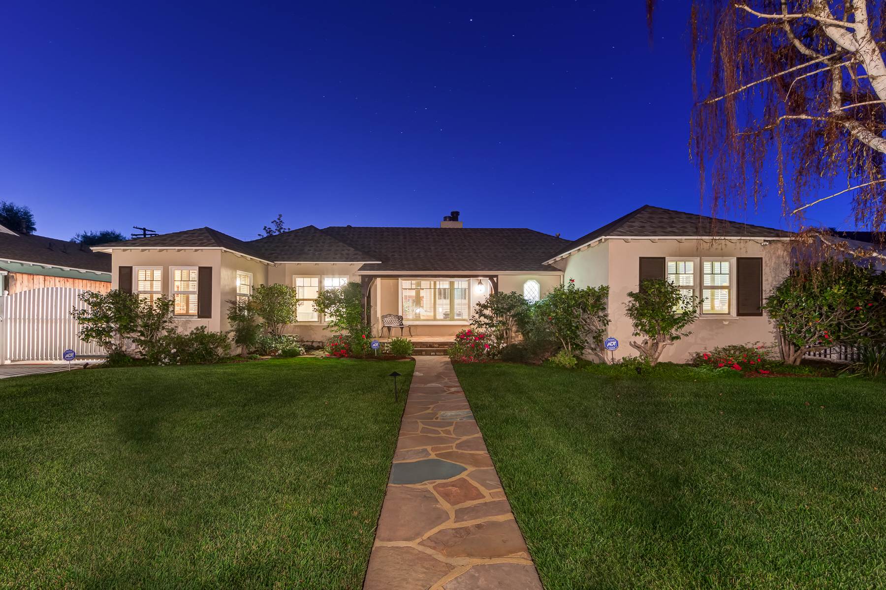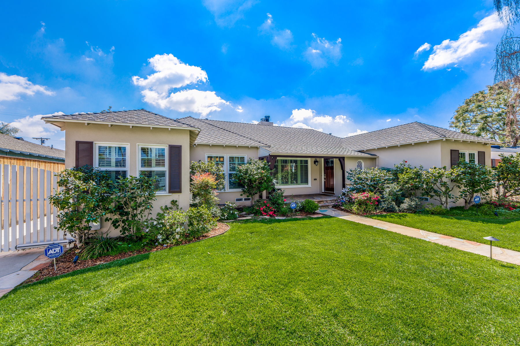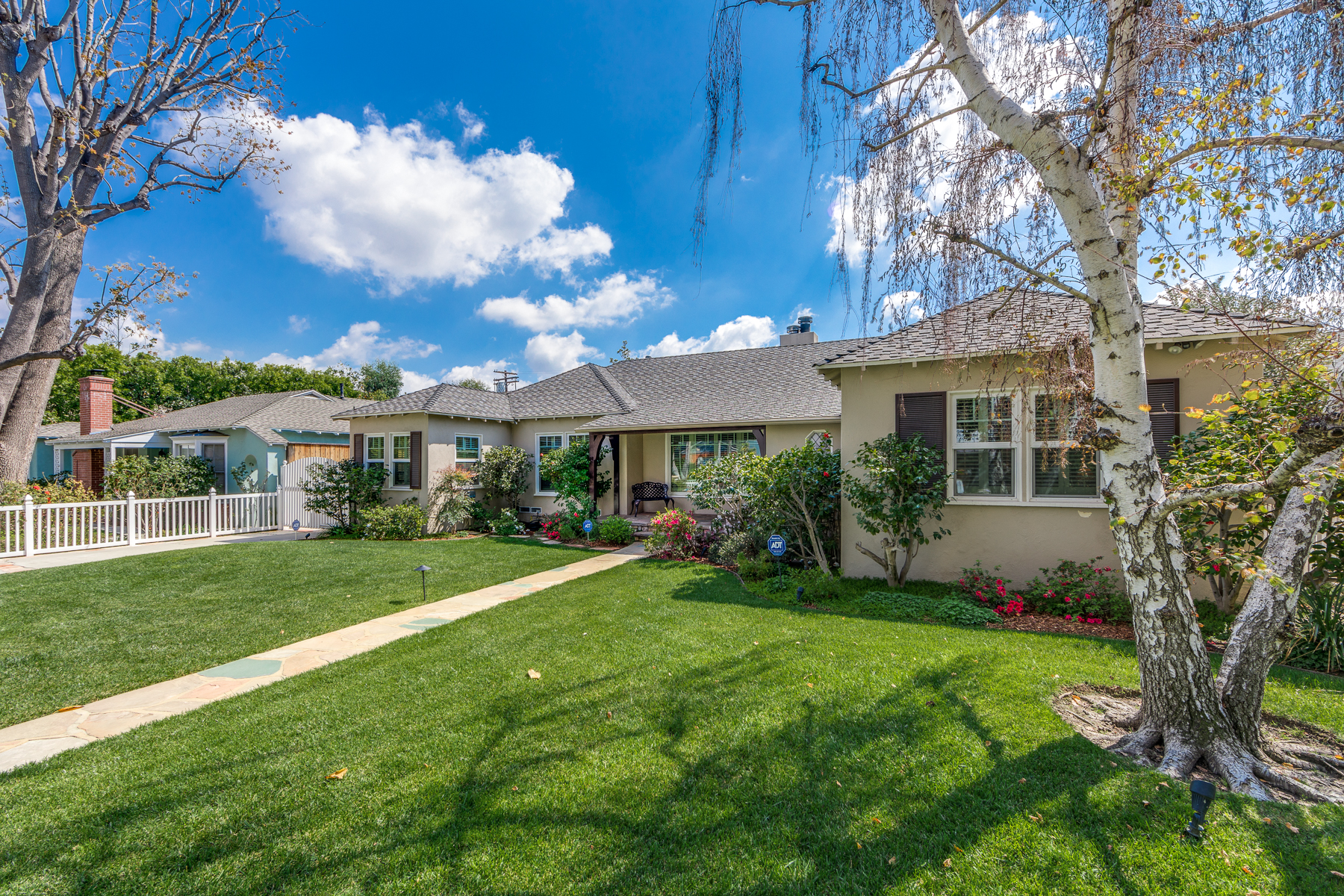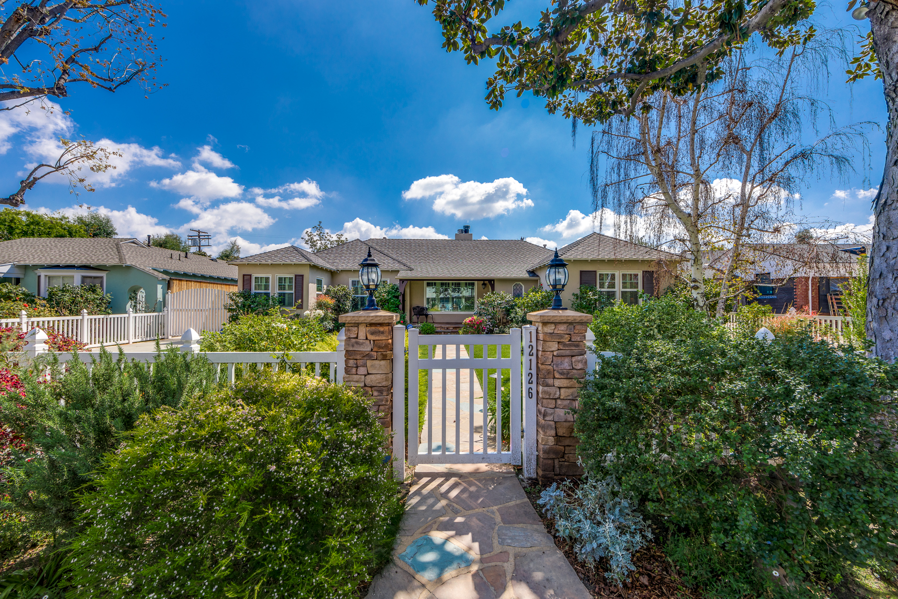 Charismatic 3 bed, 2 bath single story home in the Colfax School District of prime Valley Village. Beyond the charming white picket fence lies a lush front yard with well-manicured landscaping. Upon entry, you are greeted by hardwood floors and an abundance of natural light. The formal living room, with the first of two fireplaces, flows effortlessly to the formal dining room, lined with luxurious wainscoting. The kitchen offers a breakfast nook with built-in storage and features beautiful custom cabinets and high-end stainless steel appliances. Conveniently accessible from the kitchen is a separate laundry room with added storage and hand painted tiles. The first of three bedrooms serves as a great office space with built-in desk and en-suite bathroom. The living room shines from the full wall of windows and hosts the second fireplace, as well as a bar with built-in wine fridge. The spacious master bedroom allows direct access to the gorgeous backyard and the master bathroom is filled with luxurious details like an oversized rain shower, warmed mirror to stop fogging, in-cabinet outlets, separate soaking tub, vanity area, and generous closet space. The backyard is great for entertaining; complete with lush landscaping for additional privacy, built in BBQ, and oversized lap pool. The backyard also offers a 500+ sqft permitted, detached studio space with beamed ceilings and built-in bar– great as a rec room, home gym, studio, office, and more. Additional features in this home include instant hot tankless water heater, security system, motorized security gate, new dual pane windows, crown molding throughout, and an unbeatable location.