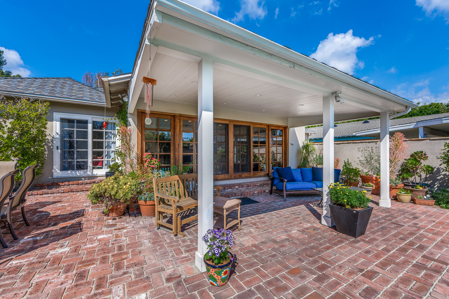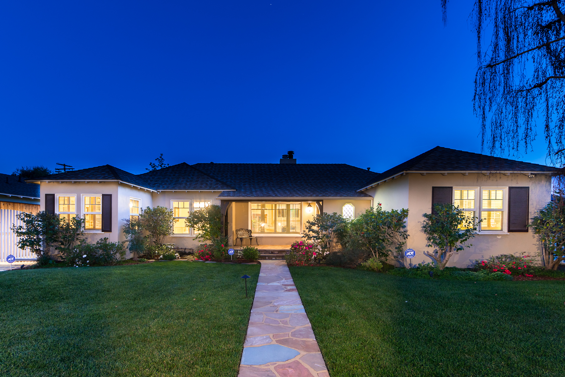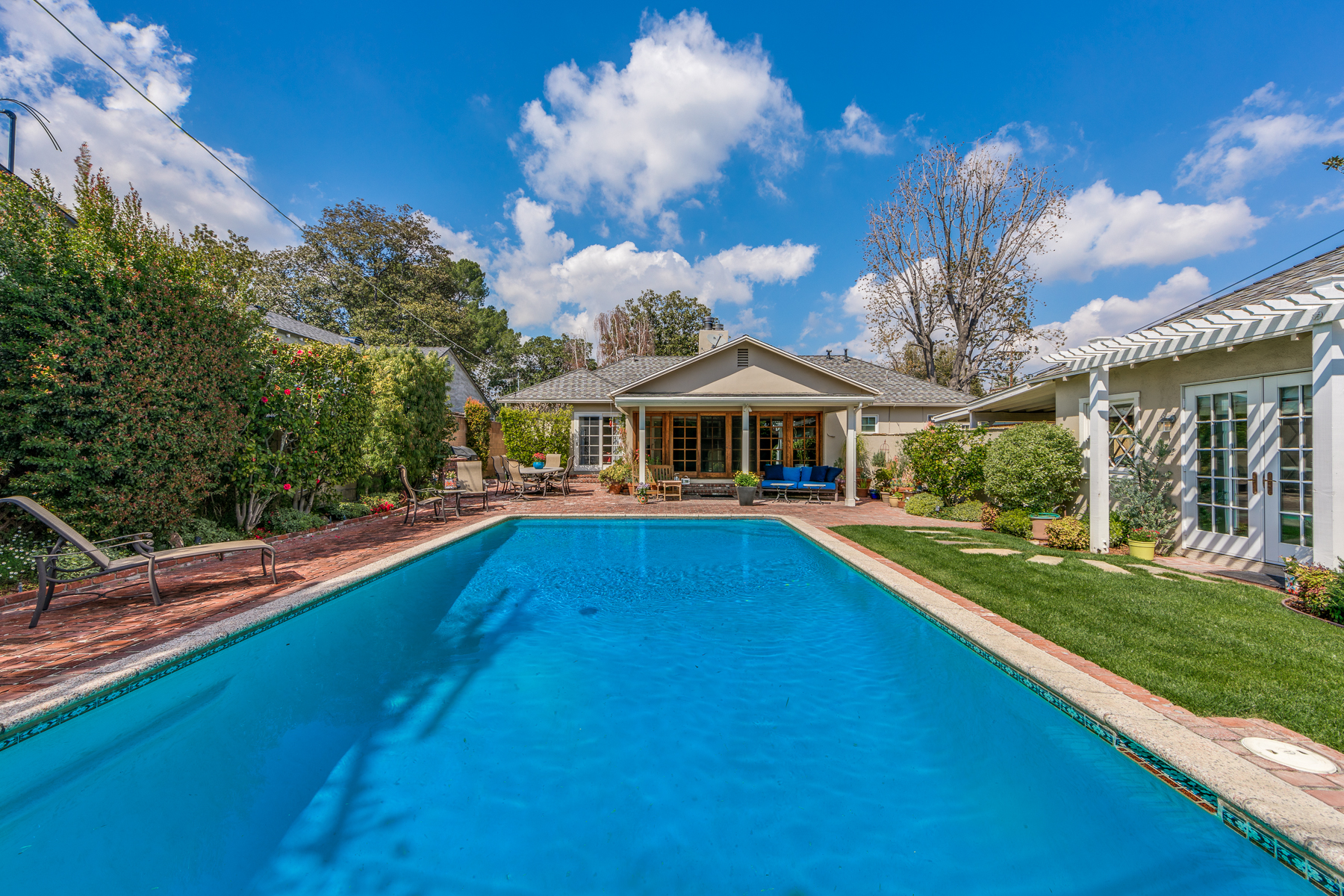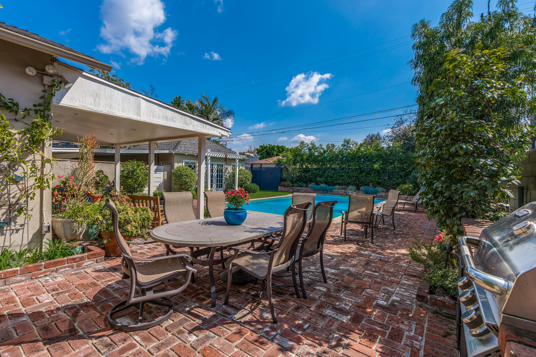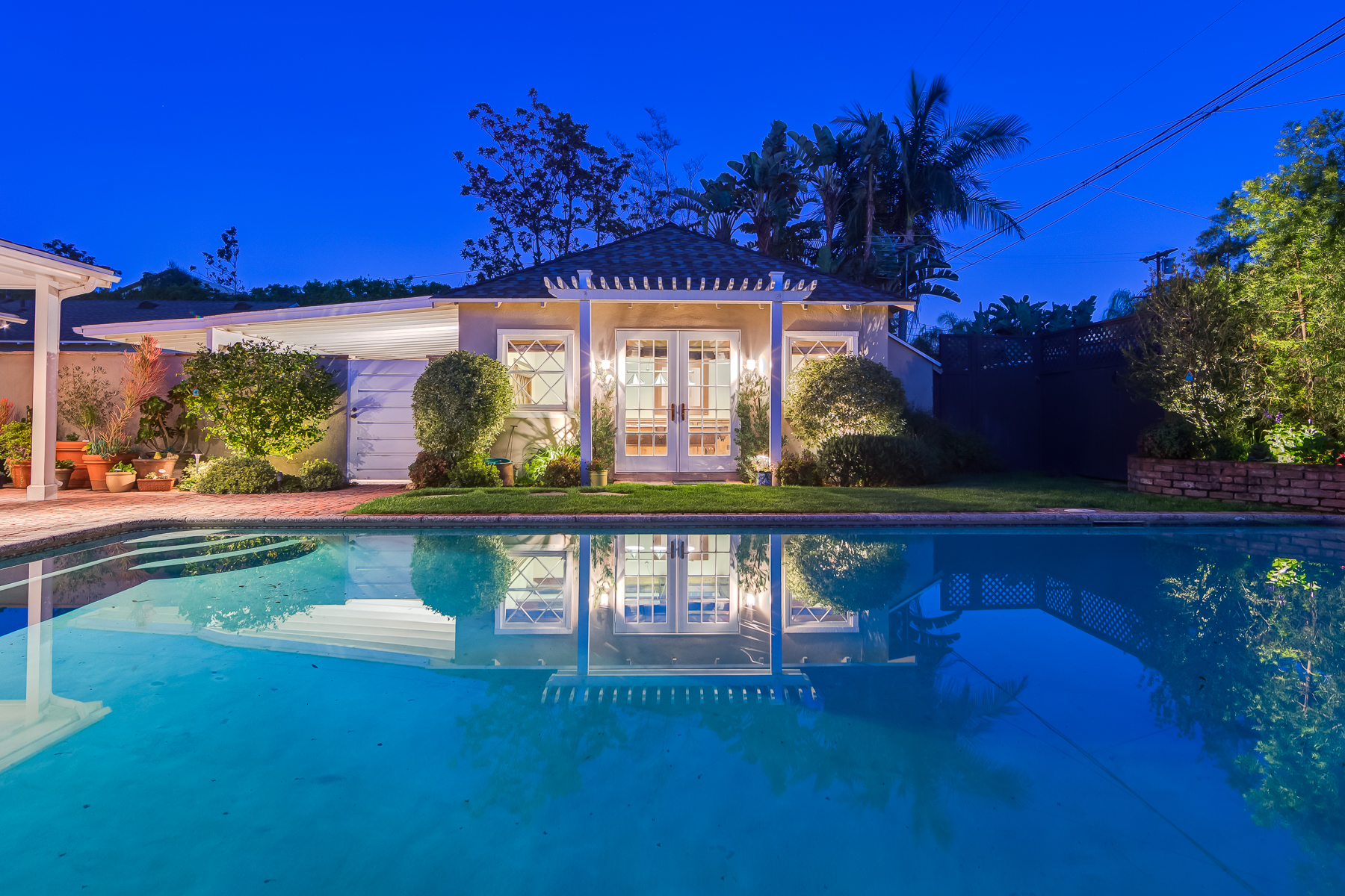 Charismatic 3 bed, 2 bath single story home in the Colfax School District of prime Valley Village. Beyond the charming white picket fence lies a lush front yard with well-manicured landscaping. Upon entry, you are greeted by hardwood floors and an abundance of natural light. The formal living room, with the first of two fireplaces, flows effortlessly to the formal dining room, lined with luxurious wainscoting. The kitchen offers a breakfast nook with built-in storage and features beautiful custom cabinets and high-end stainless steel appliances. Conveniently accessible from the kitchen is a separate laundry room with added storage and hand painted tiles. The first of three bedrooms serves as a great office space with built-in desk and en-suite bathroom. The living room shines from the full wall of windows and hosts the second fireplace, as well as a bar with built-in wine fridge. The spacious master bedroom allows direct access to the gorgeous backyard and the master bathroom is filled with luxurious details like an oversized rain shower, warmed mirror to stop fogging, in-cabinet outlets, separate soaking tub, vanity area, and generous closet space. The backyard is great for entertaining; complete with lush landscaping for additional privacy, built in BBQ, and oversized lap pool. The backyard also offers a 500+ sqft permitted, detached studio space with beamed ceilings and built-in bar– great as a rec room, home gym, studio, office, and more. Additional features in this home include instant hot tankless water heater, security system, motorized security gate, new dual pane windows, crown molding throughout, and an unbeatable location.