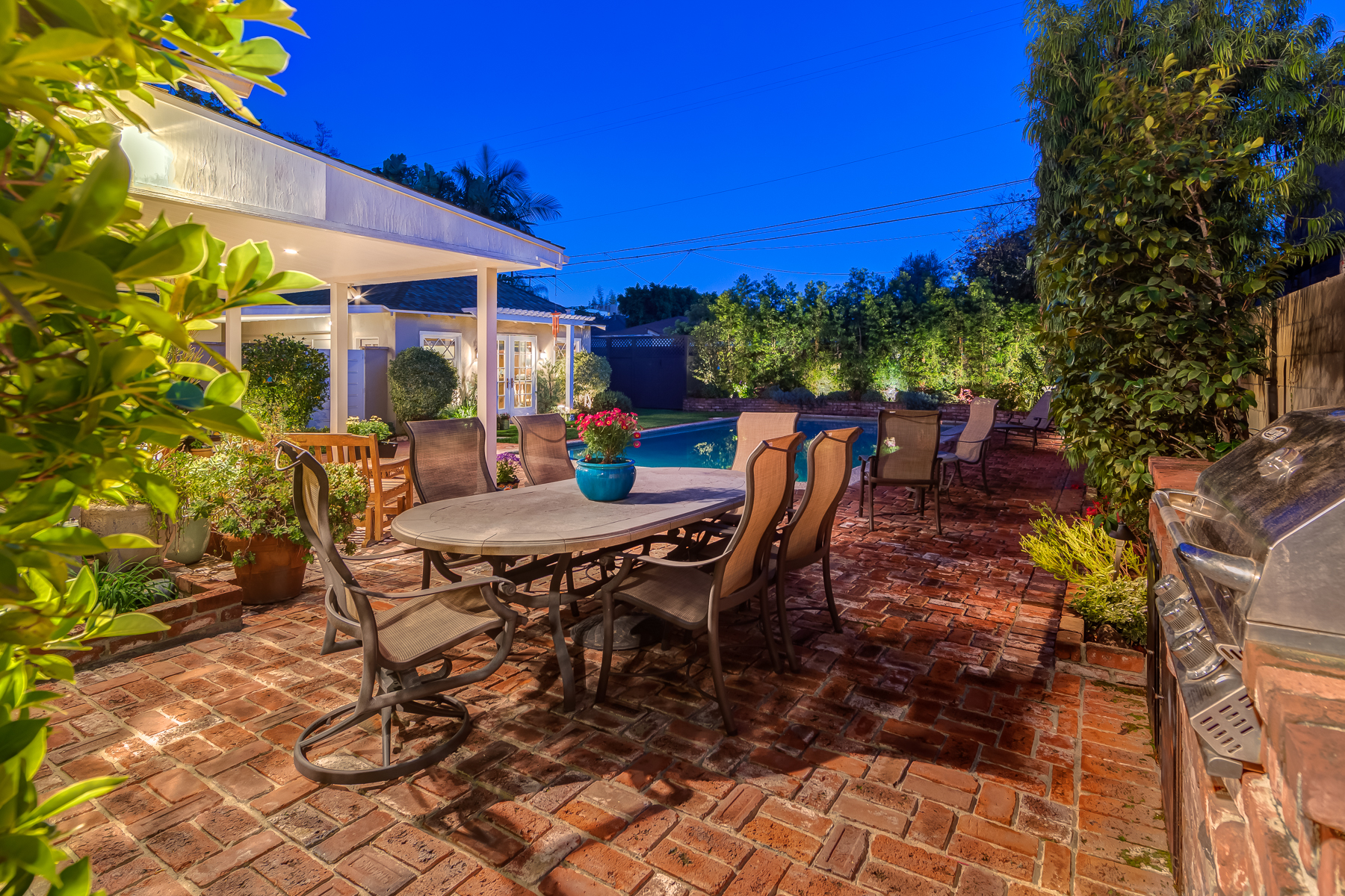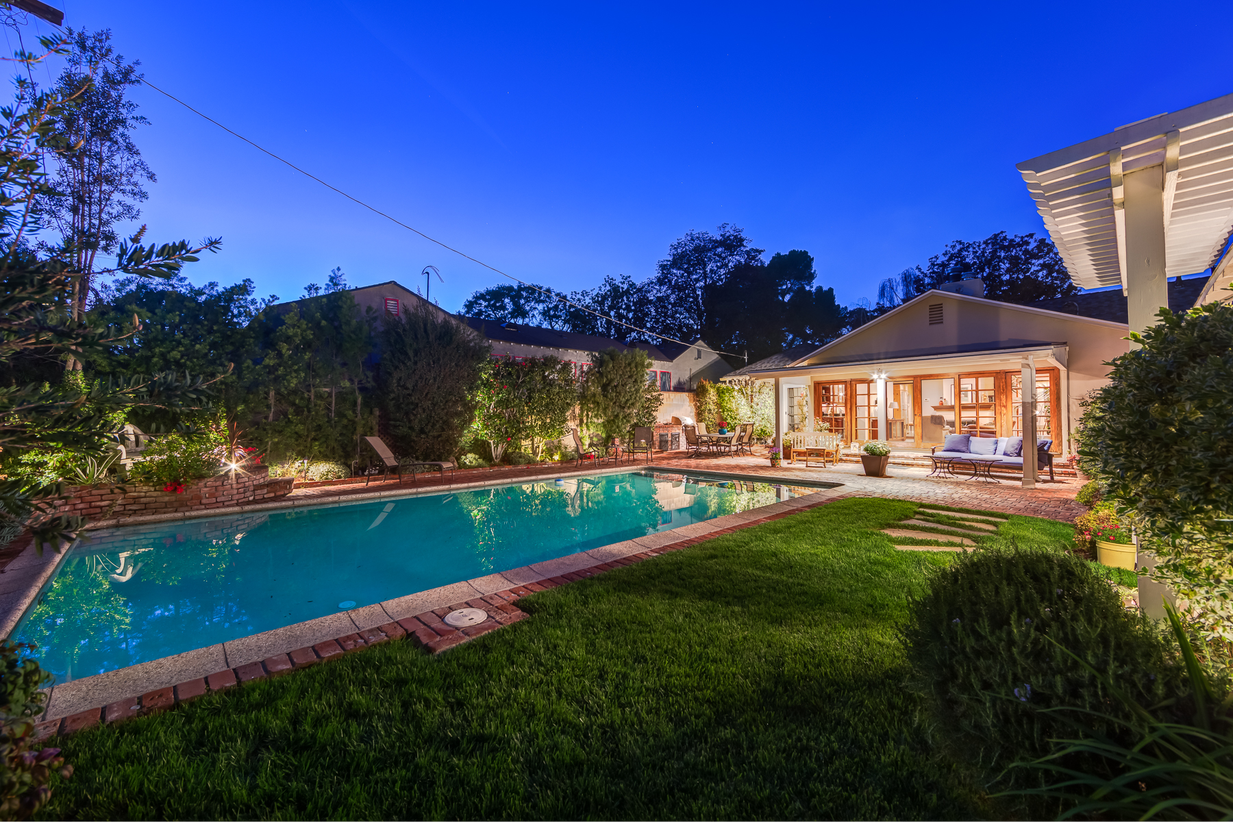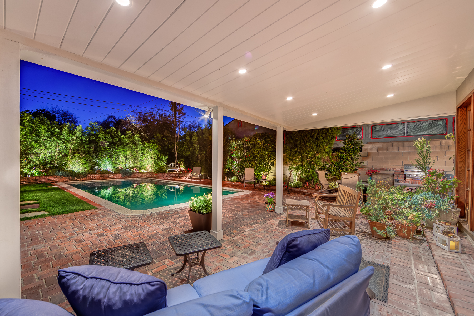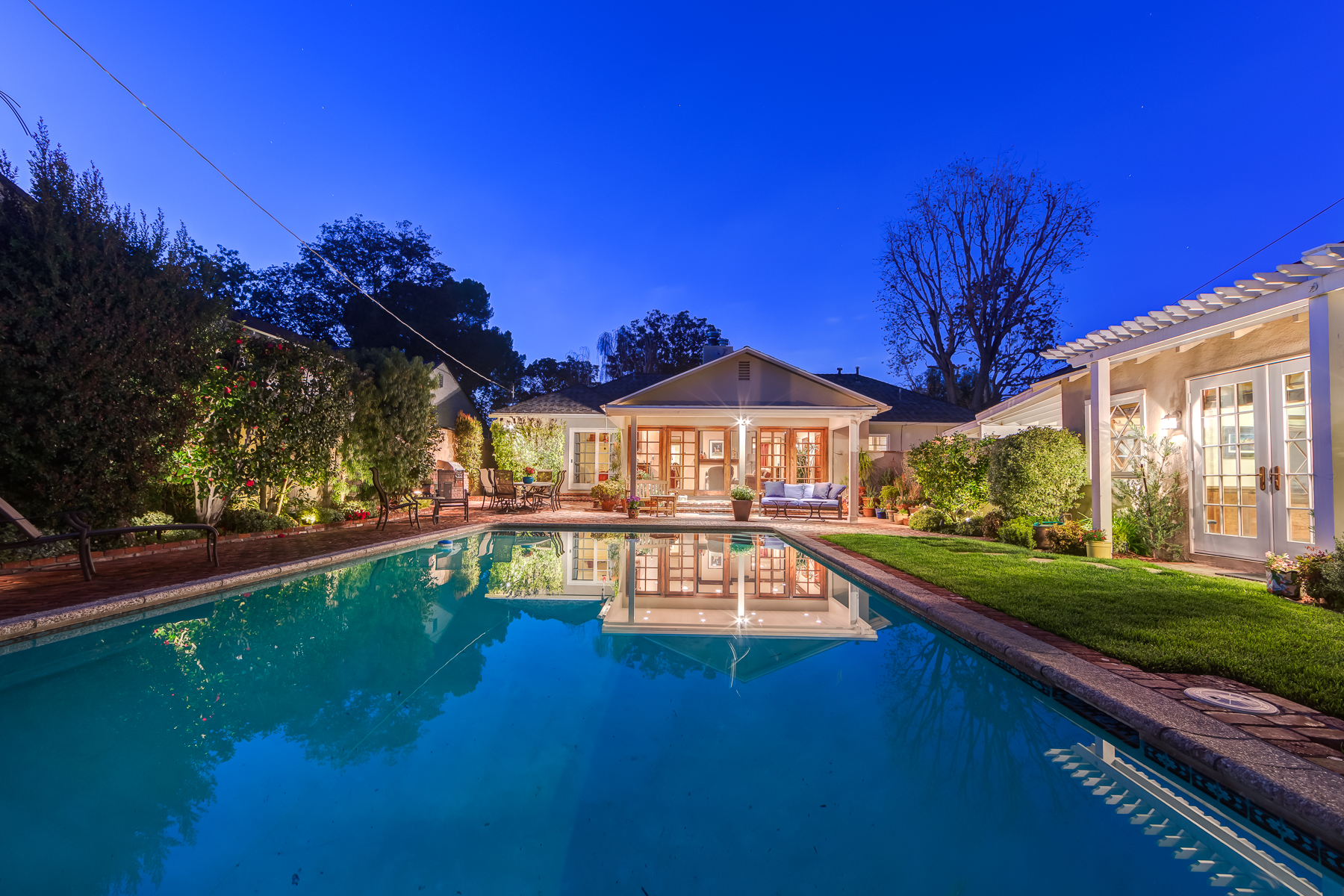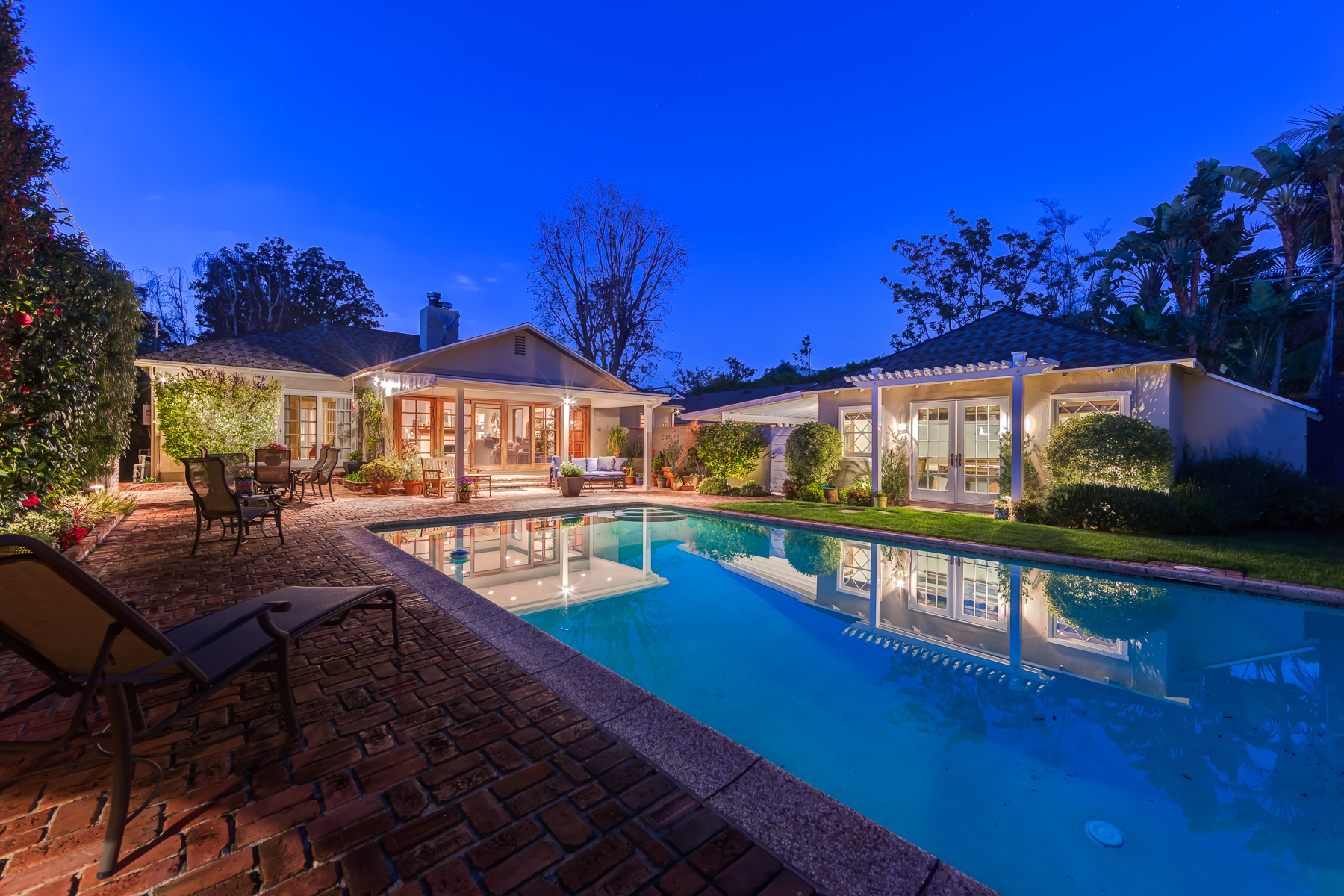 Charismatic 3 bed, 2 bath single story home in the Colfax School District of prime Valley Village. Beyond the charming white picket fence lies a lush front yard with well-manicured landscaping. Upon entry, you are greeted by hardwood floors and an abundance of natural light. The formal living room, with the first of two fireplaces, flows effortlessly to the formal dining room, lined with luxurious wainscoting. The kitchen offers a breakfast nook with built-in storage and features beautiful custom cabinets and high-end stainless steel appliances. Conveniently accessible from the kitchen is a separate laundry room with added storage and hand painted tiles. The first of three bedrooms serves as a great office space with built-in desk and en-suite bathroom. The living room shines from the full wall of windows and hosts the second fireplace, as well as a bar with built-in wine fridge. The spacious master bedroom allows direct access to the gorgeous backyard and the master bathroom is filled with luxurious details like an oversized rain shower, warmed mirror to stop fogging, in-cabinet outlets, separate soaking tub, vanity area, and generous closet space. The backyard is great for entertaining; complete with lush landscaping for additional privacy, built in BBQ, and oversized lap pool. The backyard also offers a 500+ sqft permitted, detached studio space with beamed ceilings and built-in bar– great as a rec room, home gym, studio, office, and more. Additional features in this home include instant hot tankless water heater, security system, motorized security gate, new dual pane windows, crown molding throughout, and an unbeatable location.