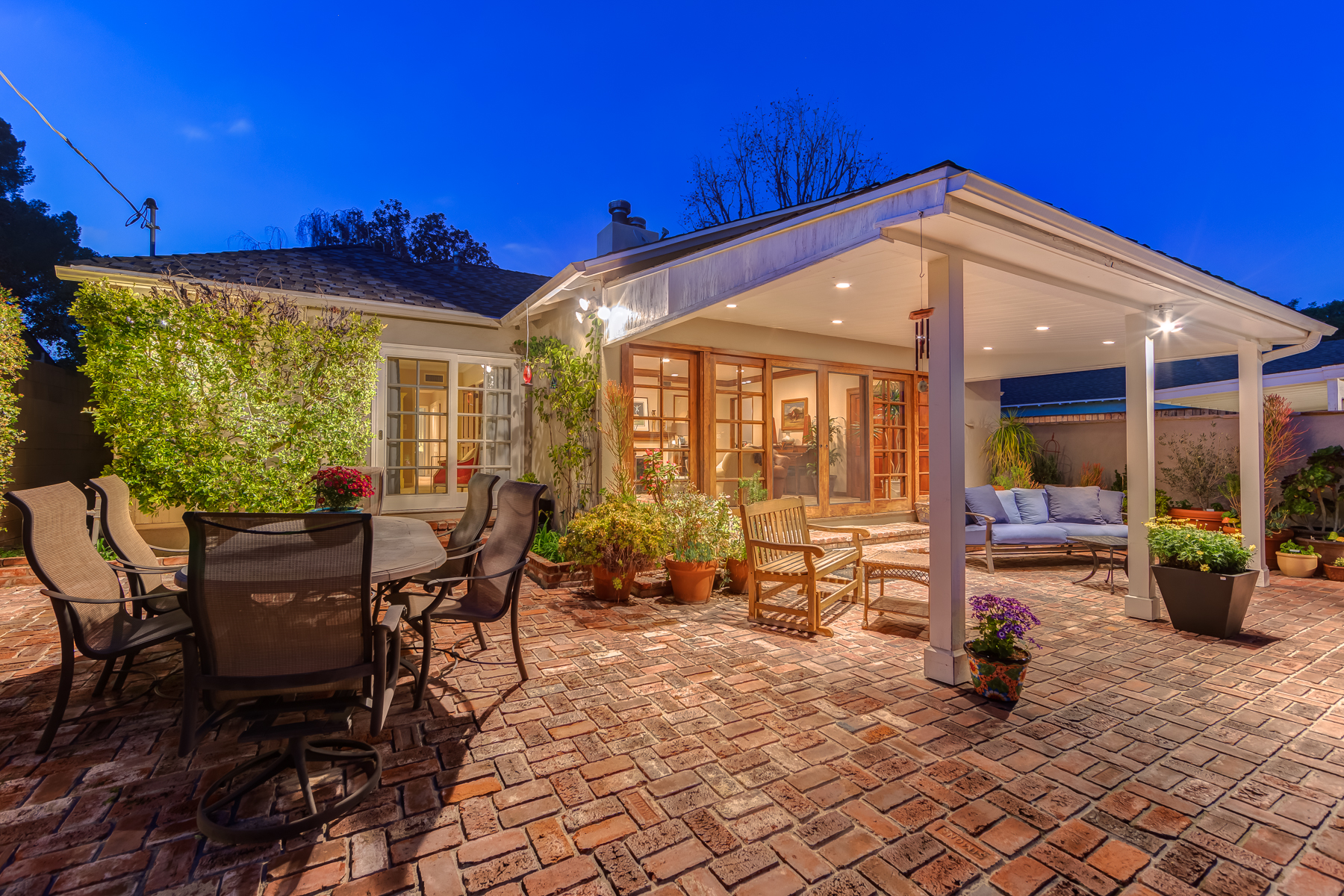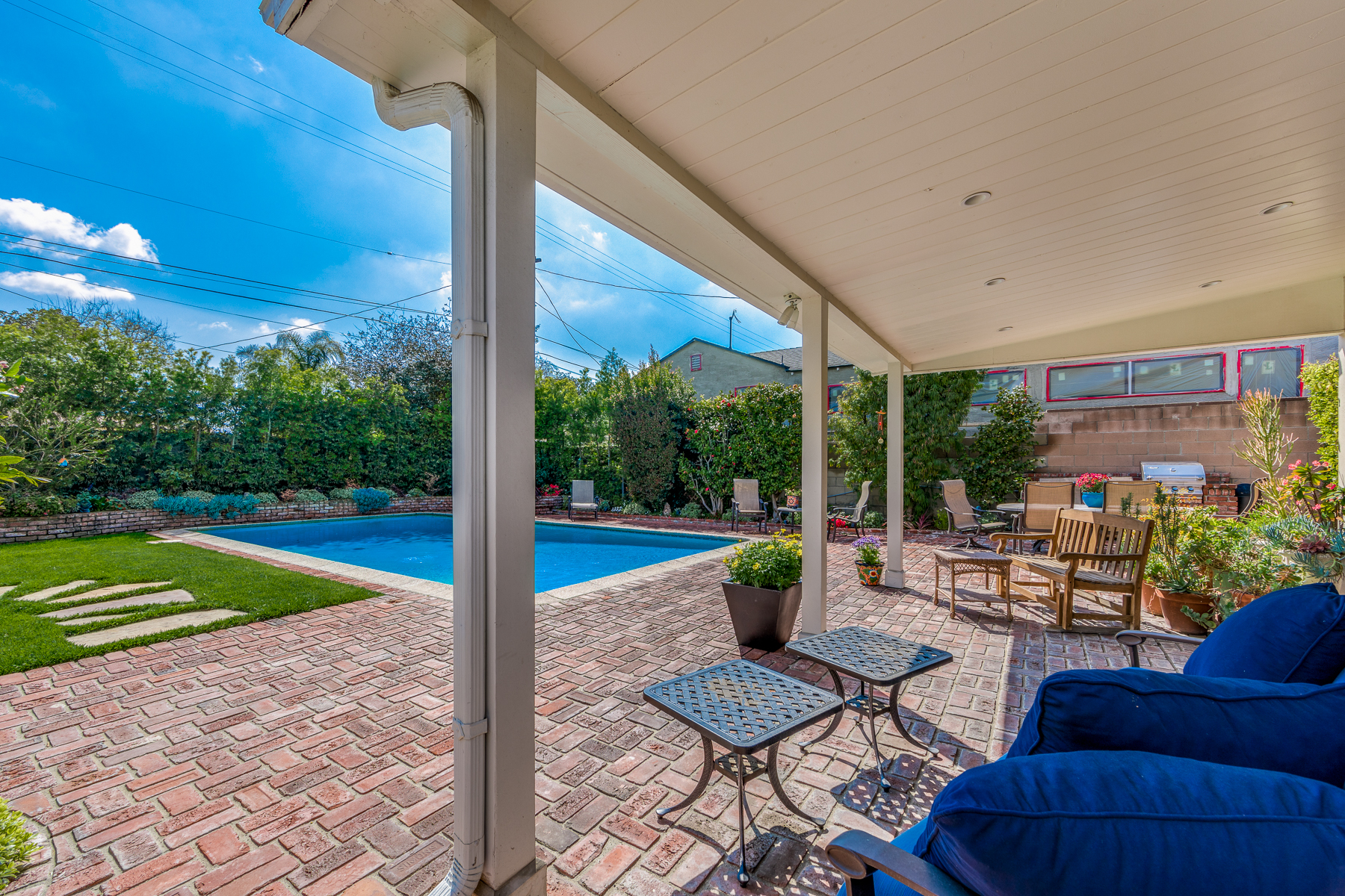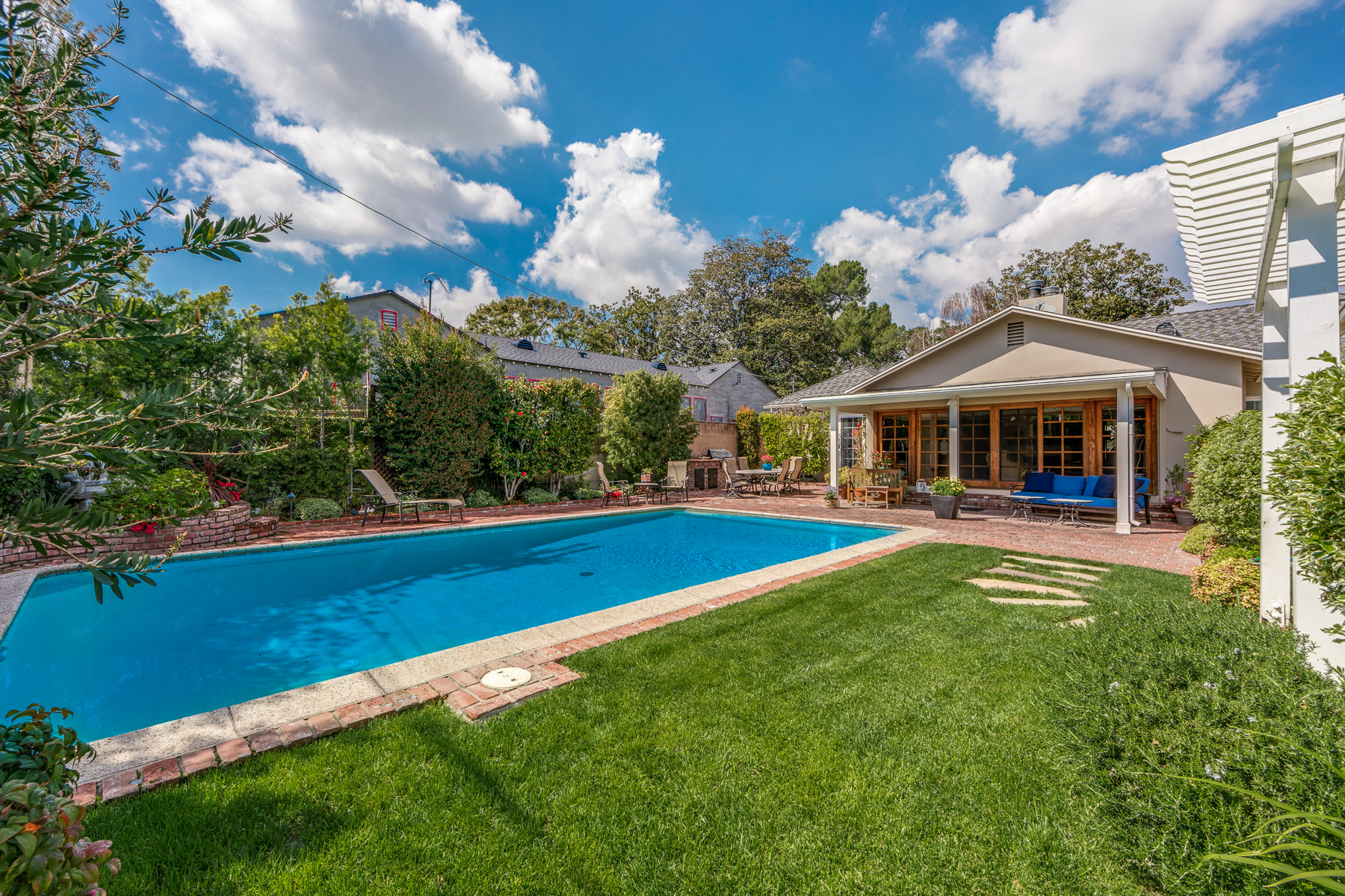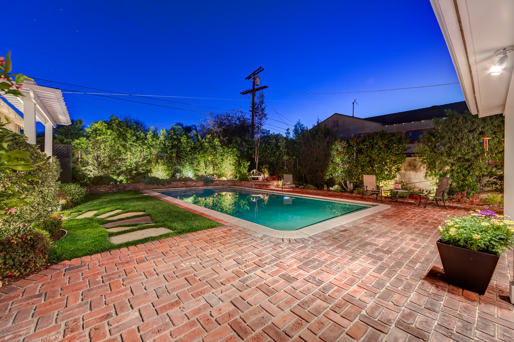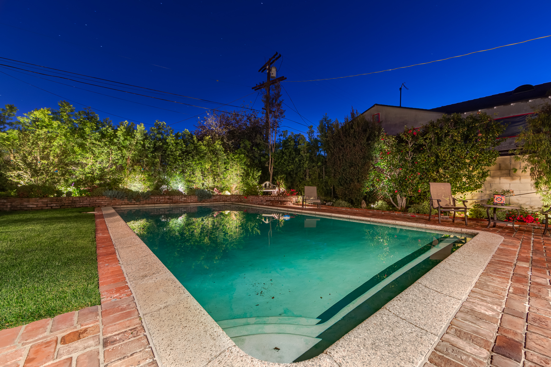 Charismatic 3 bed, 2 bath single story home in the Colfax School District of prime Valley Village. Beyond the charming white picket fence lies a lush front yard with well-manicured landscaping. Upon entry, you are greeted by hardwood floors and an abundance of natural light. The formal living room, with the first of two fireplaces, flows effortlessly to the formal dining room, lined with luxurious wainscoting. The kitchen offers a breakfast nook with built-in storage and features beautiful custom cabinets and high-end stainless steel appliances. Conveniently accessible from the kitchen is a separate laundry room with added storage and hand painted tiles. The first of three bedrooms serves as a great office space with built-in desk and en-suite bathroom. The living room shines from the full wall of windows and hosts the second fireplace, as well as a bar with built-in wine fridge. The spacious master bedroom allows direct access to the gorgeous backyard and the master bathroom is filled with luxurious details like an oversized rain shower, warmed mirror to stop fogging, in-cabinet outlets, separate soaking tub, vanity area, and generous closet space. The backyard is great for entertaining; complete with lush landscaping for additional privacy, built in BBQ, and oversized lap pool. The backyard also offers a 500+ sqft permitted, detached studio space with beamed ceilings and built-in bar– great as a rec room, home gym, studio, office, and more. Additional features in this home include instant hot tankless water heater, security system, motorized security gate, new dual pane windows, crown molding throughout, and an unbeatable location.