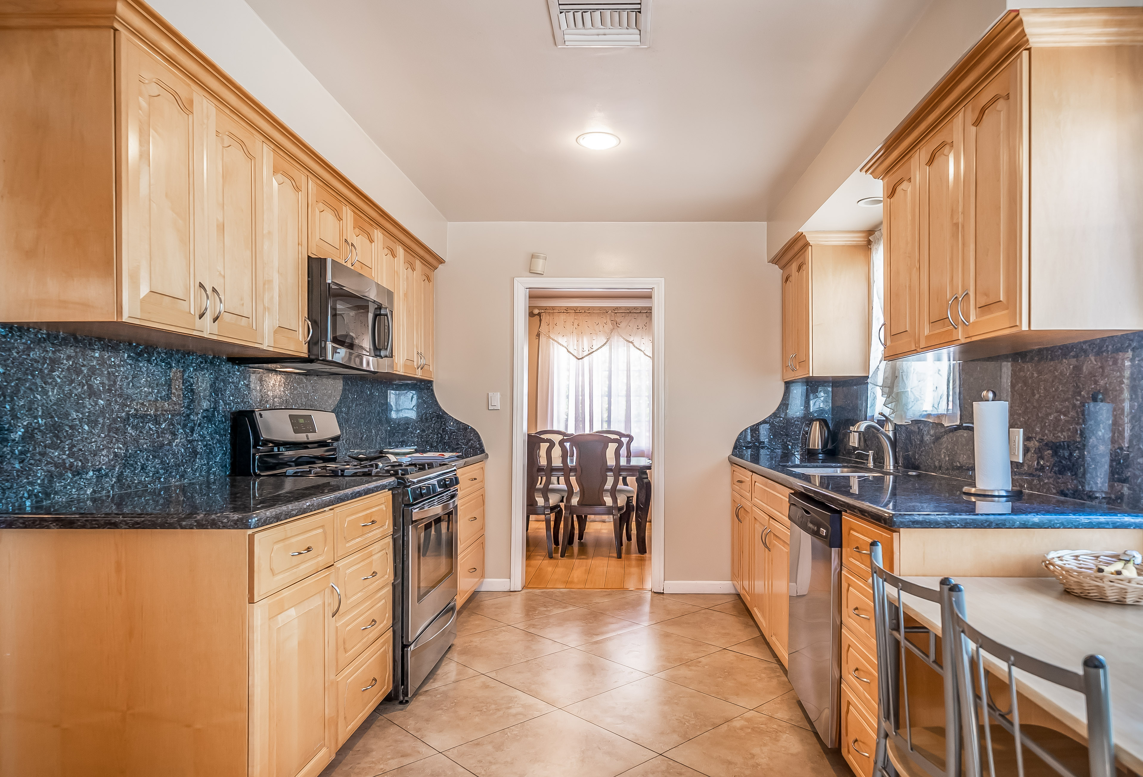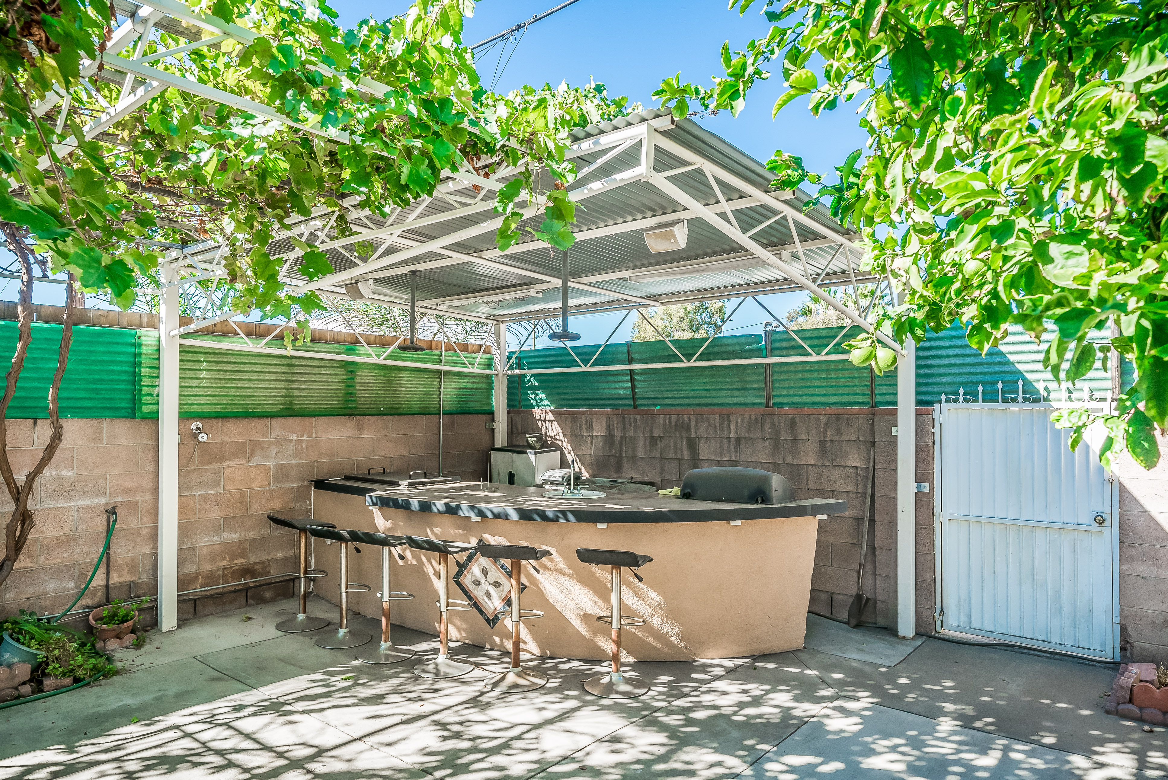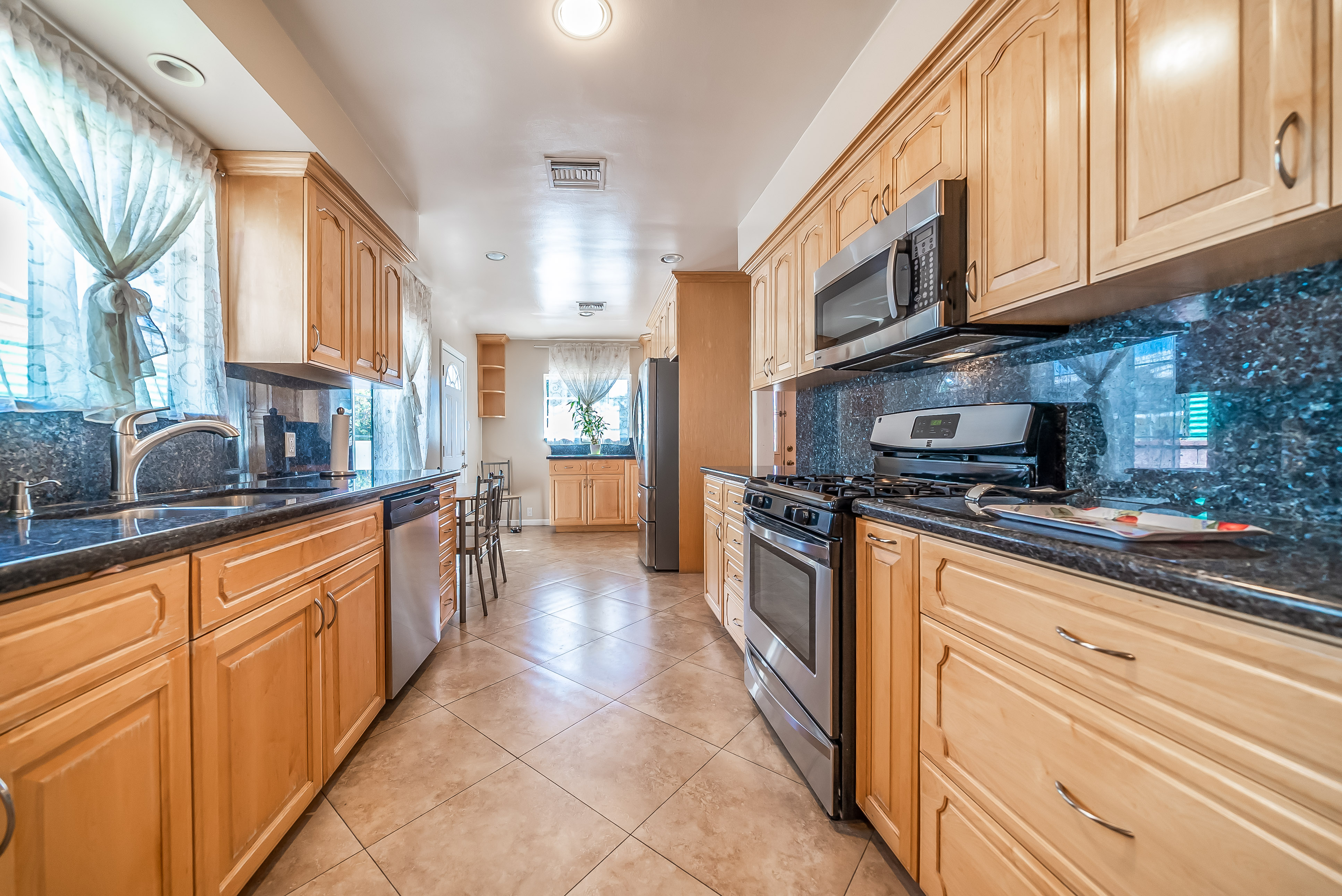 Behind automatic gates lies this updated 3 bed, 2 bath home in North Hollywood. Light wood floors and an abundance of windows give the home a light and airy feel. The living room flows seamless into the dining room, both featuring sliding glass doors out to the covered patio. The updated kitchen is large and has tons of cabinets, stainless steel appliances, and granite countertops. Two spacious bedrooms share an updated bathroom and the master suite offers a large walk in closet and updated bath as well. Outside, the low maintenance yard affords mature fruit trees, and built in BBQ with bar seating, and lots of room to host family and friends. Additional features include unpermitted garage conversion to a guesthouse with kitchenette and bath.