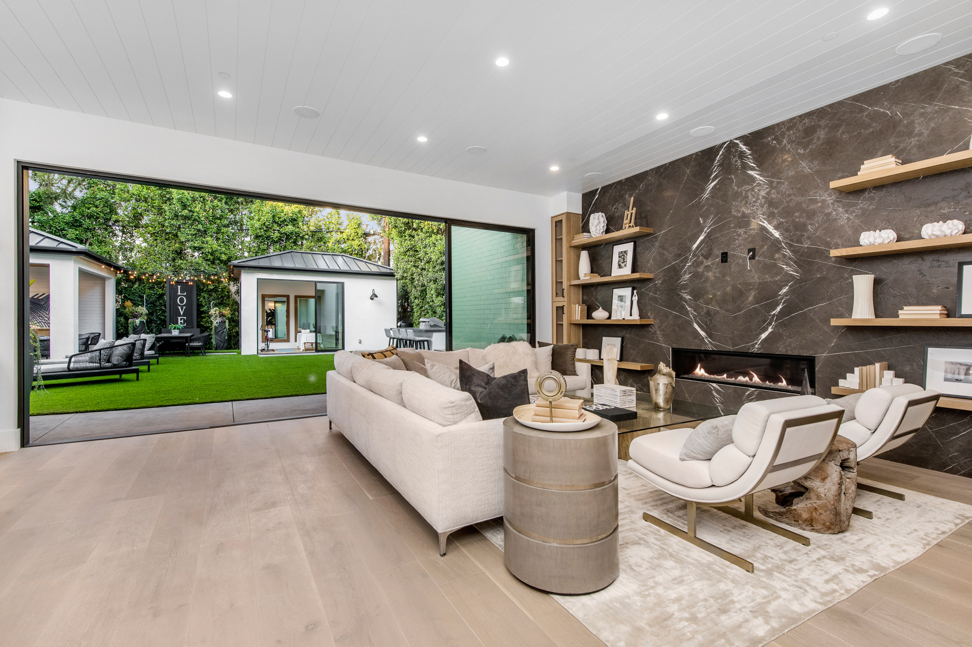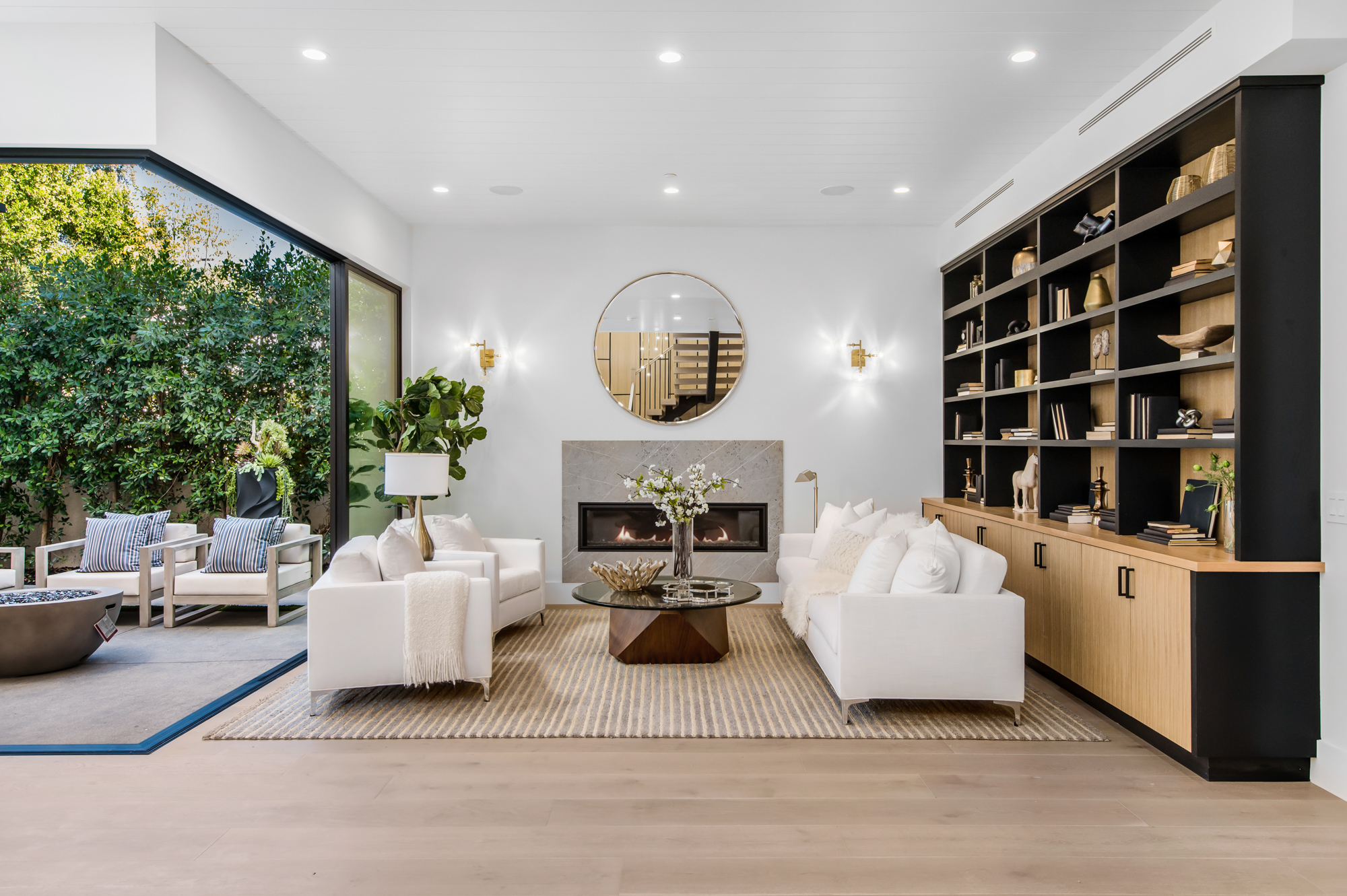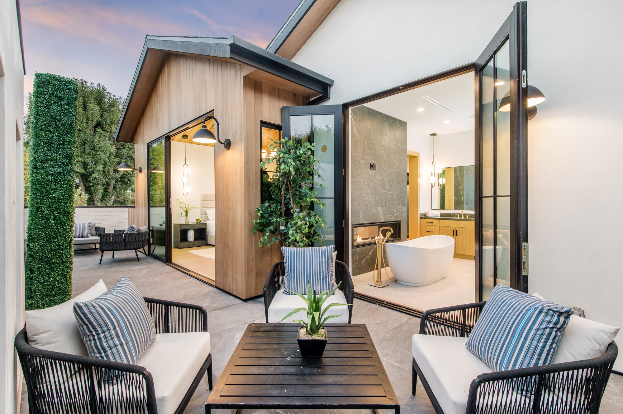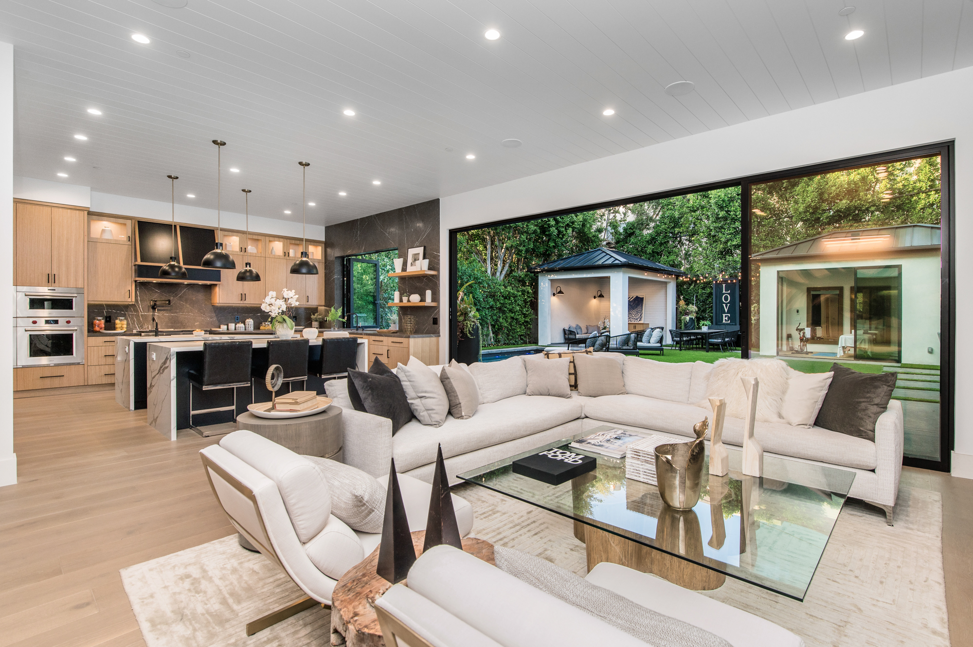 Elegant Gated Modern Farmhouse in a coveted enclave of Studio City. Manicured landscaping invites you into a stunning newly constructed two-story home. Guests are greeted by European oak wood floors, high ceilings, & luxurious finishes throughout. A wide entry hall flows into a spacious formal living room with custom built-in cabinets flanked by an interior courtyard with fire pit perfect for entertaining. The designer kitchen boasts quartz countertops, double island, Subzero & Wolf stainless steel appliances. An inviting family room boasts a fireplace and beautiful floating built-in shelves. Oversized pocket sliding glass doors open up the entire family room to the remarkable backyard perfect for indoor/outdoor entertaining. A downstairs en-suite complete the main floor. Upstairs through the floating staircase, the romantic master suite showcases a two way fireplace, oversized balcony with fireplace overlooking the pool & an incredible walk-in closet. The spa-like master bath features dual vanity, soaking tub & rain shower. Upstairs, the remaining spacious guest bedrooms feature private balconies, beautiful bathrooms, & walk-in closets. The private entertainer's yard features a cabana, pool house, sparkling pool & spa perfect for relaxation and entertaining. Additional conveniences include an integrated control 4 system & surround sound. A truly marvelous home near fine dining, shopping & more.