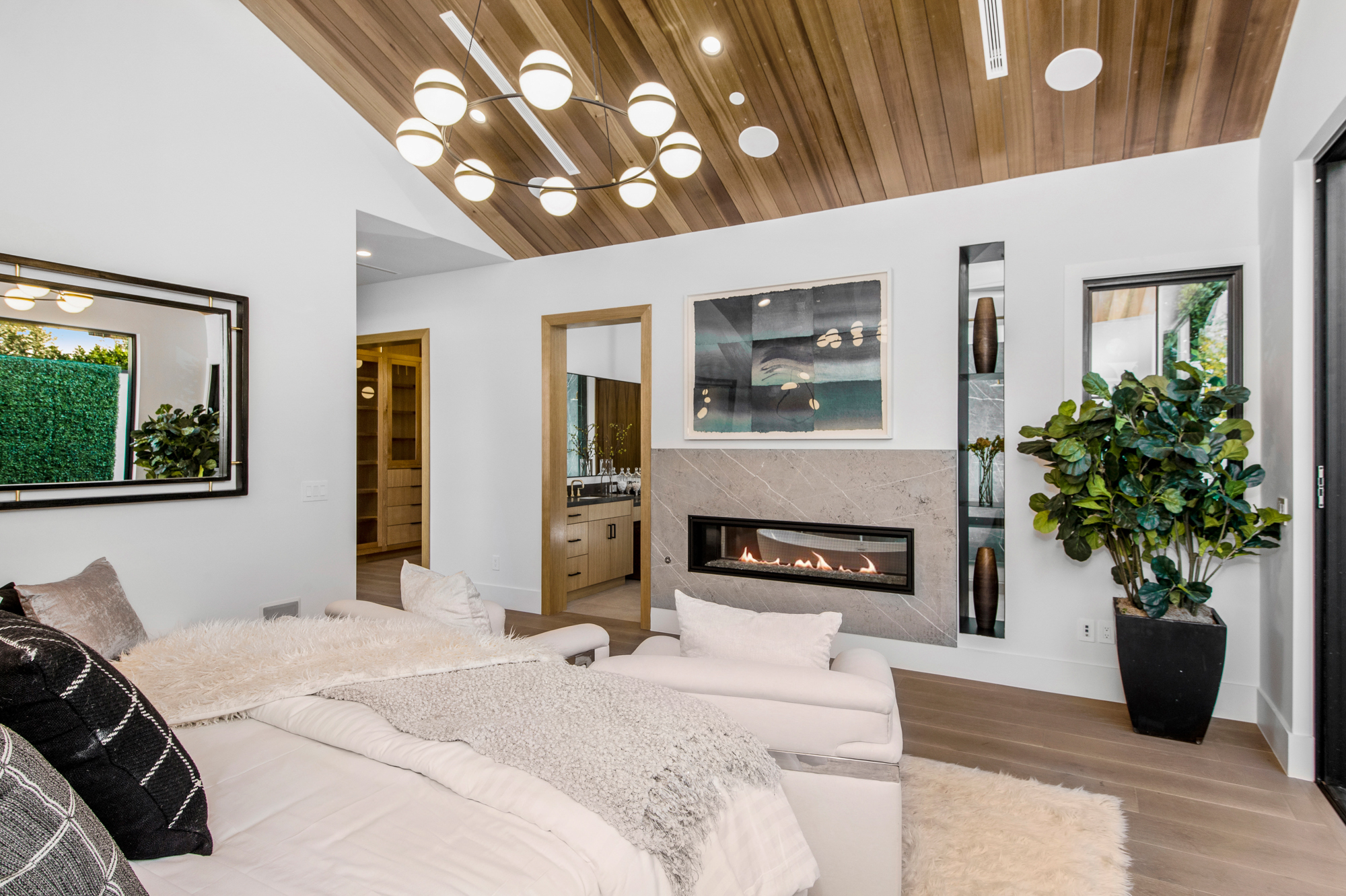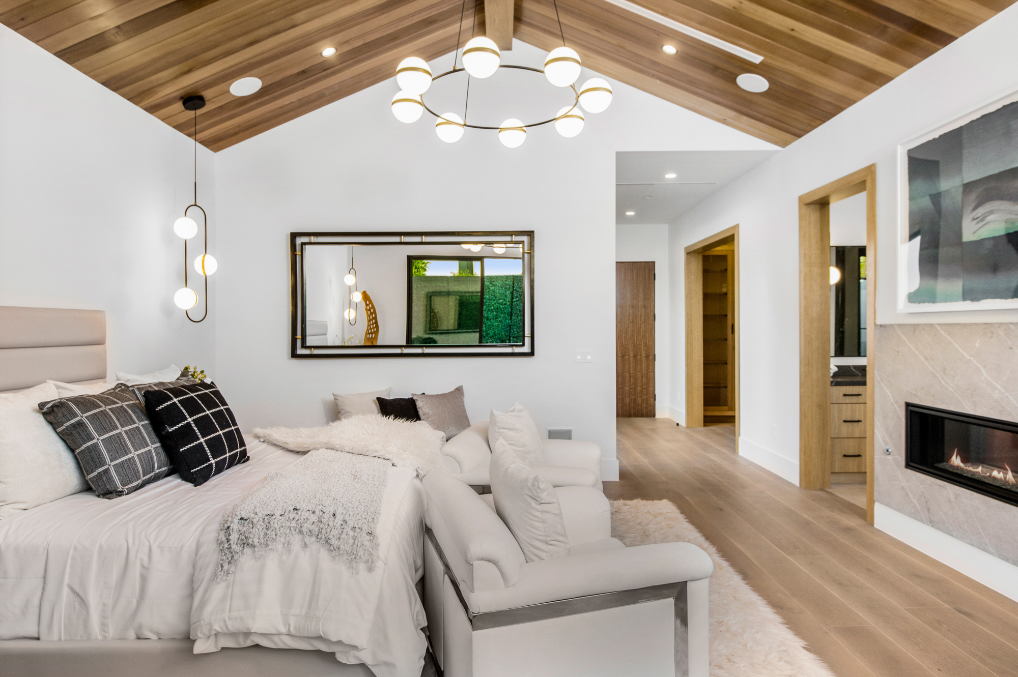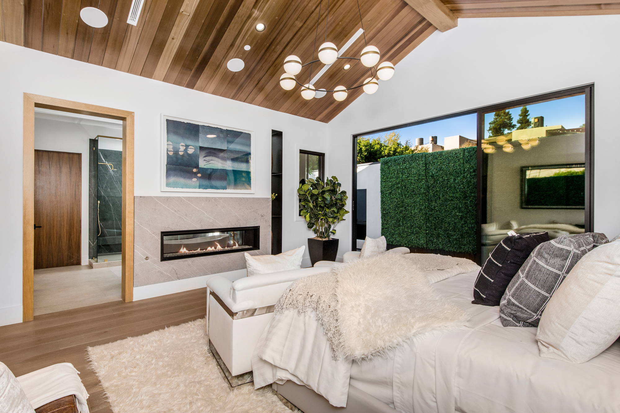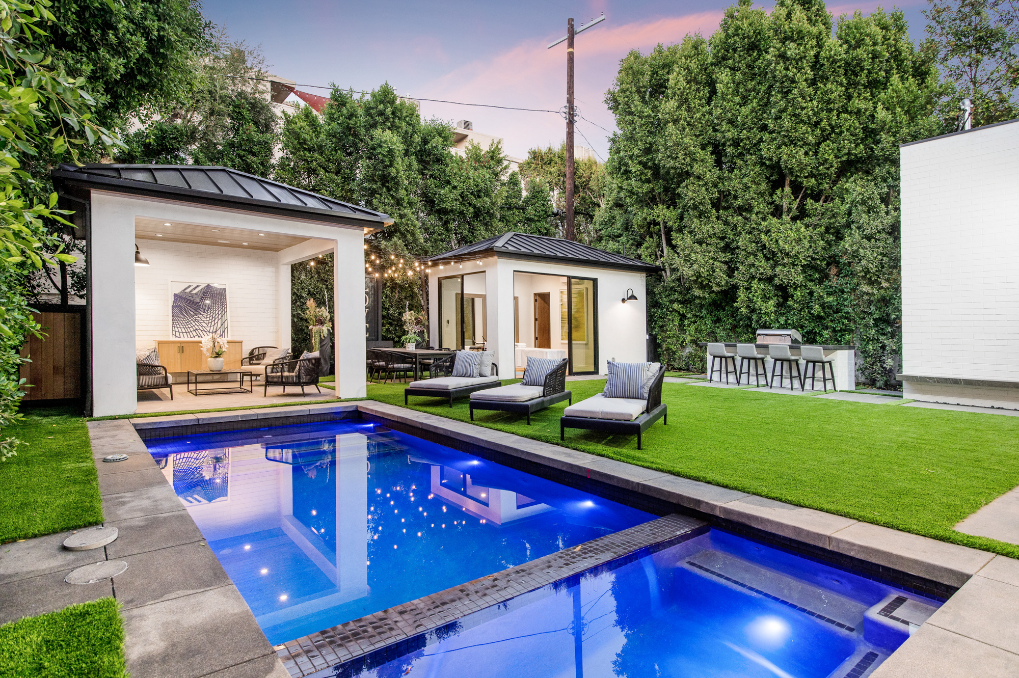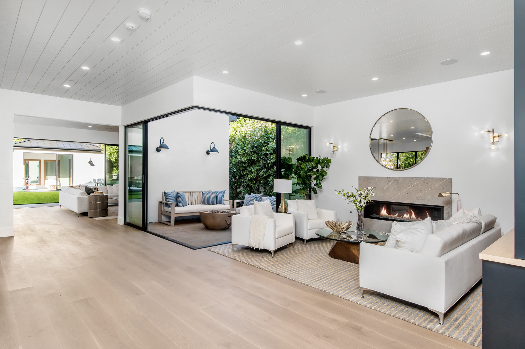 Elegant Gated Modern Farmhouse in a coveted enclave of Studio City. Manicured landscaping invites you into a stunning newly constructed two-story home. Guests are greeted by European oak wood floors, high ceilings, & luxurious finishes throughout. A wide entry hall flows into a spacious formal living room with custom built-in cabinets flanked by an interior courtyard with fire pit perfect for entertaining. The designer kitchen boasts quartz countertops, double island, Subzero & Wolf stainless steel appliances. An inviting family room boasts a fireplace and beautiful floating built-in shelves. Oversized pocket sliding glass doors open up the entire family room to the remarkable backyard perfect for indoor/outdoor entertaining. A downstairs en-suite complete the main floor. Upstairs through the floating staircase, the romantic master suite showcases a two way fireplace, oversized balcony with fireplace overlooking the pool & an incredible walk-in closet. The spa-like master bath features dual vanity, soaking tub & rain shower. Upstairs, the remaining spacious guest bedrooms feature private balconies, beautiful bathrooms, & walk-in closets. The private entertainer's yard features a cabana, pool house, sparkling pool & spa perfect for relaxation and entertaining. Additional conveniences include an integrated control 4 system & surround sound. A truly marvelous home near fine dining, shopping & more.
