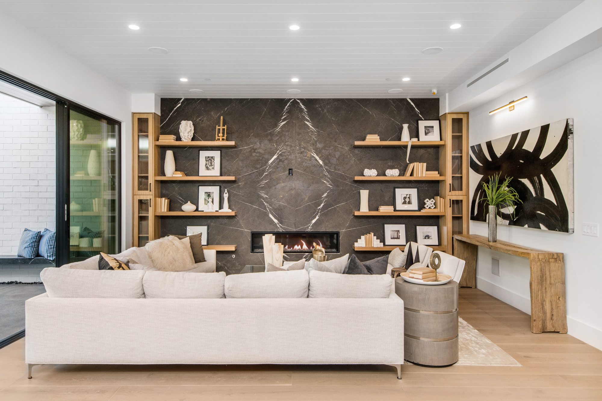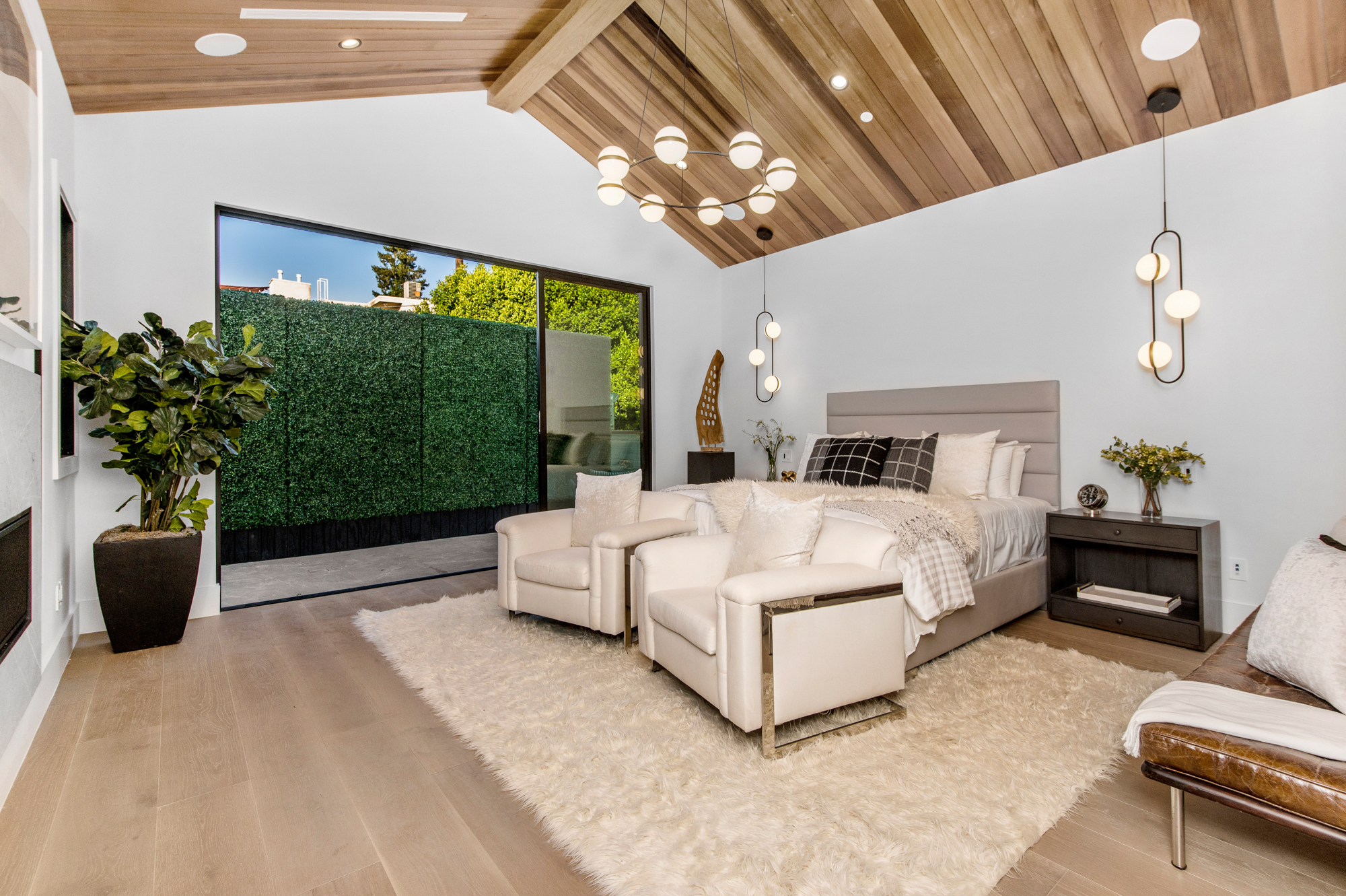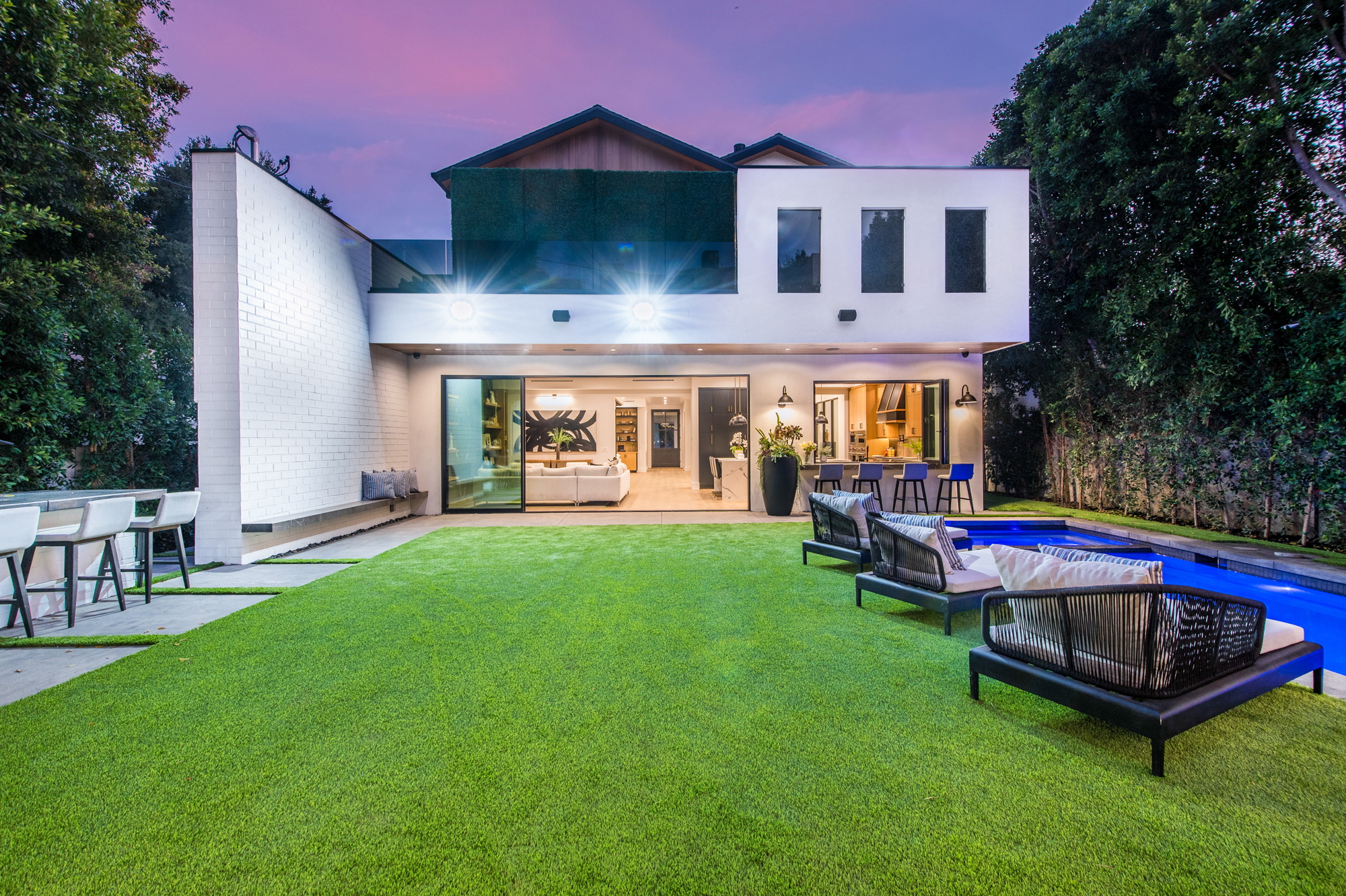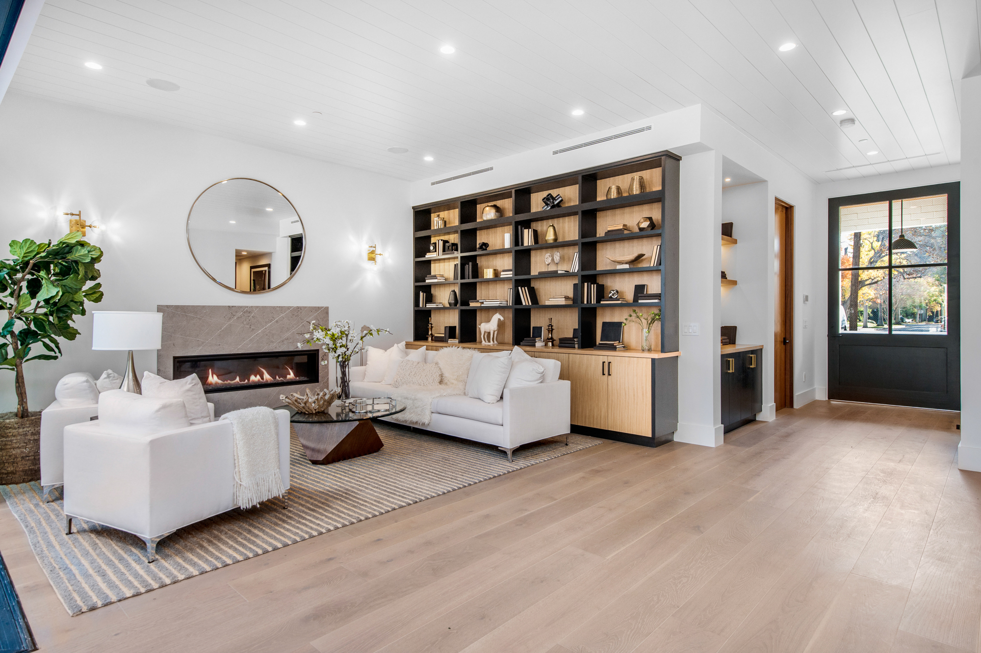 Elegant Gated Modern Farmhouse in a coveted enclave of Studio City. Manicured landscaping invites you into a stunning newly constructed two-story home. Guests are greeted by European oak wood floors, high ceilings, & luxurious finishes throughout. A wide entry hall flows into a spacious formal living room with custom built-in cabinets flanked by an interior courtyard with fire pit perfect for entertaining. The designer kitchen boasts quartz countertops, double island, Subzero & Wolf stainless steel appliances. An inviting family room boasts a fireplace and beautiful floating built-in shelves. Oversized pocket sliding glass doors open up the entire family room to the remarkable backyard perfect for indoor/outdoor entertaining. A downstairs en-suite complete the main floor. Upstairs through the floating staircase, the romantic master suite showcases a two way fireplace, oversized balcony with fireplace overlooking the pool & an incredible walk-in closet. The spa-like master bath features dual vanity, soaking tub & rain shower. Upstairs, the remaining spacious guest bedrooms feature private balconies, beautiful bathrooms, & walk-in closets. The private entertainer's yard features a cabana, pool house, sparkling pool & spa perfect for relaxation and entertaining. Additional conveniences include an integrated control 4 system & surround sound. A truly marvelous home near fine dining, shopping & more.