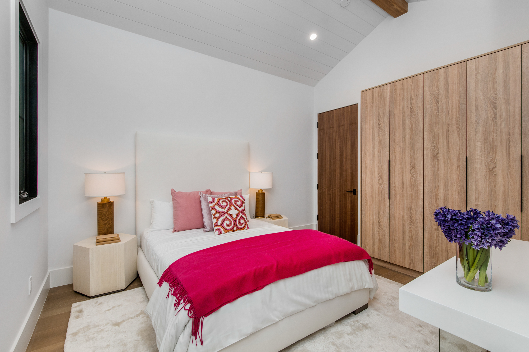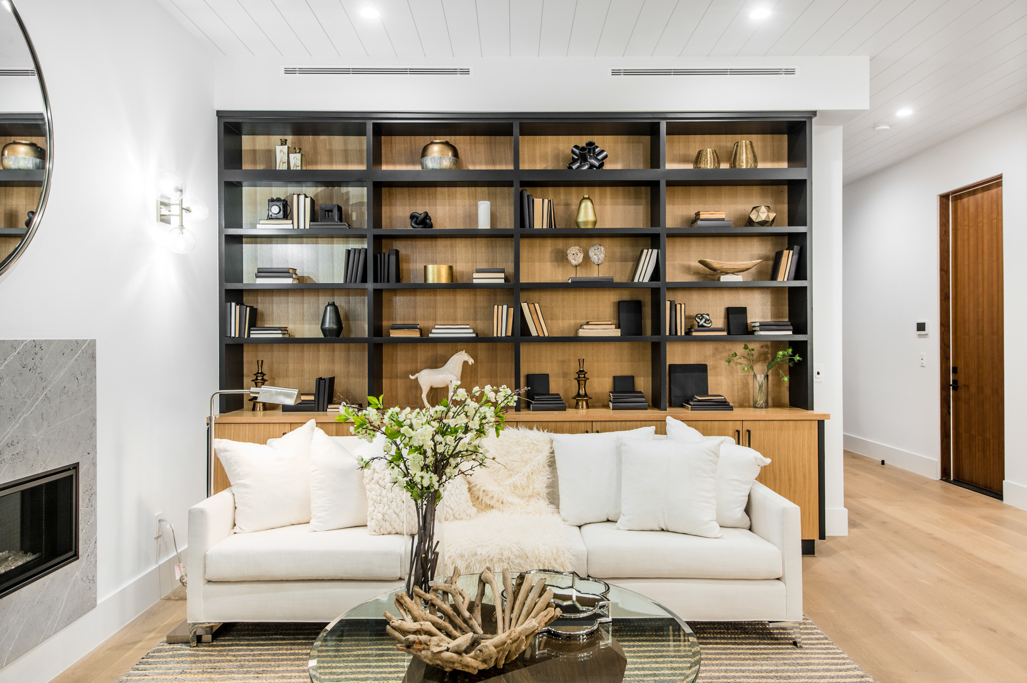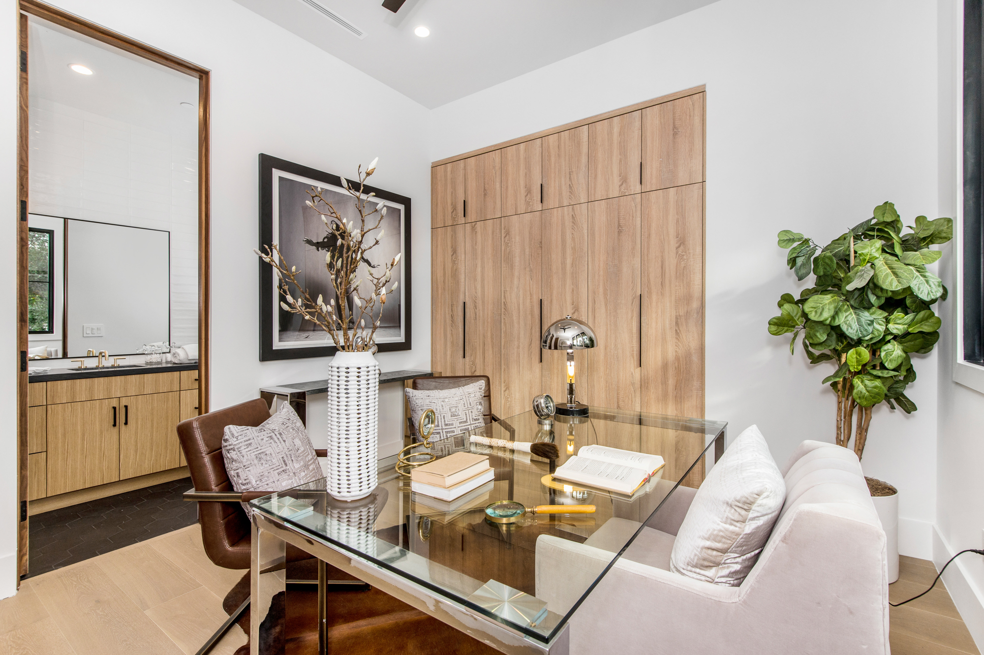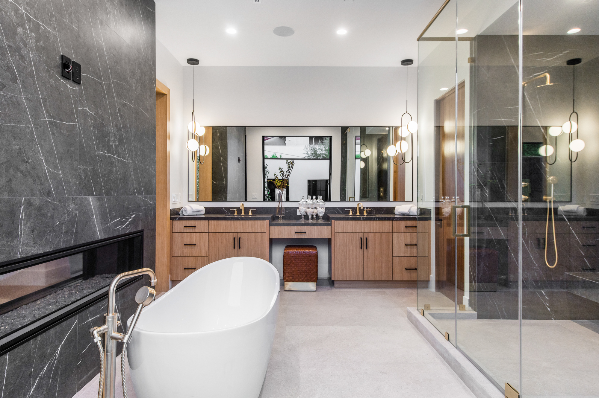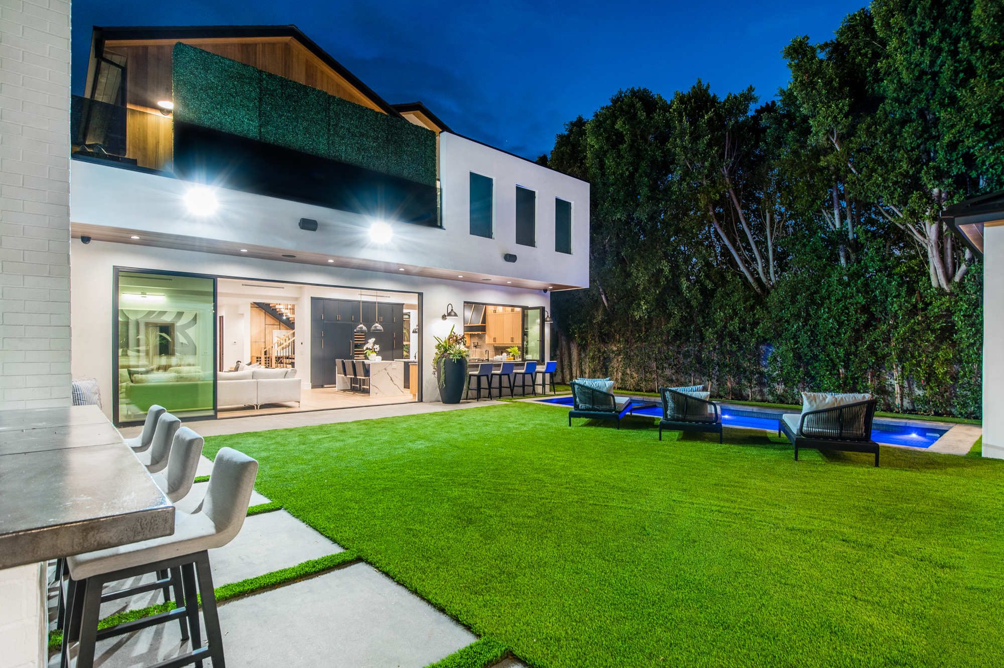 Elegant Gated Modern Farmhouse in a coveted enclave of Studio City. Manicured landscaping invites you into a stunning newly constructed two-story home. Guests are greeted by European oak wood floors, high ceilings, & luxurious finishes throughout. A wide entry hall flows into a spacious formal living room with custom built-in cabinets flanked by an interior courtyard with fire pit perfect for entertaining. The designer kitchen boasts quartz countertops, double island, Subzero & Wolf stainless steel appliances. An inviting family room boasts a fireplace and beautiful floating built-in shelves. Oversized pocket sliding glass doors open up the entire family room to the remarkable backyard perfect for indoor/outdoor entertaining. A downstairs en-suite complete the main floor. Upstairs through the floating staircase, the romantic master suite showcases a two way fireplace, oversized balcony with fireplace overlooking the pool & an incredible walk-in closet. The spa-like master bath features dual vanity, soaking tub & rain shower. Upstairs, the remaining spacious guest bedrooms feature private balconies, beautiful bathrooms, & walk-in closets. The private entertainer's yard features a cabana, pool house, sparkling pool & spa perfect for relaxation and entertaining. Additional conveniences include an integrated control 4 system & surround sound. A truly marvelous home near fine dining, shopping & more.