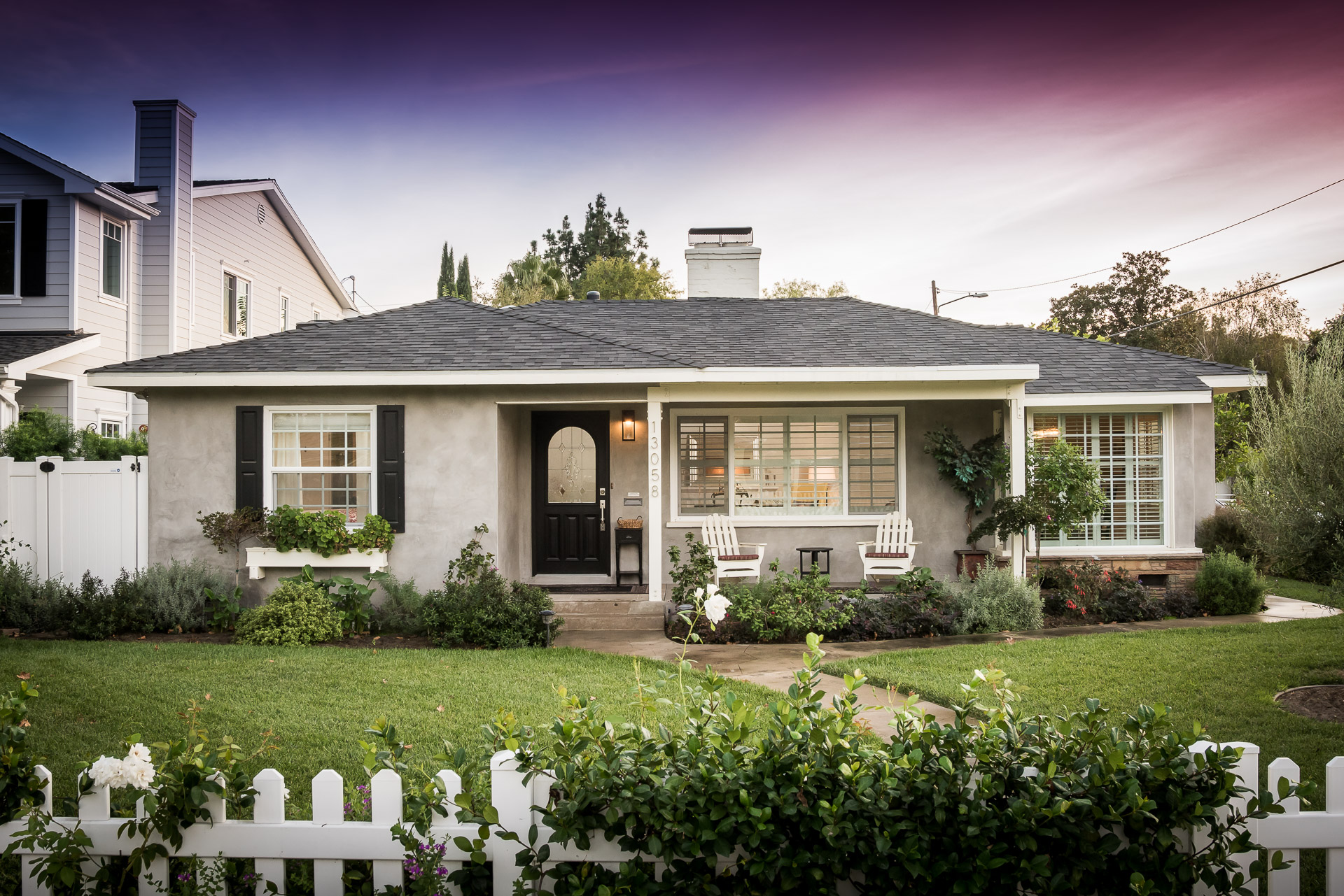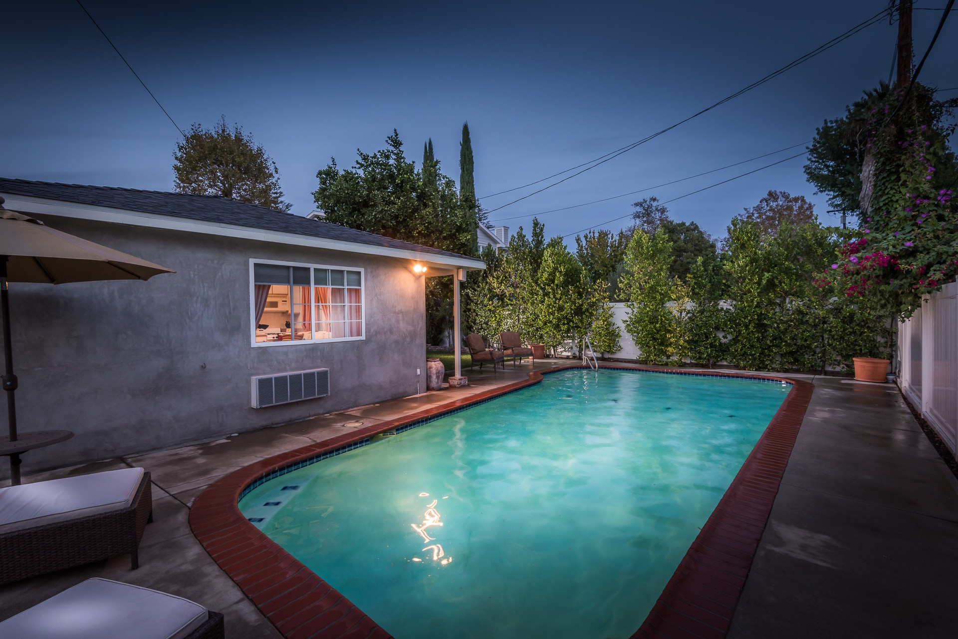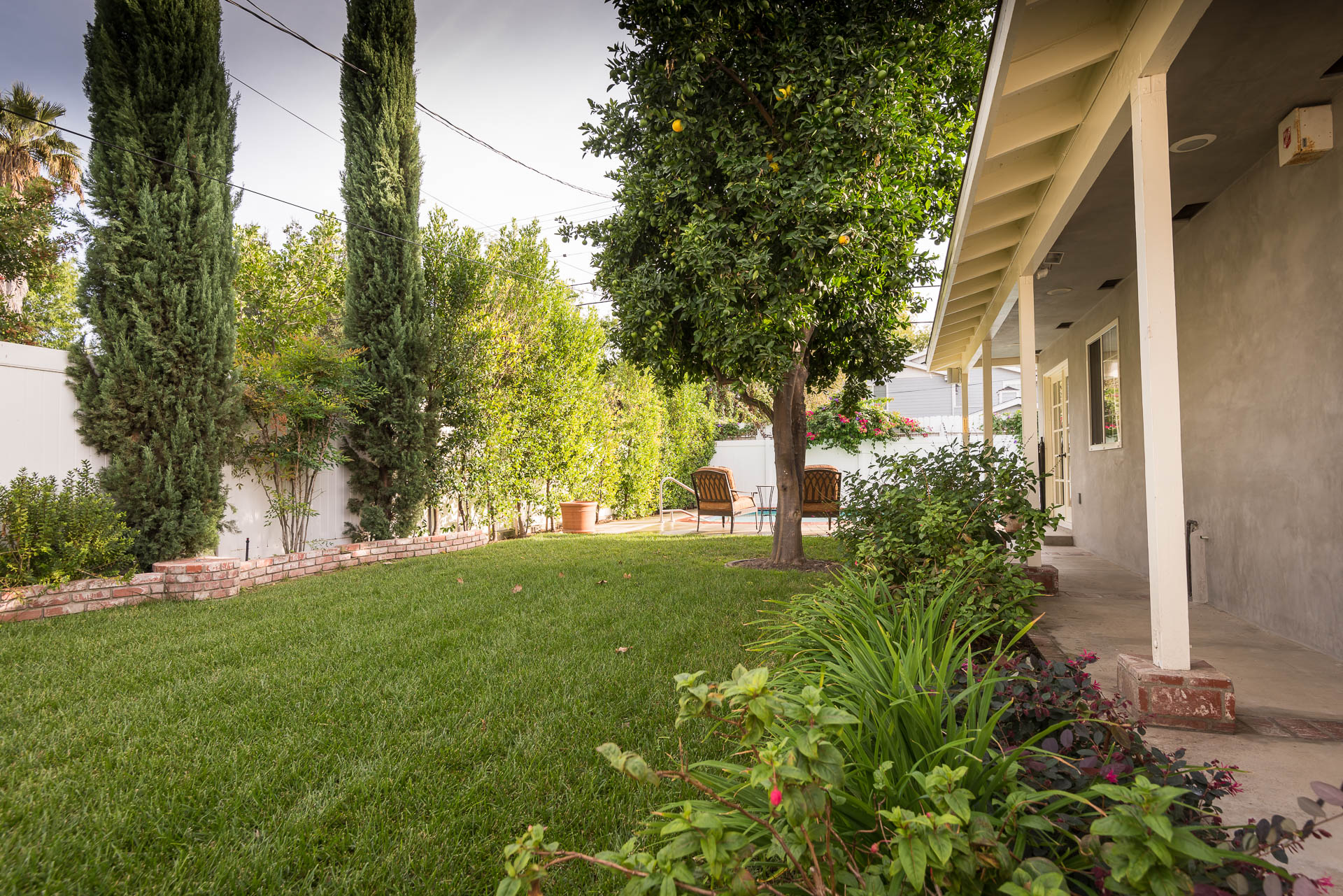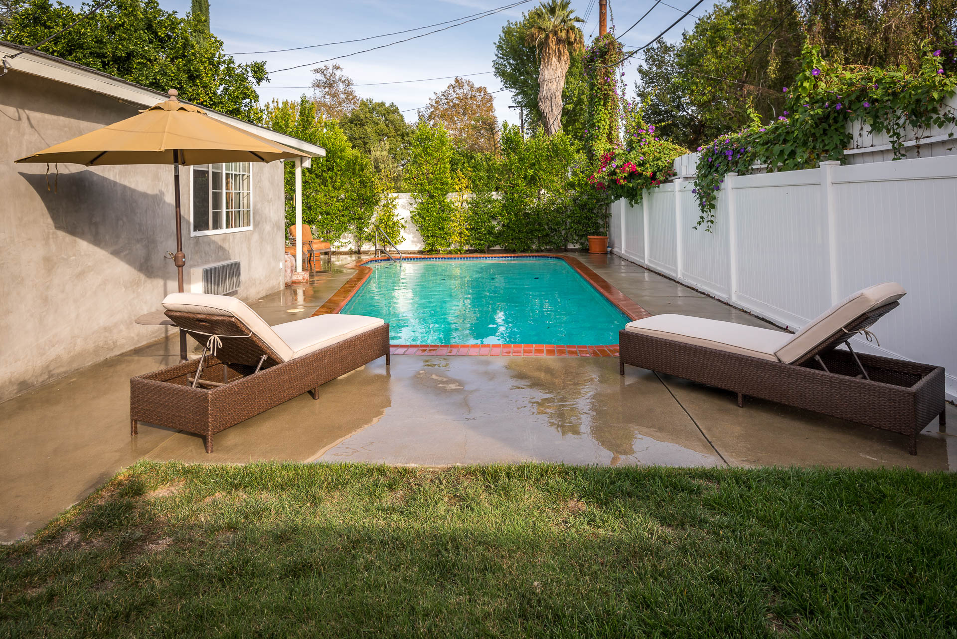 Stunningly updated Studio City home in highly desirable neighborhood. Situated on a corner with charming curb appeal, this home features a white picket fence, beautiful landscaping, and a path leading to the covered front porch. Inside, warm hardwood floors are complimented by crisp white plantation shutters. An inviting formal living room with fireplace flows directly into the formal dining room, perfect for entertaining. An incredible open concept kitchen boasts a beautiful bay window, dual wall ovens, a 4 burner range with griddle, and an island with breakfast bar overlooking a wonderful family room with a gorgeous fireplace, crown mouldings, skylights, built-ins, and oversized paned sliding doors to the patio. The spacious master suite features hardwood floors and a spa-like bath with stunning dual vanity, oversized glass shower, and a modern soaking tub. Outside, an entertainer’s yard features a covered loggia, built-in BBQ, sparkling pool, and fruit trees. A detached cabana boasts a full bath, kitchen, and murphy bed, offering a great solution for long-term guests, in-laws, home office, or studio. A truly amazing opportunity to enjoy the Studio City lifestyle!