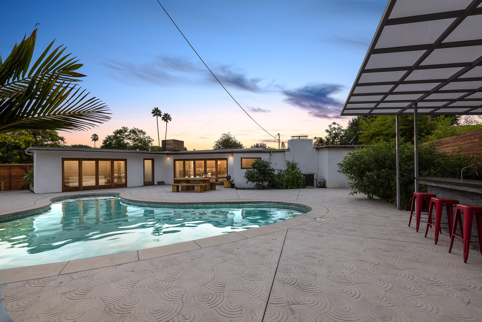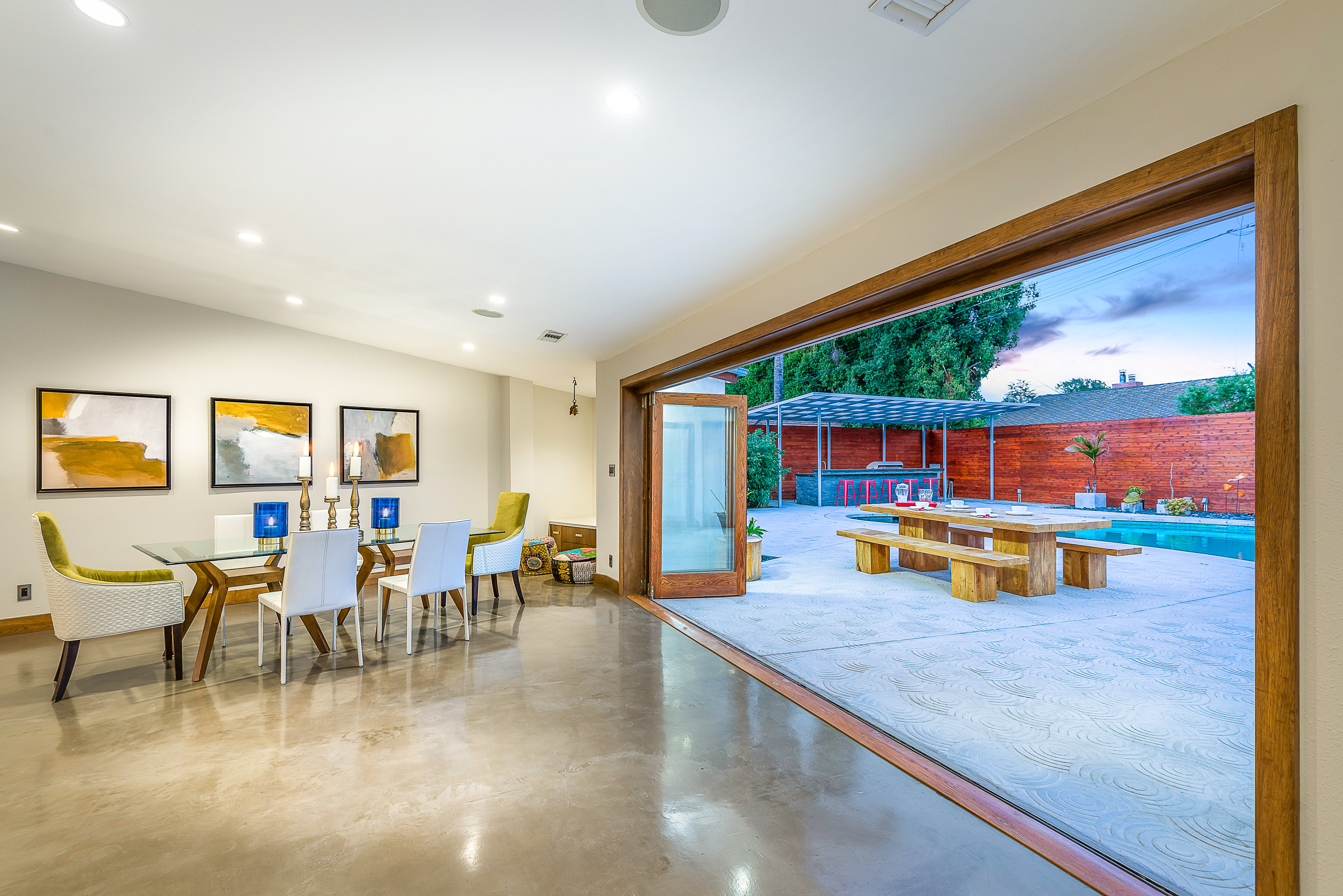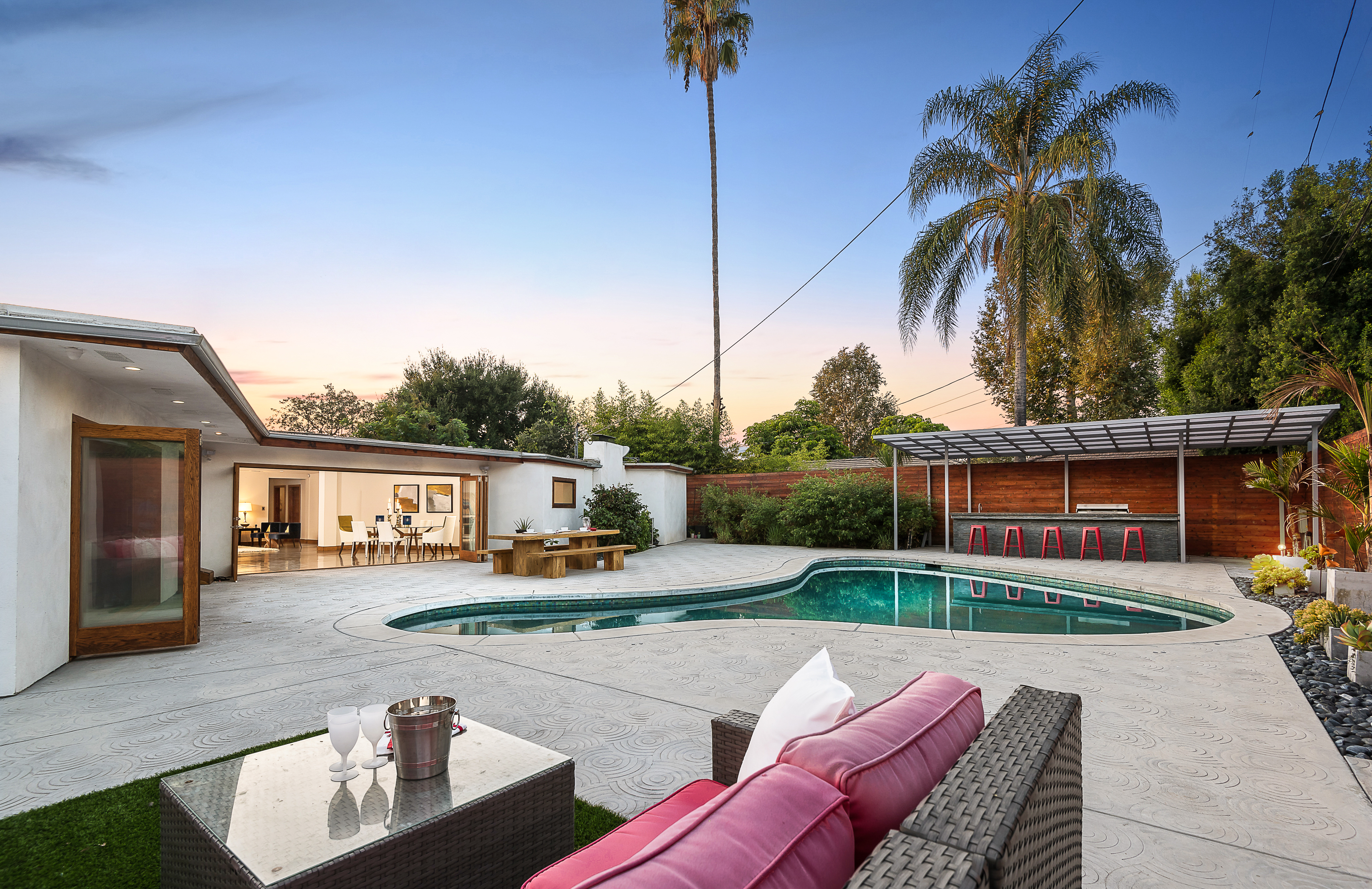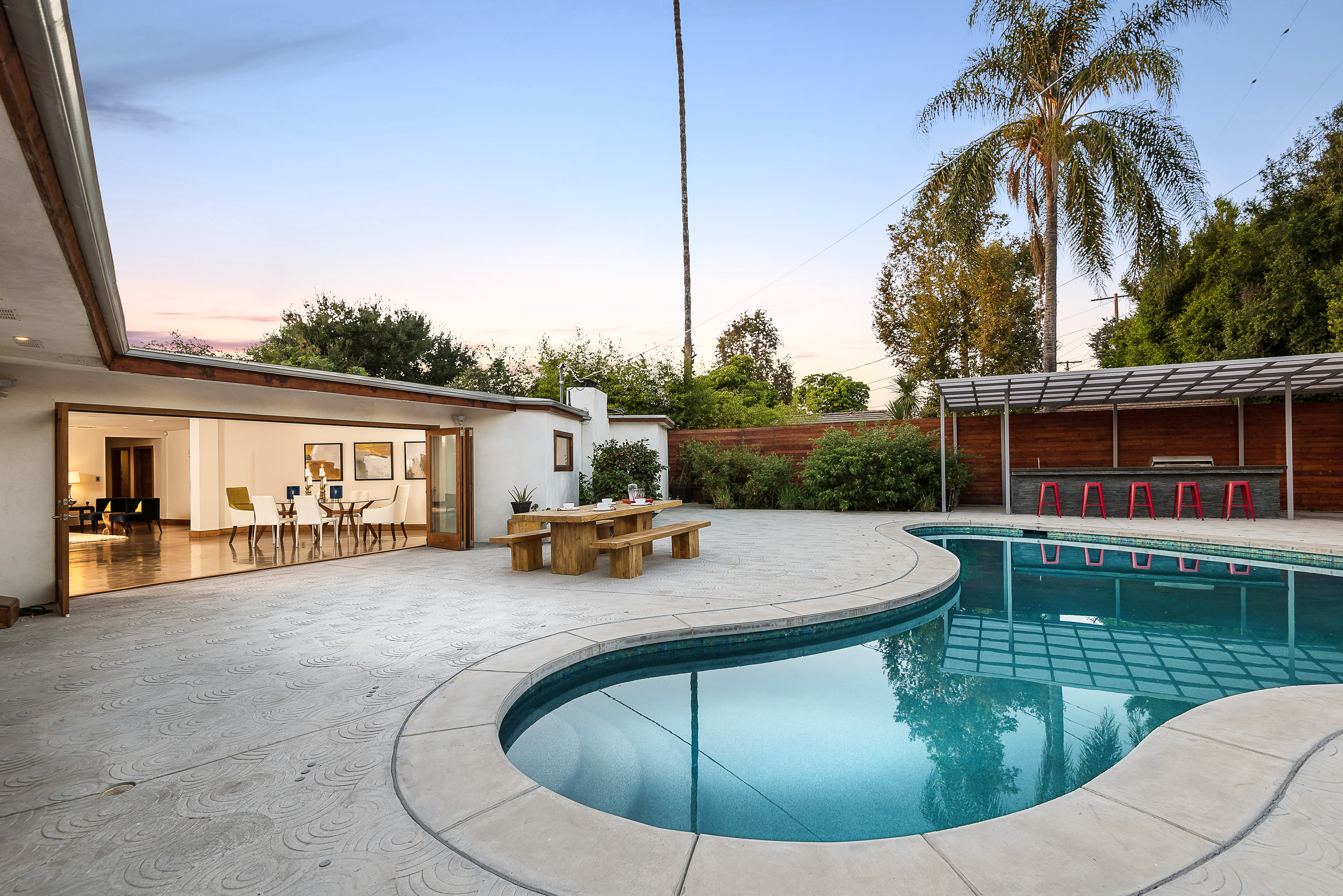 Come on in! This one-level mid-century modern home located in Prime Sherman Oaks will make you feel like you've been transported to a Palm Springs retreat. Sitting on a nearly 12,000 square foot lot, this completely remodeled home with 5 bedrooms and 5 bathrooms, offers an open floor plan with over 3,400 square feet, with high ceilings and cool concrete floors. The gourmet chef's kitchen is complete with Caesarstone countertops, built in Thermador appliances, custom cabinetry, and an oversized breakfast bar big enough for the whole family. This gorgeous home features two Master suites with walk-in closets as well as three additional rooms, perfect for bedrooms or office/living space. The living and dining areas open up seamlessly to each other and are highlighted by wall to wall folding windows that open to the entertainer's backyard. The yard features a saltwater PebbleSheen pool as well as a wet bar and built-in BBQ! Located in the Dixie Canyon School district, this is one you have to see. Moments from Ventura Blvd., Westfield Fashion Square + so much more, come fall in love with this incredible home!