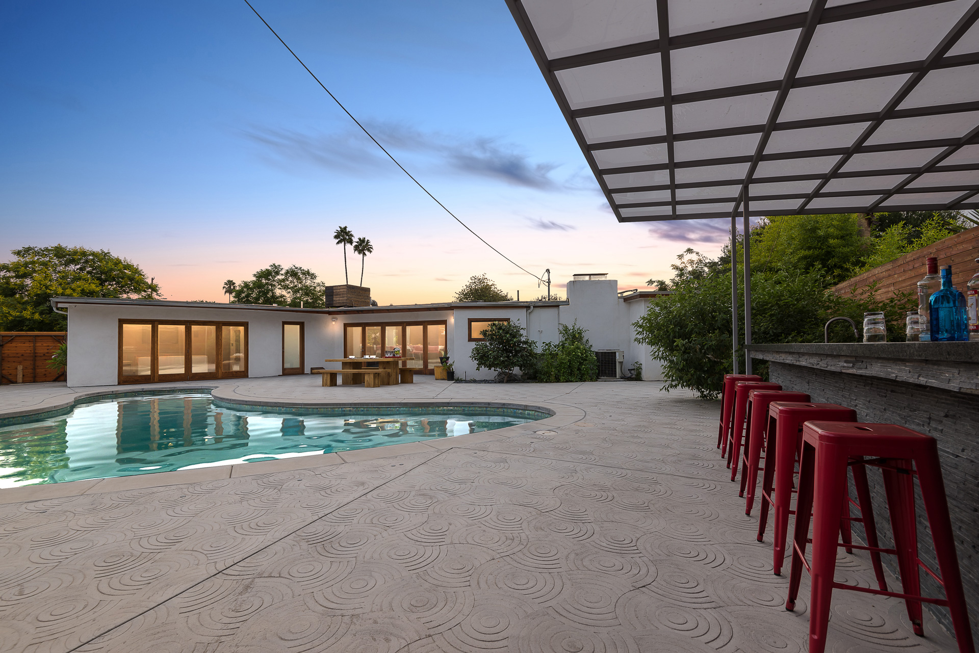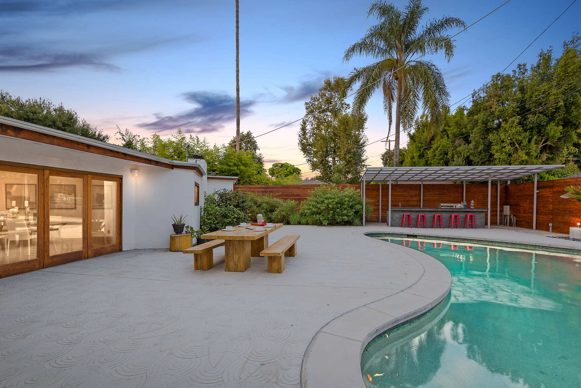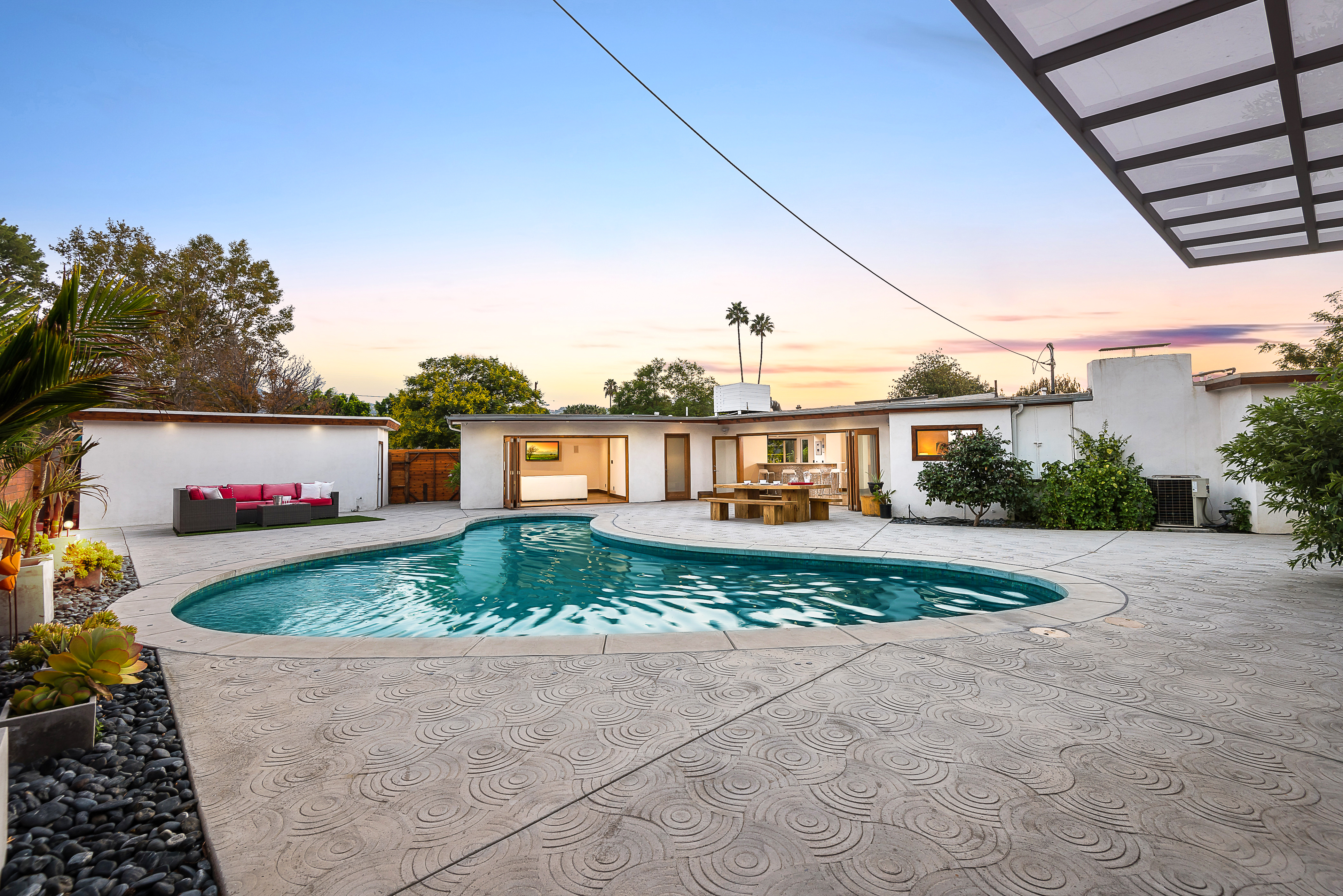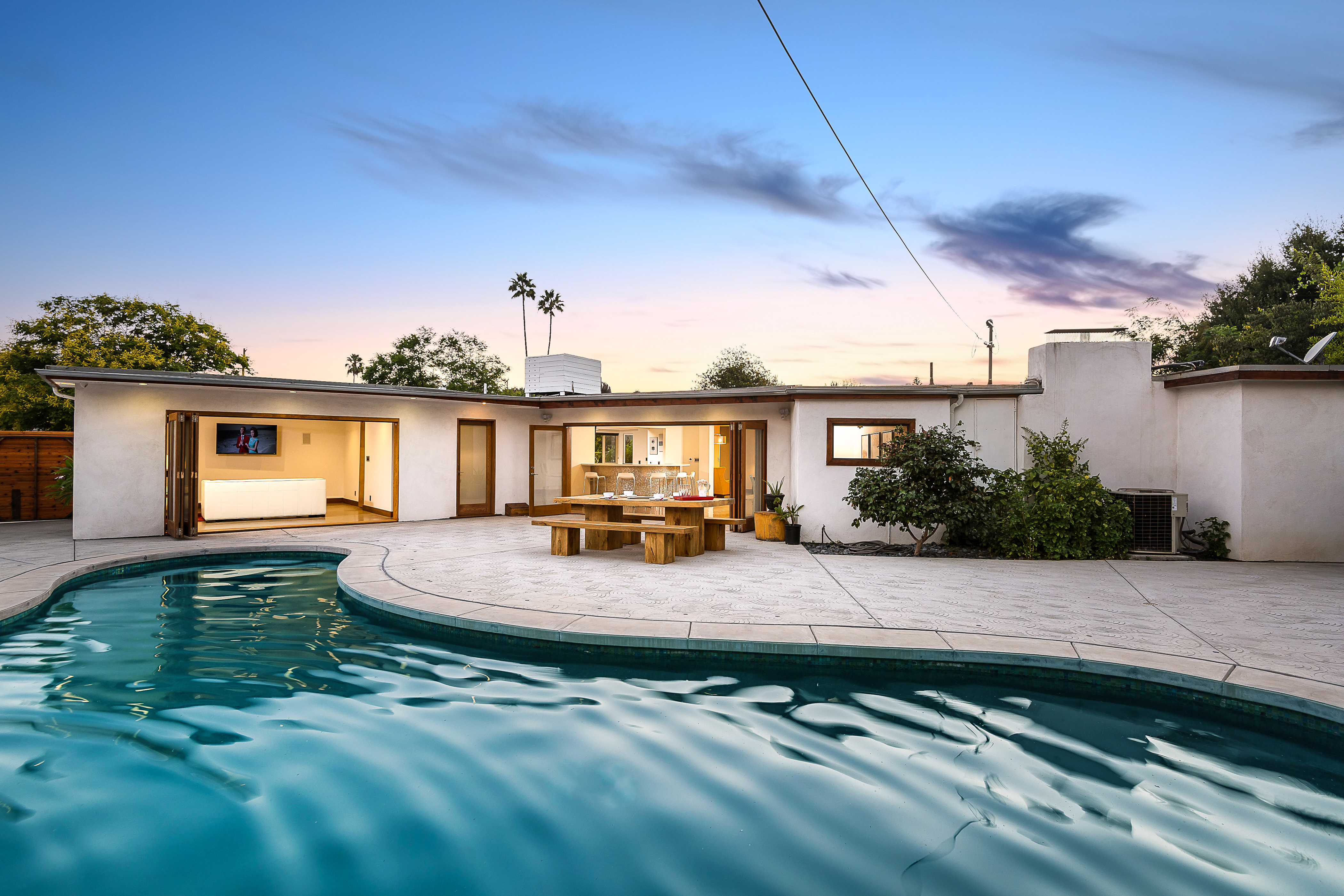 Come on in! This one-level mid-century modern home located in Prime Sherman Oaks will make you feel like you've been transported to a Palm Springs retreat. Sitting on a nearly 12,000 square foot lot, this completely remodeled home with 5 bedrooms and 5 bathrooms, offers an open floor plan with over 3,400 square feet, with high ceilings and cool concrete floors. The gourmet chef's kitchen is complete with Caesarstone countertops, built in Thermador appliances, custom cabinetry, and an oversized breakfast bar big enough for the whole family. This gorgeous home features two Master suites with walk-in closets as well as three additional rooms, perfect for bedrooms or office/living space. The living and dining areas open up seamlessly to each other and are highlighted by wall to wall folding windows that open to the entertainer's backyard. The yard features a saltwater PebbleSheen pool as well as a wet bar and built-in BBQ! Located in the Dixie Canyon School district, this is one you have to see. Moments from Ventura Blvd., Westfield Fashion Square + so much more, come fall in love with this incredible home!