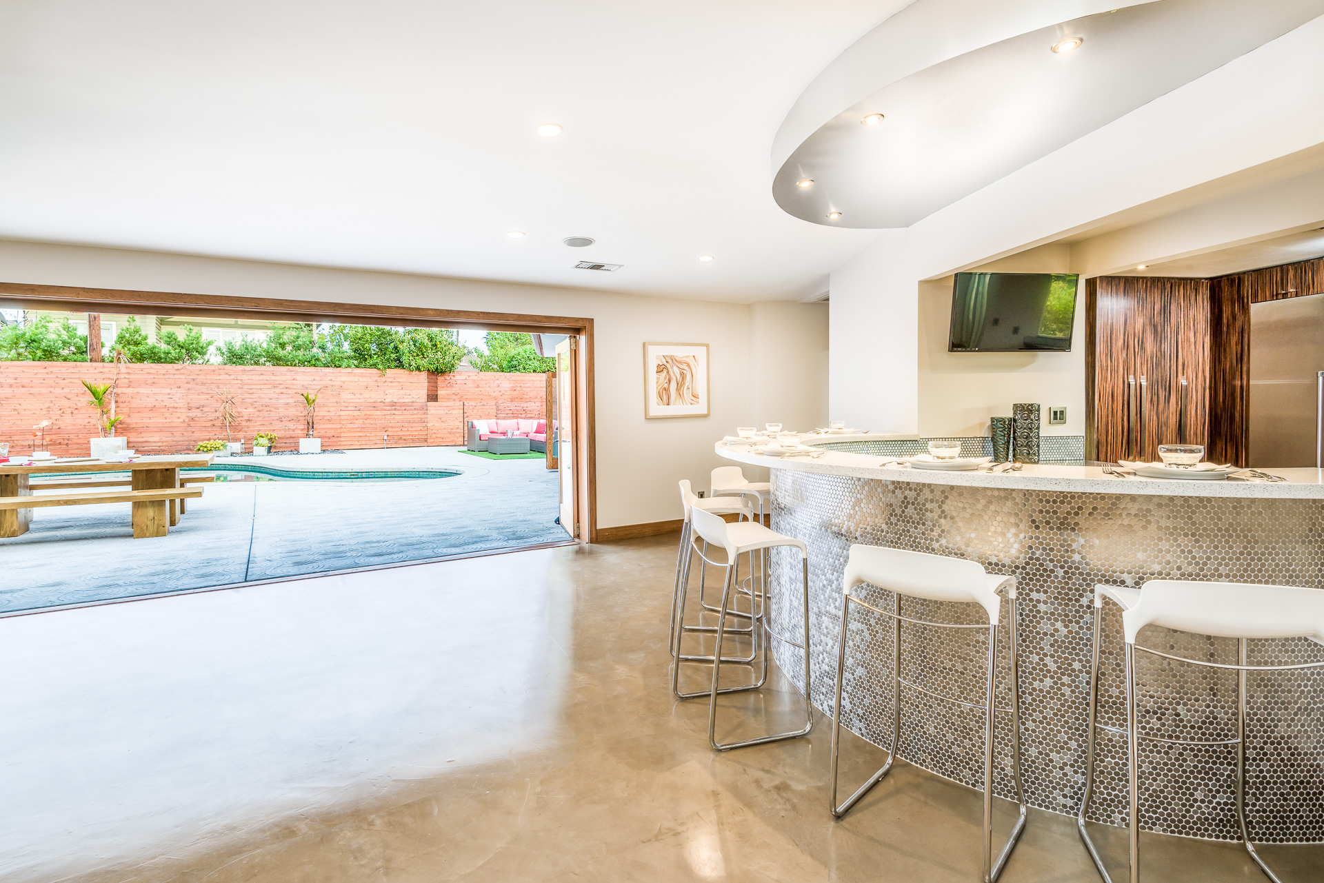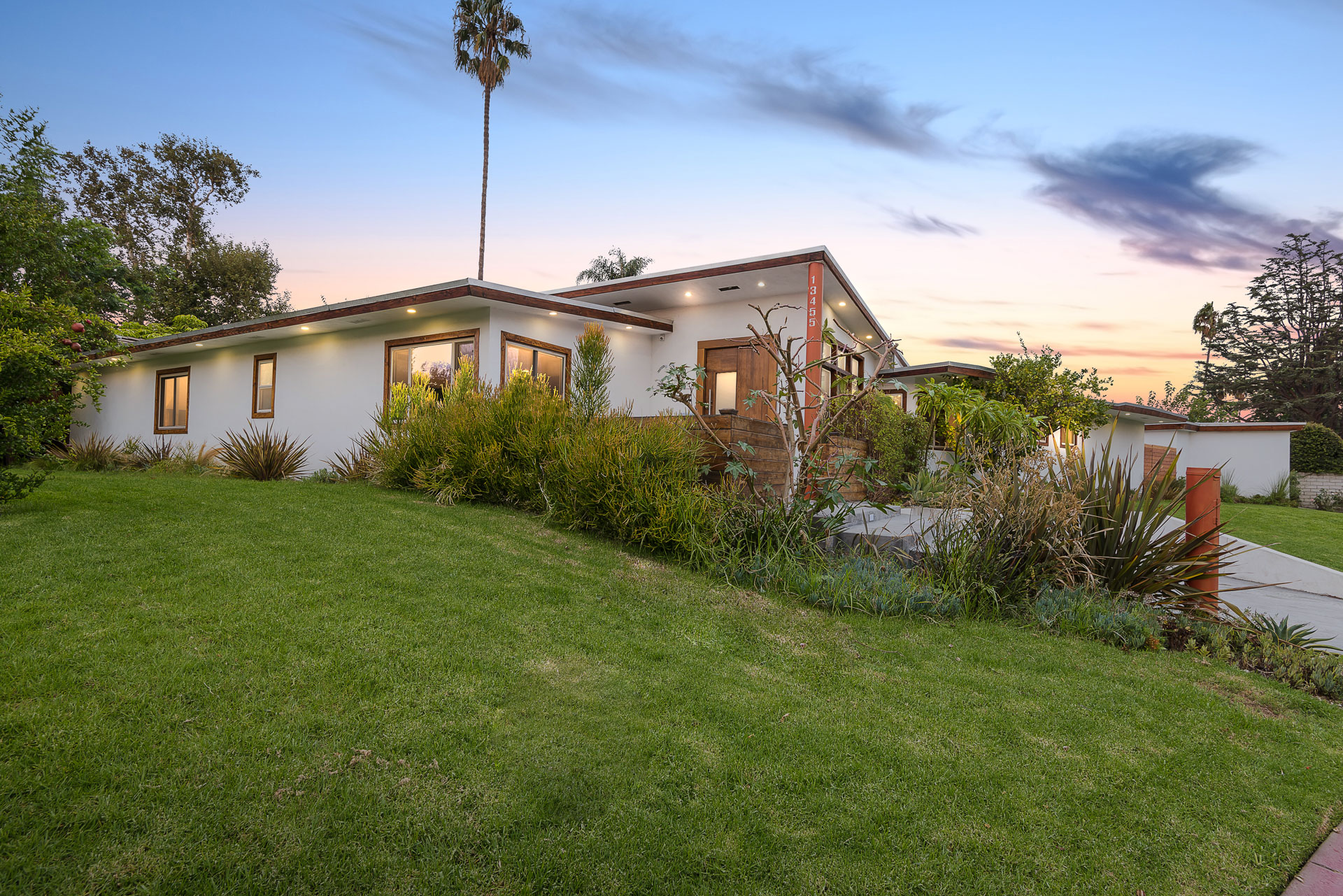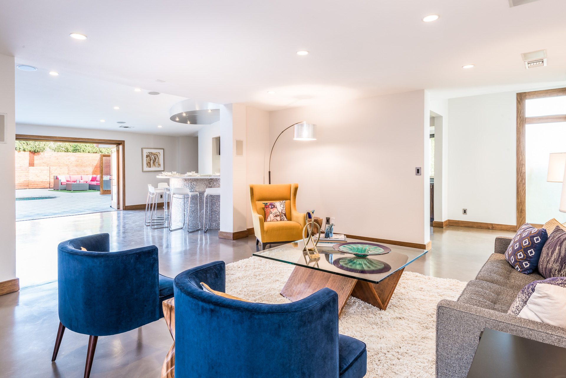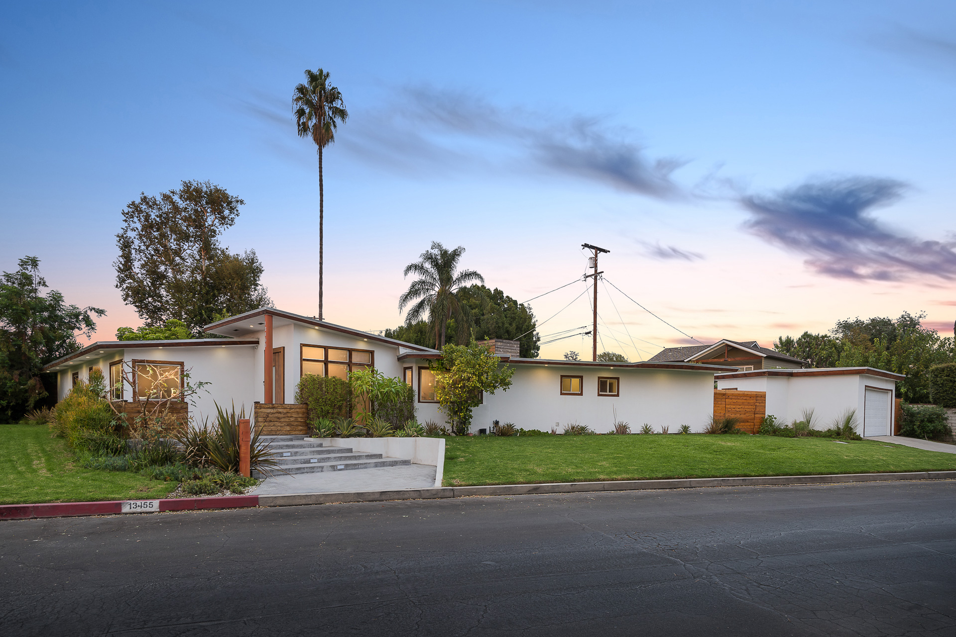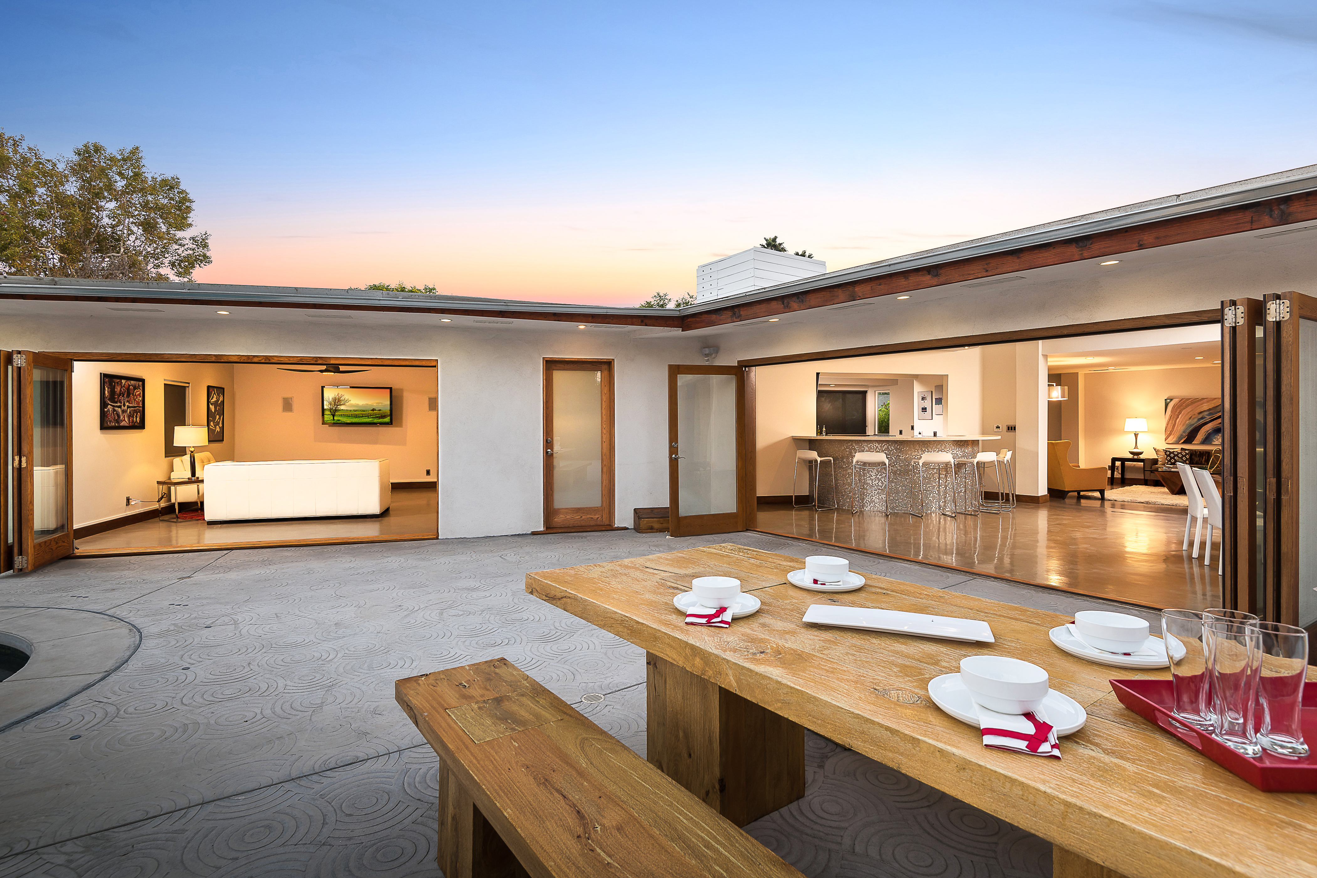 Come on in! This one-level mid-century modern home located in Prime Sherman Oaks will make you feel like you've been transported to a Palm Springs retreat. Sitting on a nearly 12,000 square foot lot, this completely remodeled home with 5 bedrooms and 5 bathrooms, offers an open floor plan with over 3,400 square feet, with high ceilings and cool concrete floors. The gourmet chef's kitchen is complete with Caesarstone countertops, built in Thermador appliances, custom cabinetry, and an oversized breakfast bar big enough for the whole family. This gorgeous home features two Master suites with walk-in closets as well as three additional rooms, perfect for bedrooms or office/living space. The living and dining areas open up seamlessly to each other and are highlighted by wall to wall folding windows that open to the entertainer's backyard. The yard features a saltwater PebbleSheen pool as well as a wet bar and built-in BBQ! Located in the Dixie Canyon School district, this is one you have to see. Moments from Ventura Blvd., Westfield Fashion Square + so much more, come fall in love with this incredible home!