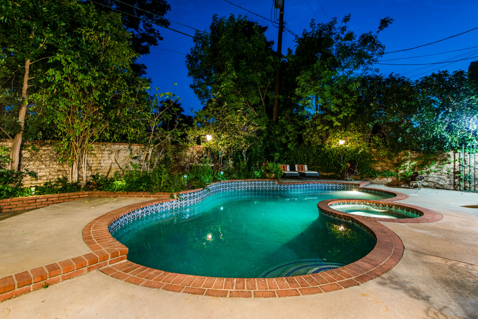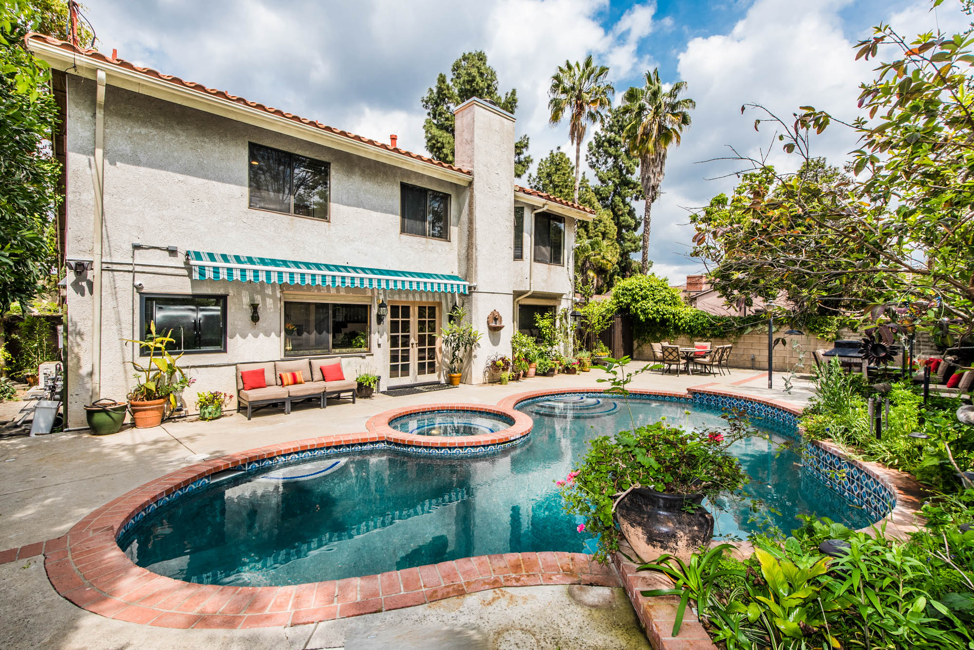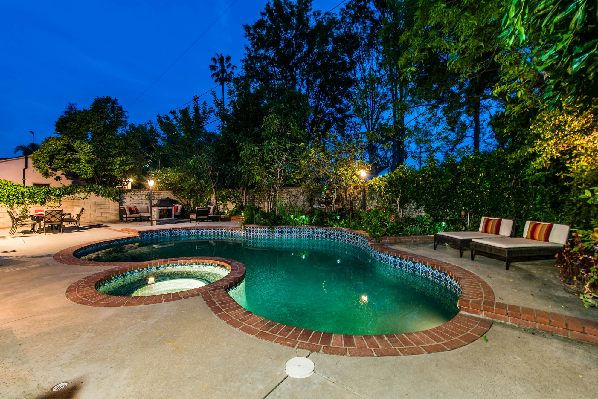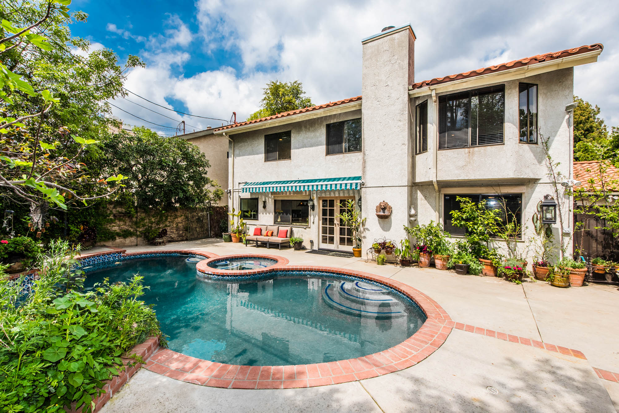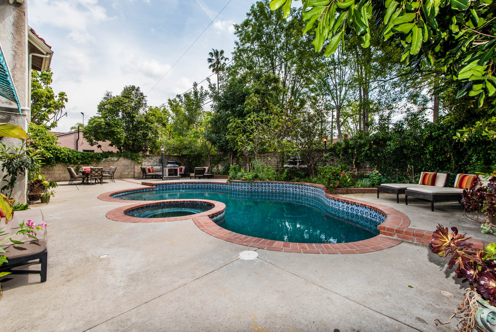 Beautifully updated 5 bedroom, 3 bath home located in a highly desirable pocket of Sherman Oaks. Enter through the gated brick courtyard and into this gorgeous home. Upon entering you are met with the dramatic vaulted ceilings and sophisticated Travertine flooring of the formal living room which opens into the formal dining room. The elegance continues into the gourmet chef’s kitchen, complete with top of the line Thermador appliances, large center island with breakfast bar, and marble countertops. The kitchen opens to the cozy den with wood burning fireplace and offers French doors to the private backyard. Outside, the lush landscaping, beautifully tiled pool & spa, and large patio area create the ultimate Southern California living experience. The downstairs rounds out with a spacious guest room, bathroom, and laundry room that provides direct access to the 3-car garage. Hardwood floors grace the upstairs which holds 4 more bedrooms including the opulent master suite with vaulted beamed ceilings, walk-in closet, and luxurious bathroom. Additional features include security camera system, newer plumbing, electrical, HVAC, and pool heater. Conveniently located to the Sherman Oaks Park, Westfield Shopping Center, and 101 freeway, this home is not to be missed!