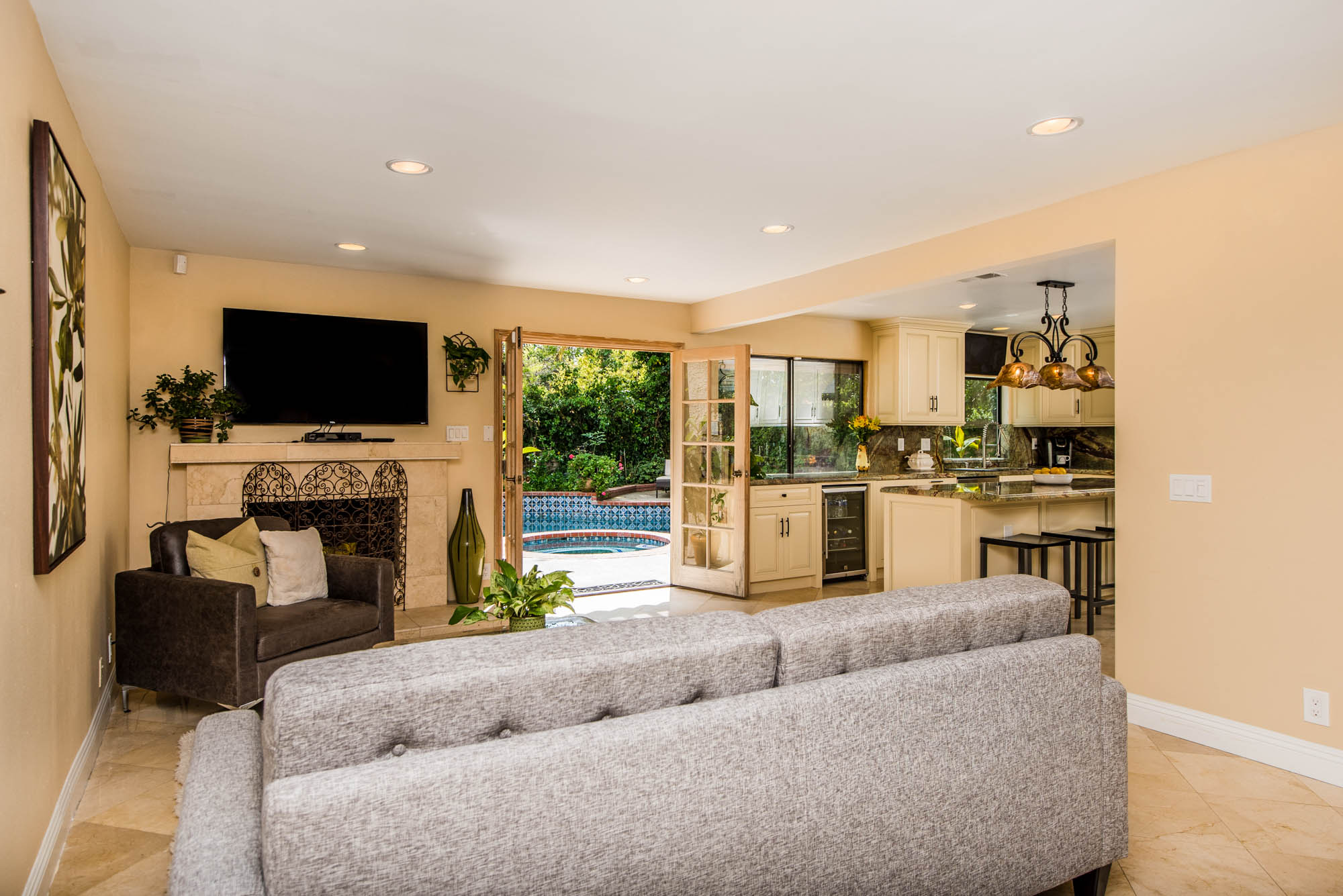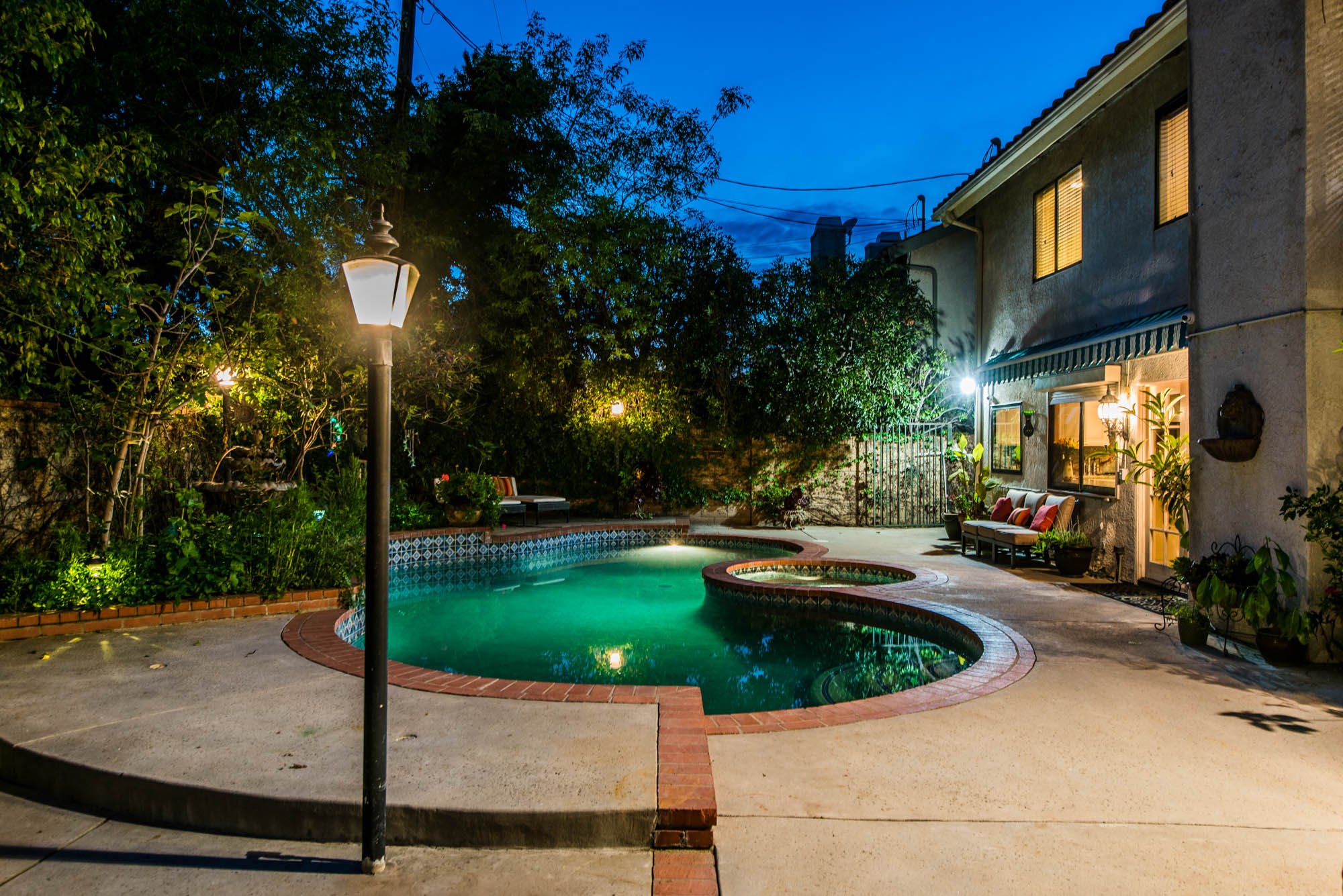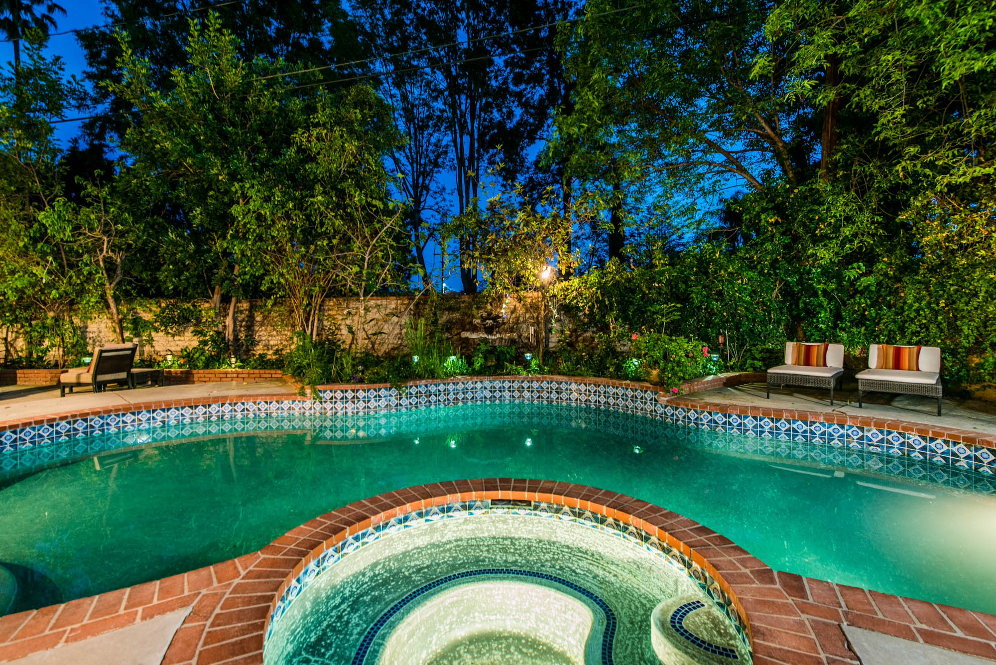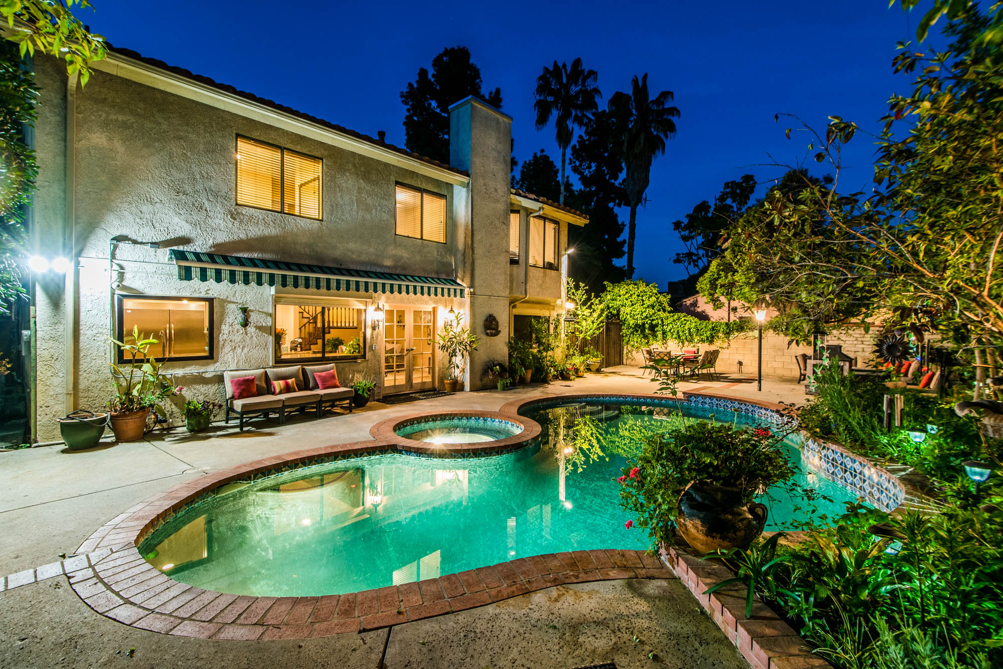 Beautifully updated 5 bedroom, 3 bath home located in a highly desirable pocket of Sherman Oaks. Enter through the gated brick courtyard and into this gorgeous home. Upon entering you are met with the dramatic vaulted ceilings and sophisticated Travertine flooring of the formal living room which opens into the formal dining room. The elegance continues into the gourmet chef’s kitchen, complete with top of the line Thermador appliances, large center island with breakfast bar, and marble countertops. The kitchen opens to the cozy den with wood burning fireplace and offers French doors to the private backyard. Outside, the lush landscaping, beautifully tiled pool & spa, and large patio area create the ultimate Southern California living experience. The downstairs rounds out with a spacious guest room, bathroom, and laundry room that provides direct access to the 3-car garage. Hardwood floors grace the upstairs which holds 4 more bedrooms including the opulent master suite with vaulted beamed ceilings, walk-in closet, and luxurious bathroom. Additional features include security camera system, newer plumbing, electrical, HVAC, and pool heater. Conveniently located to the Sherman Oaks Park, Westfield Shopping Center, and 101 freeway, this home is not to be missed!