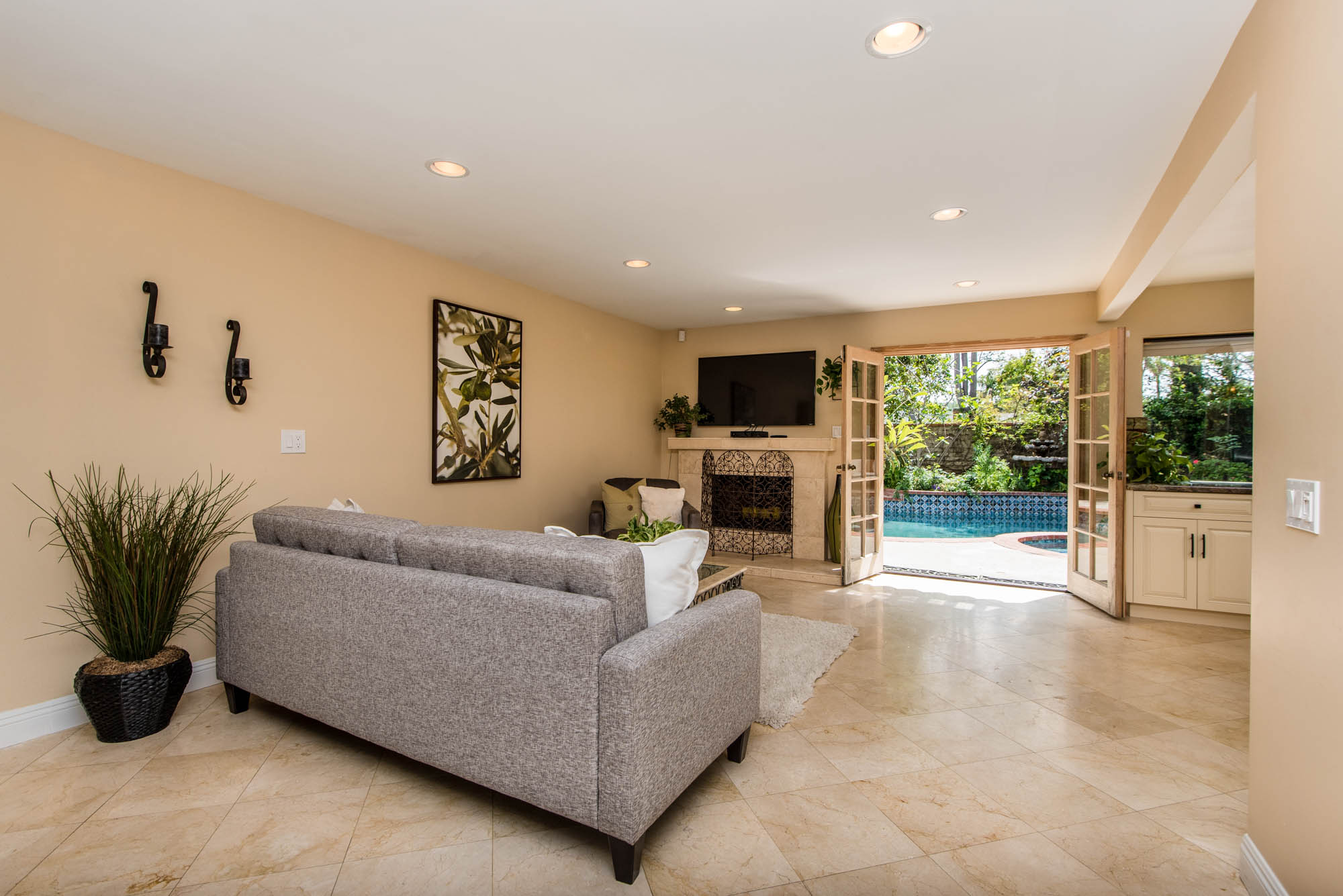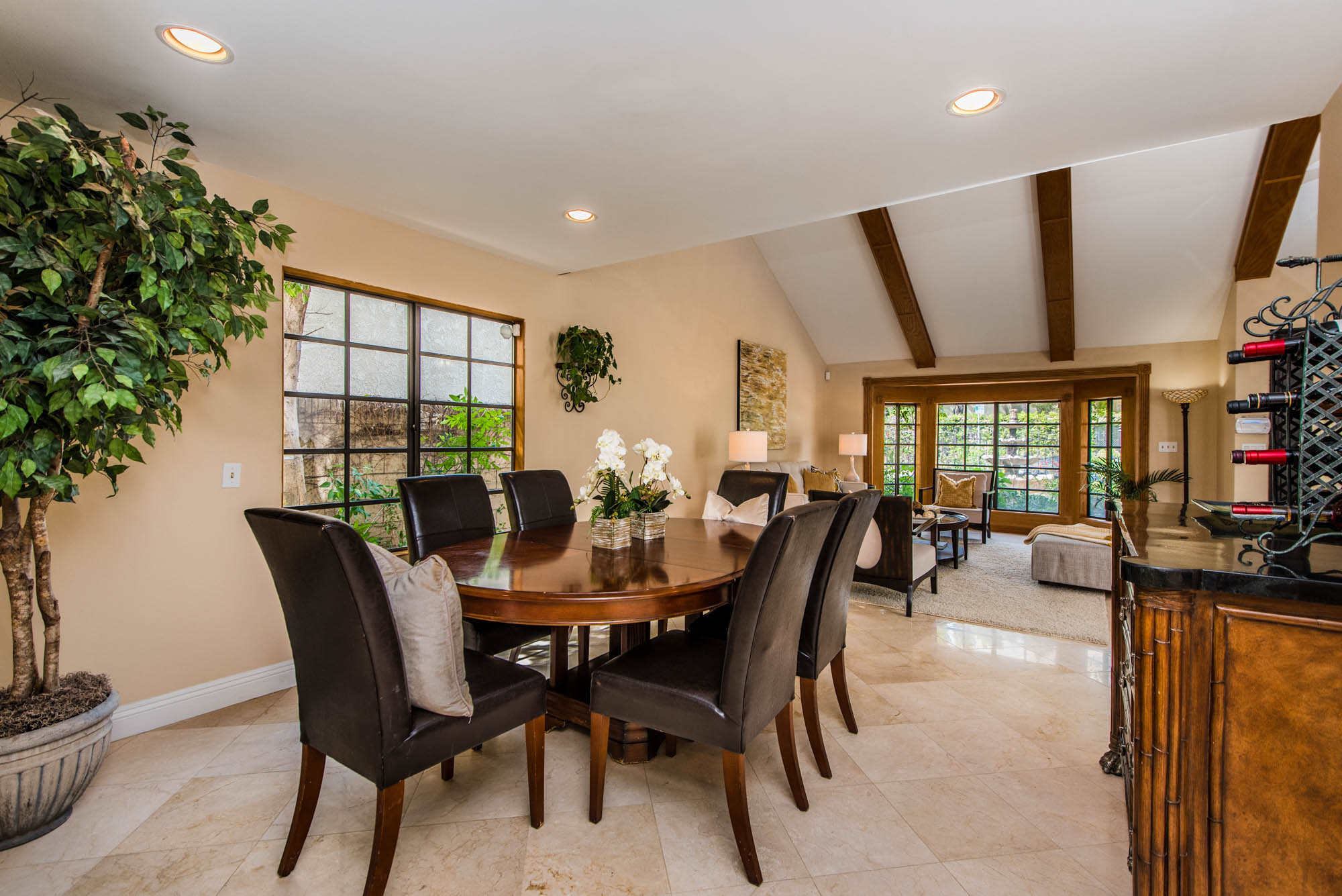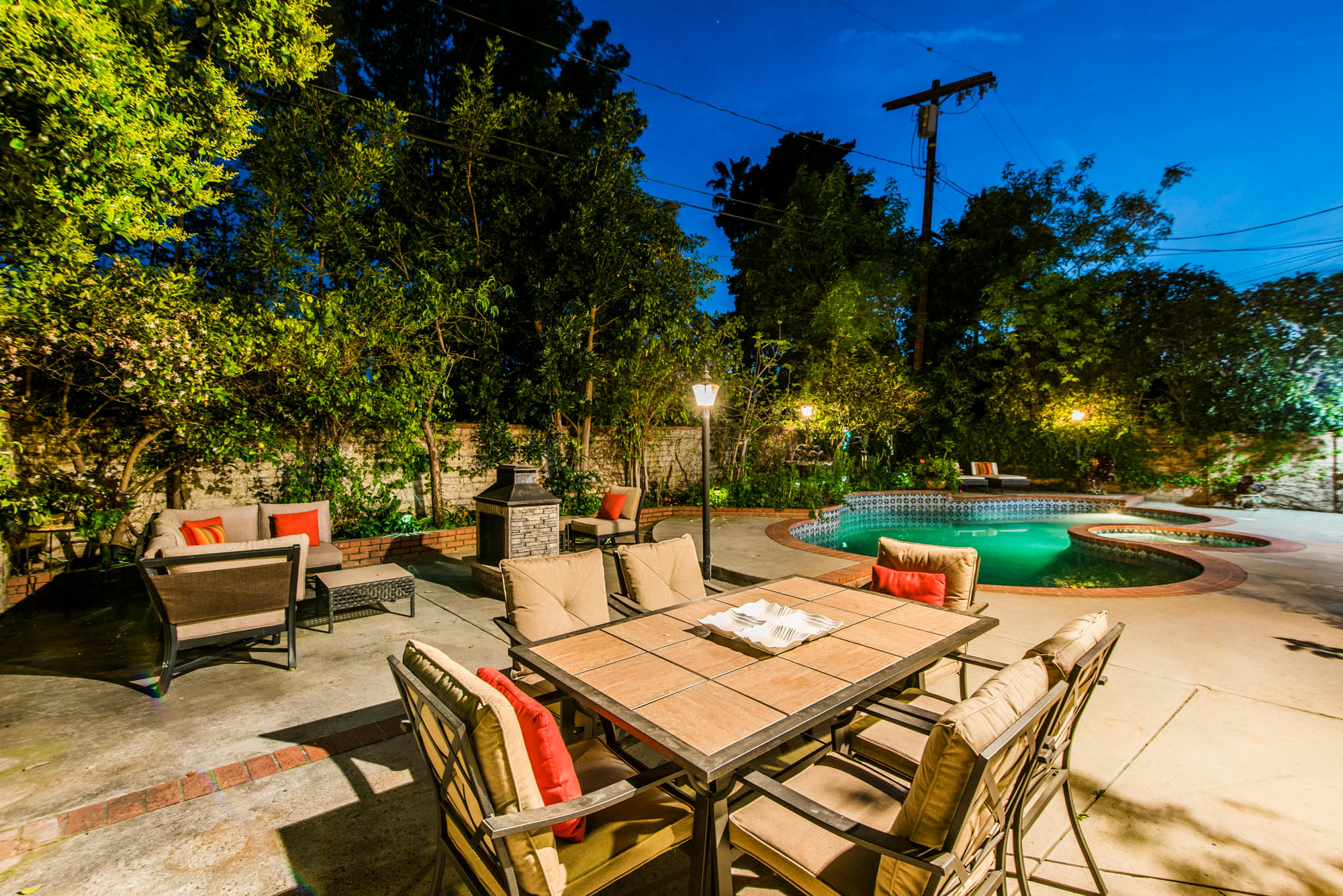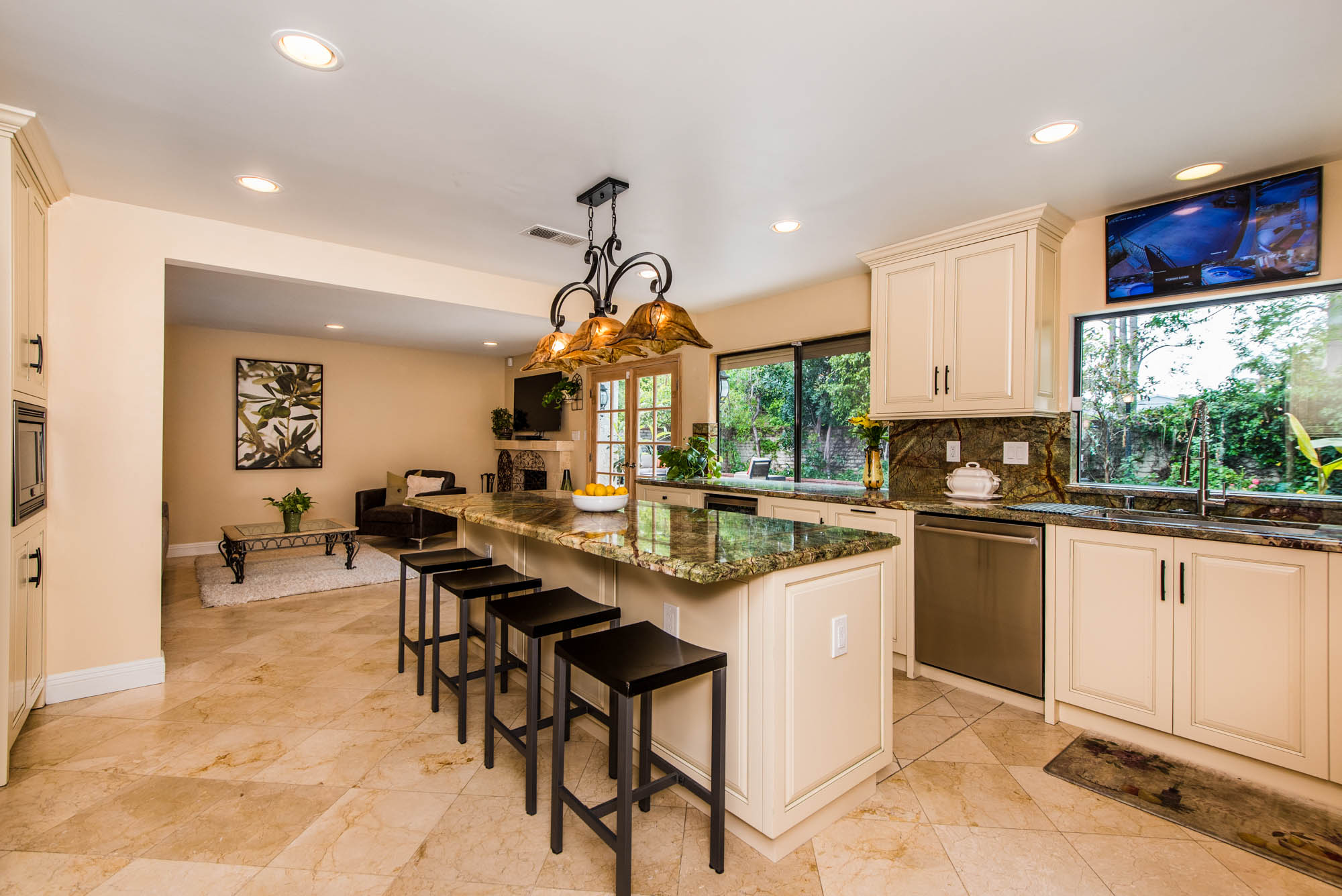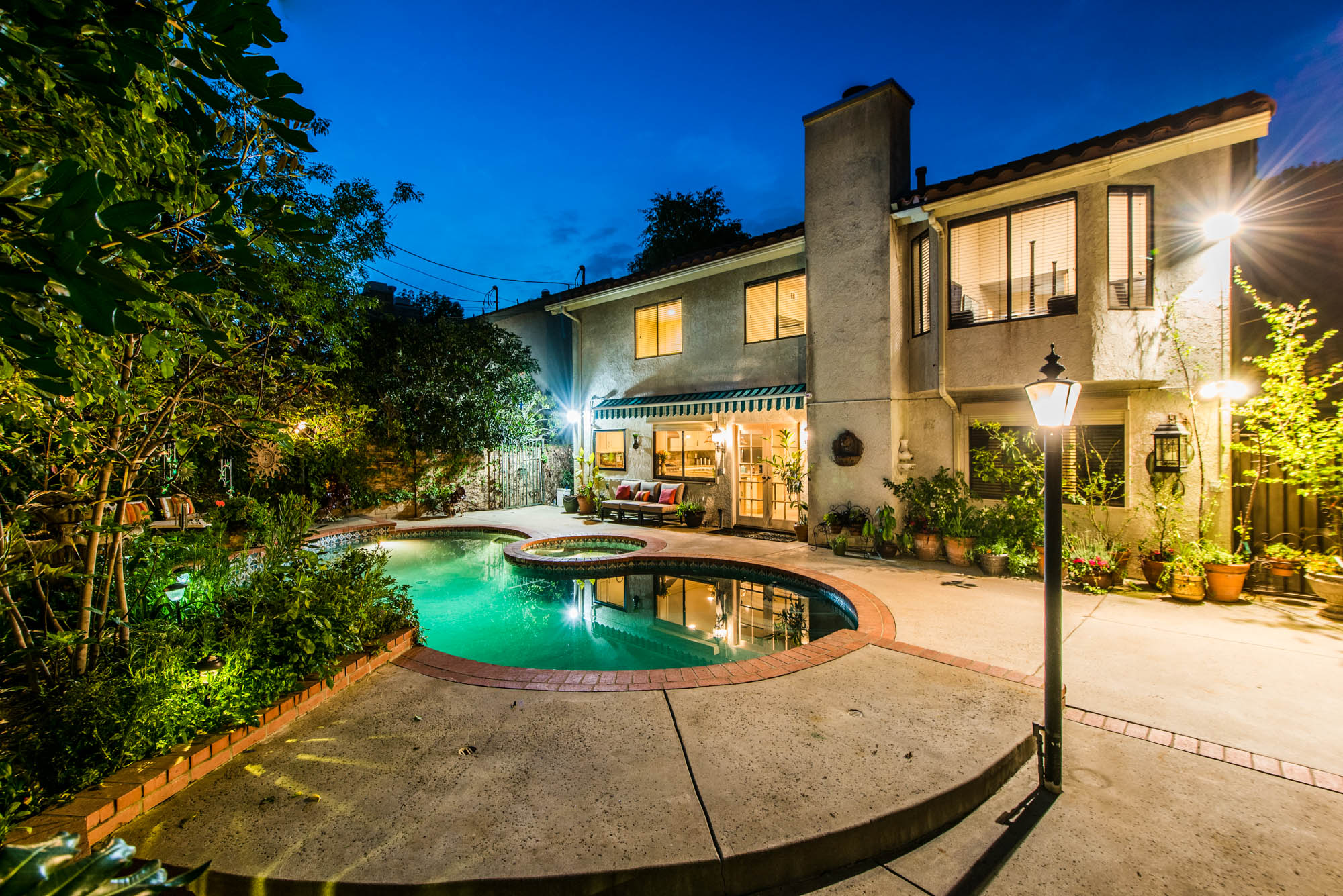 Beautifully updated 5 bedroom, 3 bath home located in a highly desirable pocket of Sherman Oaks. Enter through the gated brick courtyard and into this gorgeous home. Upon entering you are met with the dramatic vaulted ceilings and sophisticated Travertine flooring of the formal living room which opens into the formal dining room. The elegance continues into the gourmet chef’s kitchen, complete with top of the line Thermador appliances, large center island with breakfast bar, and marble countertops. The kitchen opens to the cozy den with wood burning fireplace and offers French doors to the private backyard. Outside, the lush landscaping, beautifully tiled pool & spa, and large patio area create the ultimate Southern California living experience. The downstairs rounds out with a spacious guest room, bathroom, and laundry room that provides direct access to the 3-car garage. Hardwood floors grace the upstairs which holds 4 more bedrooms including the opulent master suite with vaulted beamed ceilings, walk-in closet, and luxurious bathroom. Additional features include security camera system, newer plumbing, electrical, HVAC, and pool heater. Conveniently located to the Sherman Oaks Park, Westfield Shopping Center, and 101 freeway, this home is not to be missed!