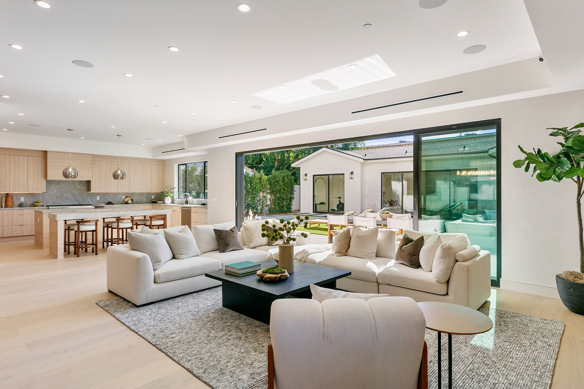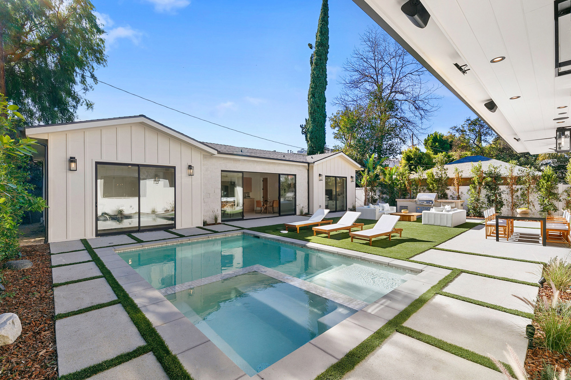 Introducing an exceptional new construction estate situated in the heart of Sherman Oaks. This property features a detached two-bed, one-bath ADU, complete with its own living room and full kitchen, perfect for guests, extended family or as additional living space. Designed for modern living, the primary residence showcases a spacious open-concept living and dining area that opens effortlessly into the gourmet chef’s kitchen, which is outfitted with top-of-the-line appliances, double islands and a walk-in pantry. An oversized sliding glass door seamlessly extends your living space into the serene backyard retreat, where a sparkling pool/spa and built-in BBQ create the perfect setting for outdoor entertaining. Completing the main level is an ensuite bedroom, chic powder bathroom with a one-of-a-kind natural stone sink and a mudroom with direct access to the two-car garage. Upstairs, four generously sized ensuite bedrooms are complemented by a dedicated laundry room. The primary suite offers a peaceful retreat highlighted by a private balcony, dual walk-in closets and a spa-inspired bathroom with a soaking tub, oversized rainfall shower and double vanity. Additional features include a state-of-the-art security system with cameras, high ceilings and built-in speakers throughout. This property is ideally located within the award-winning Dixie Canyon School District and sits just moments away from Ventura Boulevard, Westfield Fashion Square, top private schools and so much more.