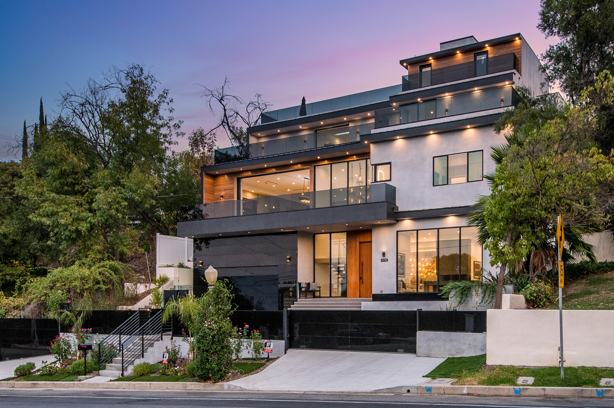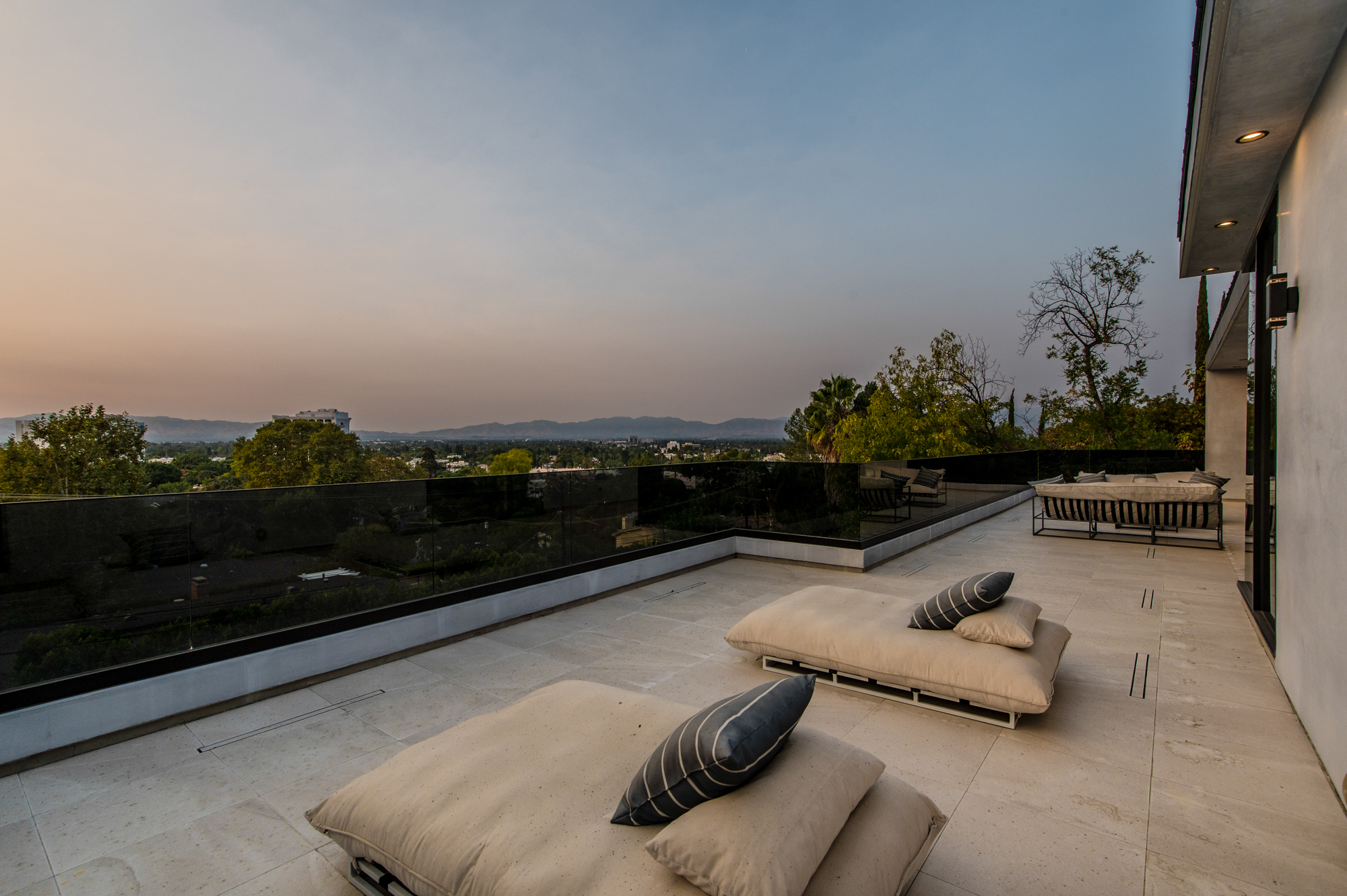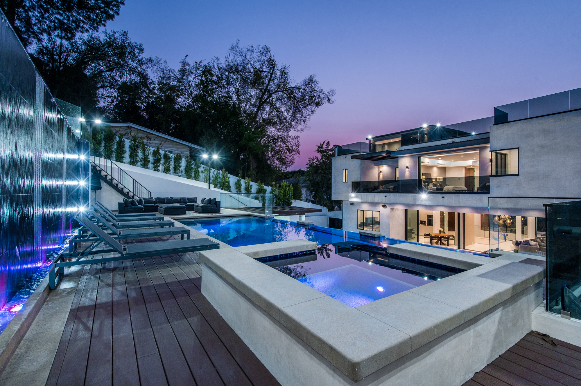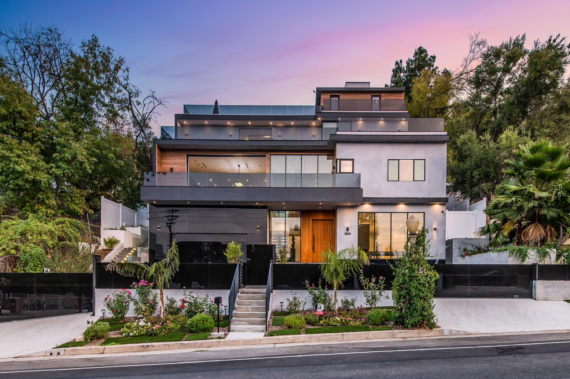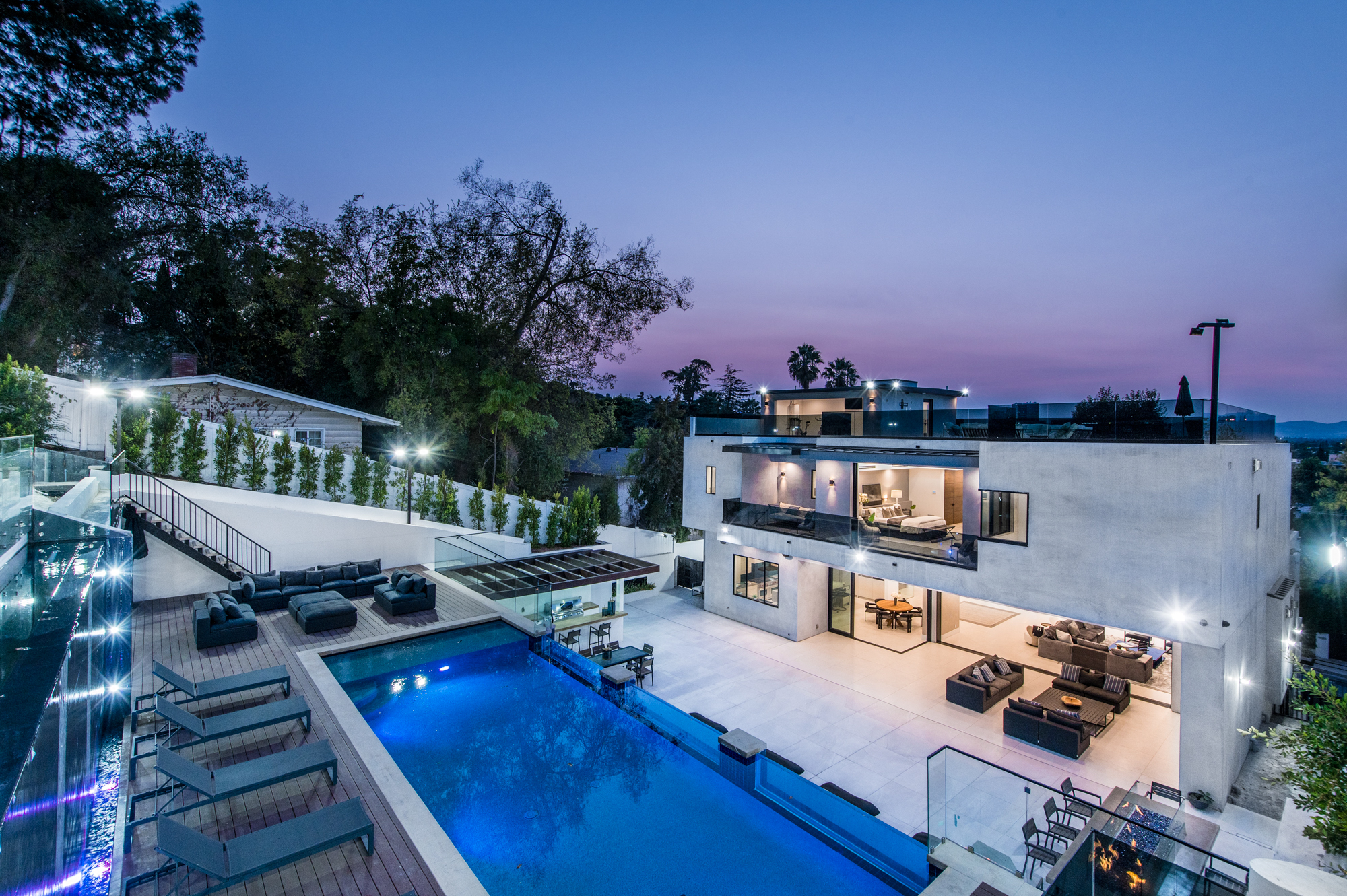 Situated on a prestigious street south of the Blvd, this contemporary modern estate is the newest gem in Sherman Oaks. Flawless at every angle, guests arrive to a multi-level entertainment statement property designed for the most discerning buyer. Inside guests are greeted w/ soaring ceilings & a floating glass staircase that adorns a large main foyer, overlooking the expansive floor plan. Sophisticated formal living room features a large stone linear fireplace, temperature controlled wine cellar, & floor to ceiling pocket sliding doors that open to the entertainer’s dream backyard. Elegant formal dining room offers a bar & opens to a patio w/ expansive views of the valley. Gourmet Chef’s kitchen features quartz counters, large center island w/ breakfast bar, breakfast nook & walk in pantry. Upstairs, the master retreat features a wet bar, fireplace, private balconies, spa-like master bath, & illuminated walk-in closet. Finally, a boasting rooftop deck w/ gym showcases 180 degree jetliner views of the valley. A second kitchen, media room & 4 additional guest suites complete this estate. Backyard sanctuary provides multi level seating areas, elevated sparkling pool & spa w/ transparent glass & cascading waterfalls, covered patio w/ fireplace, outdoor kitchen & elevated fire-pit bar. Additional amenities include Control4 smart system, security cameras, surround sound & elevator. Live a luxurious lifestyle that is within close proximity to shops, fine dining & more.