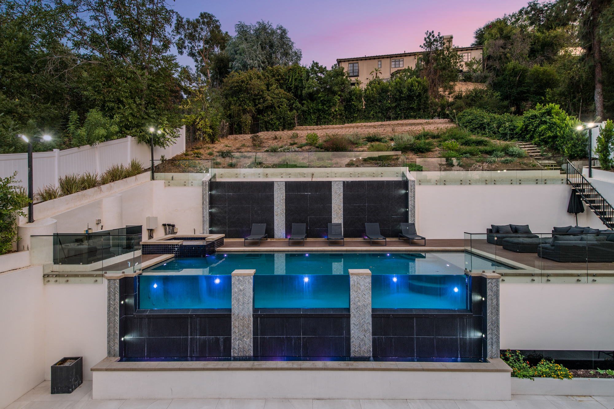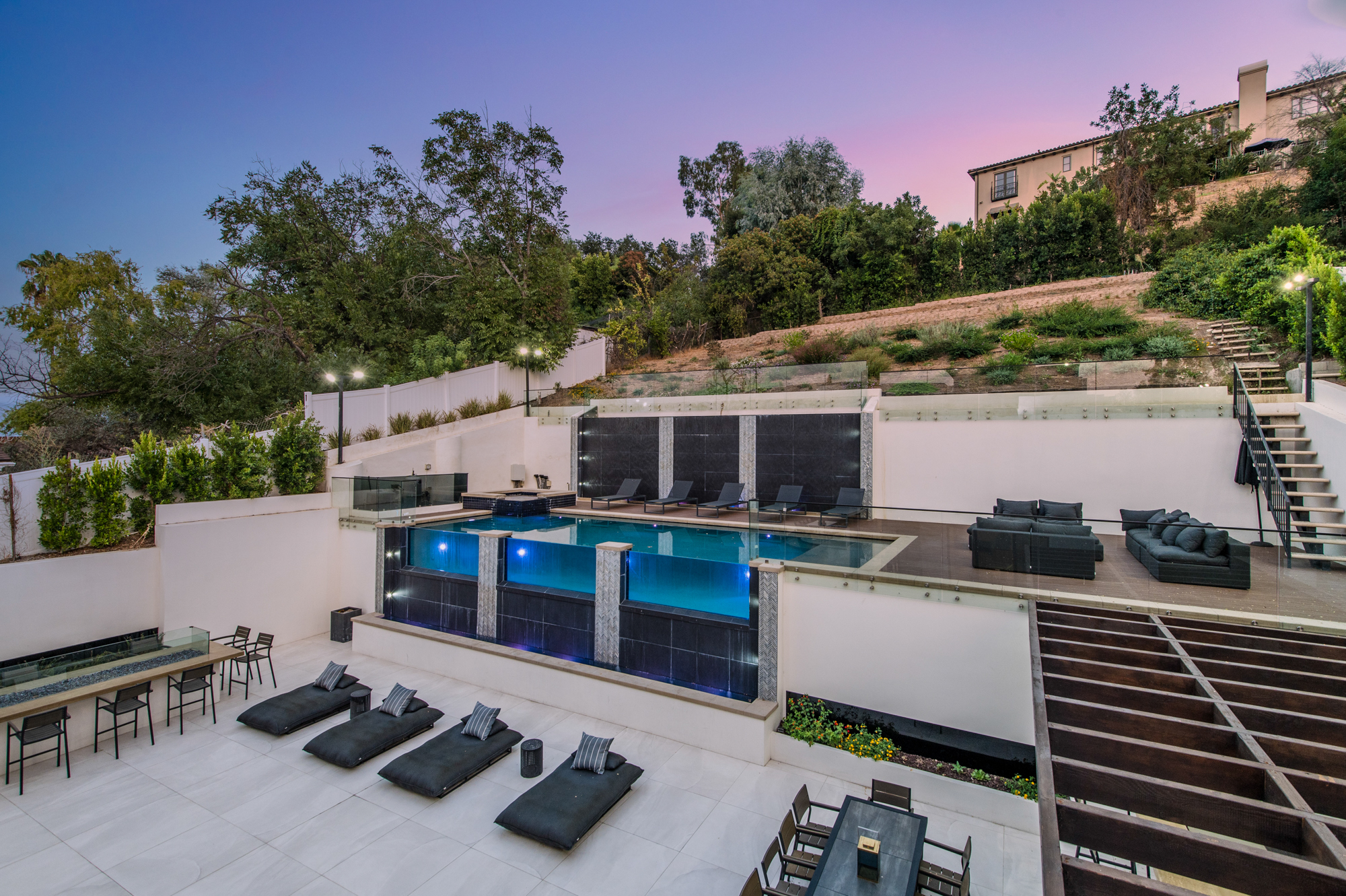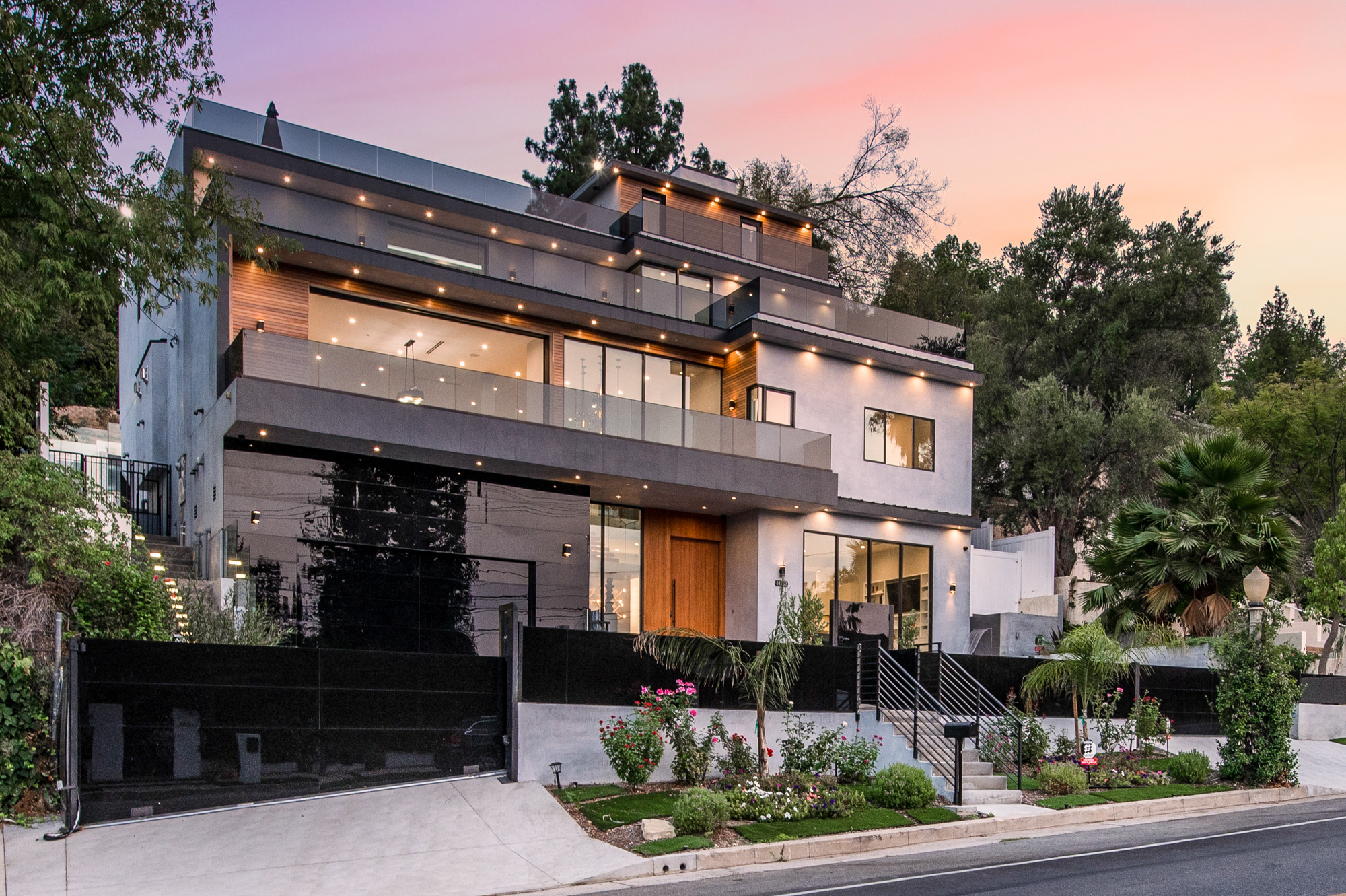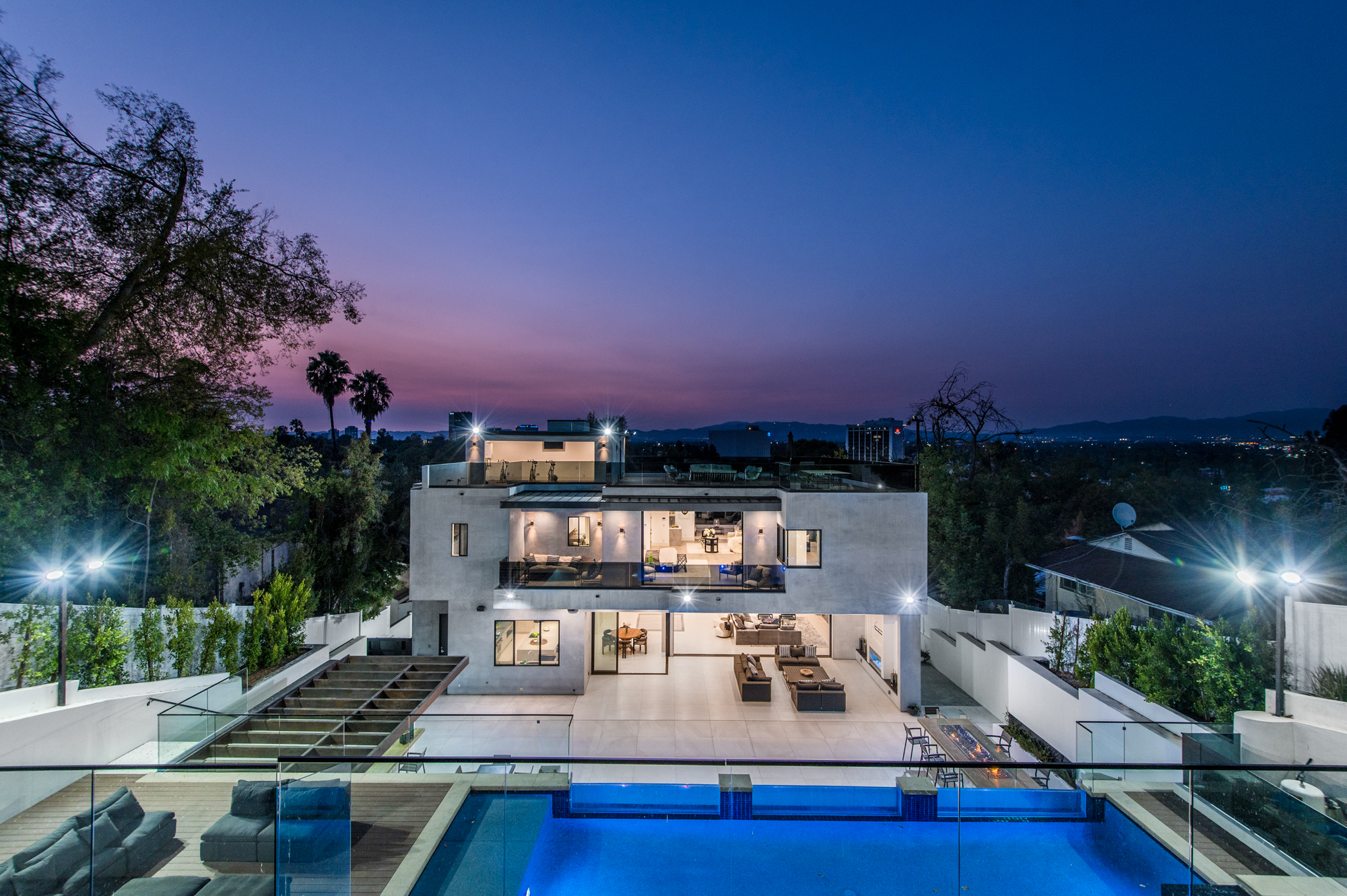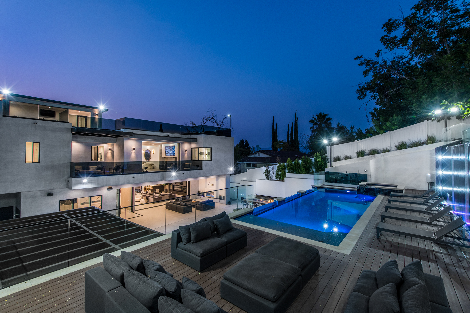 Situated on a prestigious street south of the Blvd, this contemporary modern estate is the newest gem in Sherman Oaks. Flawless at every angle, guests arrive to a multi-level entertainment statement property designed for the most discerning buyer. Inside guests are greeted w/ soaring ceilings & a floating glass staircase that adorns a large main foyer, overlooking the expansive floor plan. Sophisticated formal living room features a large stone linear fireplace, temperature controlled wine cellar, & floor to ceiling pocket sliding doors that open to the entertainer’s dream backyard. Elegant formal dining room offers a bar & opens to a patio w/ expansive views of the valley. Gourmet Chef’s kitchen features quartz counters, large center island w/ breakfast bar, breakfast nook & walk in pantry. Upstairs, the master retreat features a wet bar, fireplace, private balconies, spa-like master bath, & illuminated walk-in closet. Finally, a boasting rooftop deck w/ gym showcases 180 degree jetliner views of the valley. A second kitchen, media room & 4 additional guest suites complete this estate. Backyard sanctuary provides multi level seating areas, elevated sparkling pool & spa w/ transparent glass & cascading waterfalls, covered patio w/ fireplace, outdoor kitchen & elevated fire-pit bar. Additional amenities include Control4 smart system, security cameras, surround sound & elevator. Live a luxurious lifestyle that is within close proximity to shops, fine dining & more.