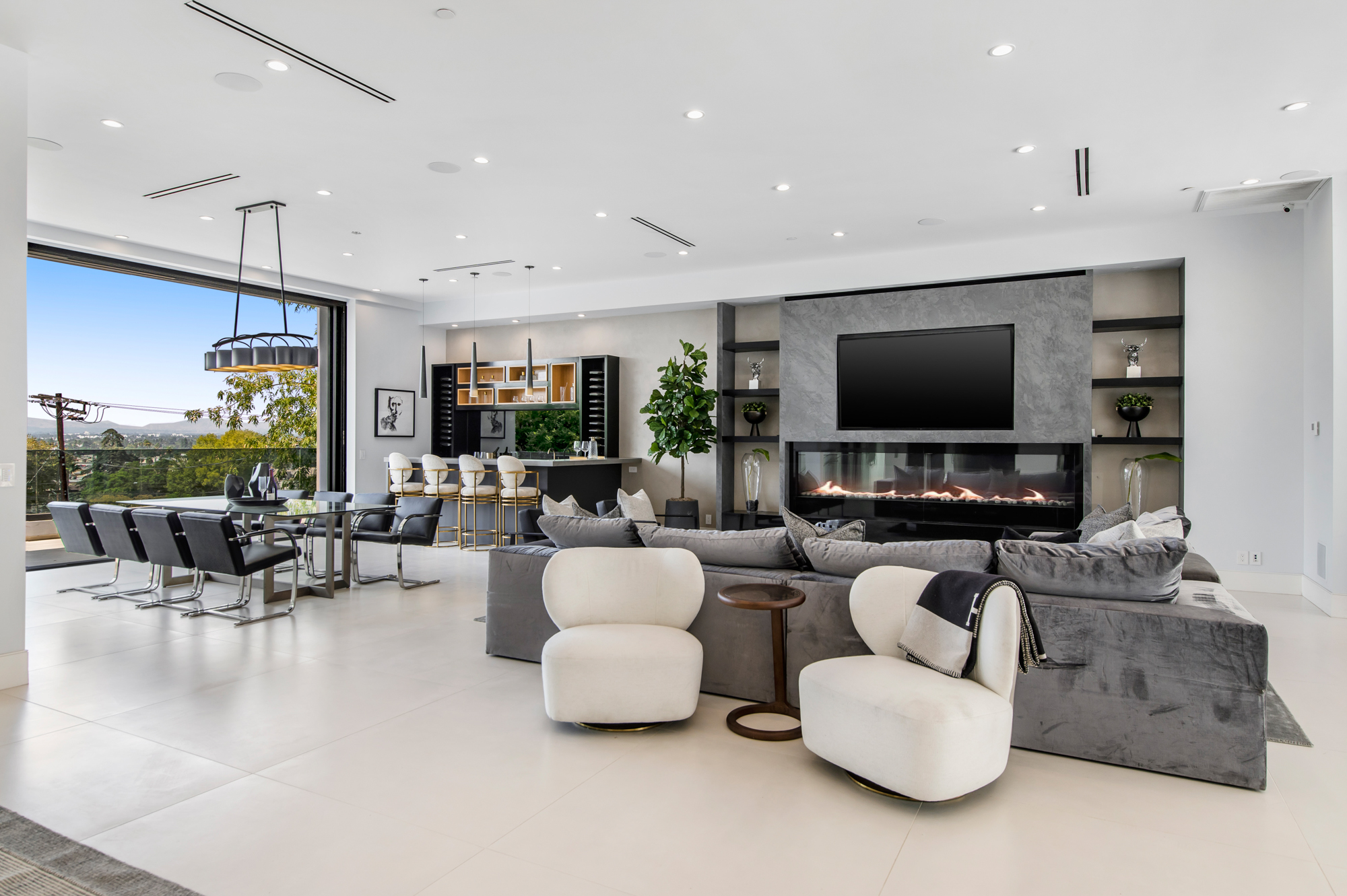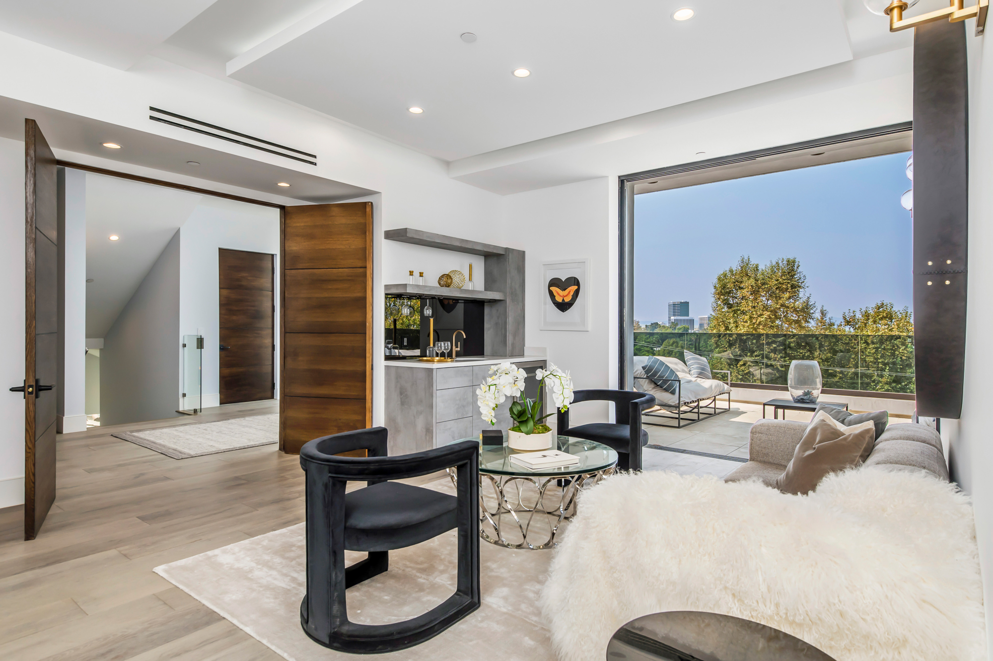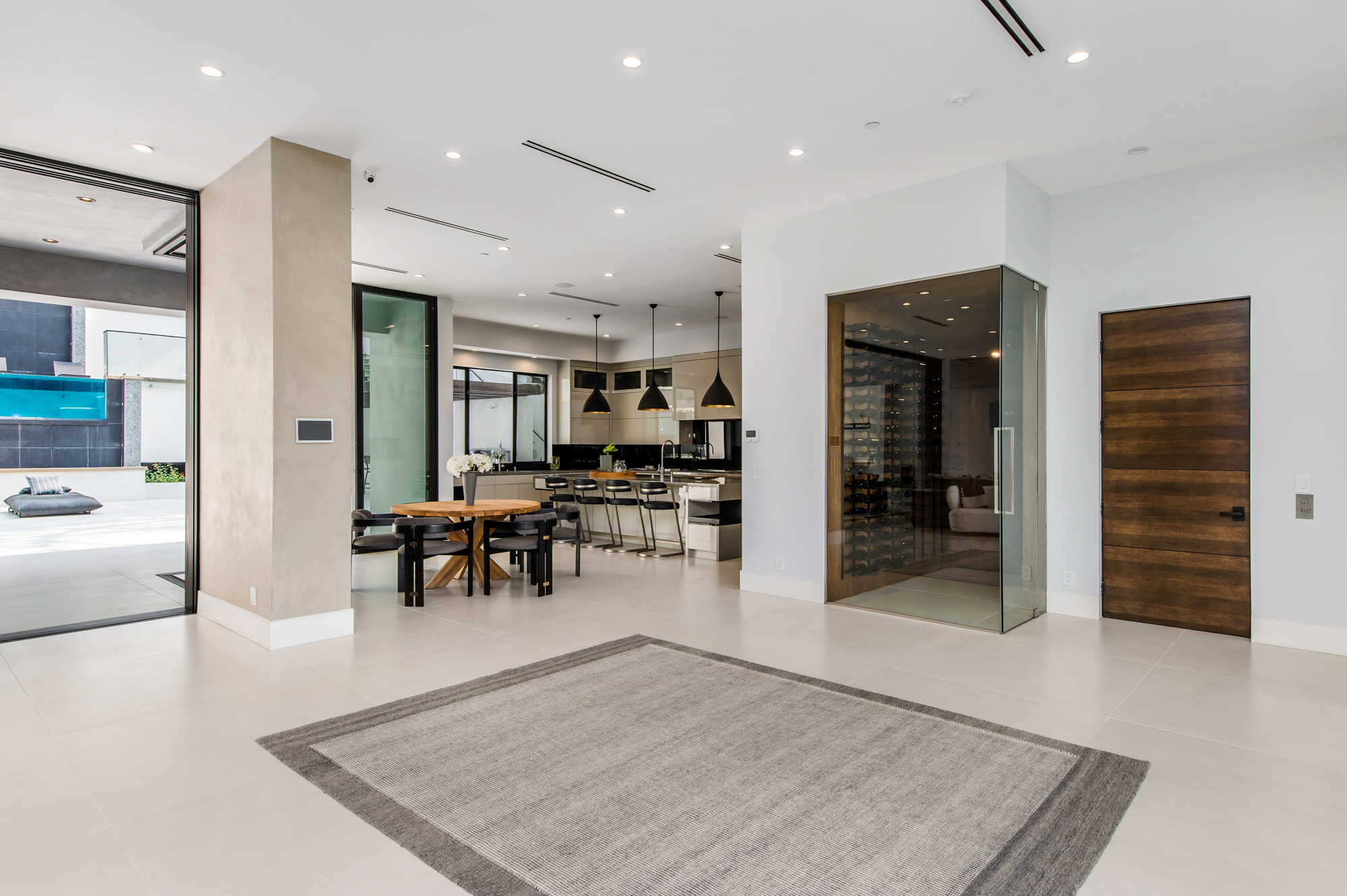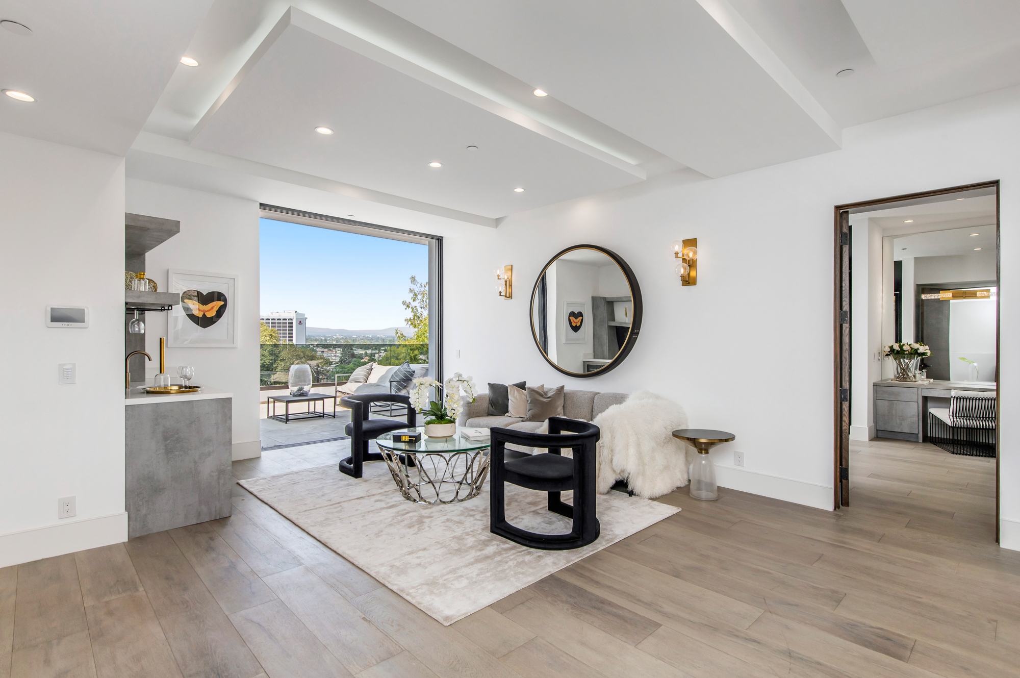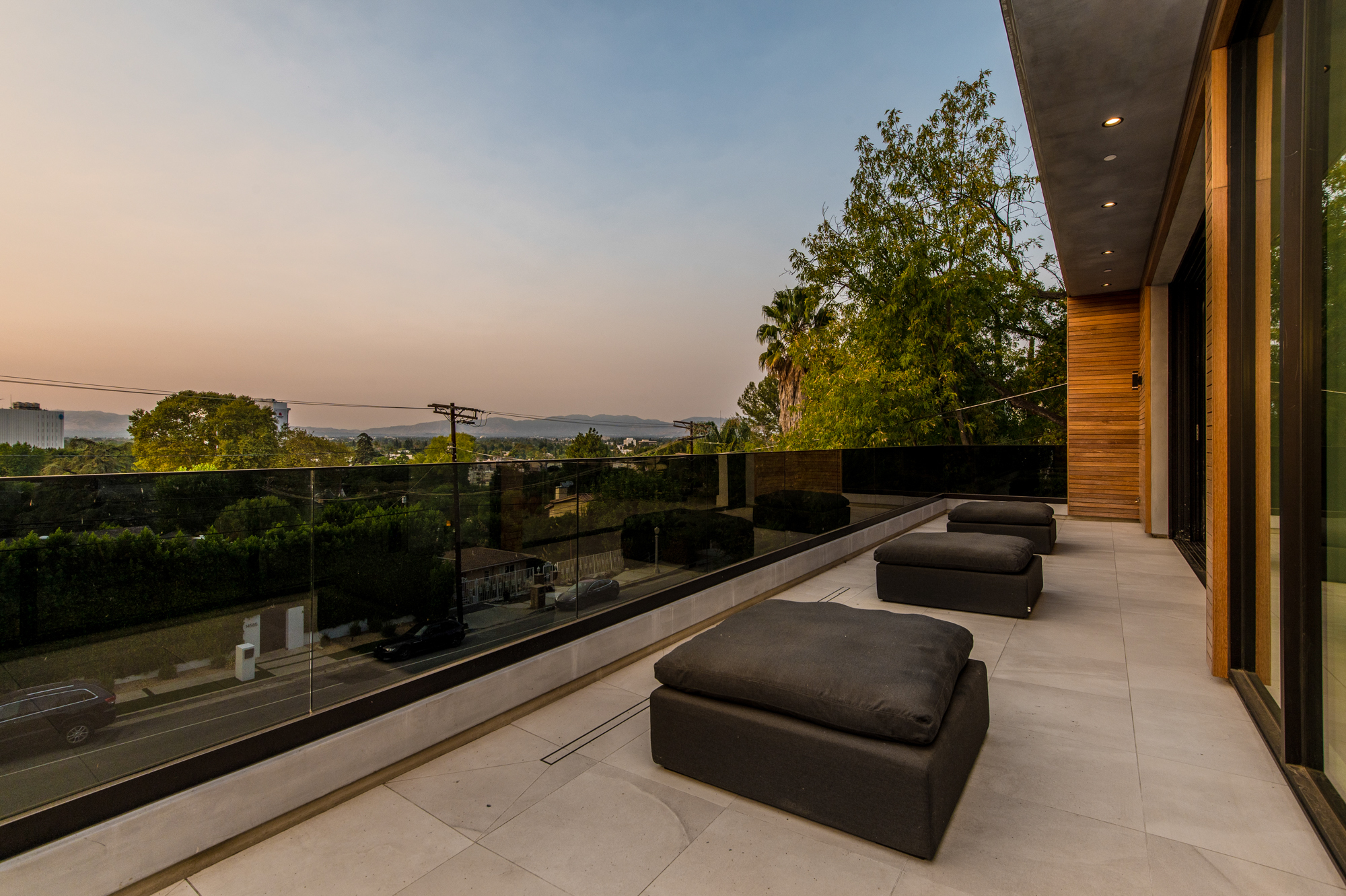 Situated on a prestigious street south of the Blvd, this contemporary modern estate is the newest gem in Sherman Oaks. Flawless at every angle, guests arrive to a multi-level entertainment statement property designed for the most discerning buyer. Inside guests are greeted w/ soaring ceilings & a floating glass staircase that adorns a large main foyer, overlooking the expansive floor plan. Sophisticated formal living room features a large stone linear fireplace, temperature controlled wine cellar, & floor to ceiling pocket sliding doors that open to the entertainer’s dream backyard. Elegant formal dining room offers a bar & opens to a patio w/ expansive views of the valley. Gourmet Chef’s kitchen features quartz counters, large center island w/ breakfast bar, breakfast nook & walk in pantry. Upstairs, the master retreat features a wet bar, fireplace, private balconies, spa-like master bath, & illuminated walk-in closet. Finally, a boasting rooftop deck w/ gym showcases 180 degree jetliner views of the valley. A second kitchen, media room & 4 additional guest suites complete this estate. Backyard sanctuary provides multi level seating areas, elevated sparkling pool & spa w/ transparent glass & cascading waterfalls, covered patio w/ fireplace, outdoor kitchen & elevated fire-pit bar. Additional amenities include Control4 smart system, security cameras, surround sound & elevator. Live a luxurious lifestyle that is within close proximity to shops, fine dining & more.