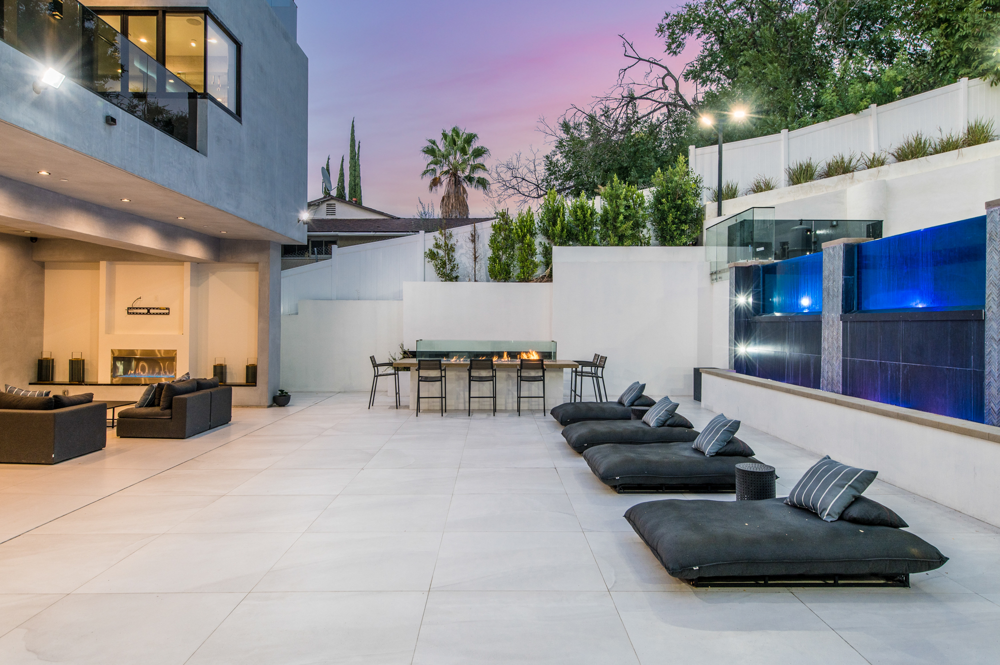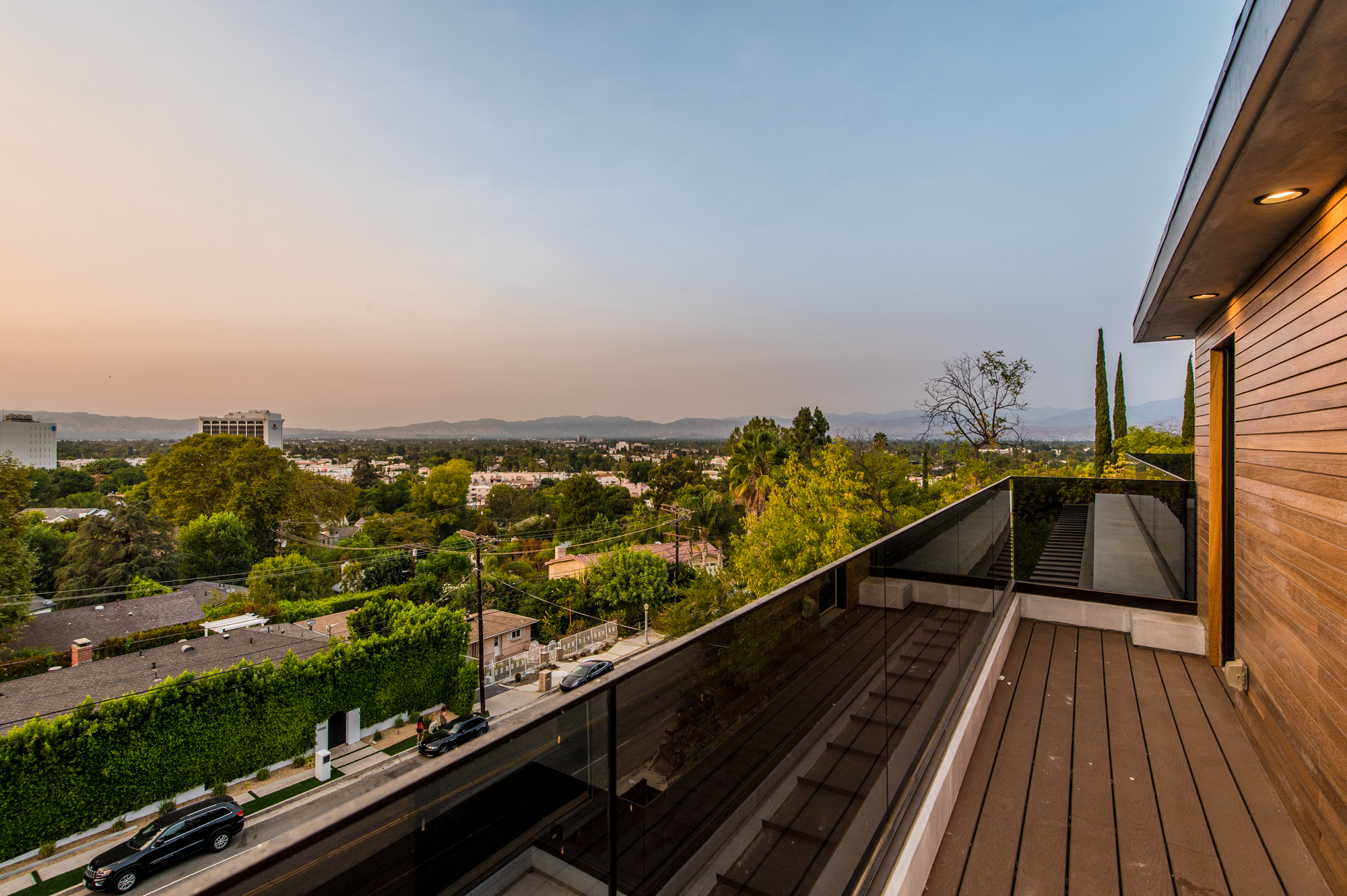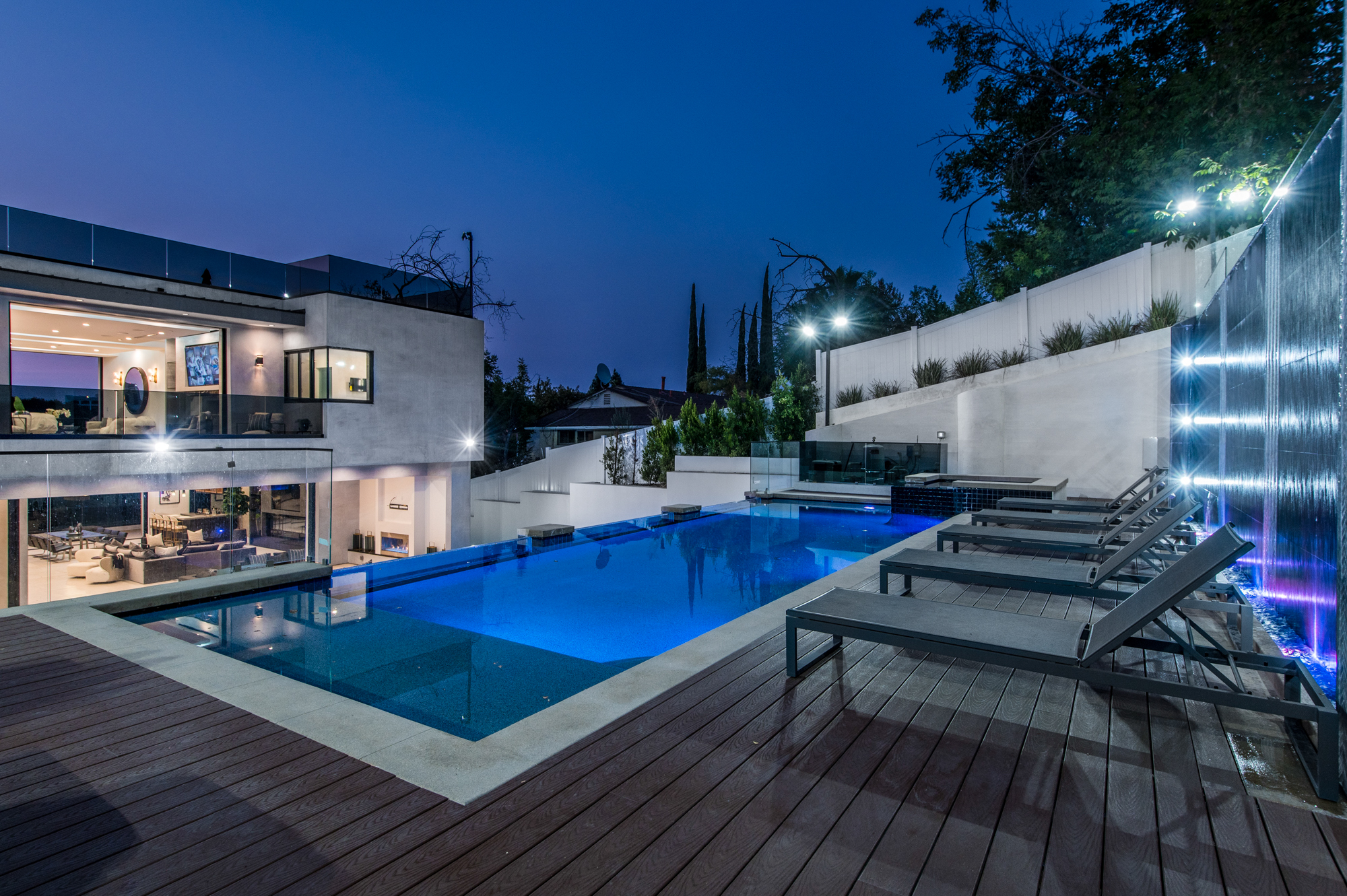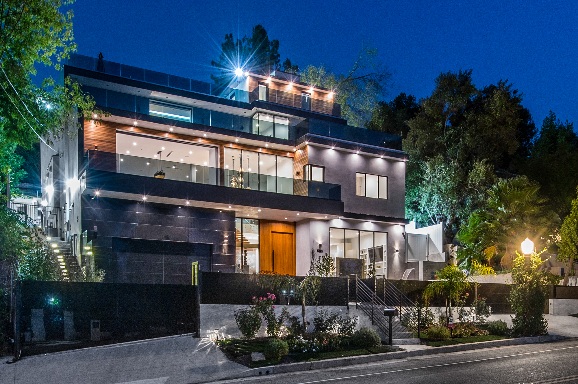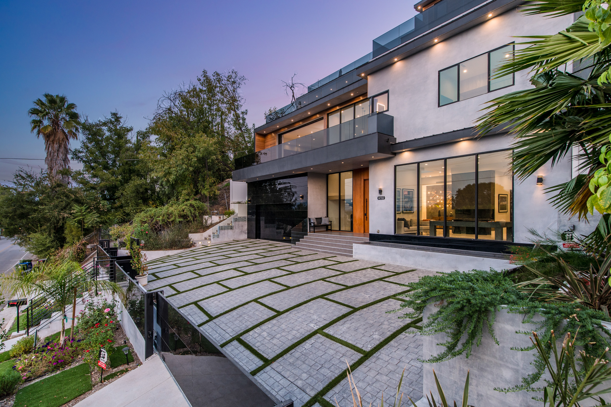 Situated on a prestigious street south of the Blvd, this contemporary modern estate is the newest gem in Sherman Oaks. Flawless at every angle, guests arrive to a multi-level entertainment statement property designed for the most discerning buyer. Inside guests are greeted w/ soaring ceilings & a floating glass staircase that adorns a large main foyer, overlooking the expansive floor plan. Sophisticated formal living room features a large stone linear fireplace, temperature controlled wine cellar, & floor to ceiling pocket sliding doors that open to the entertainer’s dream backyard. Elegant formal dining room offers a bar & opens to a patio w/ expansive views of the valley. Gourmet Chef’s kitchen features quartz counters, large center island w/ breakfast bar, breakfast nook & walk in pantry. Upstairs, the master retreat features a wet bar, fireplace, private balconies, spa-like master bath, & illuminated walk-in closet. Finally, a boasting rooftop deck w/ gym showcases 180 degree jetliner views of the valley. A second kitchen, media room & 4 additional guest suites complete this estate. Backyard sanctuary provides multi level seating areas, elevated sparkling pool & spa w/ transparent glass & cascading waterfalls, covered patio w/ fireplace, outdoor kitchen & elevated fire-pit bar. Additional amenities include Control4 smart system, security cameras, surround sound & elevator. Live a luxurious lifestyle that is within close proximity to shops, fine dining & more.