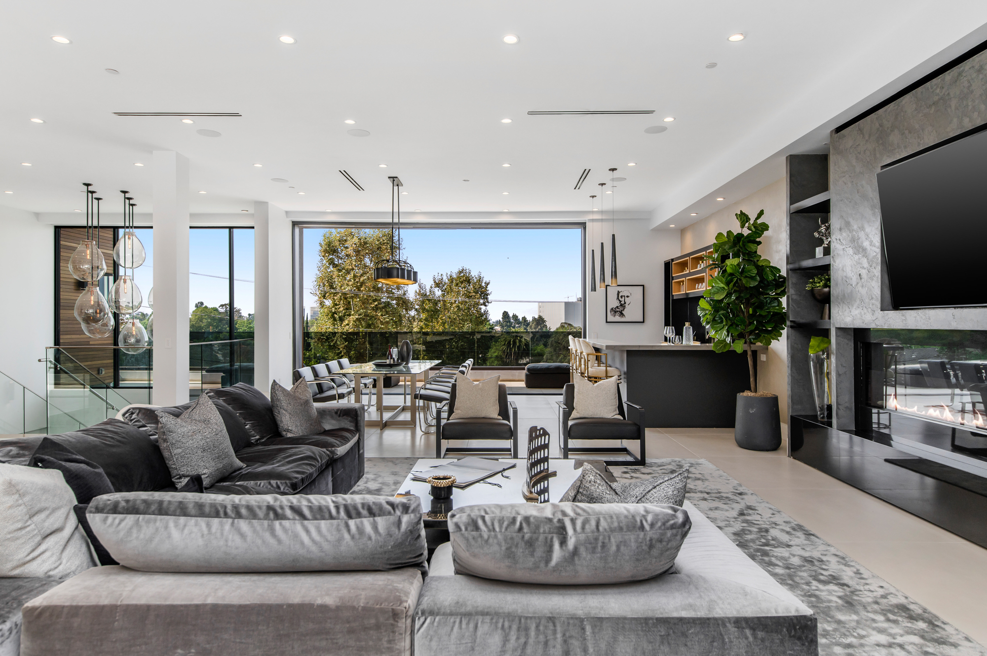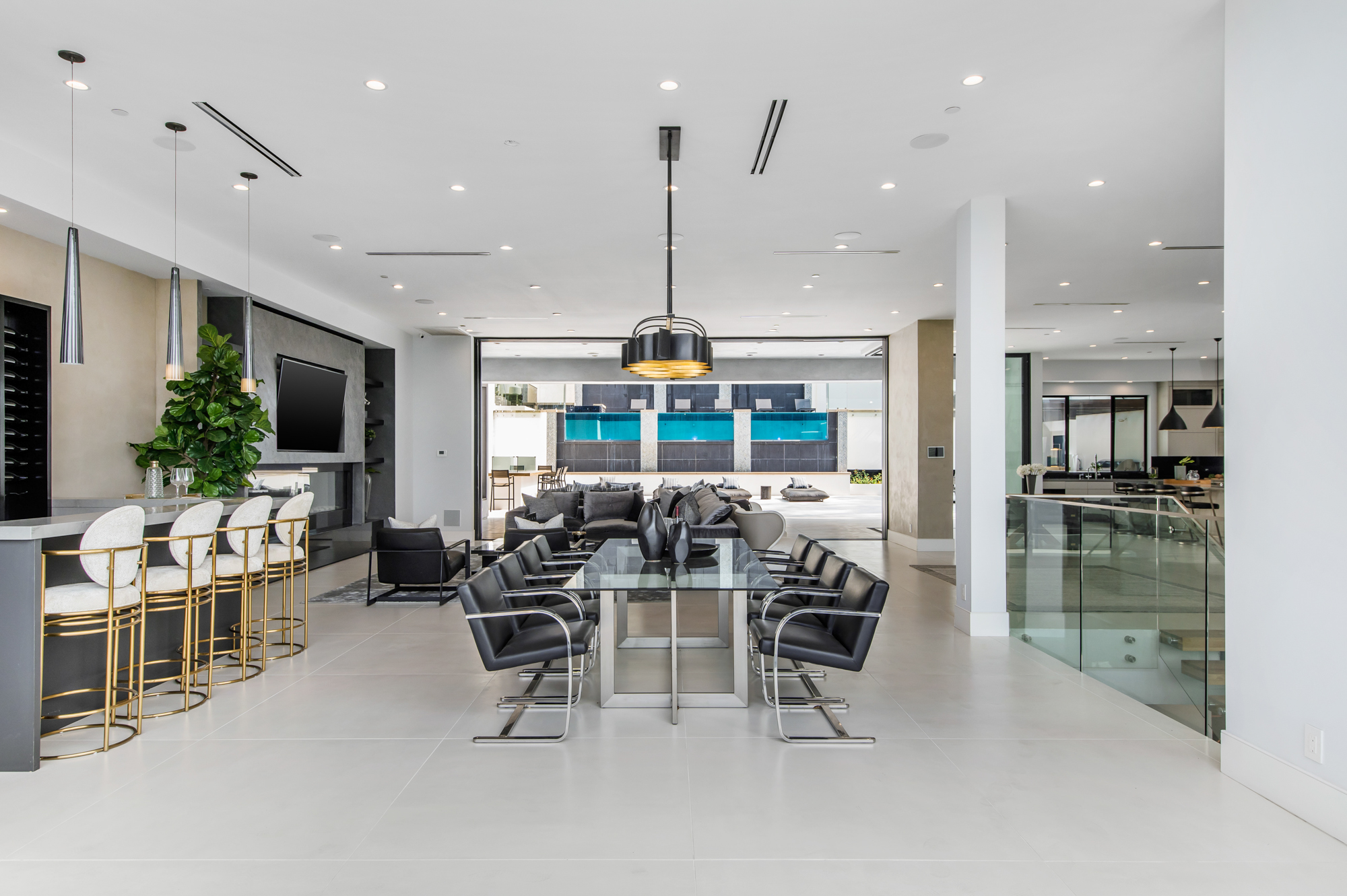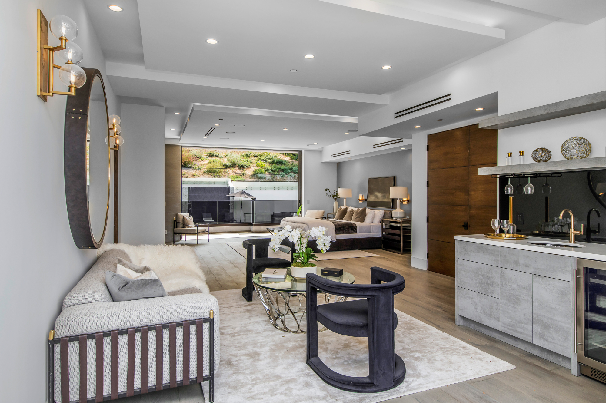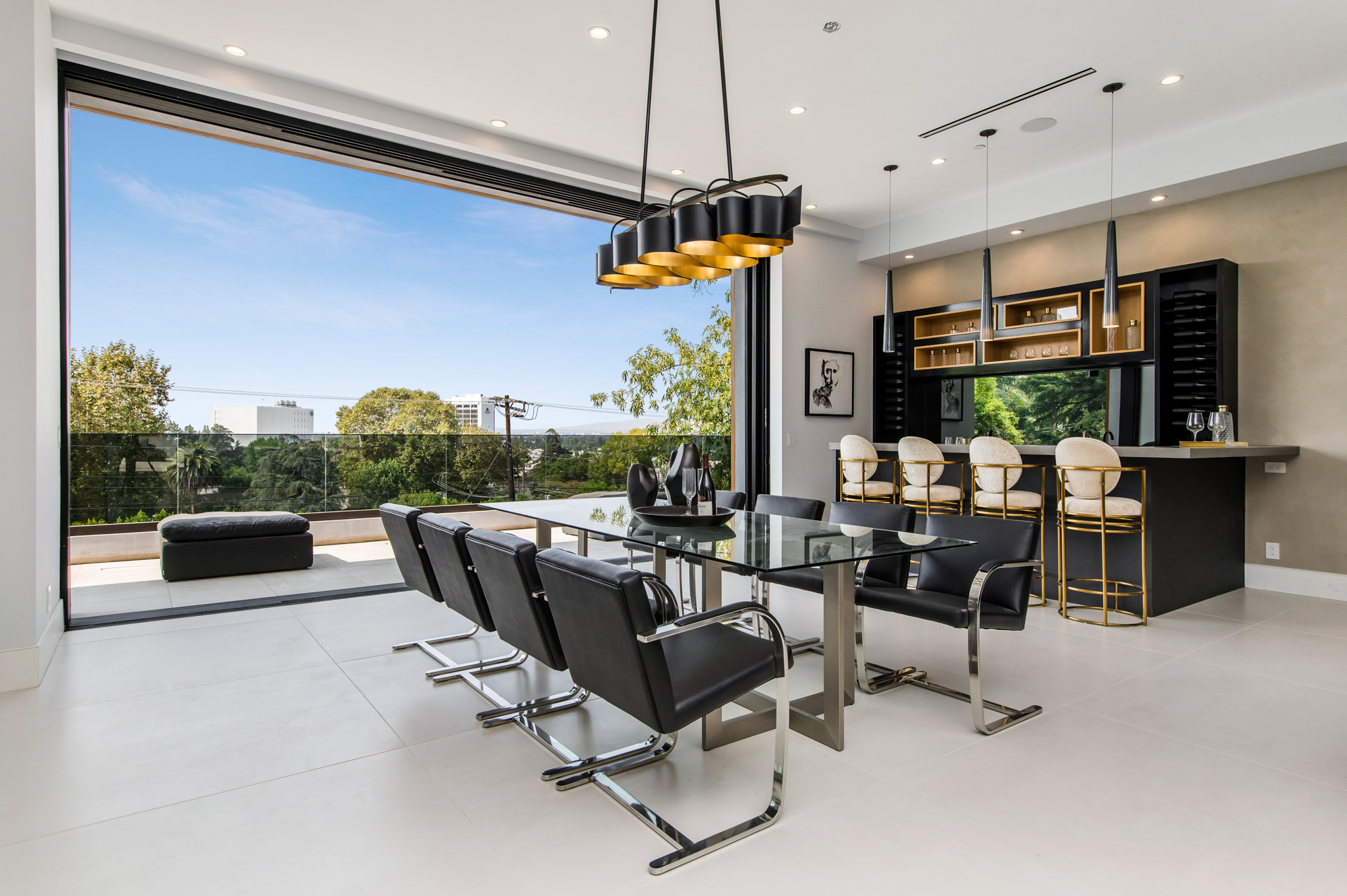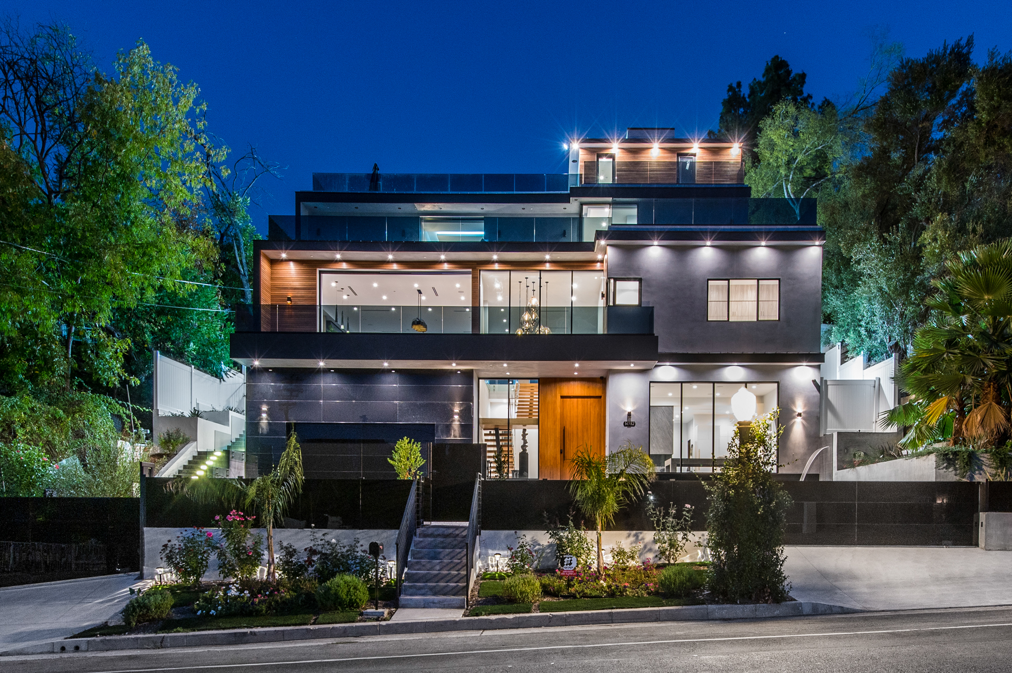 Situated on a prestigious street south of the Blvd, this contemporary modern estate is the newest gem in Sherman Oaks. Flawless at every angle, guests arrive to a multi-level entertainment statement property designed for the most discerning buyer. Inside guests are greeted w/ soaring ceilings & a floating glass staircase that adorns a large main foyer, overlooking the expansive floor plan. Sophisticated formal living room features a large stone linear fireplace, temperature controlled wine cellar, & floor to ceiling pocket sliding doors that open to the entertainer’s dream backyard. Elegant formal dining room offers a bar & opens to a patio w/ expansive views of the valley. Gourmet Chef’s kitchen features quartz counters, large center island w/ breakfast bar, breakfast nook & walk in pantry. Upstairs, the master retreat features a wet bar, fireplace, private balconies, spa-like master bath, & illuminated walk-in closet. Finally, a boasting rooftop deck w/ gym showcases 180 degree jetliner views of the valley. A second kitchen, media room & 4 additional guest suites complete this estate. Backyard sanctuary provides multi level seating areas, elevated sparkling pool & spa w/ transparent glass & cascading waterfalls, covered patio w/ fireplace, outdoor kitchen & elevated fire-pit bar. Additional amenities include Control4 smart system, security cameras, surround sound & elevator. Live a luxurious lifestyle that is within close proximity to shops, fine dining & more.