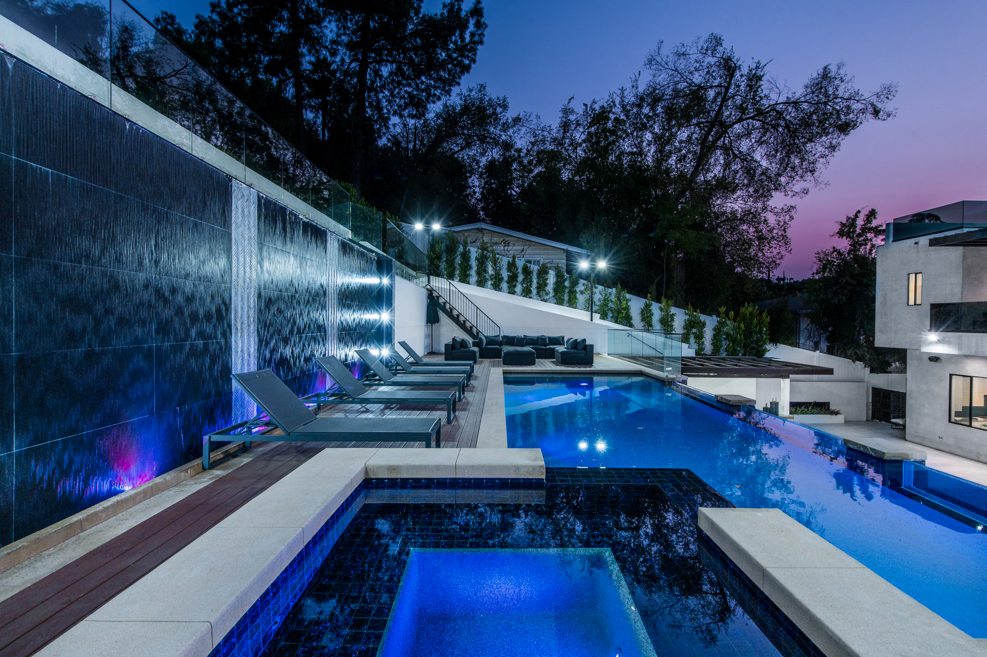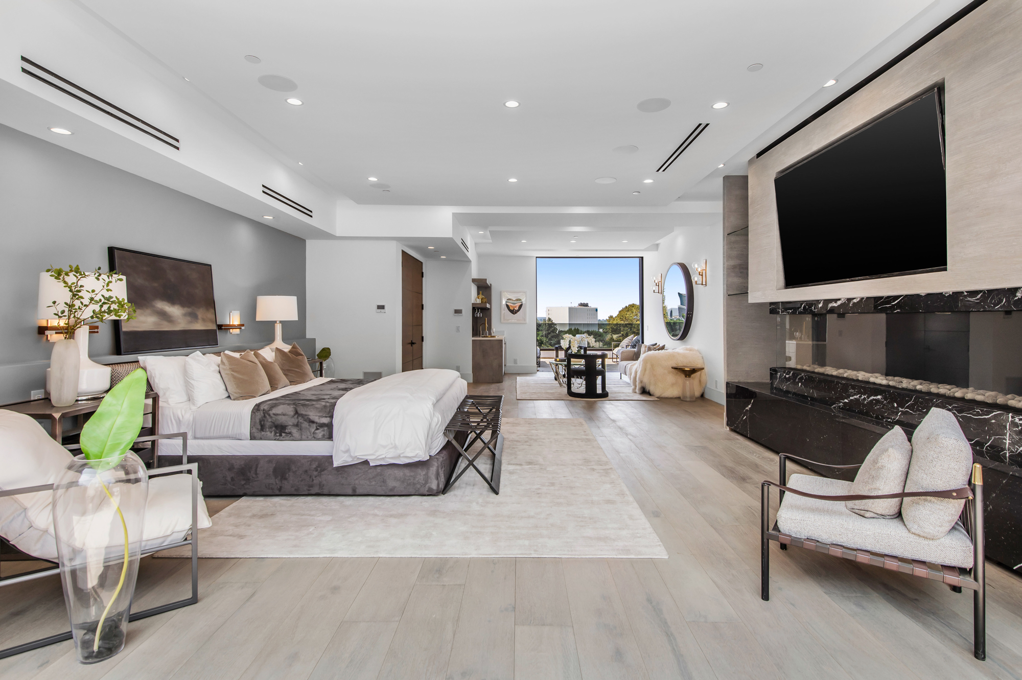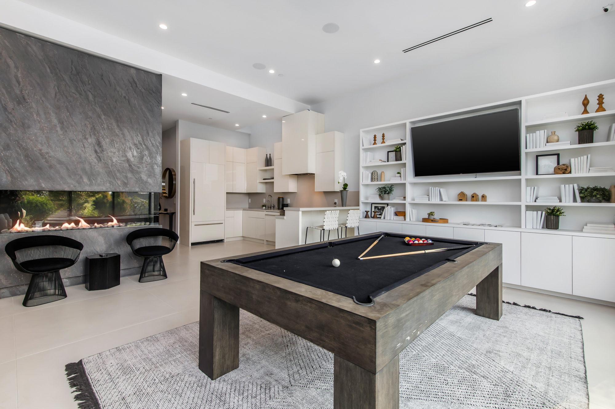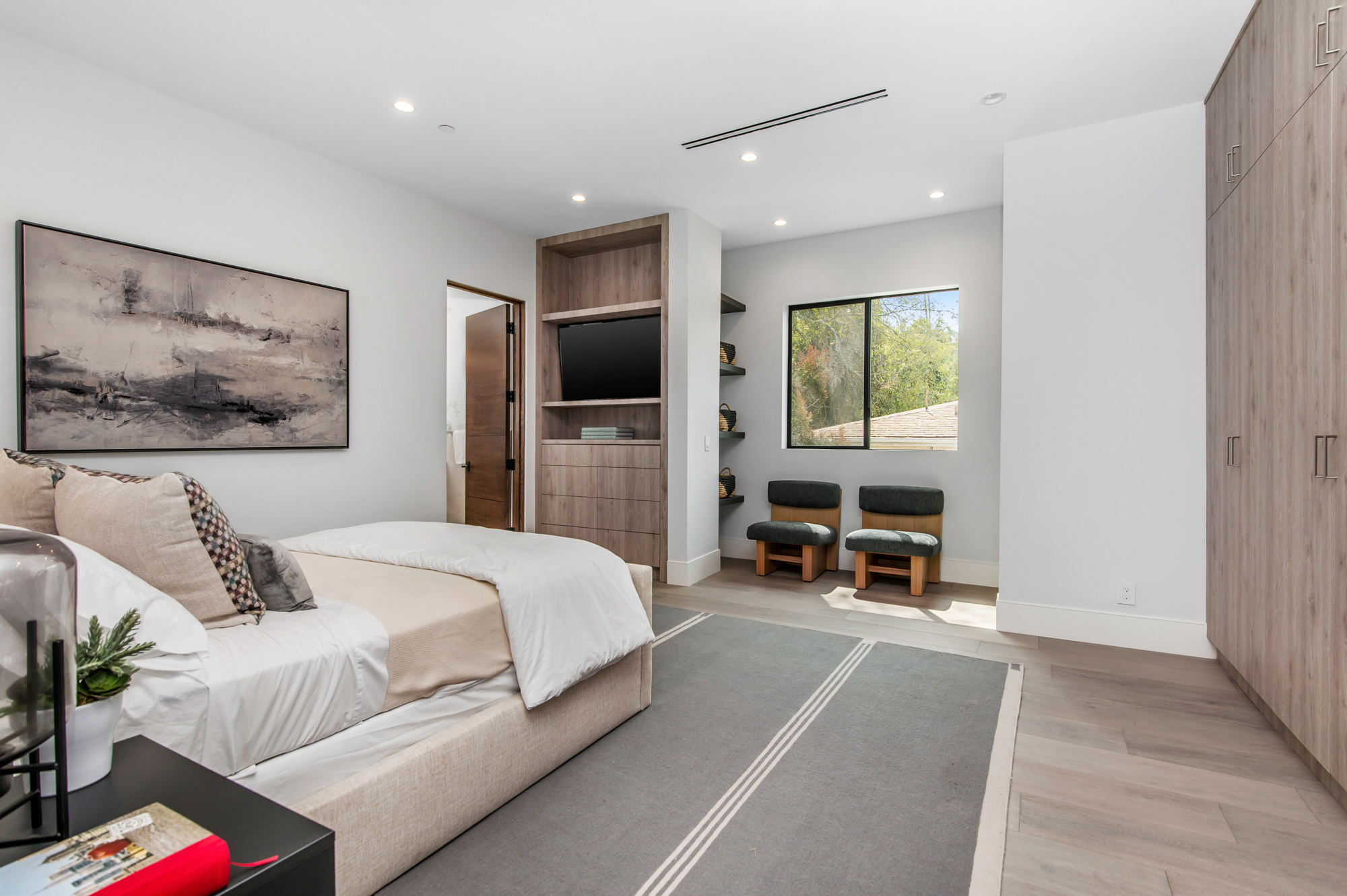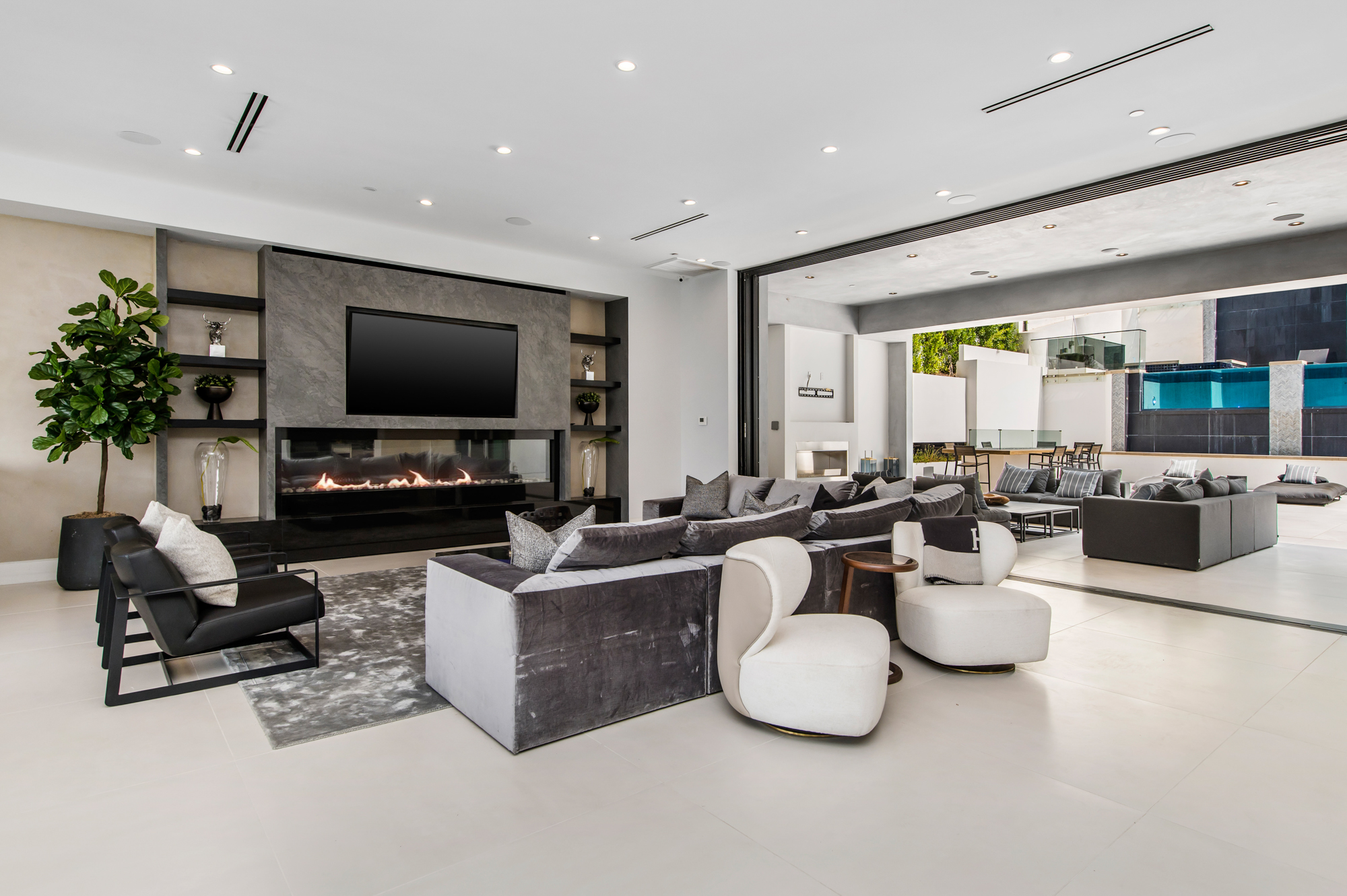 Situated on a prestigious street south of the Blvd, this contemporary modern estate is the newest gem in Sherman Oaks. Flawless at every angle, guests arrive to a multi-level entertainment statement property designed for the most discerning buyer. Inside guests are greeted w/ soaring ceilings & a floating glass staircase that adorns a large main foyer, overlooking the expansive floor plan. Sophisticated formal living room features a large stone linear fireplace, temperature controlled wine cellar, & floor to ceiling pocket sliding doors that open to the entertainer’s dream backyard. Elegant formal dining room offers a bar & opens to a patio w/ expansive views of the valley. Gourmet Chef’s kitchen features quartz counters, large center island w/ breakfast bar, breakfast nook & walk in pantry. Upstairs, the master retreat features a wet bar, fireplace, private balconies, spa-like master bath, & illuminated walk-in closet. Finally, a boasting rooftop deck w/ gym showcases 180 degree jetliner views of the valley. A second kitchen, media room & 4 additional guest suites complete this estate. Backyard sanctuary provides multi level seating areas, elevated sparkling pool & spa w/ transparent glass & cascading waterfalls, covered patio w/ fireplace, outdoor kitchen & elevated fire-pit bar. Additional amenities include Control4 smart system, security cameras, surround sound & elevator. Live a luxurious lifestyle that is within close proximity to shops, fine dining & more.