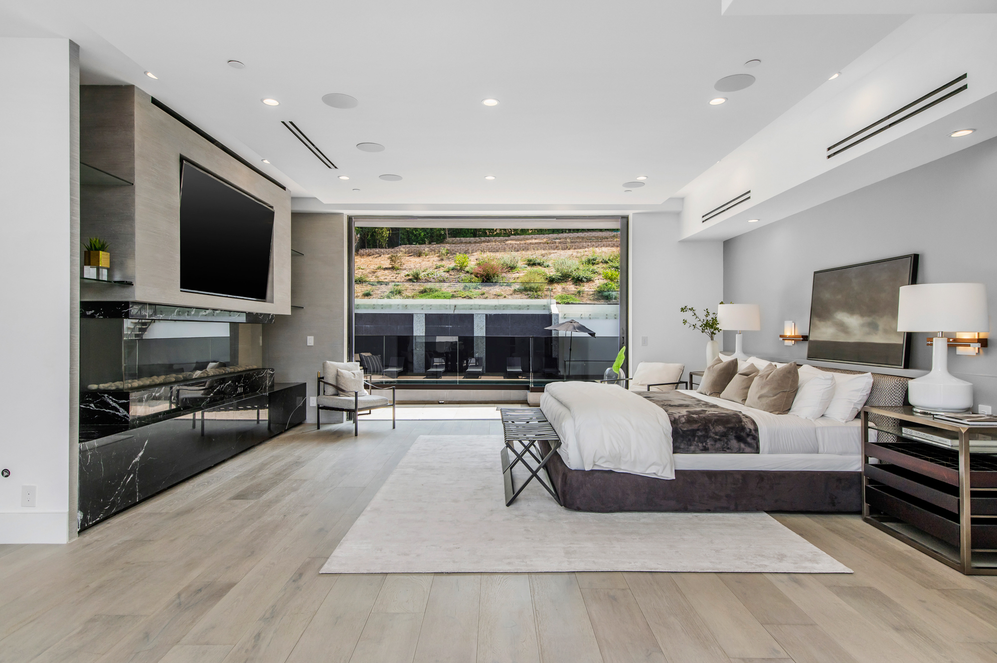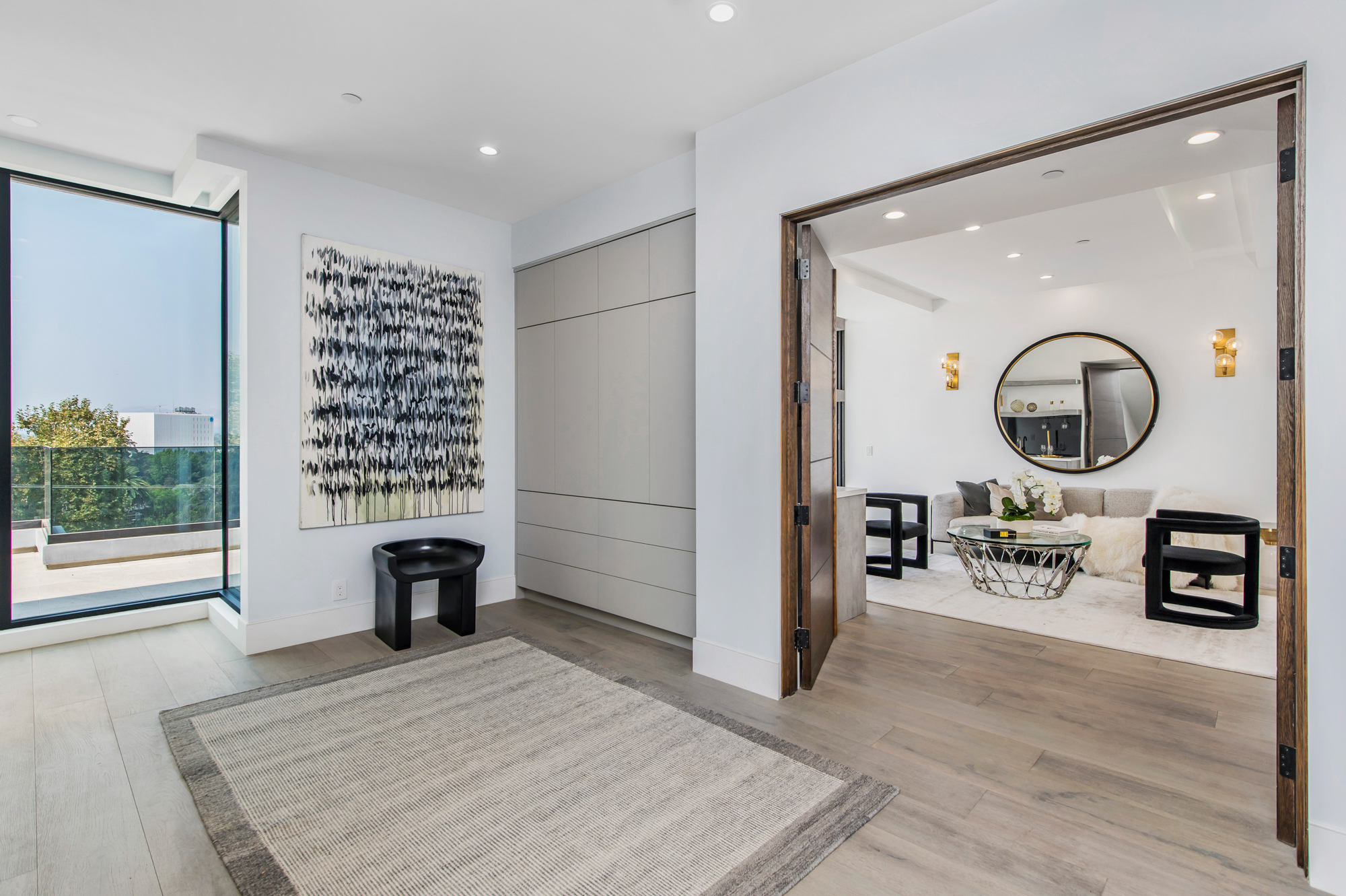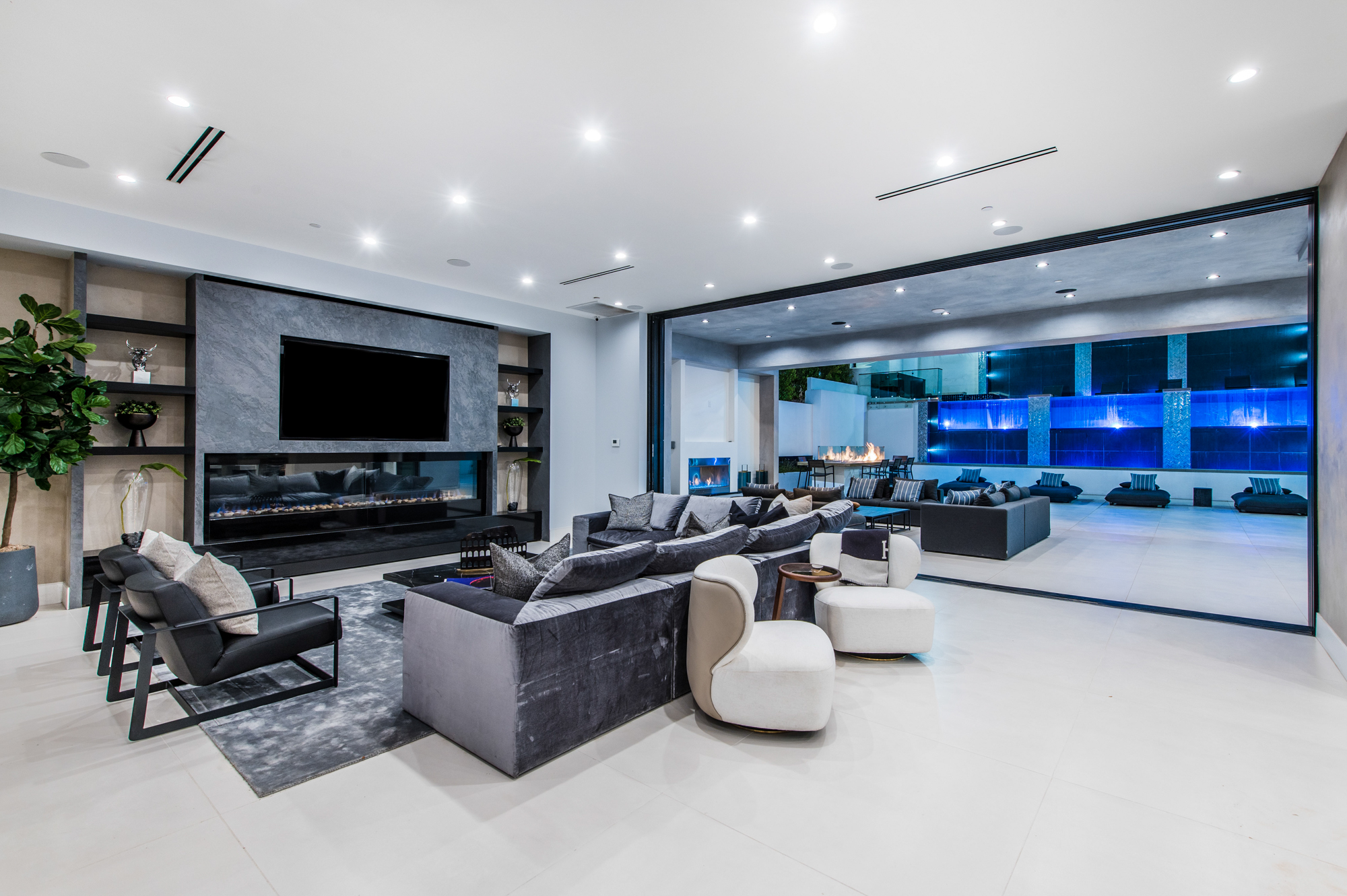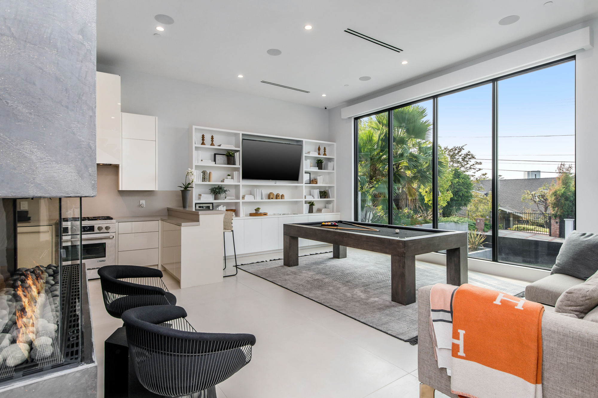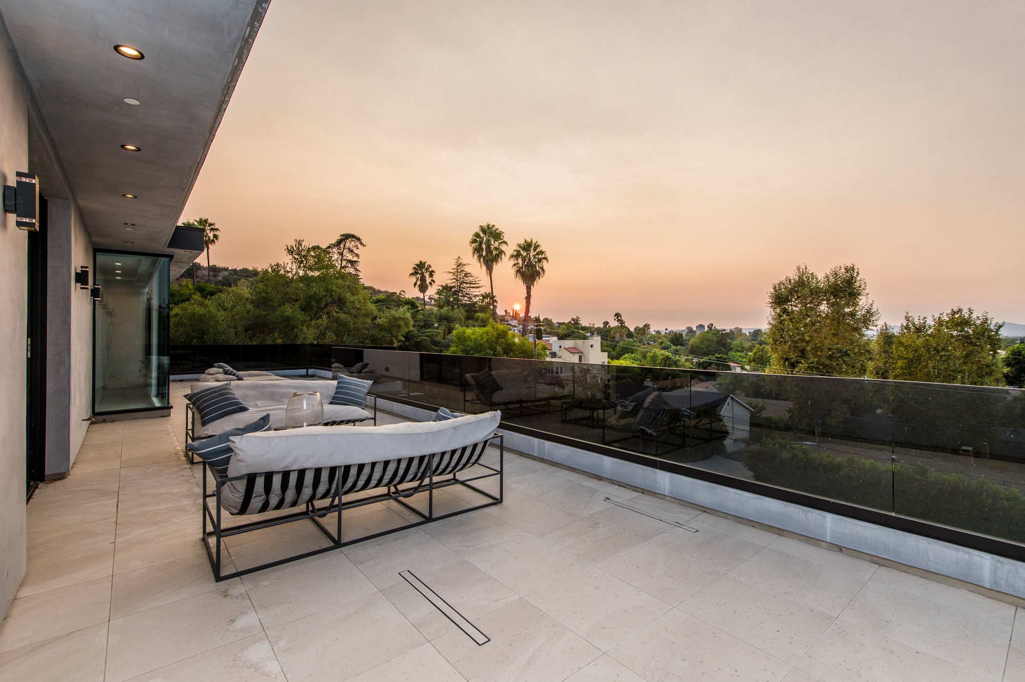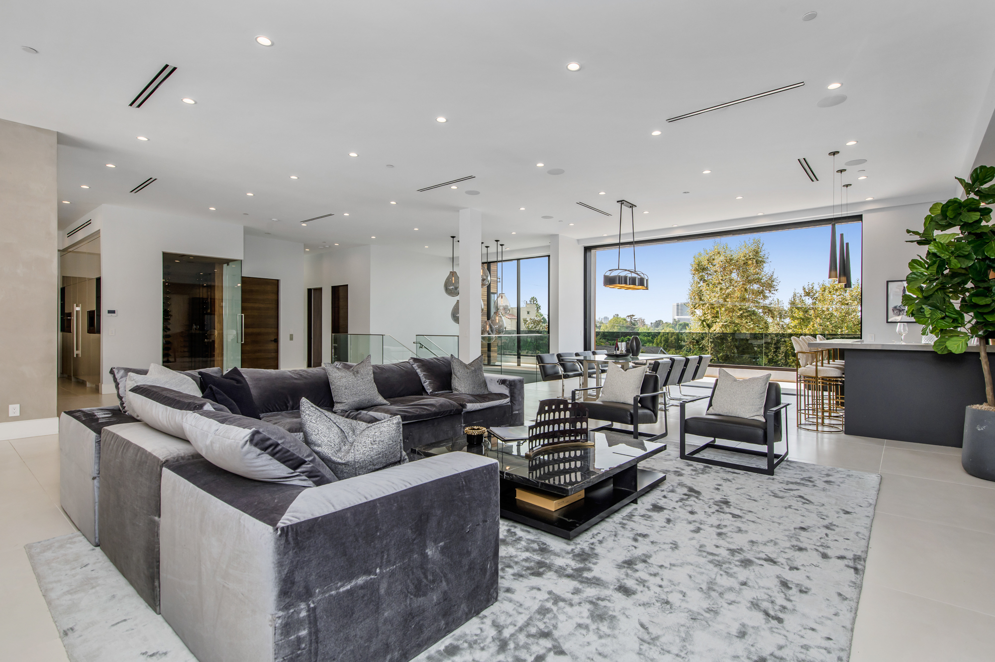 Situated on a prestigious street south of the Blvd, this contemporary modern estate is the newest gem in Sherman Oaks. Flawless at every angle, guests arrive to a multi-level entertainment statement property designed for the most discerning buyer. Inside guests are greeted w/ soaring ceilings & a floating glass staircase that adorns a large main foyer, overlooking the expansive floor plan. Sophisticated formal living room features a large stone linear fireplace, temperature controlled wine cellar, & floor to ceiling pocket sliding doors that open to the entertainer’s dream backyard. Elegant formal dining room offers a bar & opens to a patio w/ expansive views of the valley. Gourmet Chef’s kitchen features quartz counters, large center island w/ breakfast bar, breakfast nook & walk in pantry. Upstairs, the master retreat features a wet bar, fireplace, private balconies, spa-like master bath, & illuminated walk-in closet. Finally, a boasting rooftop deck w/ gym showcases 180 degree jetliner views of the valley. A second kitchen, media room & 4 additional guest suites complete this estate. Backyard sanctuary provides multi level seating areas, elevated sparkling pool & spa w/ transparent glass & cascading waterfalls, covered patio w/ fireplace, outdoor kitchen & elevated fire-pit bar. Additional amenities include Control4 smart system, security cameras, surround sound & elevator. Live a luxurious lifestyle that is within close proximity to shops, fine dining & more.