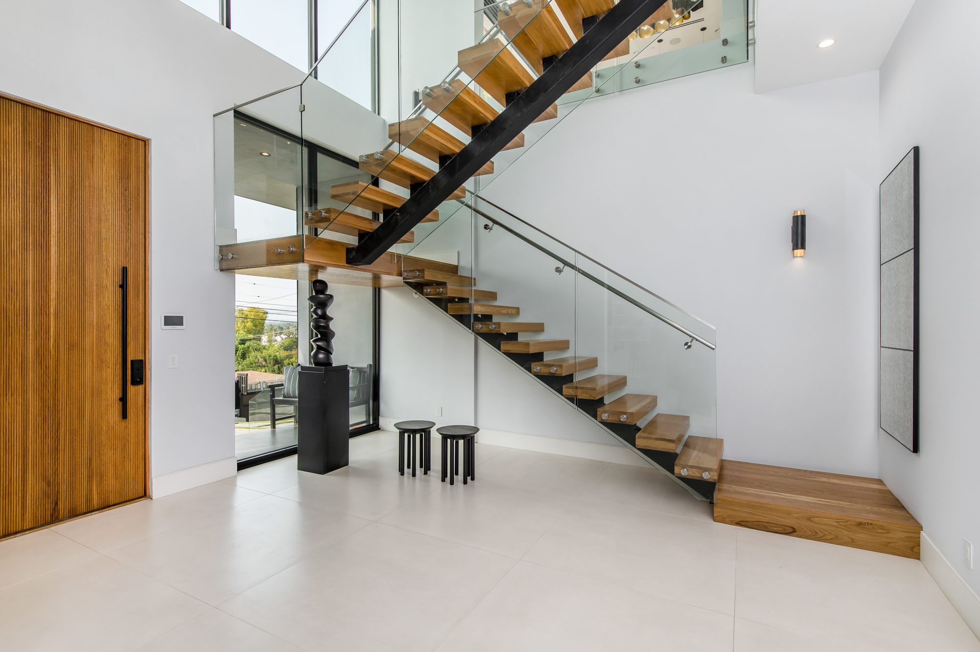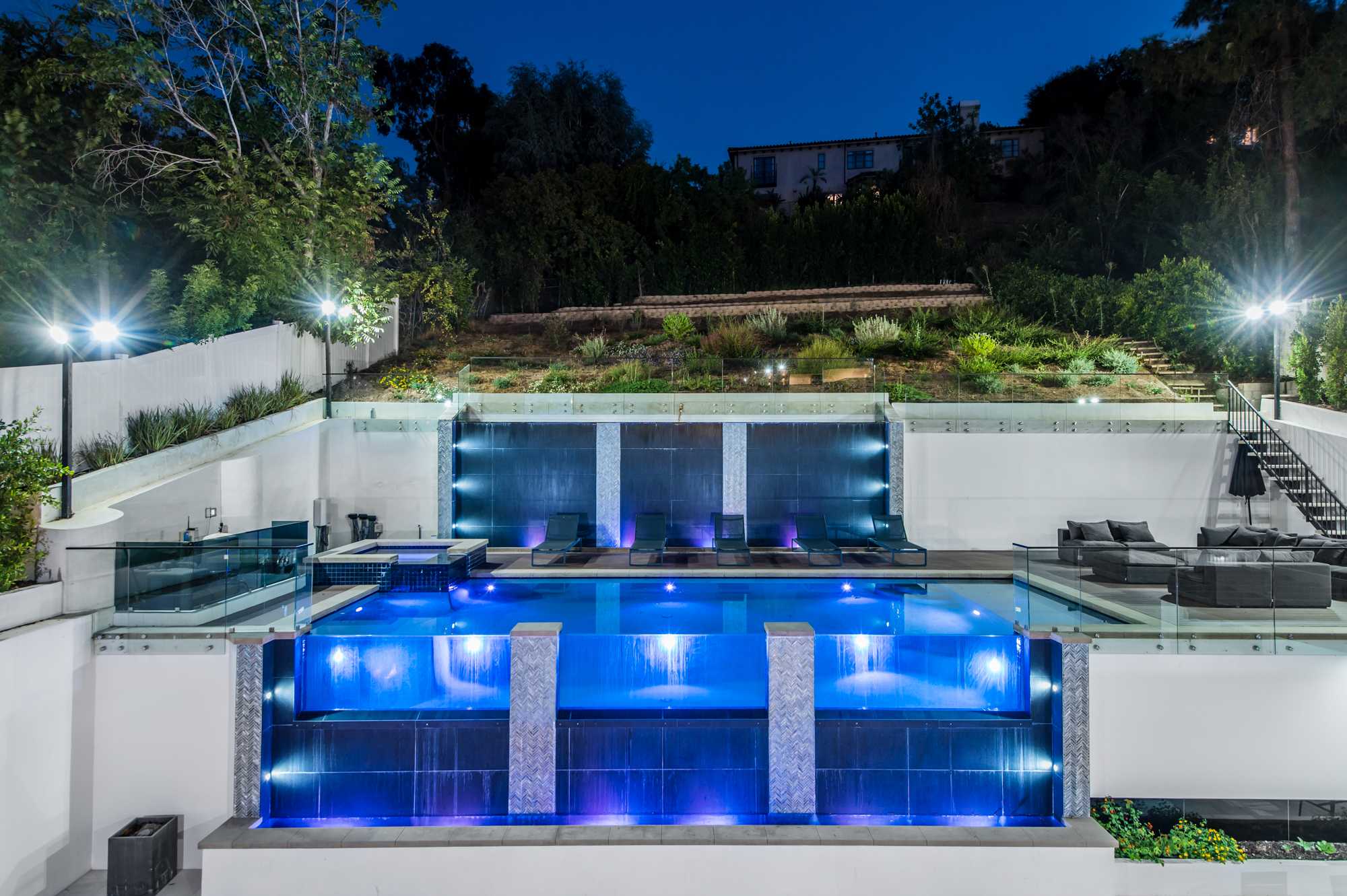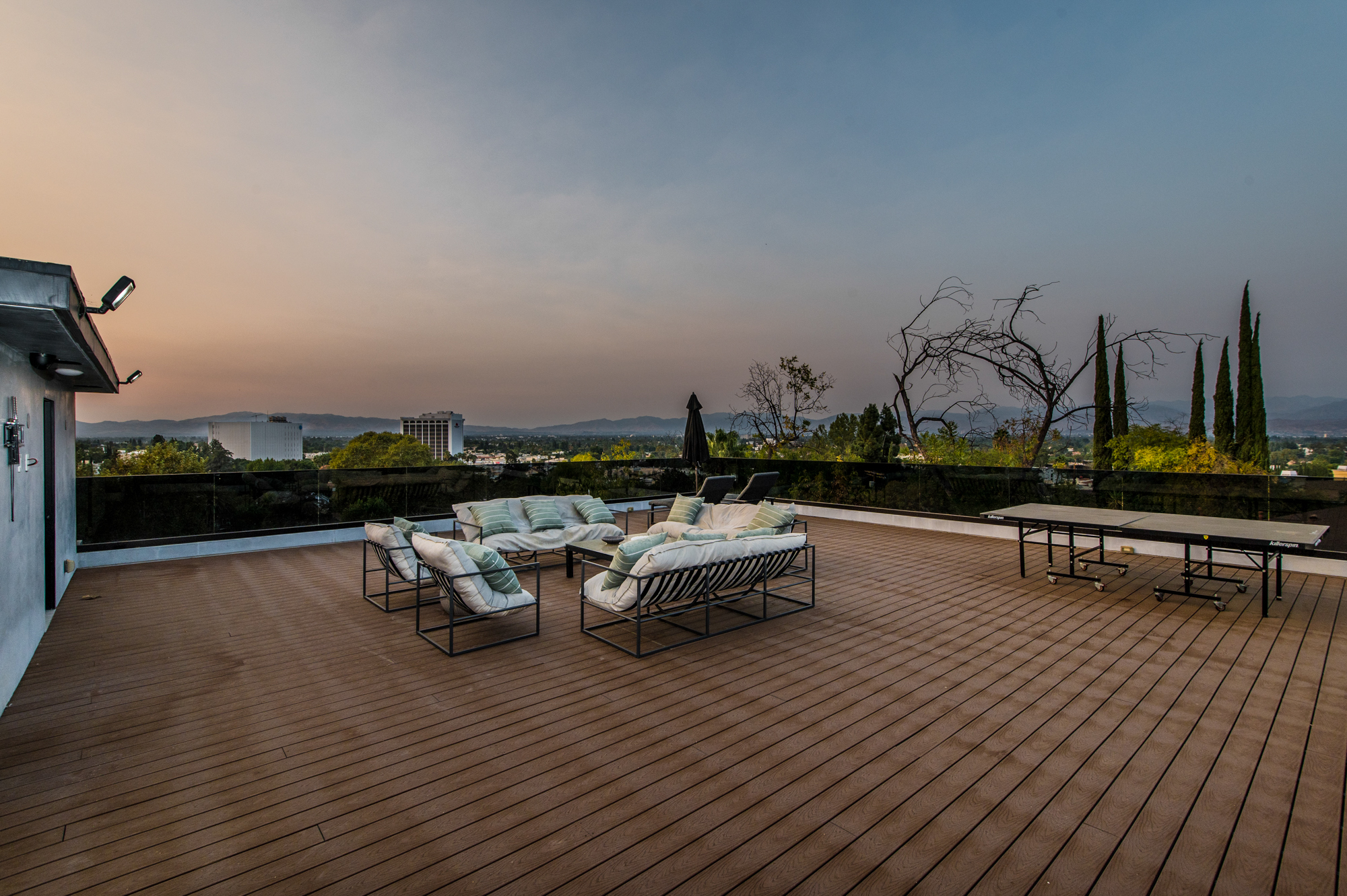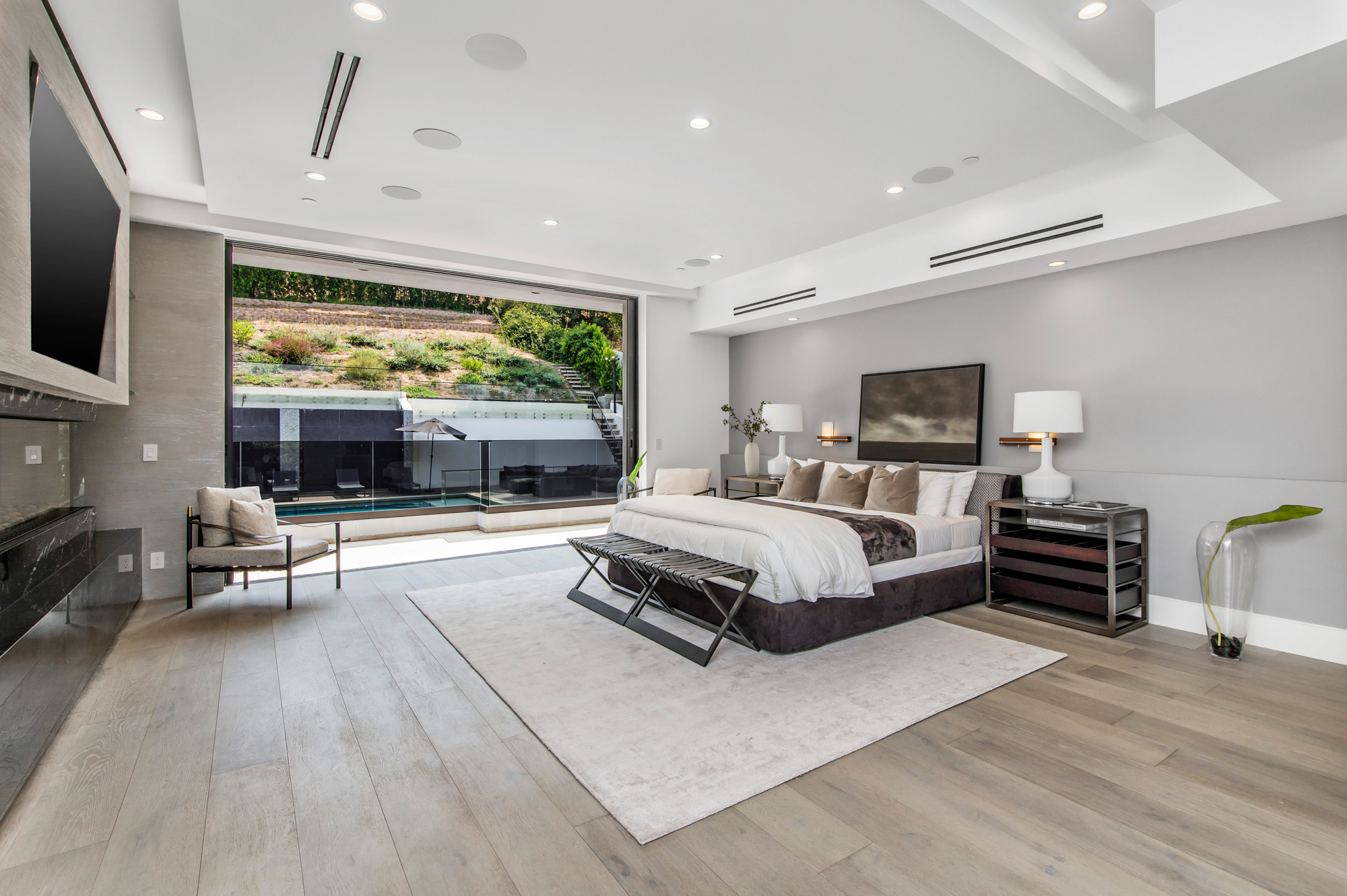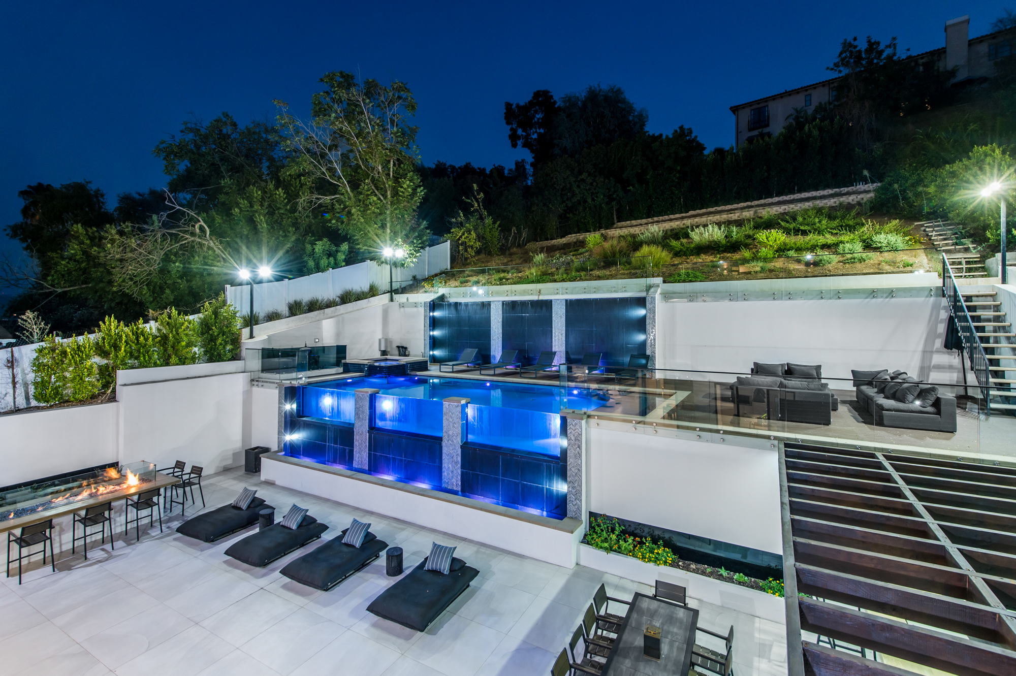 Situated on a prestigious street south of the Blvd, this contemporary modern estate is the newest gem in Sherman Oaks. Flawless at every angle, guests arrive to a multi-level entertainment statement property designed for the most discerning buyer. Inside guests are greeted w/ soaring ceilings & a floating glass staircase that adorns a large main foyer, overlooking the expansive floor plan. Sophisticated formal living room features a large stone linear fireplace, temperature controlled wine cellar, & floor to ceiling pocket sliding doors that open to the entertainer’s dream backyard. Elegant formal dining room offers a bar & opens to a patio w/ expansive views of the valley. Gourmet Chef’s kitchen features quartz counters, large center island w/ breakfast bar, breakfast nook & walk in pantry. Upstairs, the master retreat features a wet bar, fireplace, private balconies, spa-like master bath, & illuminated walk-in closet. Finally, a boasting rooftop deck w/ gym showcases 180 degree jetliner views of the valley. A second kitchen, media room & 4 additional guest suites complete this estate. Backyard sanctuary provides multi level seating areas, elevated sparkling pool & spa w/ transparent glass & cascading waterfalls, covered patio w/ fireplace, outdoor kitchen & elevated fire-pit bar. Additional amenities include Control4 smart system, security cameras, surround sound & elevator. Live a luxurious lifestyle that is within close proximity to shops, fine dining & more.
