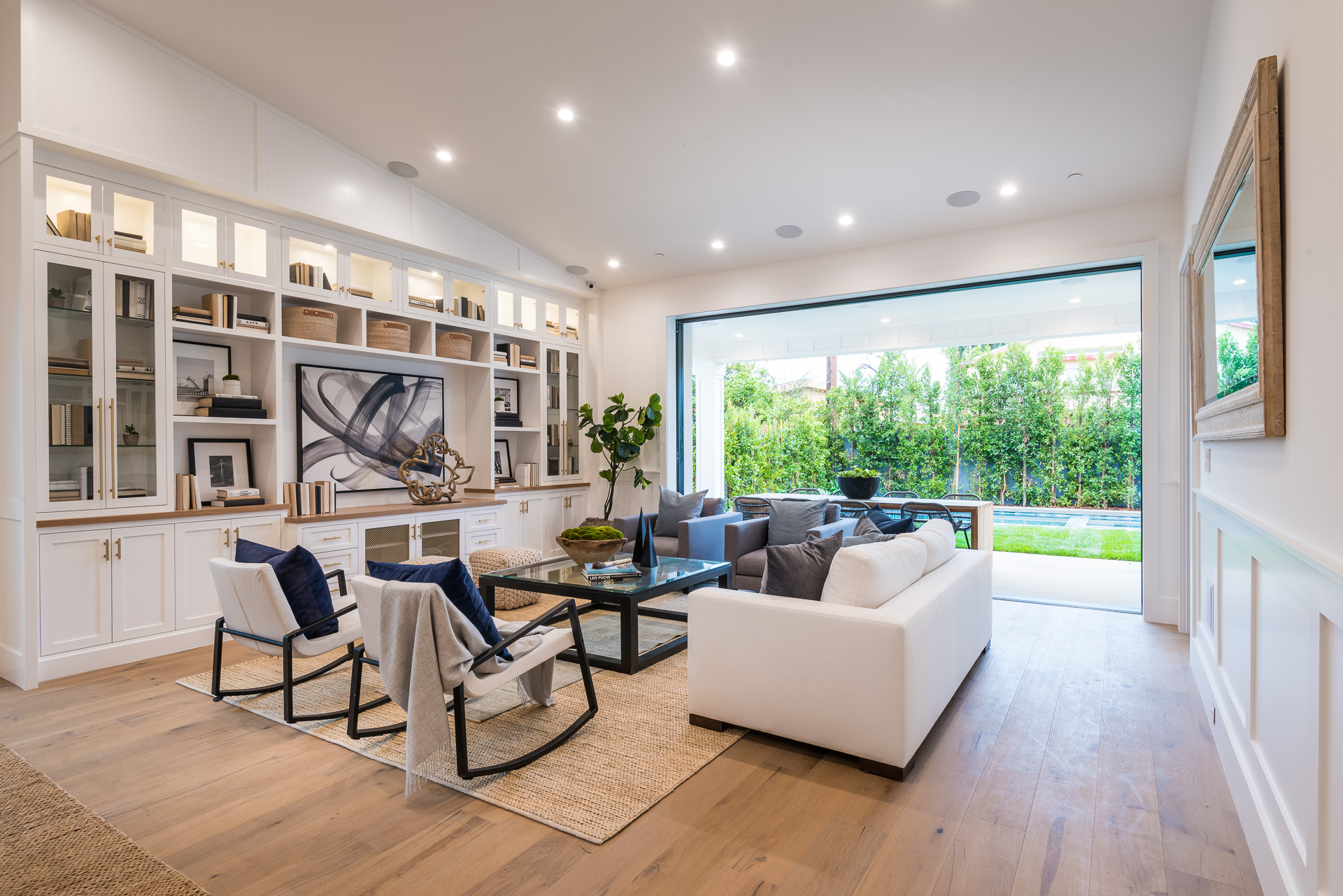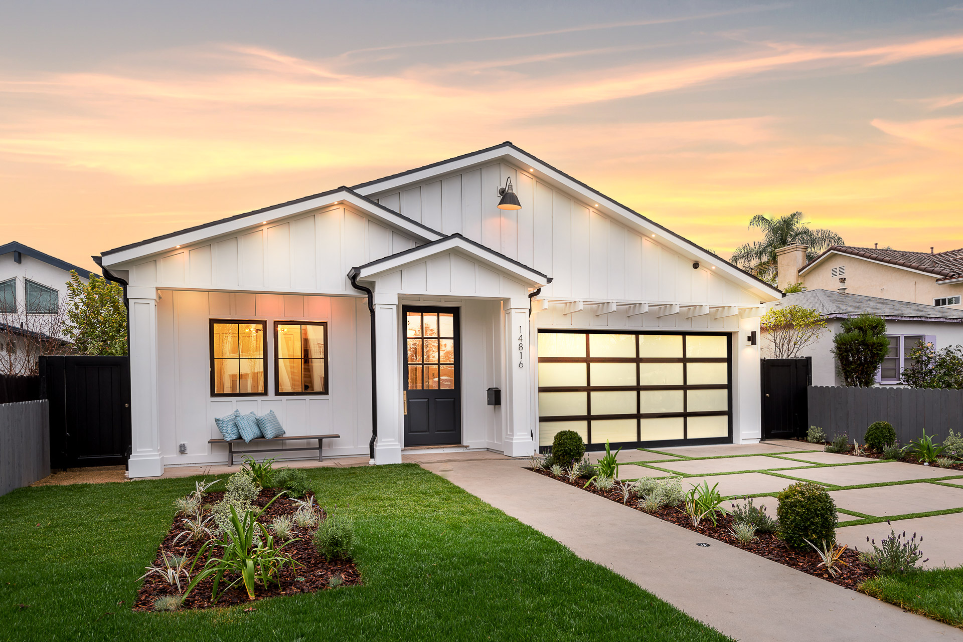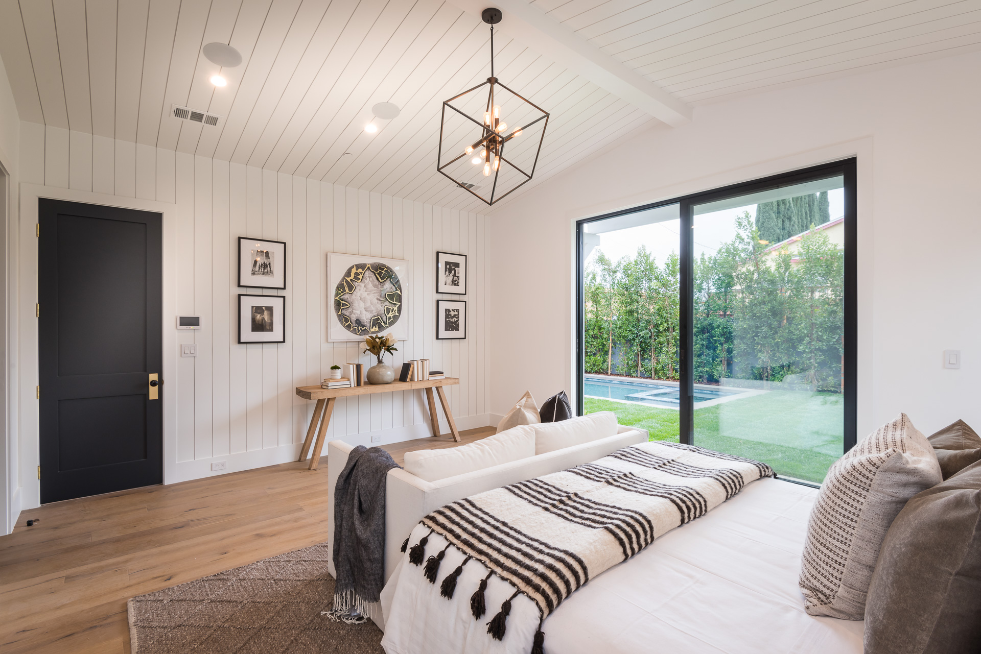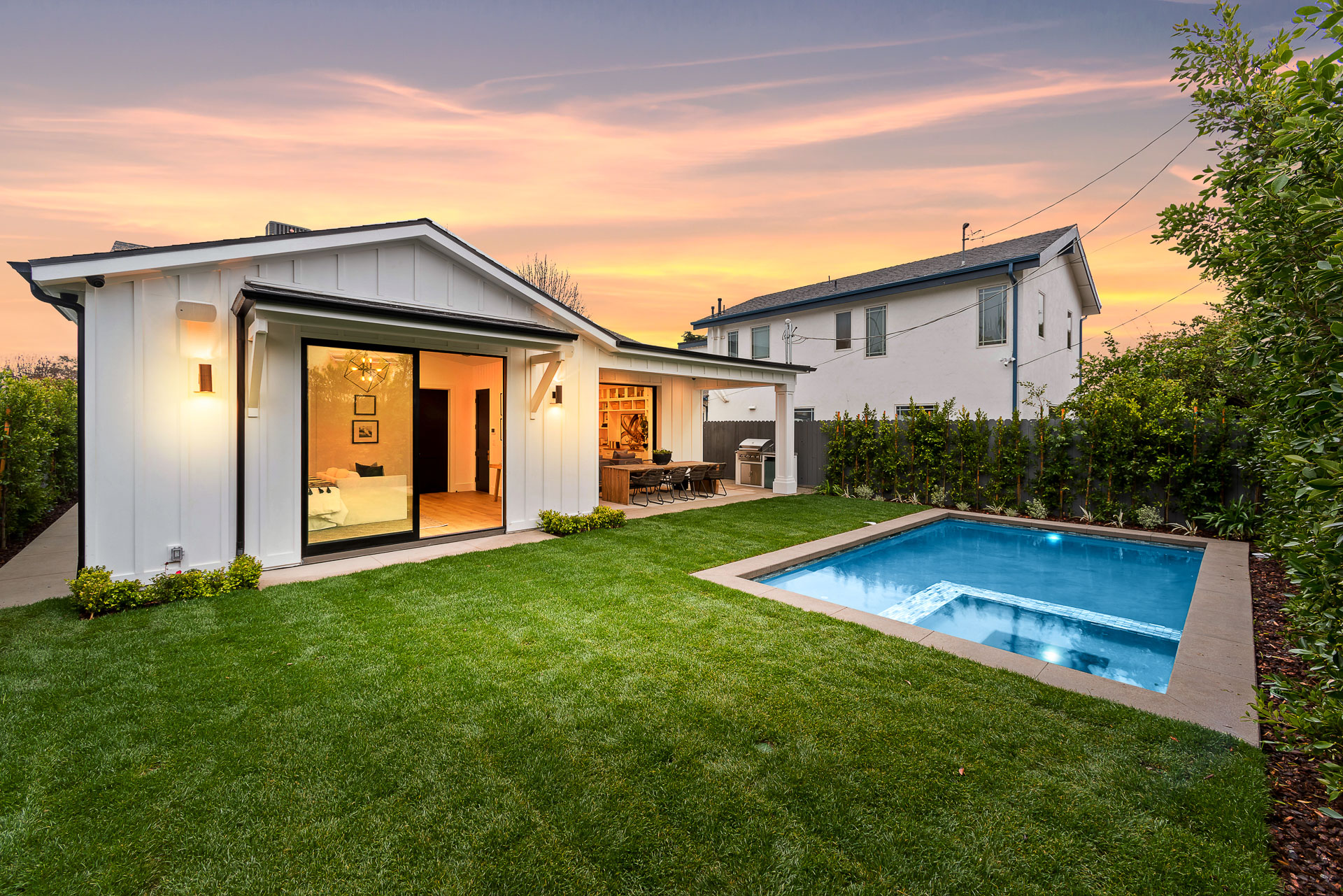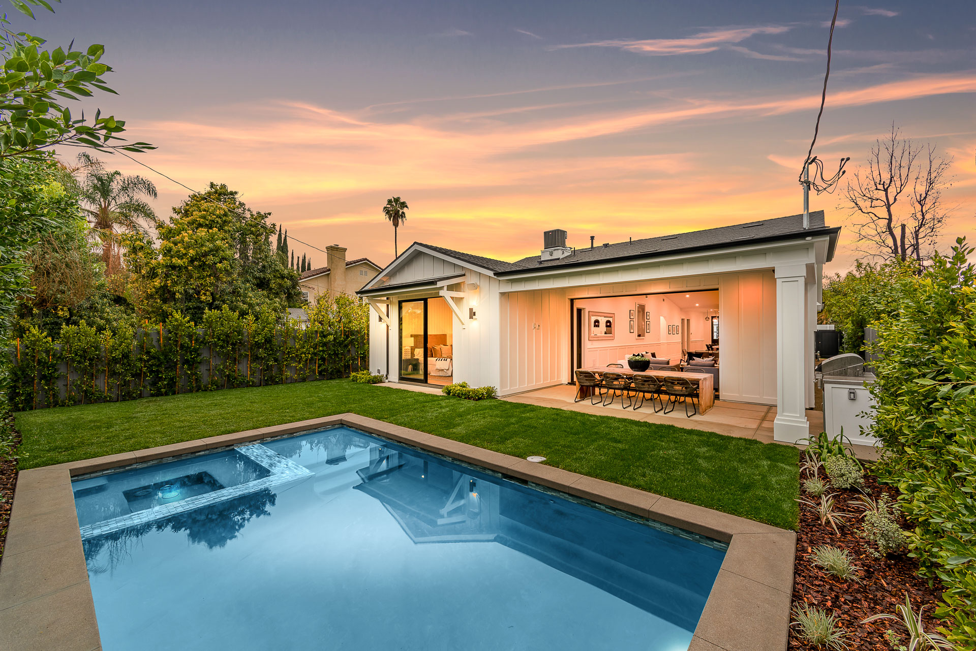 This captivating one-story new construction is any buyers dream home. The grand entrance sets the tone of the rest of the home, with soaring ceilings, an inviting open concept floor plan that leads you to your gourmet chef’s kitchen with high-end appliances and an oversized marble island. The family room is equipped with custom built-ins and floor to ceiling sliding glass doors, opening up to the beautiful backyard with lush landscaping, pool+spa, & BBQ zone. All four bedrooms are en-suite with unique tile work giving each bathroom its own flare. The master has a spa-like bathroom with dual vanities, soaking tub, and oversized shower. Large sliding glass doors in the master offer tranquil views of the backyard. Other amenities include Control-4 smart home, attached two car garage, separate laundry room with utility sink, and luxury finishes throughout. This is a truly remarkable one-story home in the heart of Sherman Oaks!