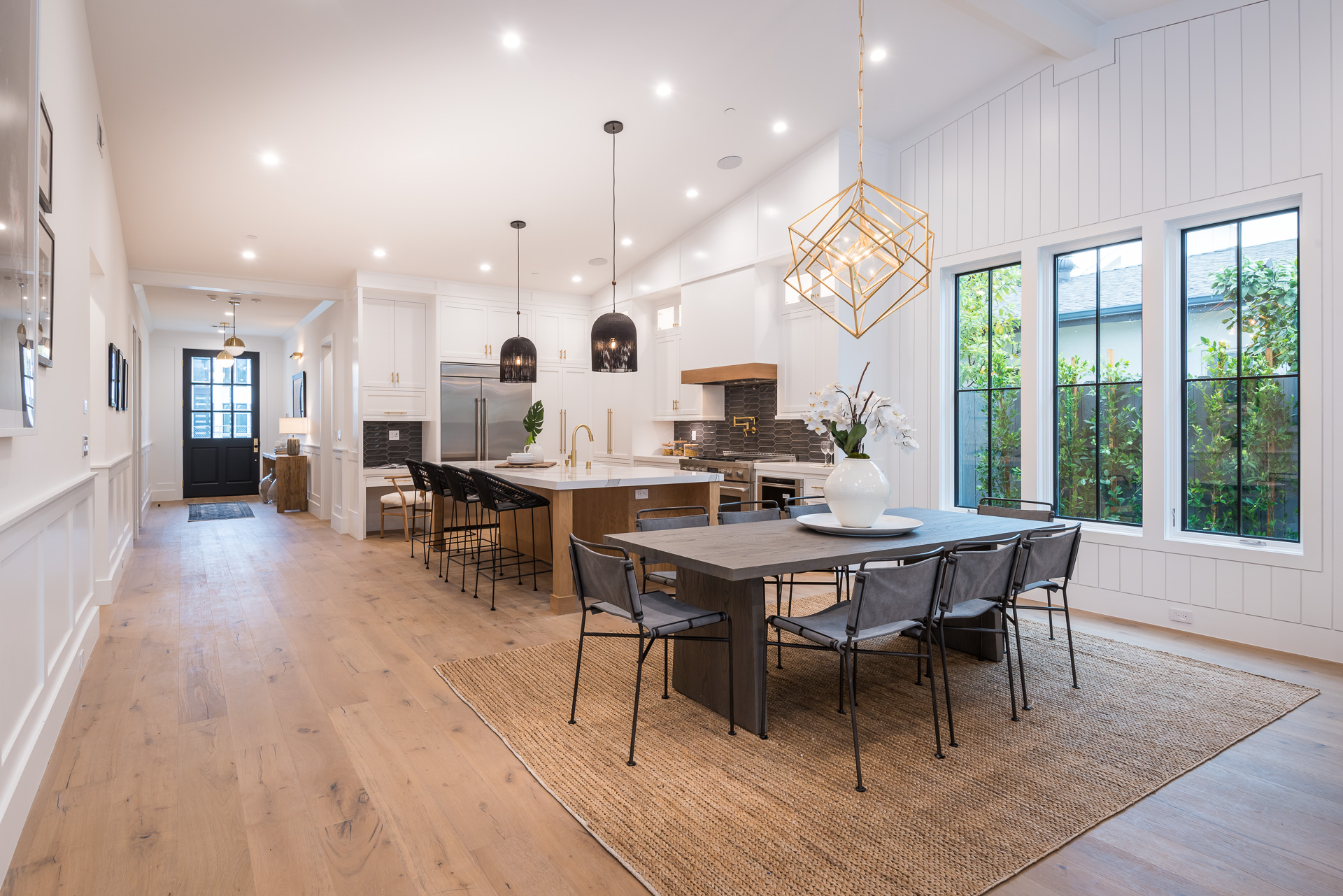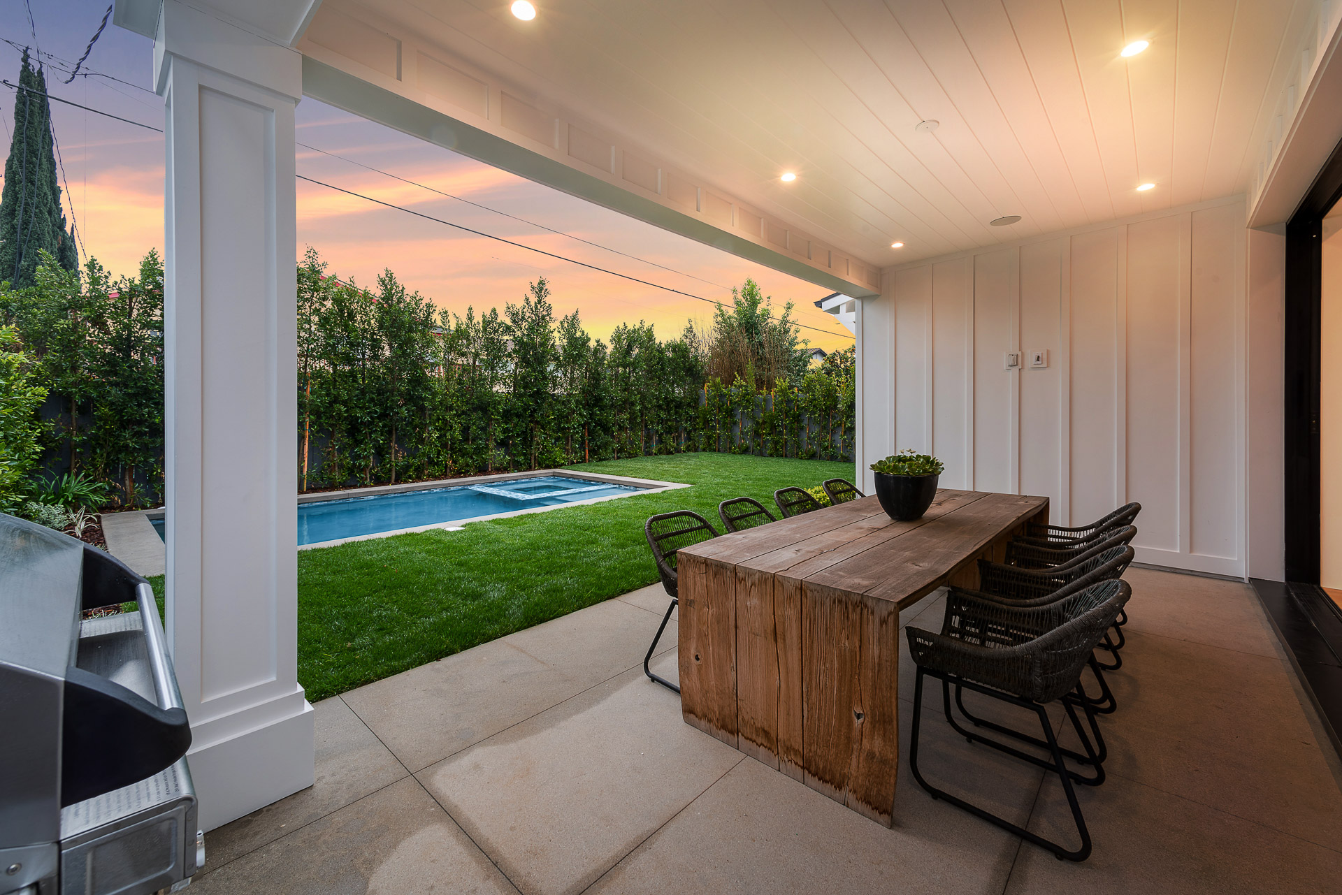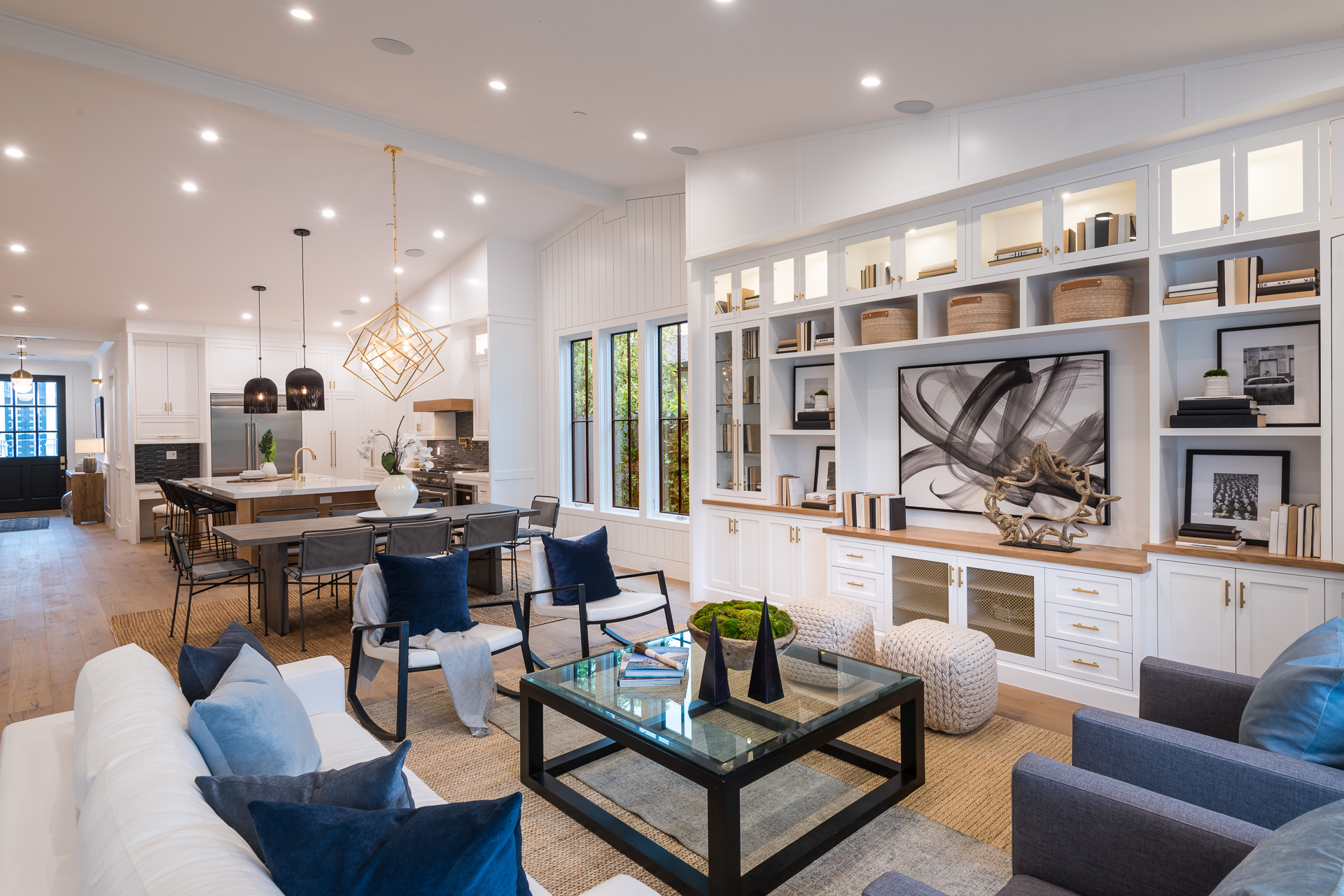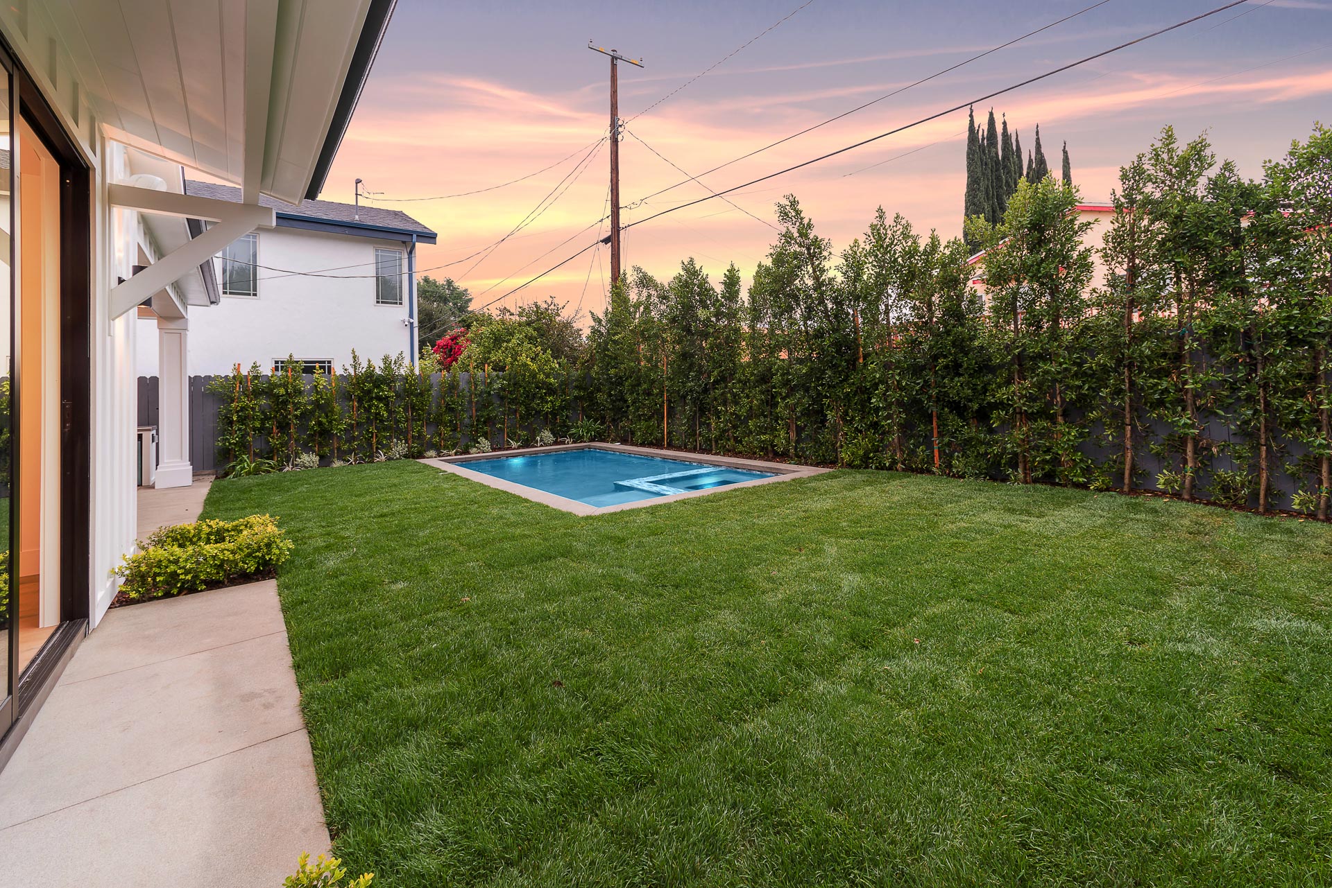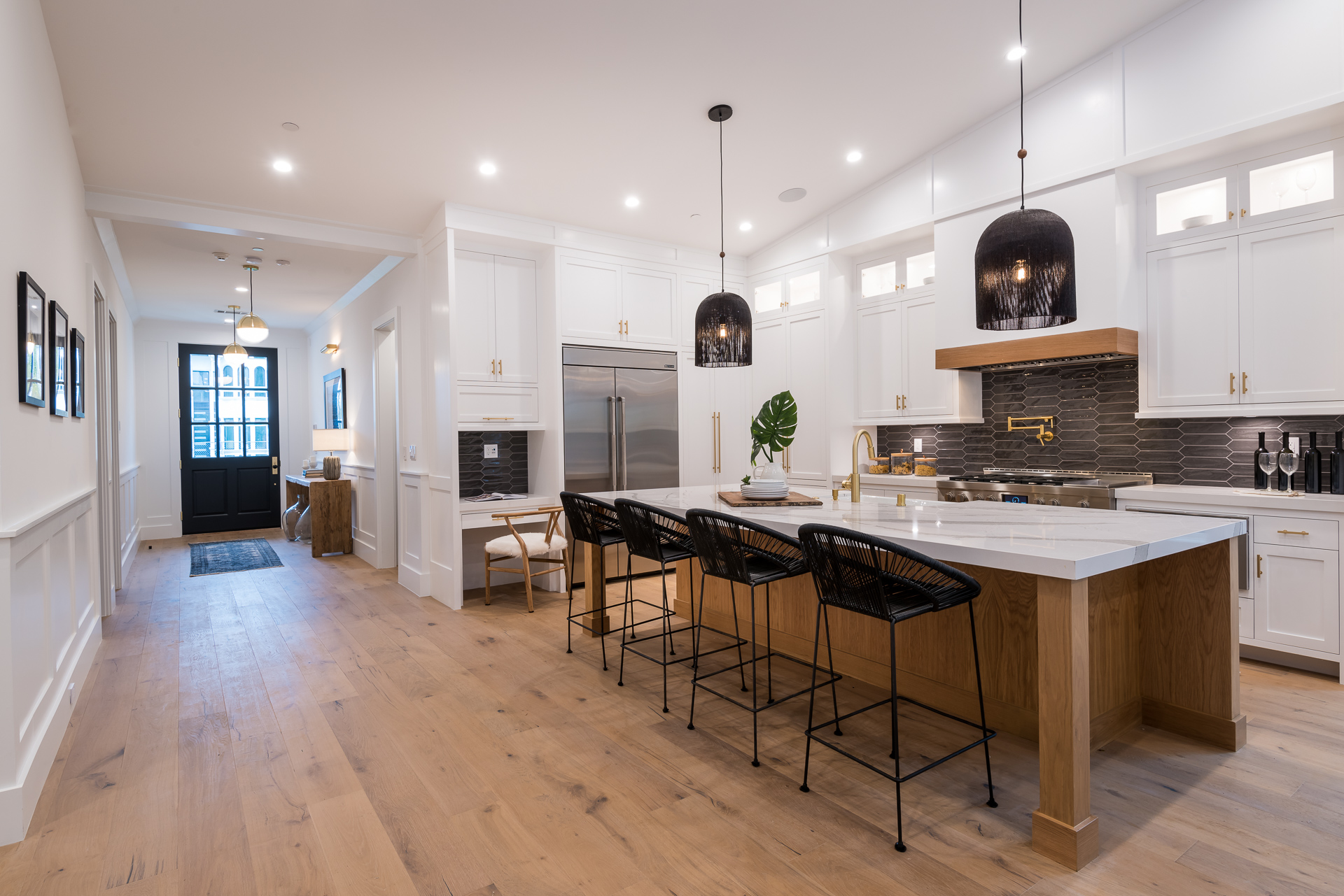 This captivating one-story new construction is any buyers dream home. The grand entrance sets the tone of the rest of the home, with soaring ceilings, an inviting open concept floor plan that leads you to your gourmet chef’s kitchen with high-end appliances and an oversized marble island. The family room is equipped with custom built-ins and floor to ceiling sliding glass doors, opening up to the beautiful backyard with lush landscaping, pool+spa, & BBQ zone. All four bedrooms are en-suite with unique tile work giving each bathroom its own flare. The master has a spa-like bathroom with dual vanities, soaking tub, and oversized shower. Large sliding glass doors in the master offer tranquil views of the backyard. Other amenities include Control-4 smart home, attached two car garage, separate laundry room with utility sink, and luxury finishes throughout. This is a truly remarkable one-story home in the heart of Sherman Oaks!