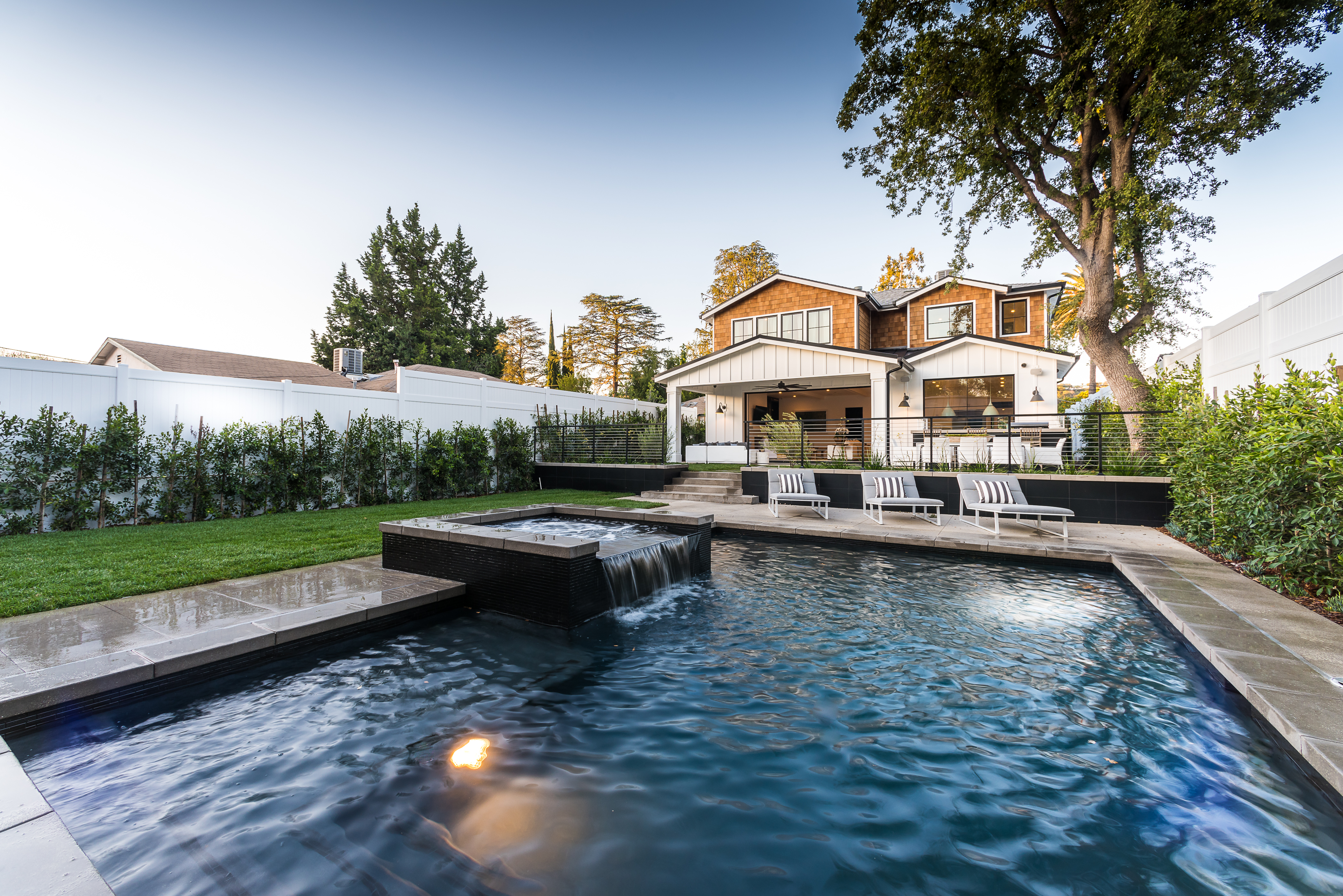 Situated South of Ventura Blvd. and around the corner from the famous Sherman Oaks Galleria, this striking custom designed home perfectly balances modern sophistication and timeless style that features Smarthome technology. The home displays clean lines and idyllic beauty with an open layout, fine oak flooring, high end finishes, tongue and groove ceilings, and plenty of natural light throughout. The sun filled living room features a custom tiled fireplace and greets the dining room that includes a white brick wall detail and wainscoting. Perfect for the movie-goers is your private 9 seater state of the art Theatre off the family room. Culinary inspiration is abound in the gourmet kitchen featuring an expansive butler’s pantry, 8 burner stove, over-sized kitchen island, impenetrable porcelain island counter and back-splash, open faced glass SubZero fridge and freezer, and a cozy breakfast nook. Pocket glass doors open the family area to the estate like backyard with a BBQ,pool/spa and a full 1000 sqft Guesthouse. Perfect for outdoor dining and entertaining. The master suite upstairs includes an inglenook with fireplace, his and hers walk in closets, master bath with designer tile and brass inlay, freestanding tub, and polished brass fixtures. Four additional bedrooms are en suite, feature full baths, hardwood floors, wainscoting, large closets, and recessed lighting. There is a lot of new construction out there, don't miss this opportunity to see something fresh and different!