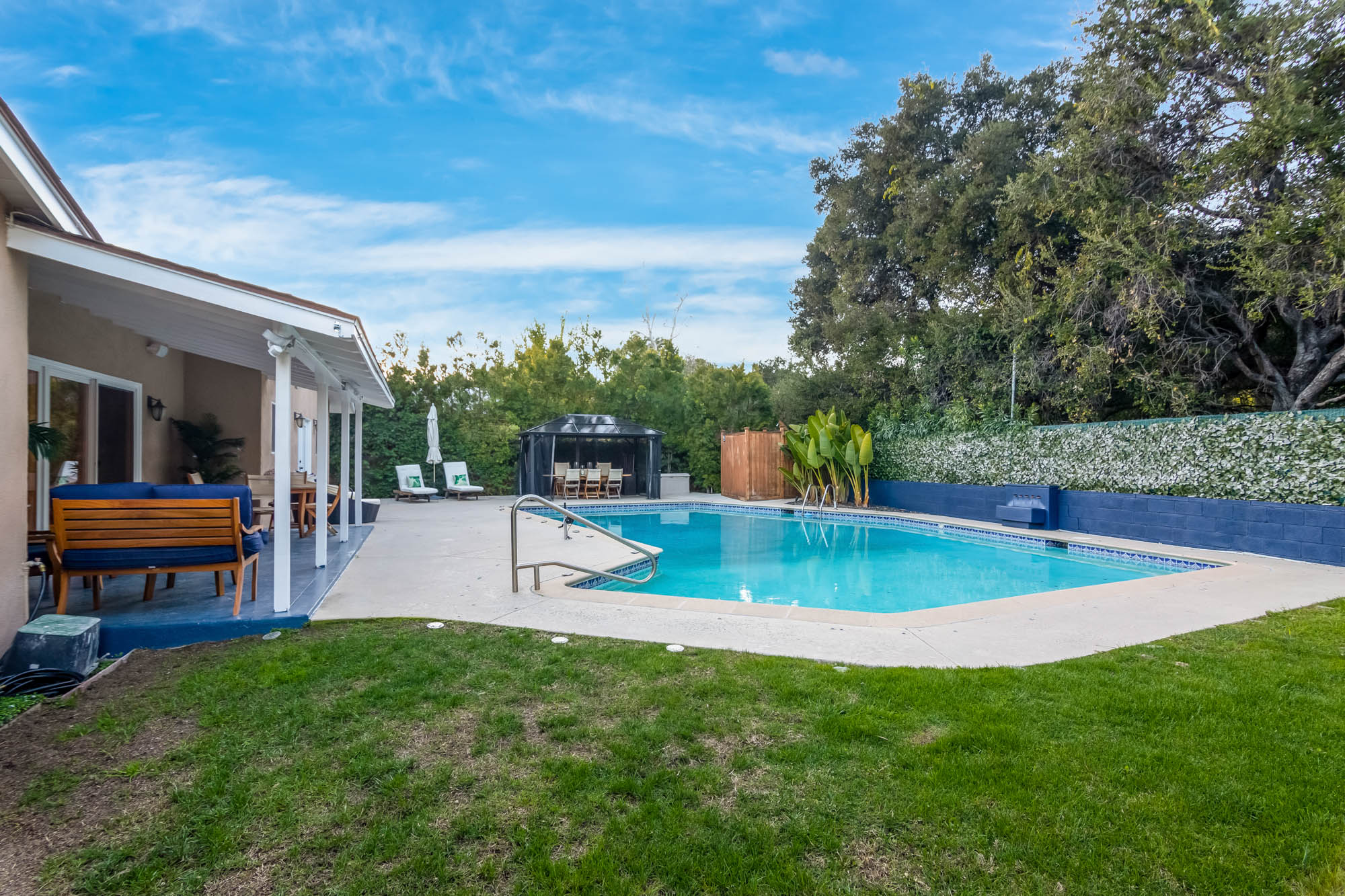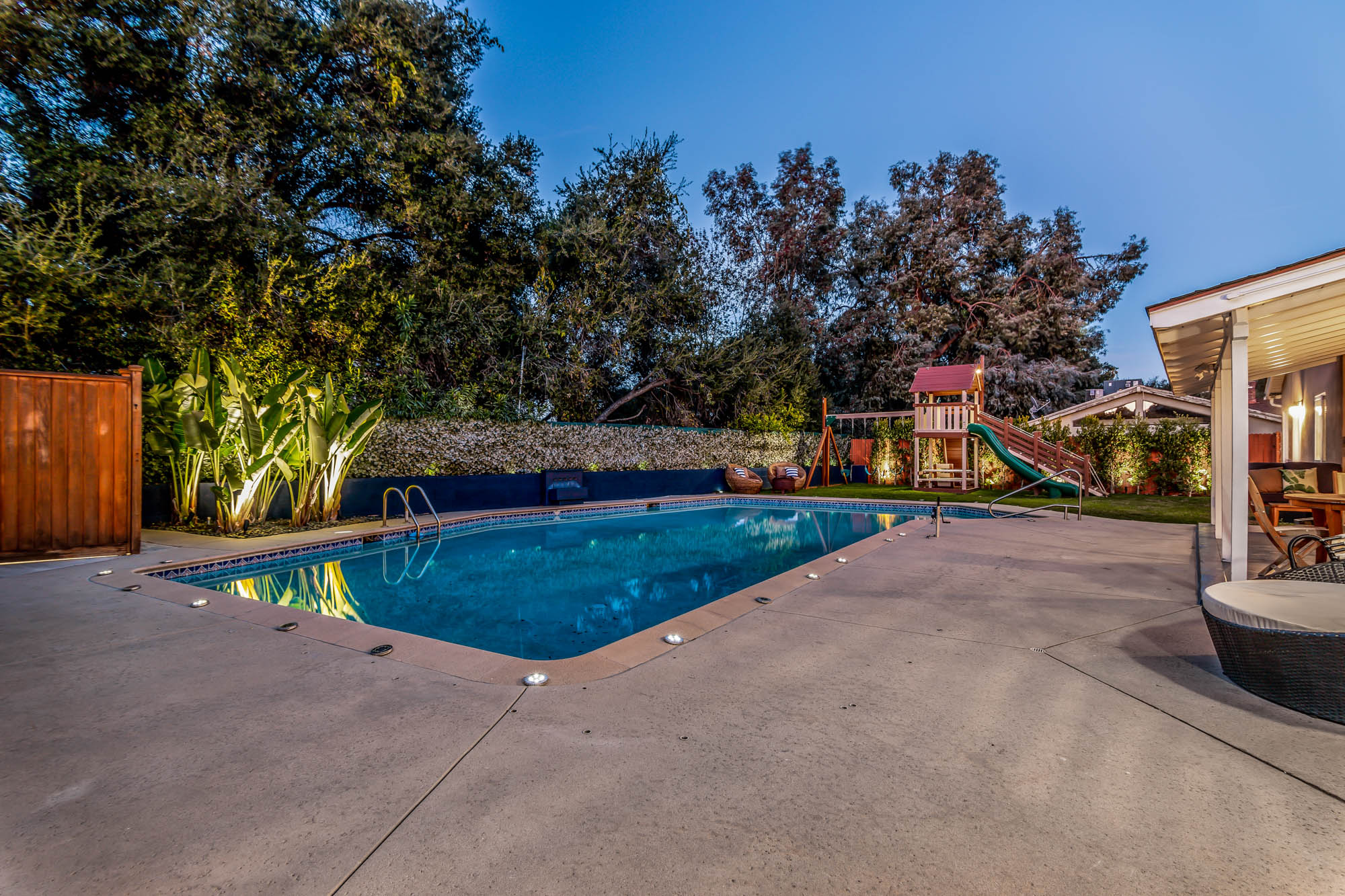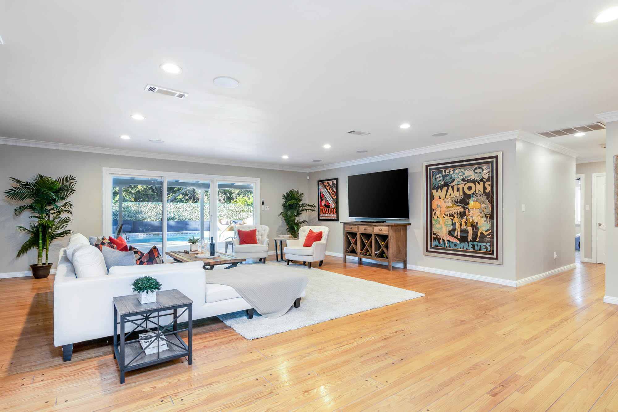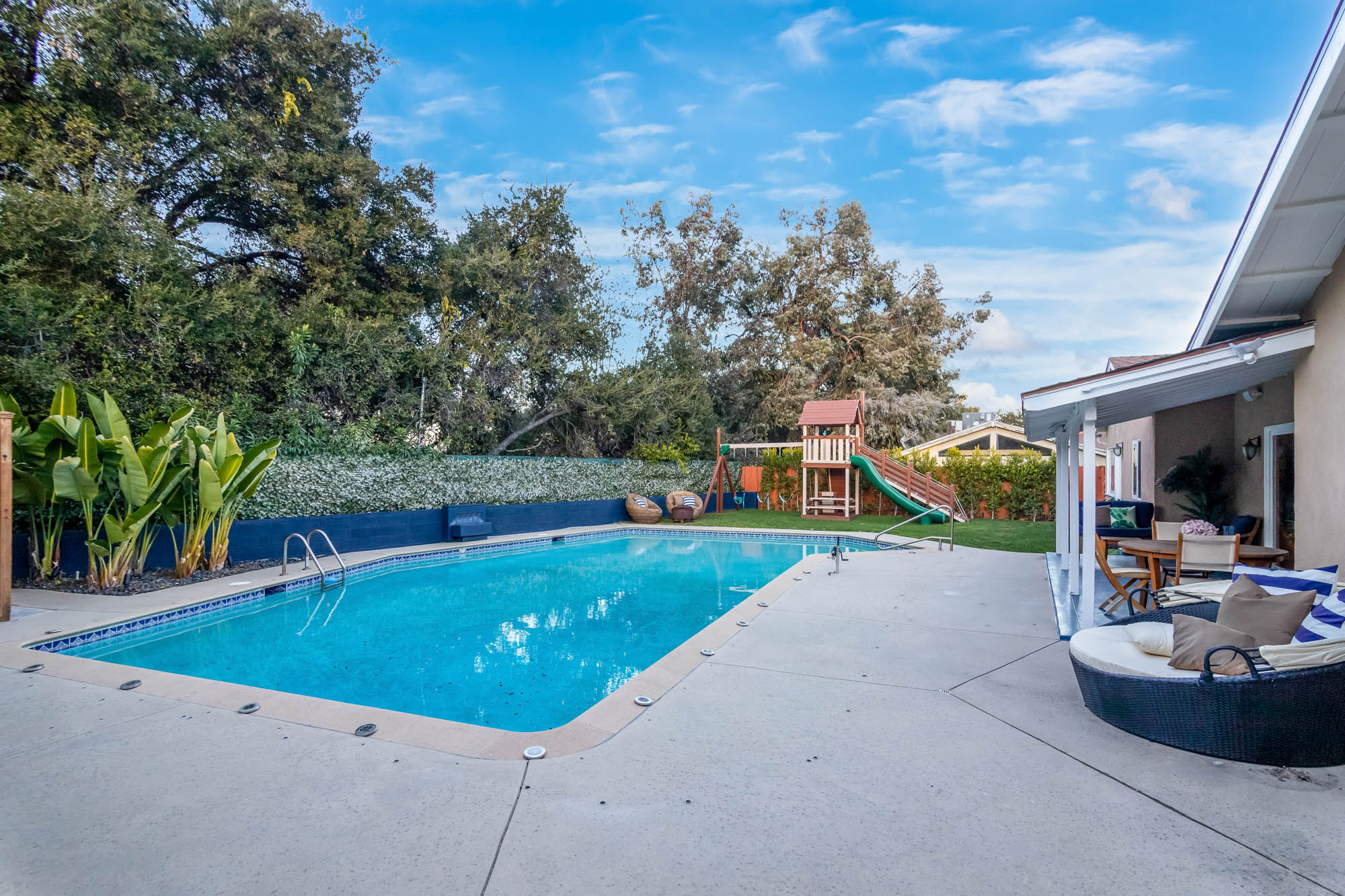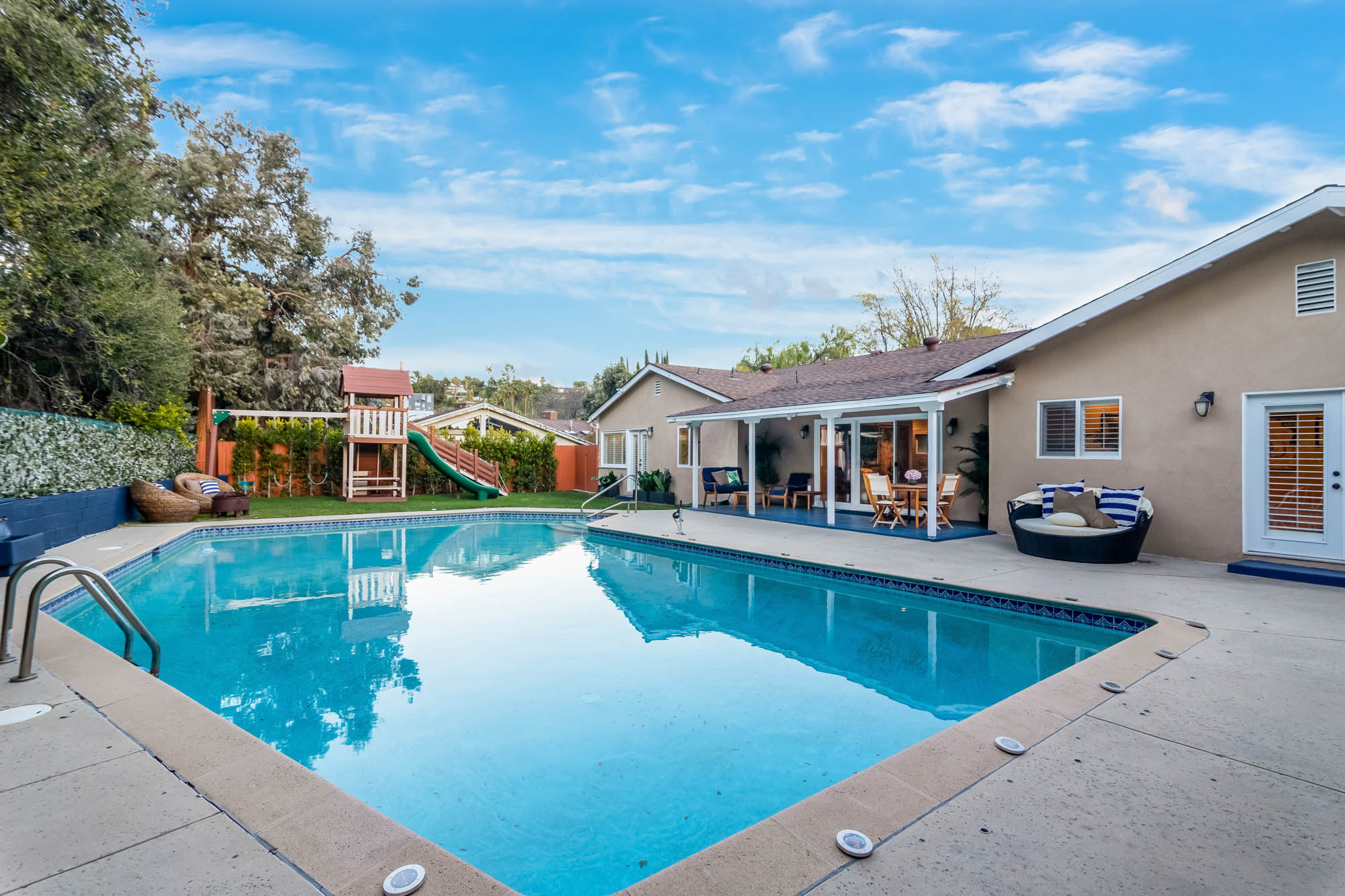 Located in the serene hills of Sherman Oaks South of the Blvd lies this stunning single story, 4 bed, 3 bath home in the Royal Woods community. Behind exclusive gates and surrounded by large privacy trees, this beautifully landscaped home is not one to miss! Upon entering this 2,570 Sqft home you are welcomed by an inviting red door and breathtaking open floor plan, that gives off a trendy New York loft-style feel. With an abundance of space, eye-catching accent wall, and access to the backyard, the living area is made to entertain. Flowing effortlessly to one side is a spacious dining area perfect for large gatherings with friends and family. A beautiful kitchen with large island follows and is fully equipped with top of the line stainless steel appliances, plentiful cabinetry, and lovely granite countertops. Plantation windows allow for an abundance of natural light that illuminates the beautiful hardwood floors. 3 sizable bedrooms and 2 luxury bathrooms are a must but the main event is the incredible master suite. Featuring a second accent wall, private access to the backyard, walk-in closet with vanity and an astounding master bathroom with a double sink vanity, Toto luxury toilet, massive shower and deep tub to soak in after a long day, this is the ultimate retreat! A bonus room with full bathroom is located towards the back of the home and is perfect for a playroom, office, or even media room! The exclusive backyard spares no expense and includes a large patio, magnificent sparkling pool, kids playground, cabana for lounging and even an outdoor bathroom with toilet and shower! Additional features include in-ceiling speakers for indoor/outdoor surround sound, dimmable recessed lighting, and attached 2 car garage with extra storage space. Conveniently located near the 101 & 405 fwys, your dream home awaits!