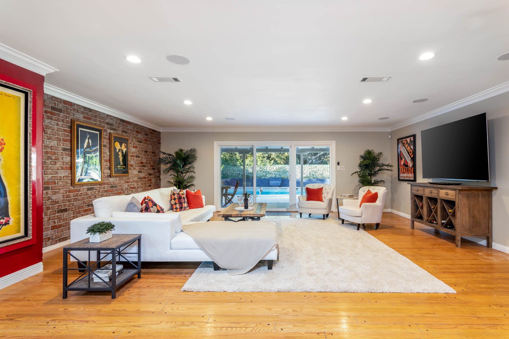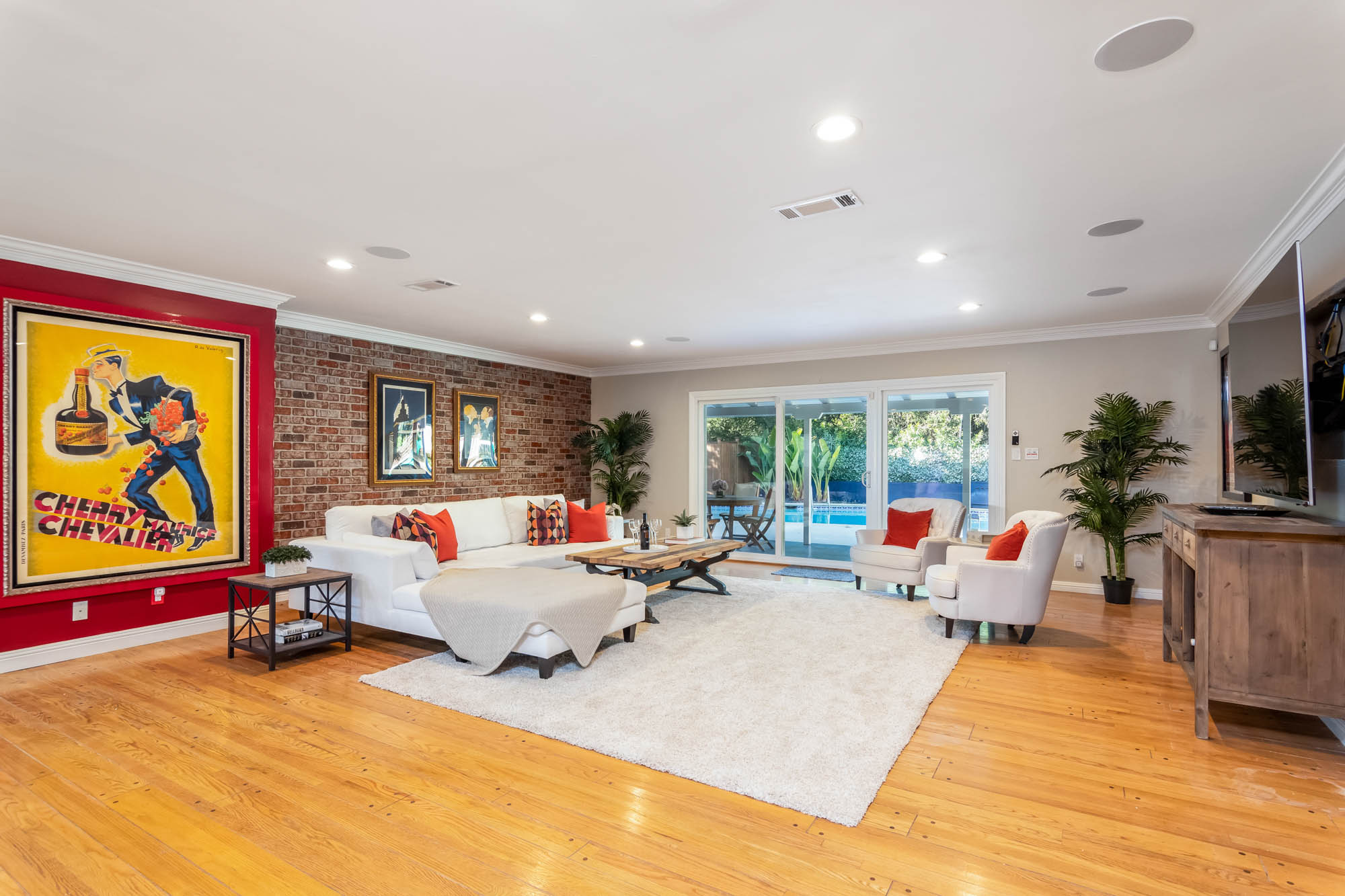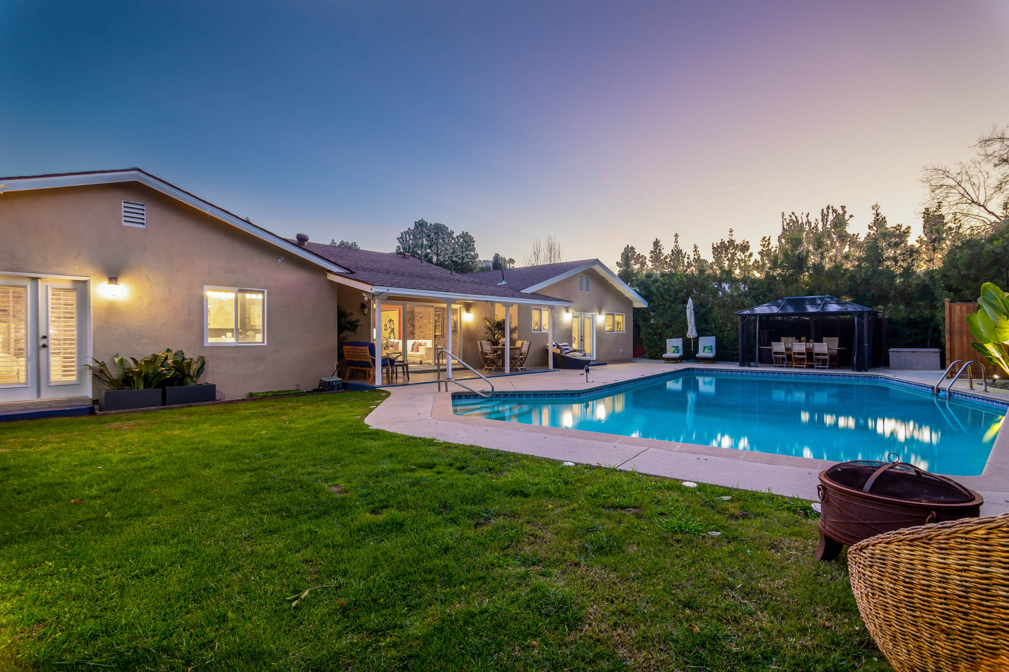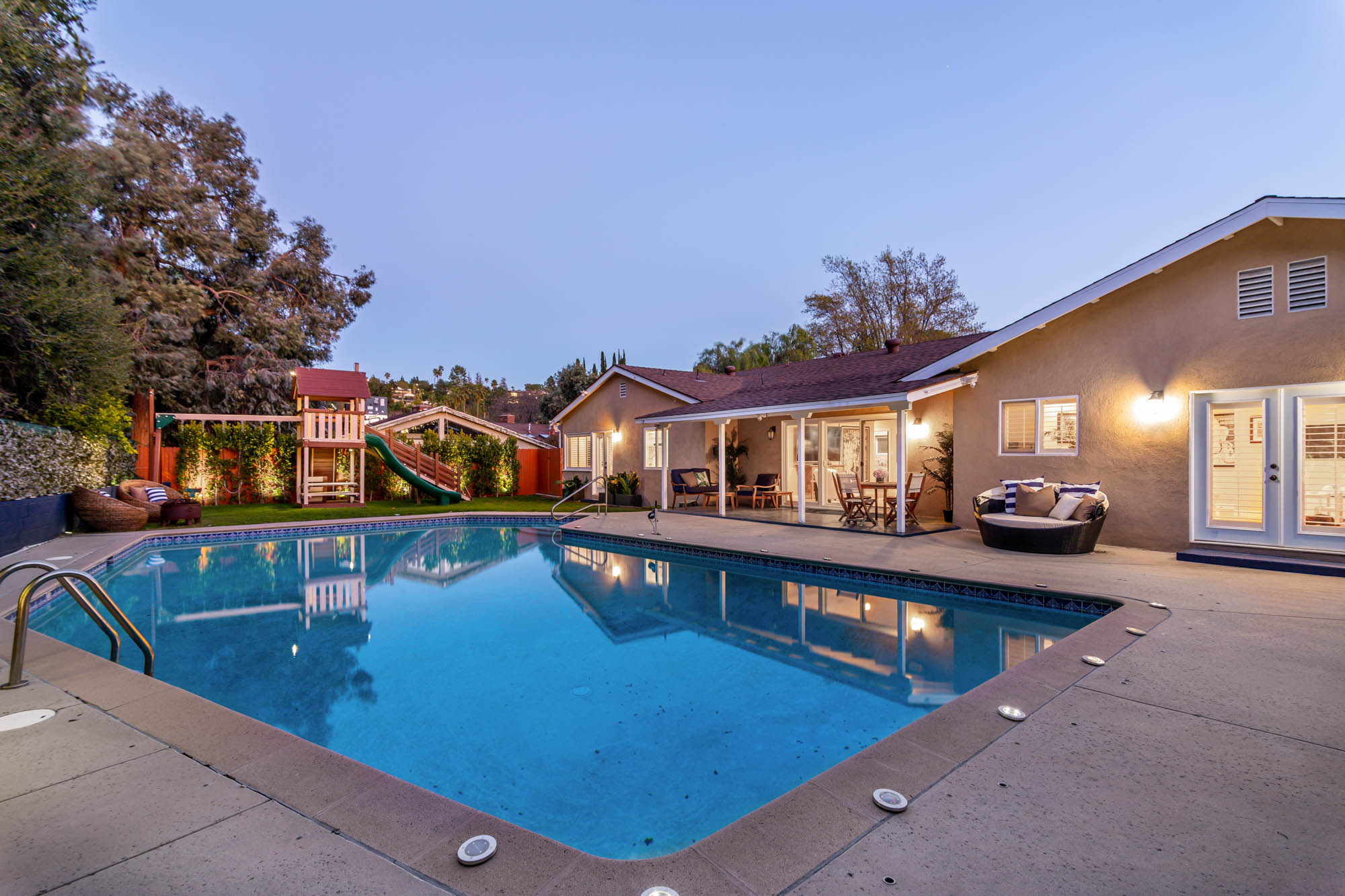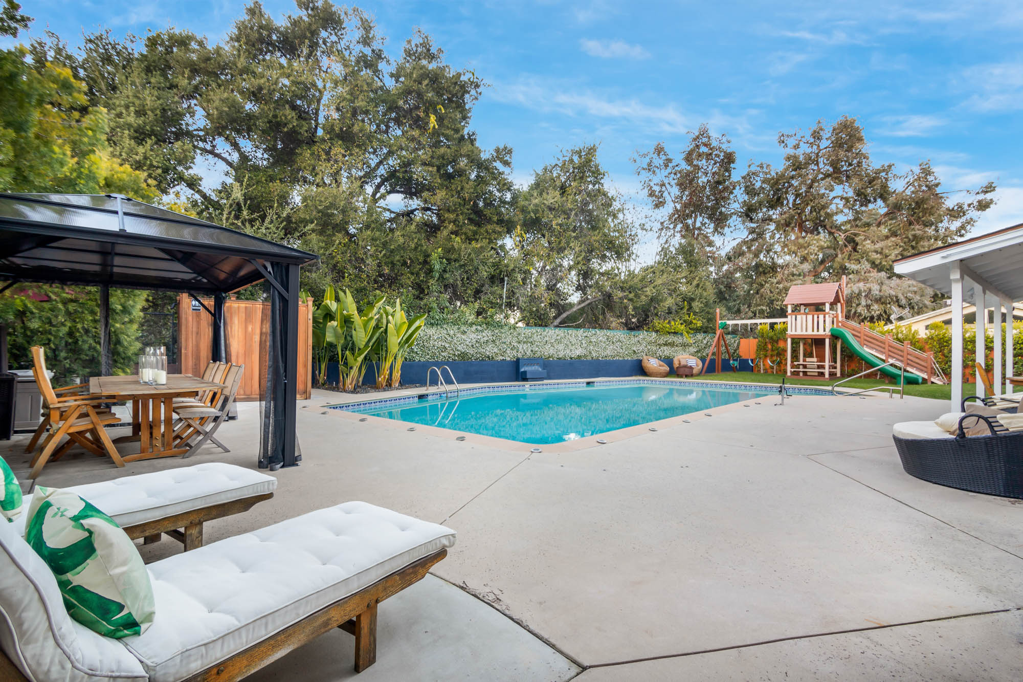Located in the serene hills of Sherman Oaks South of the Blvd lies this stunning single story, 4 bed, 3 bath home in the Royal Woods community. Behind exclusive gates and surrounded by large privacy trees, this beautifully landscaped home is not one to miss! Upon entering this 2,570 Sqft home you are welcomed by an inviting red door and breathtaking open floor plan, that gives off a trendy New York loft-style feel. With an abundance of space, eye-catching accent wall, and access to the backyard, the living area is made to entertain. Flowing effortlessly to one side is a spacious dining area perfect for large gatherings with friends and family. A beautiful kitchen with large island follows and is fully equipped with top of the line stainless steel appliances, plentiful cabinetry, and lovely granite countertops. Plantation windows allow for an abundance of natural light that illuminates the beautiful hardwood floors. 3 sizable bedrooms and 2 luxury bathrooms are a must but the main event is the incredible master suite. Featuring a second accent wall, private access to the backyard, walk-in closet with vanity and an astounding master bathroom with a double sink vanity, Toto luxury toilet, massive shower and deep tub to soak in after a long day, this is the ultimate retreat! A bonus room with full bathroom is located towards the back of the home and is perfect for a playroom, office, or even media room! The exclusive backyard spares no expense and includes a large patio, magnificent sparkling pool, kids playground, cabana for lounging and even an outdoor bathroom with toilet and shower! Additional features include in-ceiling speakers for indoor/outdoor surround sound, dimmable recessed lighting, and attached 2 car garage with extra storage space. Conveniently located near the 101 & 405 fwys, your dream home awaits!
