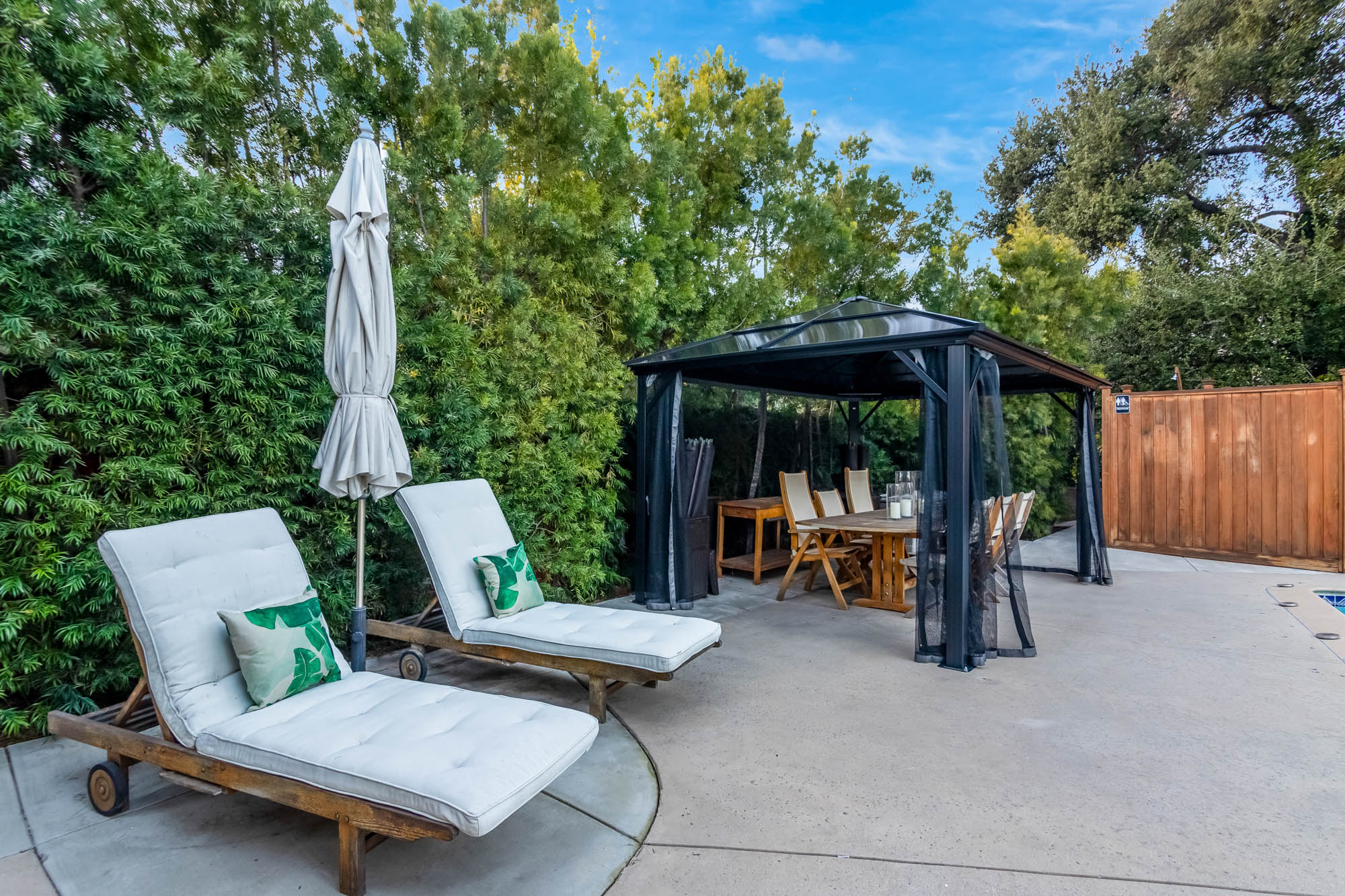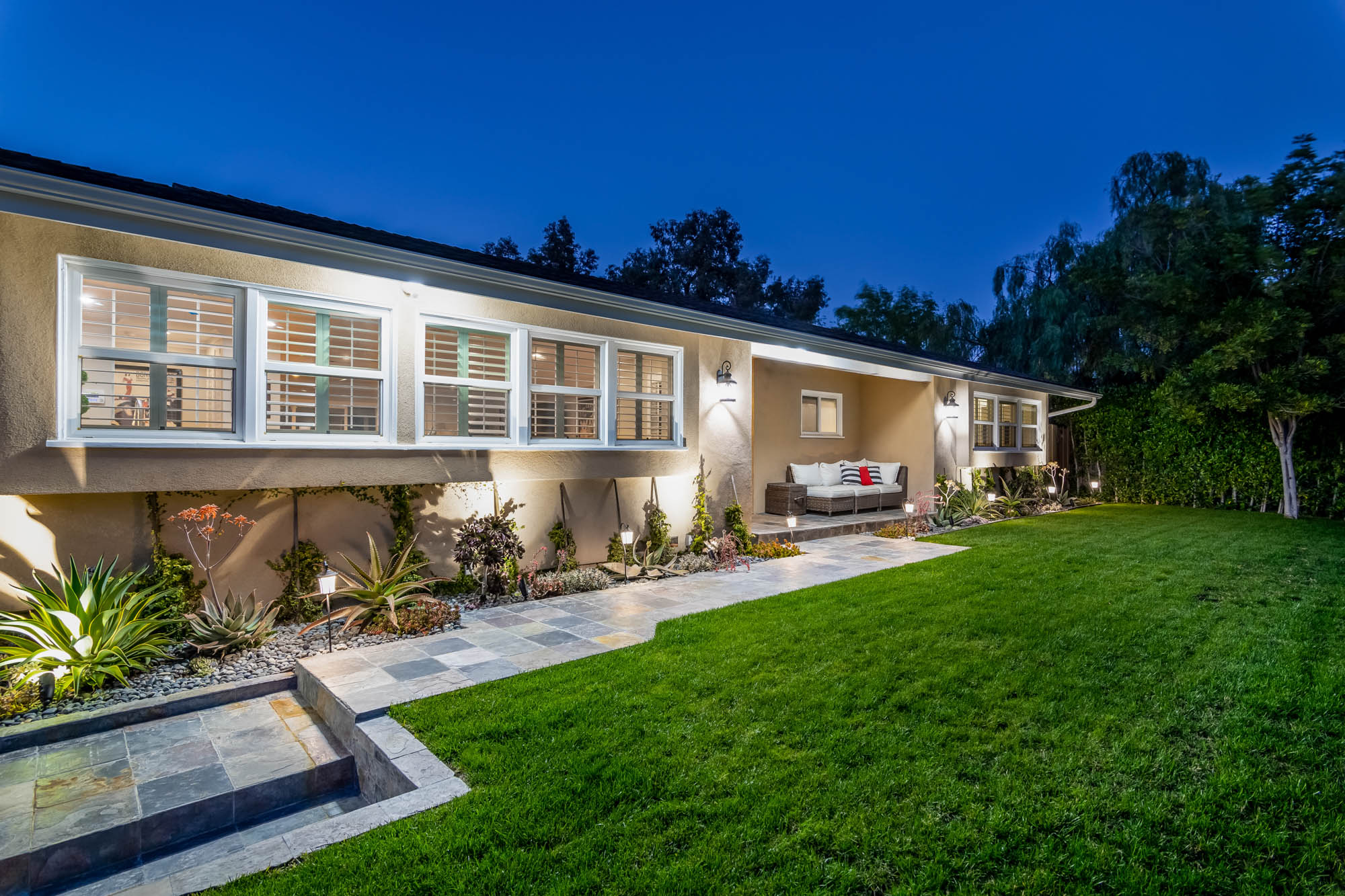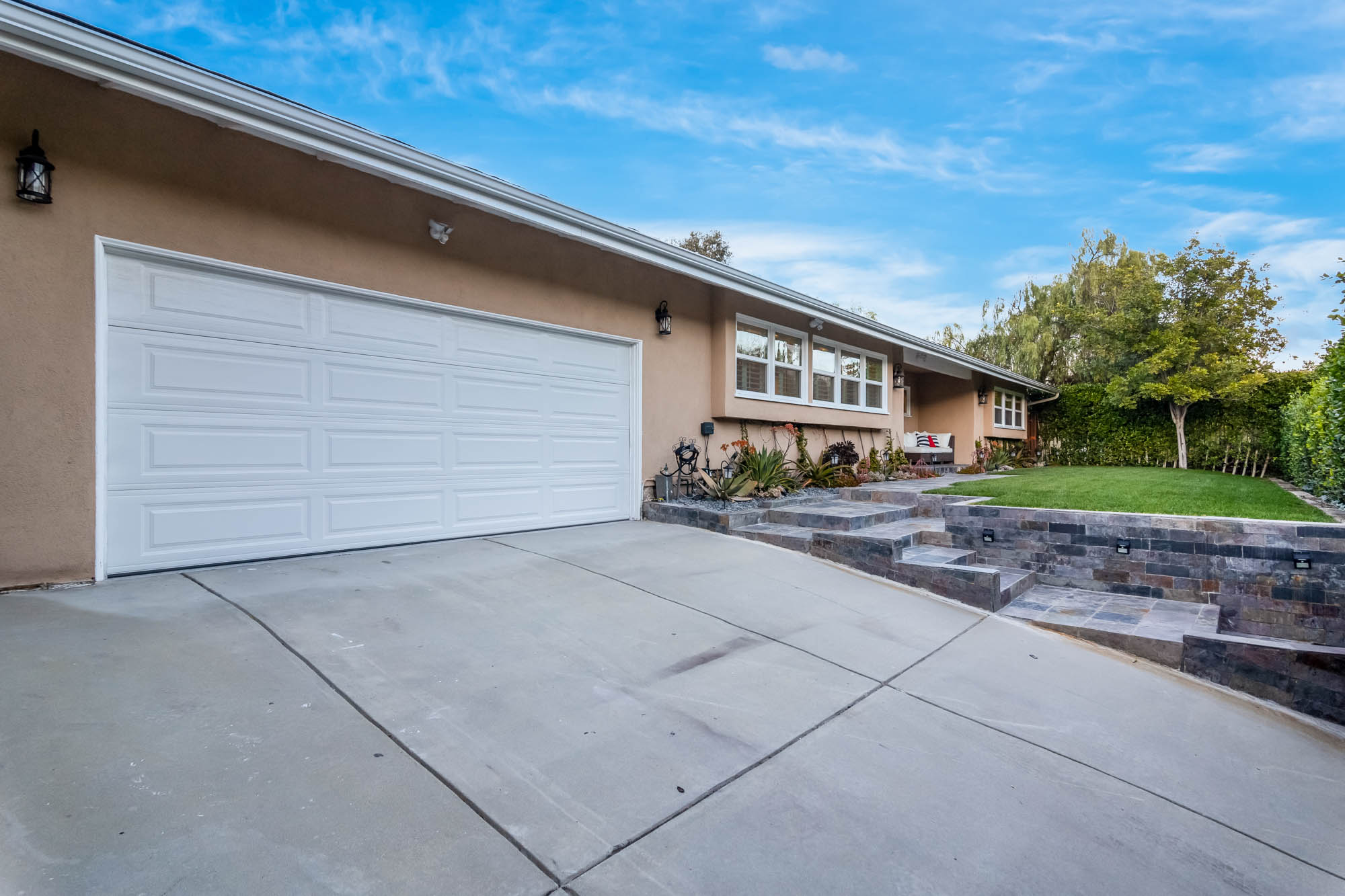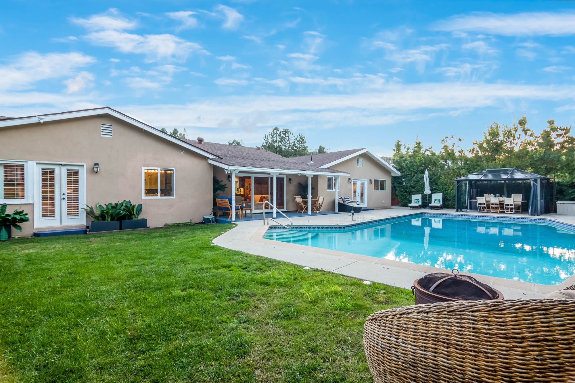 Located in the serene hills of Sherman Oaks South of the Blvd lies this stunning single story, 4 bed, 3 bath home in the Royal Woods community. Behind exclusive gates and surrounded by large privacy trees, this beautifully landscaped home is not one to miss! Upon entering this 2,570 Sqft home you are welcomed by an inviting red door and breathtaking open floor plan, that gives off a trendy New York loft-style feel. With an abundance of space, eye-catching accent wall, and access to the backyard, the living area is made to entertain. Flowing effortlessly to one side is a spacious dining area perfect for large gatherings with friends and family. A beautiful kitchen with large island follows and is fully equipped with top of the line stainless steel appliances, plentiful cabinetry, and lovely granite countertops. Plantation windows allow for an abundance of natural light that illuminates the beautiful hardwood floors. 3 sizable bedrooms and 2 luxury bathrooms are a must but the main event is the incredible master suite. Featuring a second accent wall, private access to the backyard, walk-in closet with vanity and an astounding master bathroom with a double sink vanity, Toto luxury toilet, massive shower and deep tub to soak in after a long day, this is the ultimate retreat! A bonus room with full bathroom is located towards the back of the home and is perfect for a playroom, office, or even media room! The exclusive backyard spares no expense and includes a large patio, magnificent sparkling pool, kids playground, cabana for lounging and even an outdoor bathroom with toilet and shower! Additional features include in-ceiling speakers for indoor/outdoor surround sound, dimmable recessed lighting, and attached 2 car garage with extra storage space. Conveniently located near the 101 & 405 fwys, your dream home awaits!