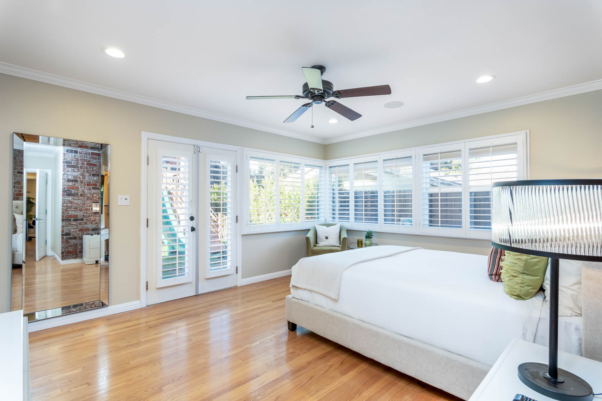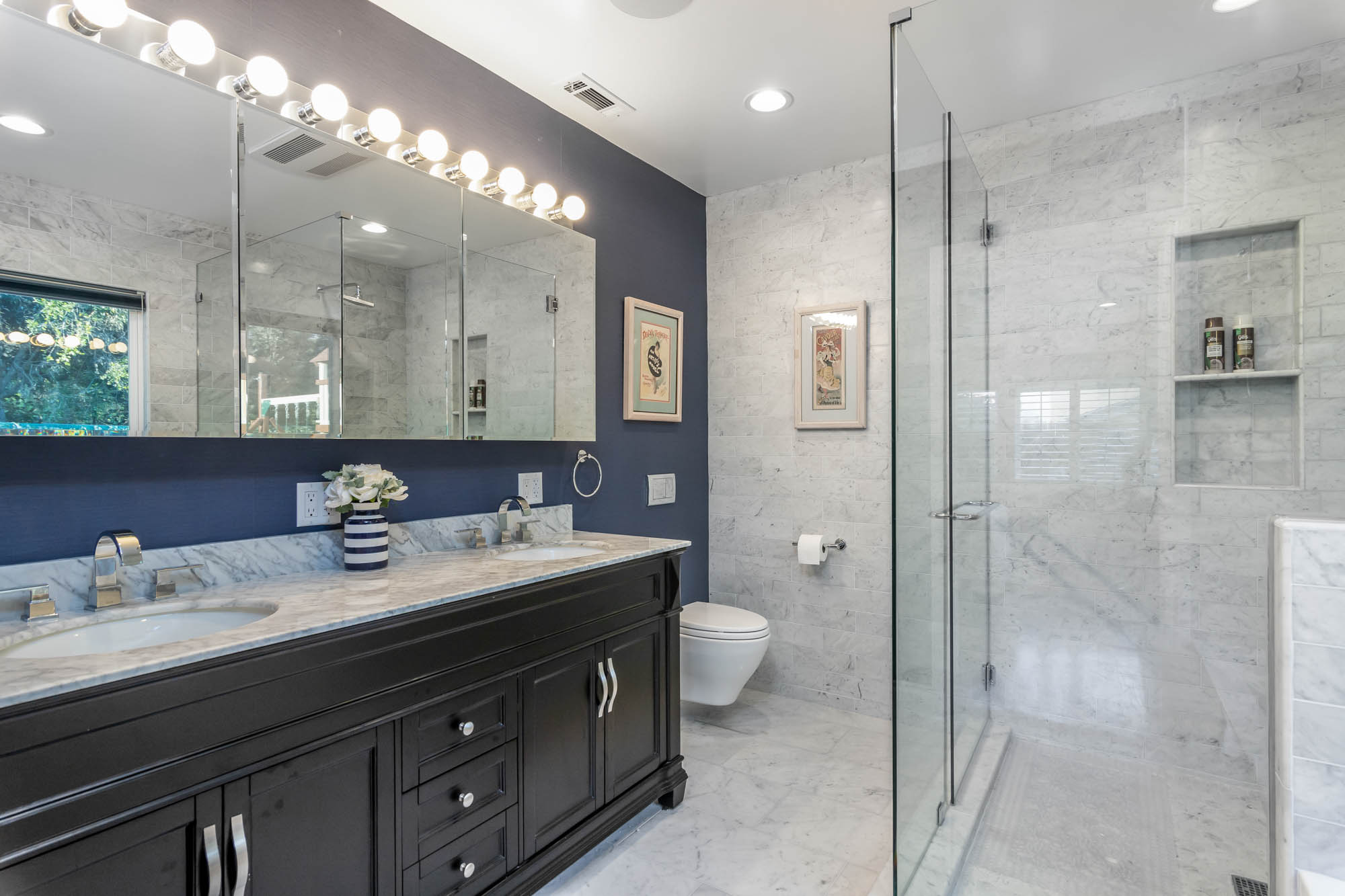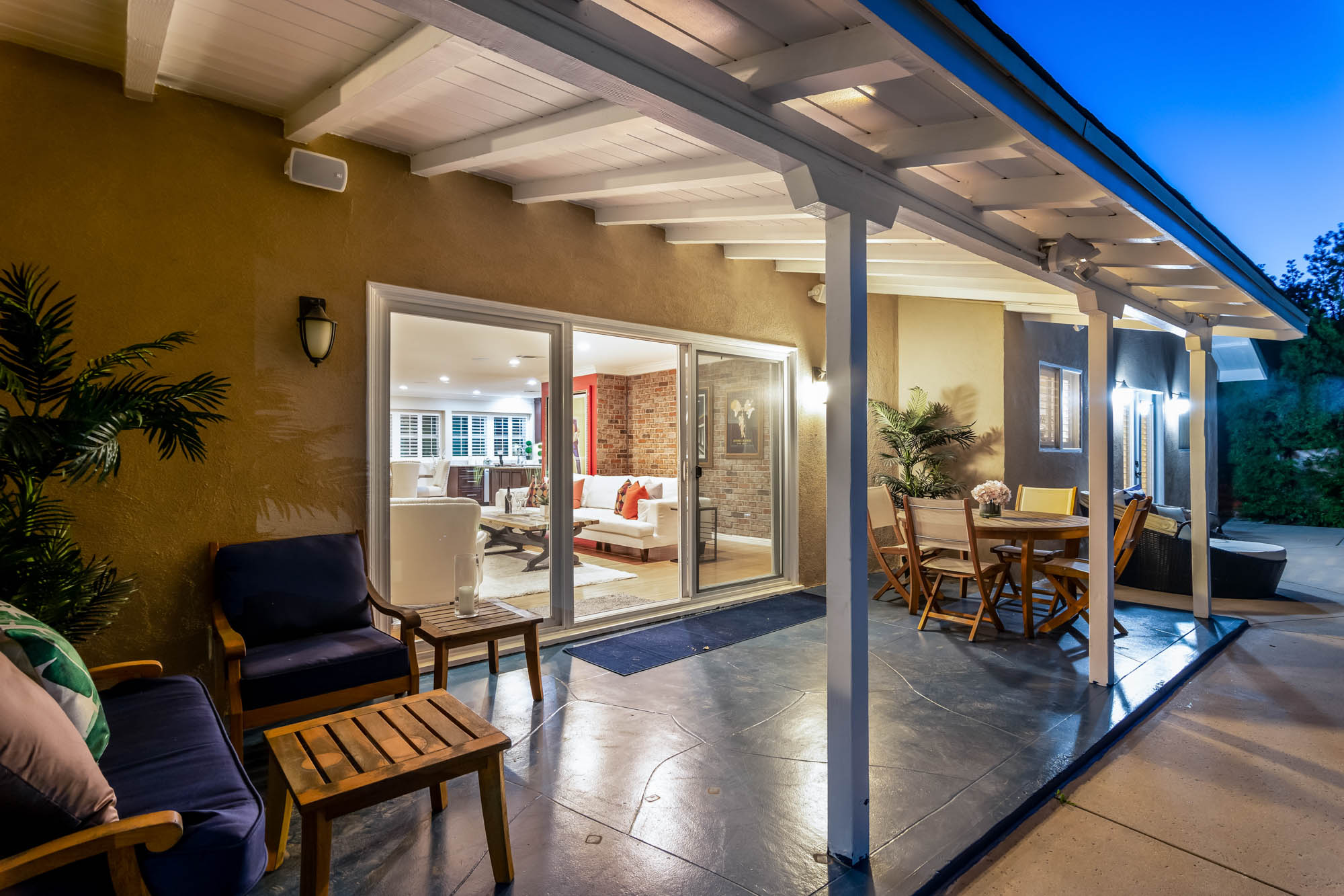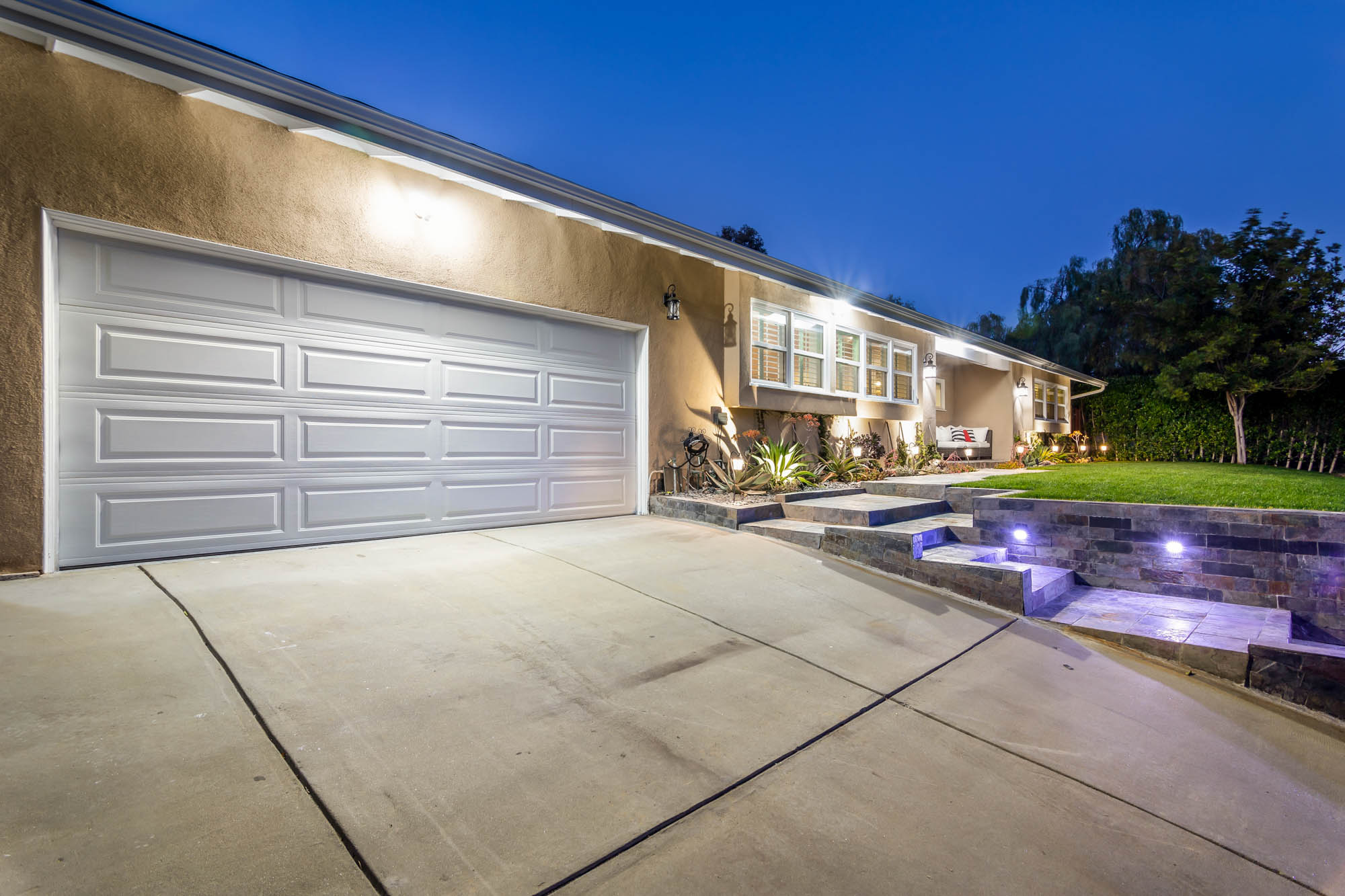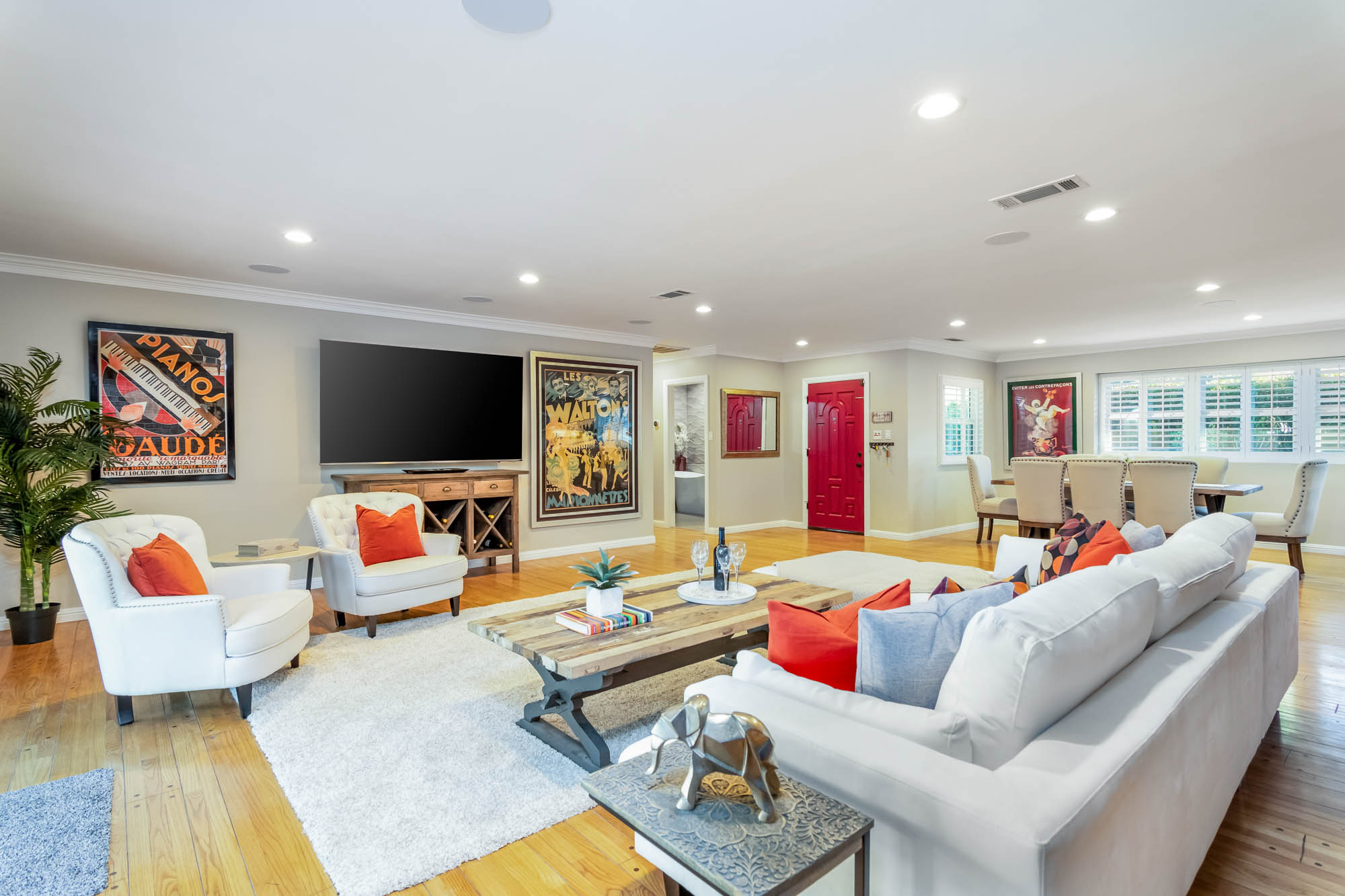 Located in the serene hills of Sherman Oaks South of the Blvd lies this stunning single story, 4 bed, 3 bath home in the Royal Woods community. Behind exclusive gates and surrounded by large privacy trees, this beautifully landscaped home is not one to miss! Upon entering this 2,570 Sqft home you are welcomed by an inviting red door and breathtaking open floor plan, that gives off a trendy New York loft-style feel. With an abundance of space, eye-catching accent wall, and access to the backyard, the living area is made to entertain. Flowing effortlessly to one side is a spacious dining area perfect for large gatherings with friends and family. A beautiful kitchen with large island follows and is fully equipped with top of the line stainless steel appliances, plentiful cabinetry, and lovely granite countertops. Plantation windows allow for an abundance of natural light that illuminates the beautiful hardwood floors. 3 sizable bedrooms and 2 luxury bathrooms are a must but the main event is the incredible master suite. Featuring a second accent wall, private access to the backyard, walk-in closet with vanity and an astounding master bathroom with a double sink vanity, Toto luxury toilet, massive shower and deep tub to soak in after a long day, this is the ultimate retreat! A bonus room with full bathroom is located towards the back of the home and is perfect for a playroom, office, or even media room! The exclusive backyard spares no expense and includes a large patio, magnificent sparkling pool, kids playground, cabana for lounging and even an outdoor bathroom with toilet and shower! Additional features include in-ceiling speakers for indoor/outdoor surround sound, dimmable recessed lighting, and attached 2 car garage with extra storage space. Conveniently located near the 101 & 405 fwys, your dream home awaits!