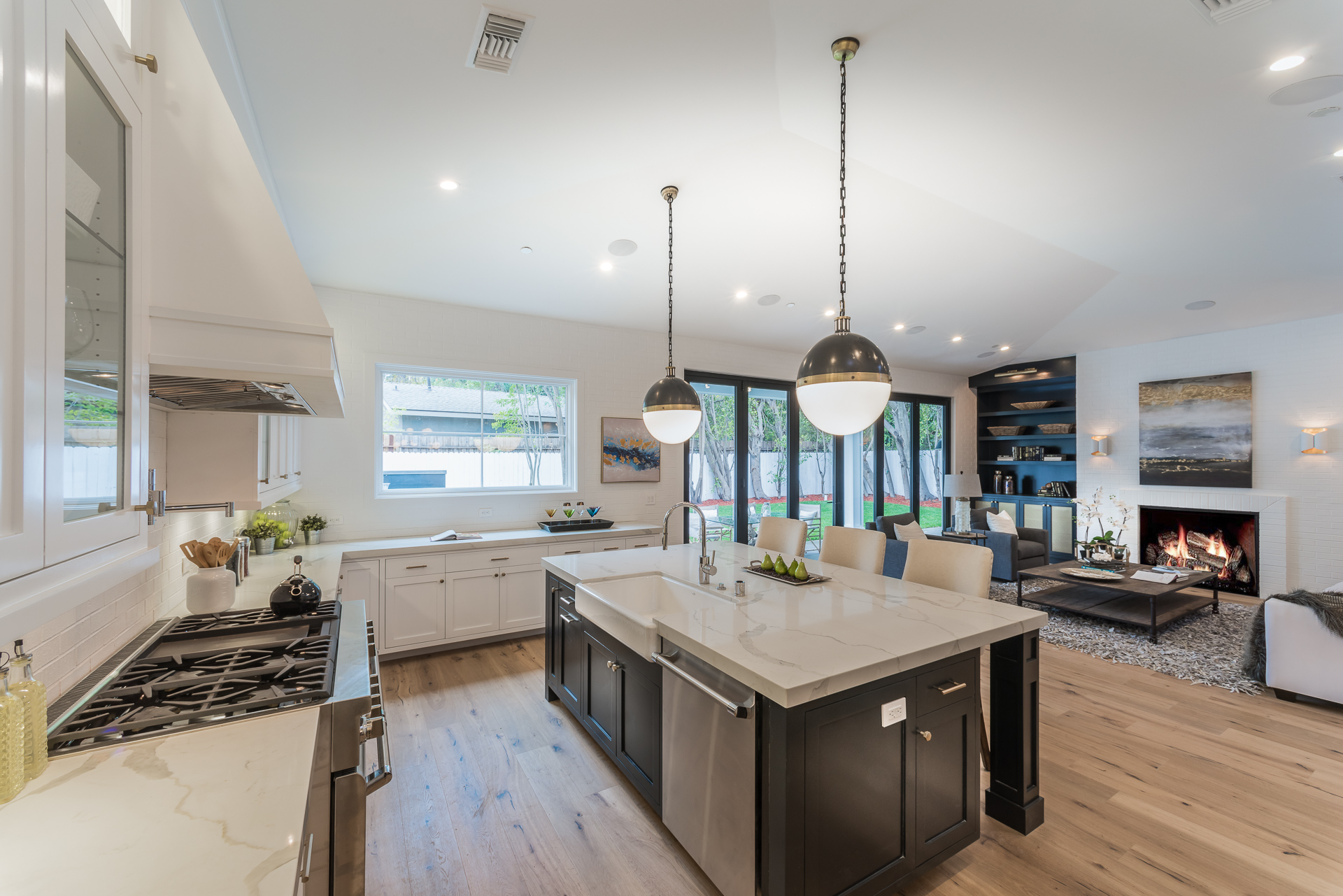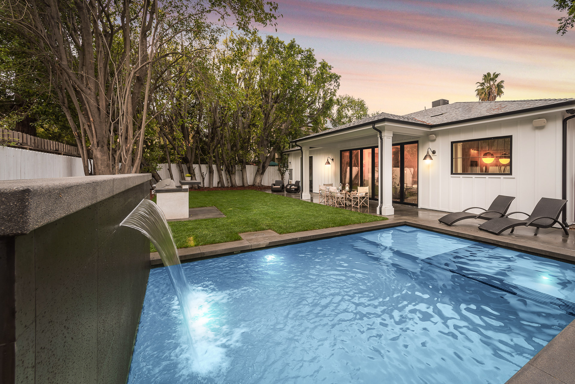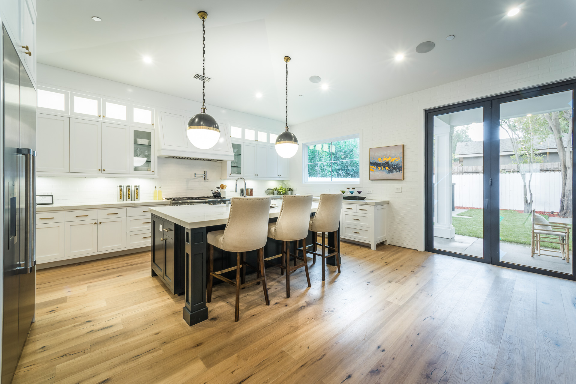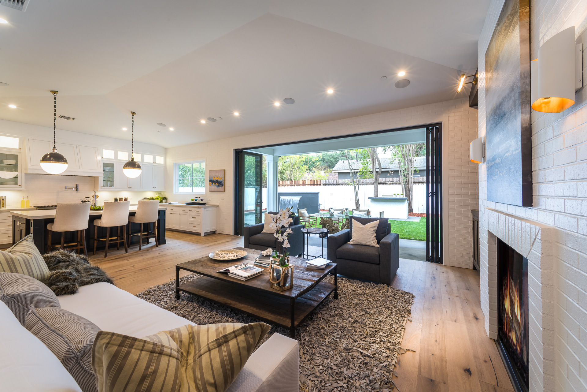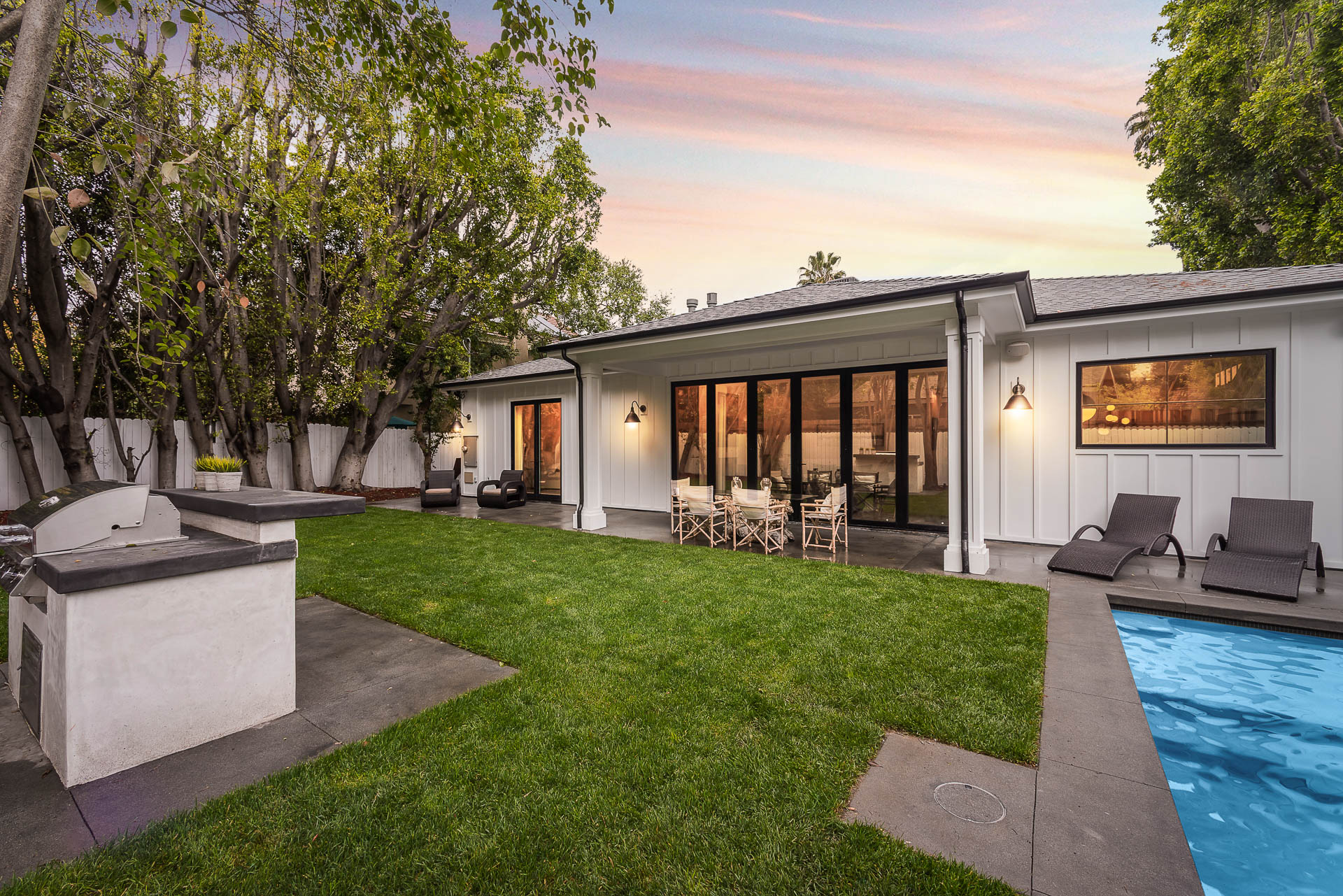 This sprawling one story new construction home is perfect for the growing family. As you enter the amazing 8ft barn door, you instantly step onto the light white oak flooring throughout that leads you to a well appointed and flowing floor plan boasting 3850 sq. ft. of artfully built single story living. The grand hallway brings together 4 bedrooms all en-suites with extensive tile work. A large gourmet chefs style kitchen with all amenities and built ins and a cozy Family room. No expense was spared, from the brass fixtures to the vaulted ceilings and brick walls. The family room is equipped with walls of glass opening up to a lush and well landscaped backyard with separate BBQ area, Custom designed Pool and Spa. The master has a spa-like bathroom w/ dual vanities, soaking tub, and oversized shower. Gorgeous looking French doors in master suite that open up to a seating/lounge area off the yard. This is a truly remarkable and well built one-story home in the heart of Encino and in a great location.