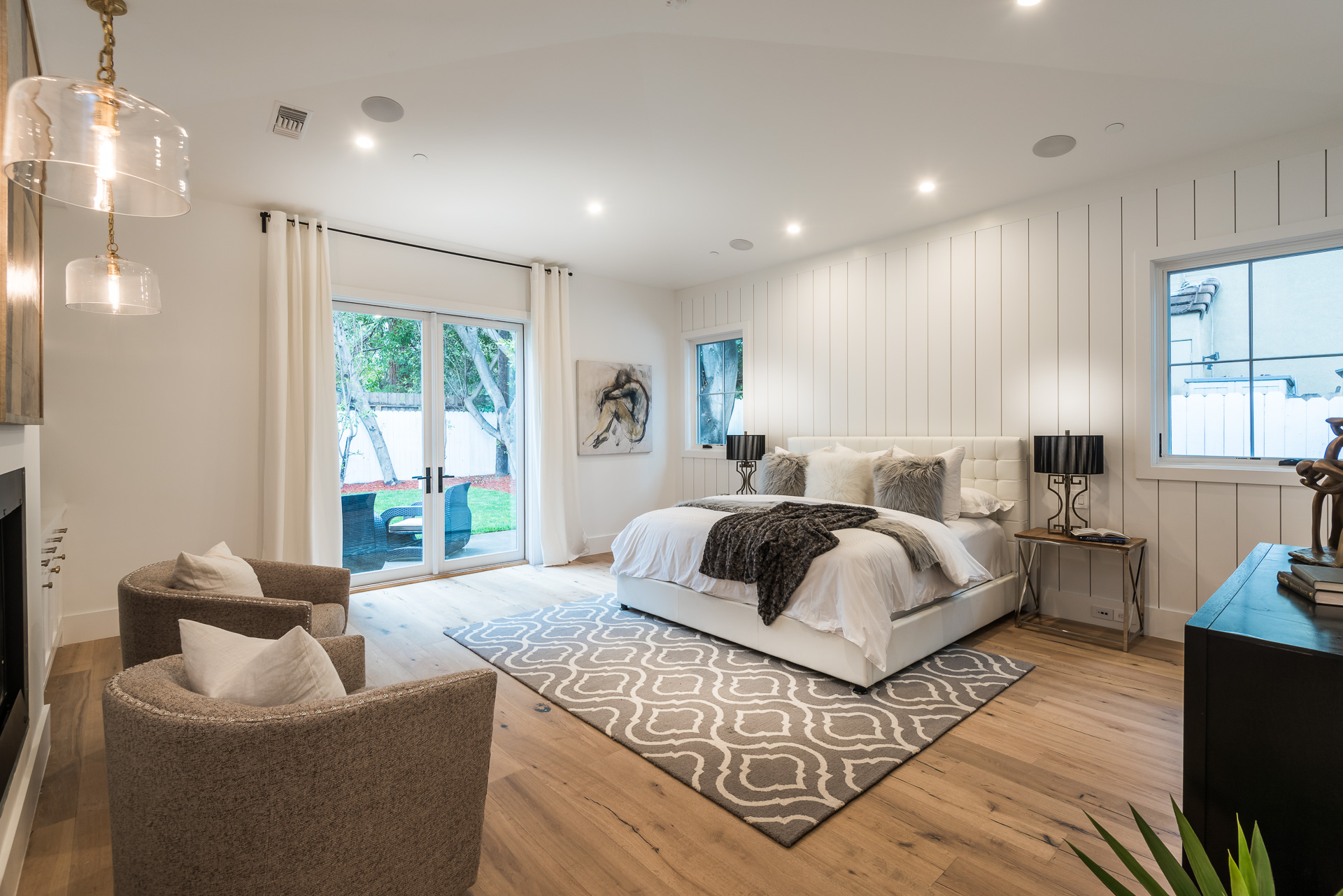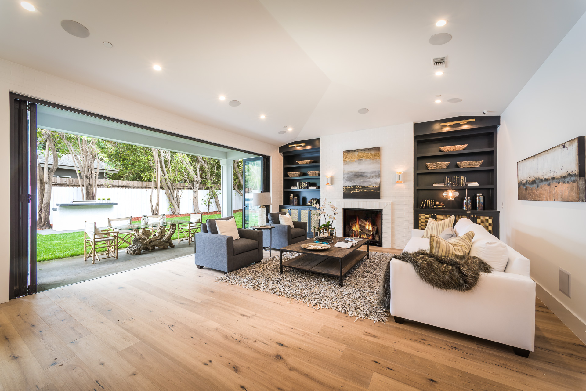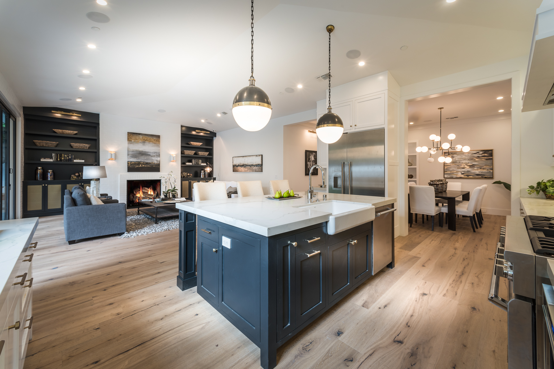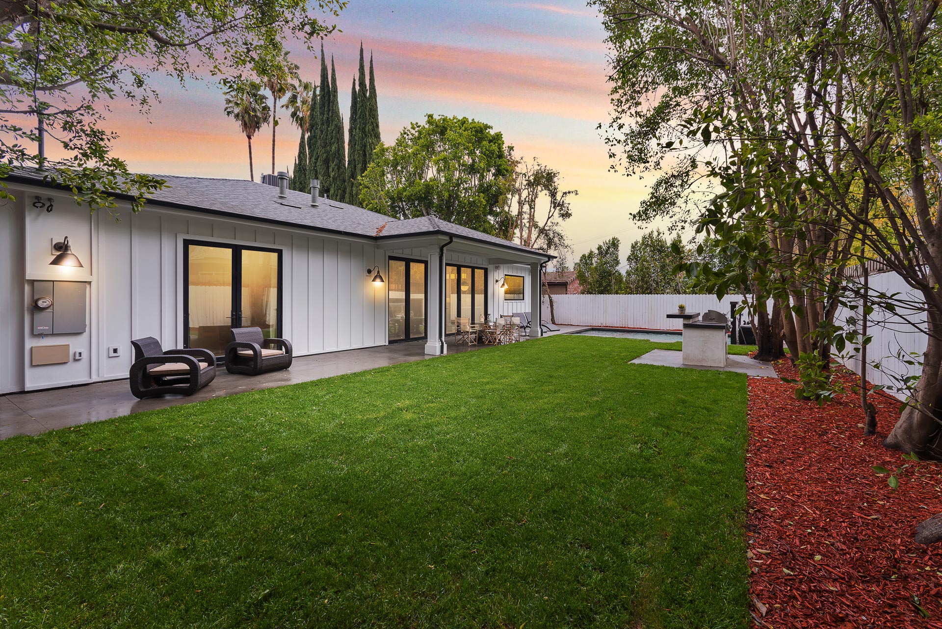 This sprawling one story new construction home is perfect for the growing family. As you enter the amazing 8ft barn door, you instantly step onto the light white oak flooring throughout that leads you to a well appointed and flowing floor plan boasting 3850 sq. ft. of artfully built single story living. The grand hallway brings together 4 bedrooms all en-suites with extensive tile work. A large gourmet chefs style kitchen with all amenities and built ins and a cozy Family room. No expense was spared, from the brass fixtures to the vaulted ceilings and brick walls. The family room is equipped with walls of glass opening up to a lush and well landscaped backyard with separate BBQ area, Custom designed Pool and Spa. The master has a spa-like bathroom w/ dual vanities, soaking tub, and oversized shower. Gorgeous looking French doors in master suite that open up to a seating/lounge area off the yard. This is a truly remarkable and well built one-story home in the heart of Encino and in a great location.