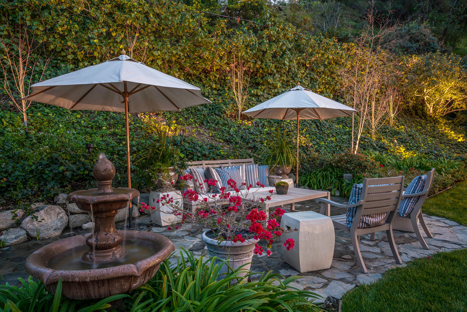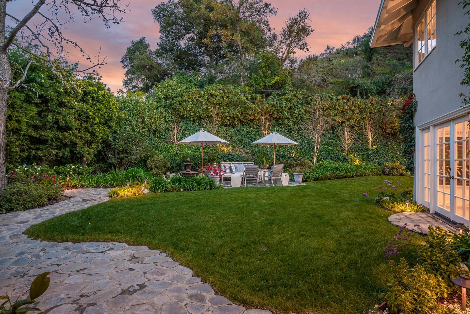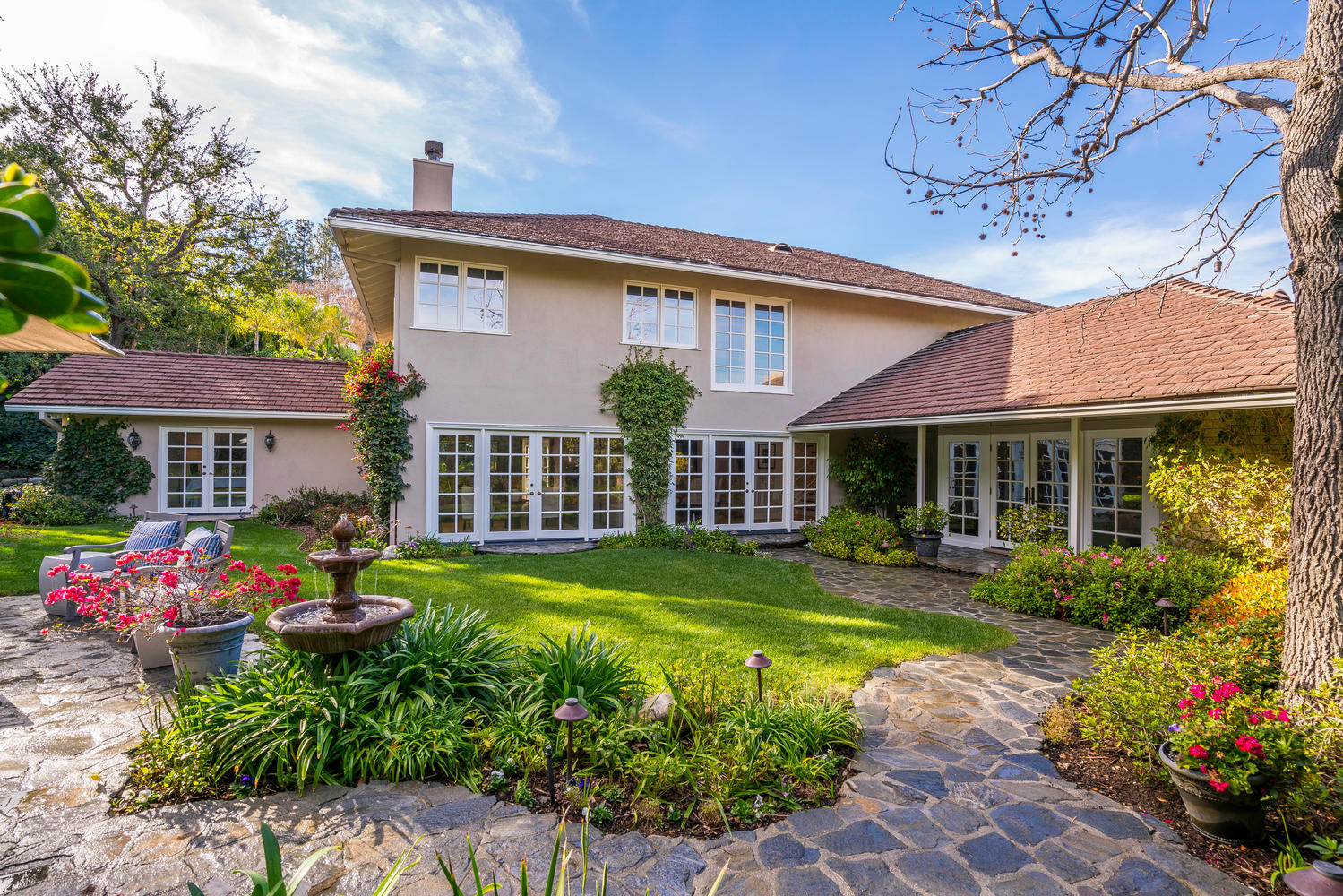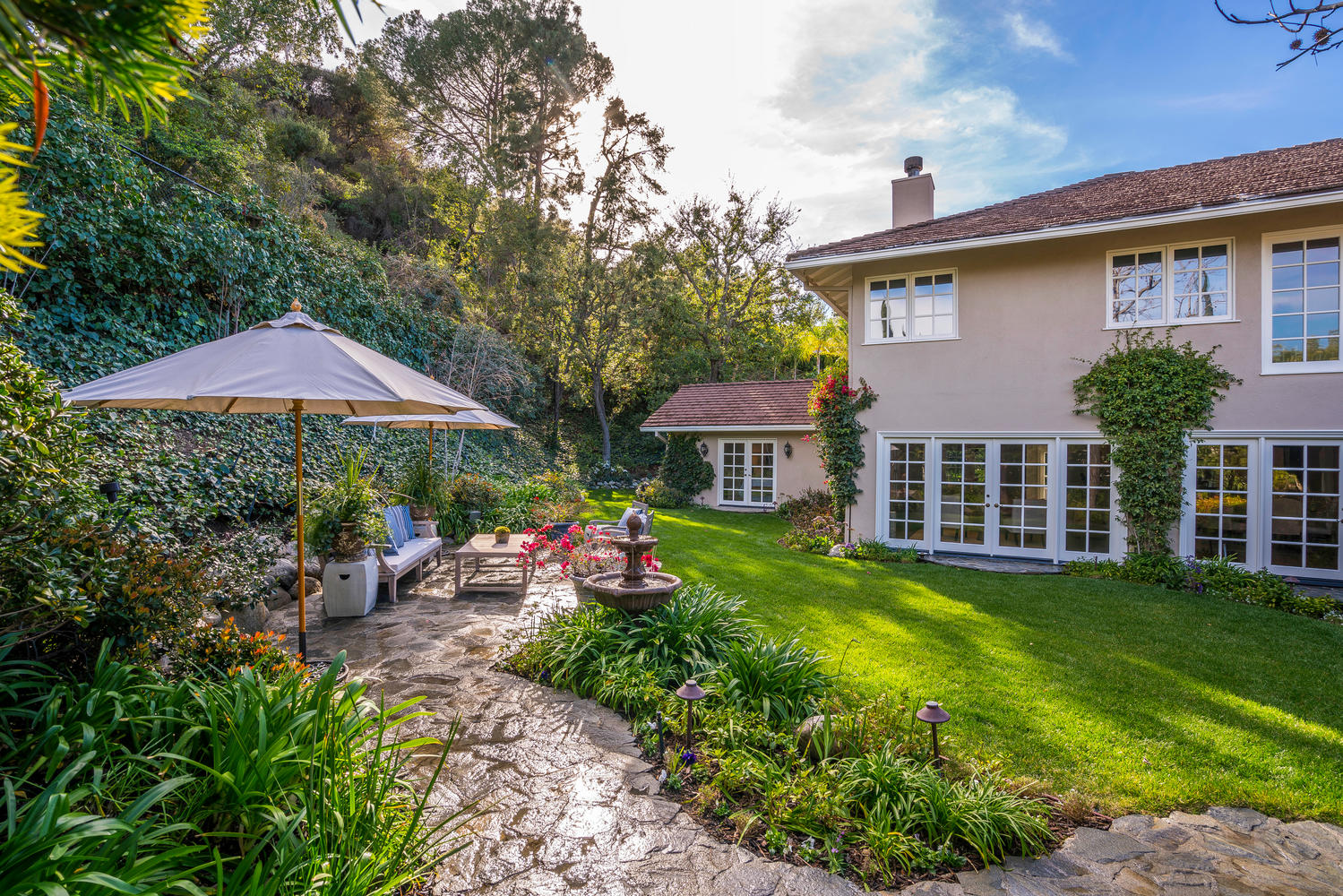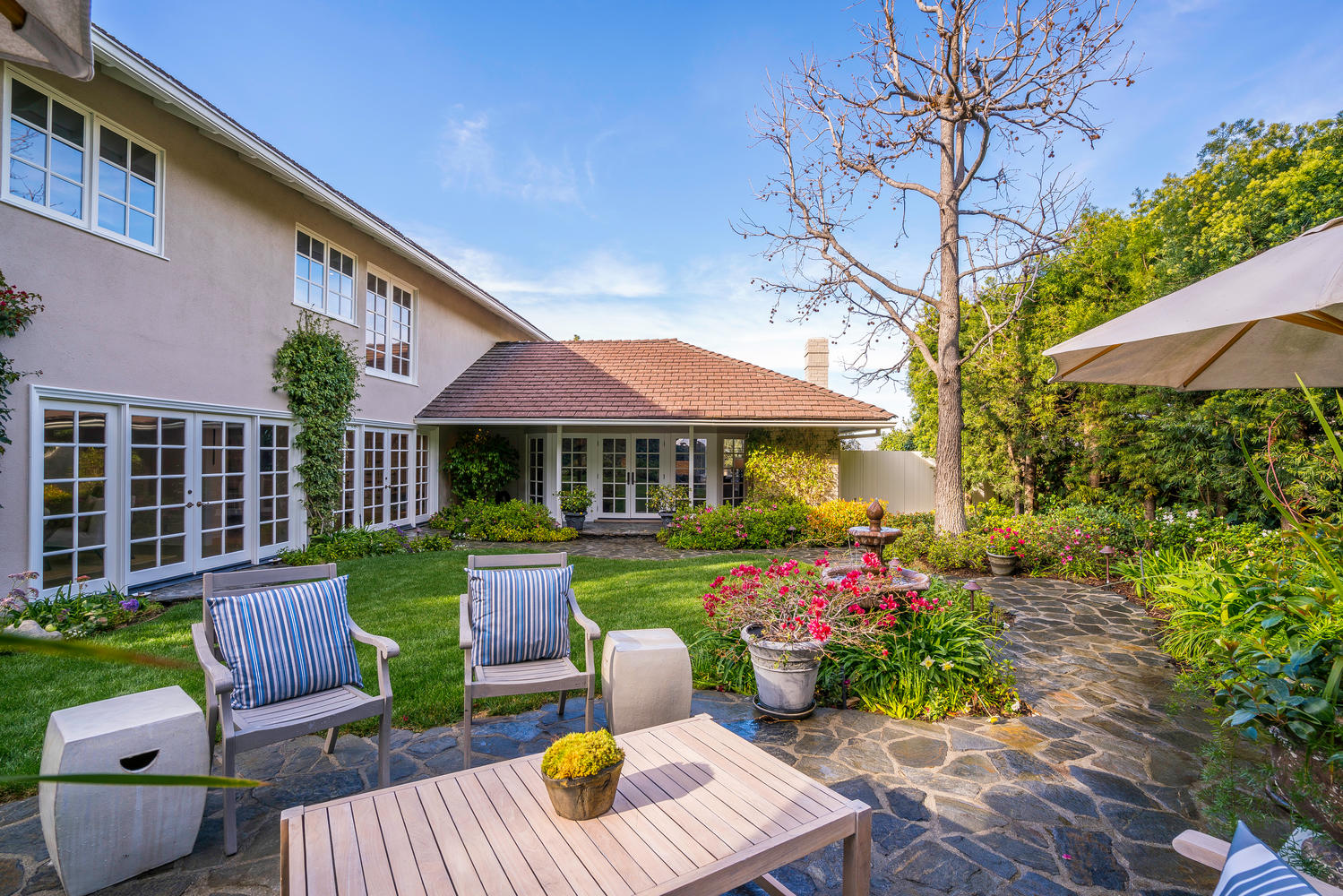 Located in the beautiful hills of Encino, in Lanai Road School District, this charming two-story traditional home is close to Mulholland Drive and extremely 'Westside Convenient'. The home welcomes you with a formal entry of lush greenery, colorful flowers, and beautiful flagstone. Inside, you're greeted by high ceilings, abundant windows, and french doors that bathe the home in natural sunlight. Every room in the home offers beautiful views of the impeccably landscaped private and tranquil gardens and bubbling ornamental fountains that surround the property. Downstairs you'll enjoy: the Formal Living room featuring coffered ceilings, luxurious marble fireplace, and direct access to the yard through French doors-- its the perfect space for entertaining!; a Bright Family room; Kitchen; Formal Dining room; Laundry Room; and a Downstairs Master Suite with its own bathroom and garden access. Upstairs provides three Spacious Bedrooms, plus a highly functional Office with built-in storage and desks. The upstairs Master Suite features high, coved ceilings, gorgeous fireplace, spacious walk-in closet, makeup area, luxurious master bath with dual sinks, soaking tub, and over-sized shower. But young kids will be most excited about the Secret "Kids-Only-Space" in the upstairs bedroom - it makes a perfect added playroom for tea-parties or hide-outs! This location offers you the ideal 'Reverse-Commute' down to Ventura Blvd and up to Mulholland. This is the home you've been searching for!