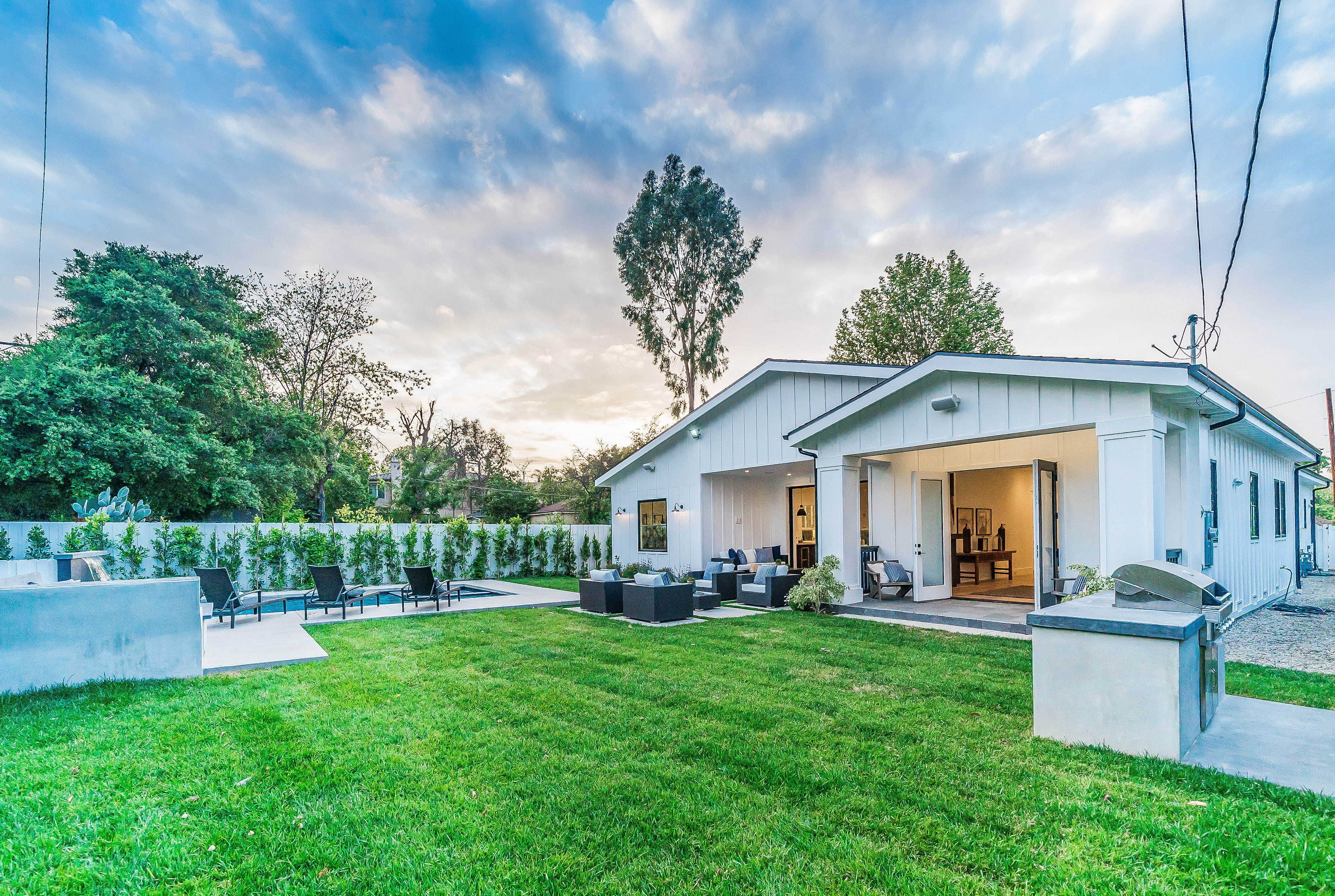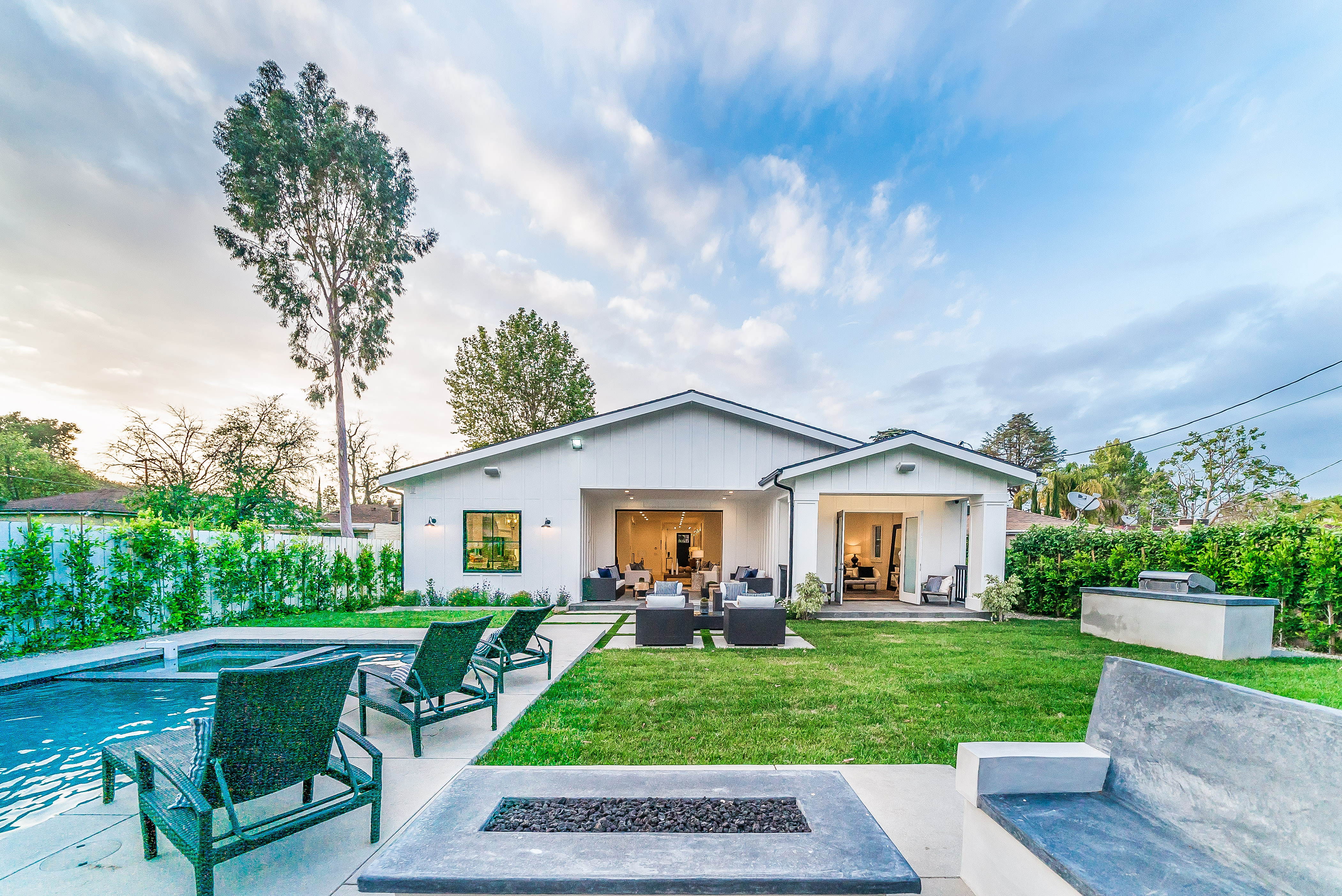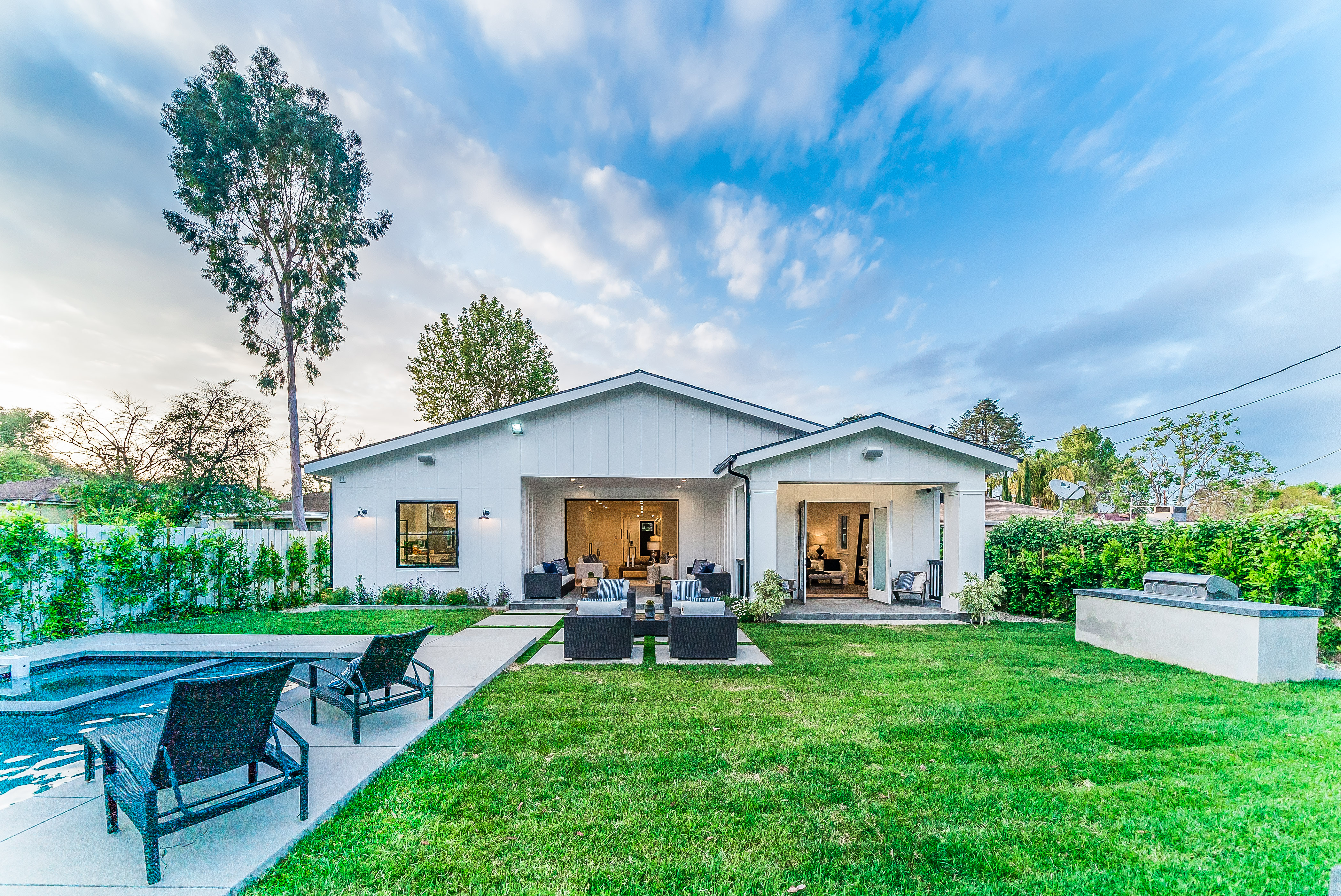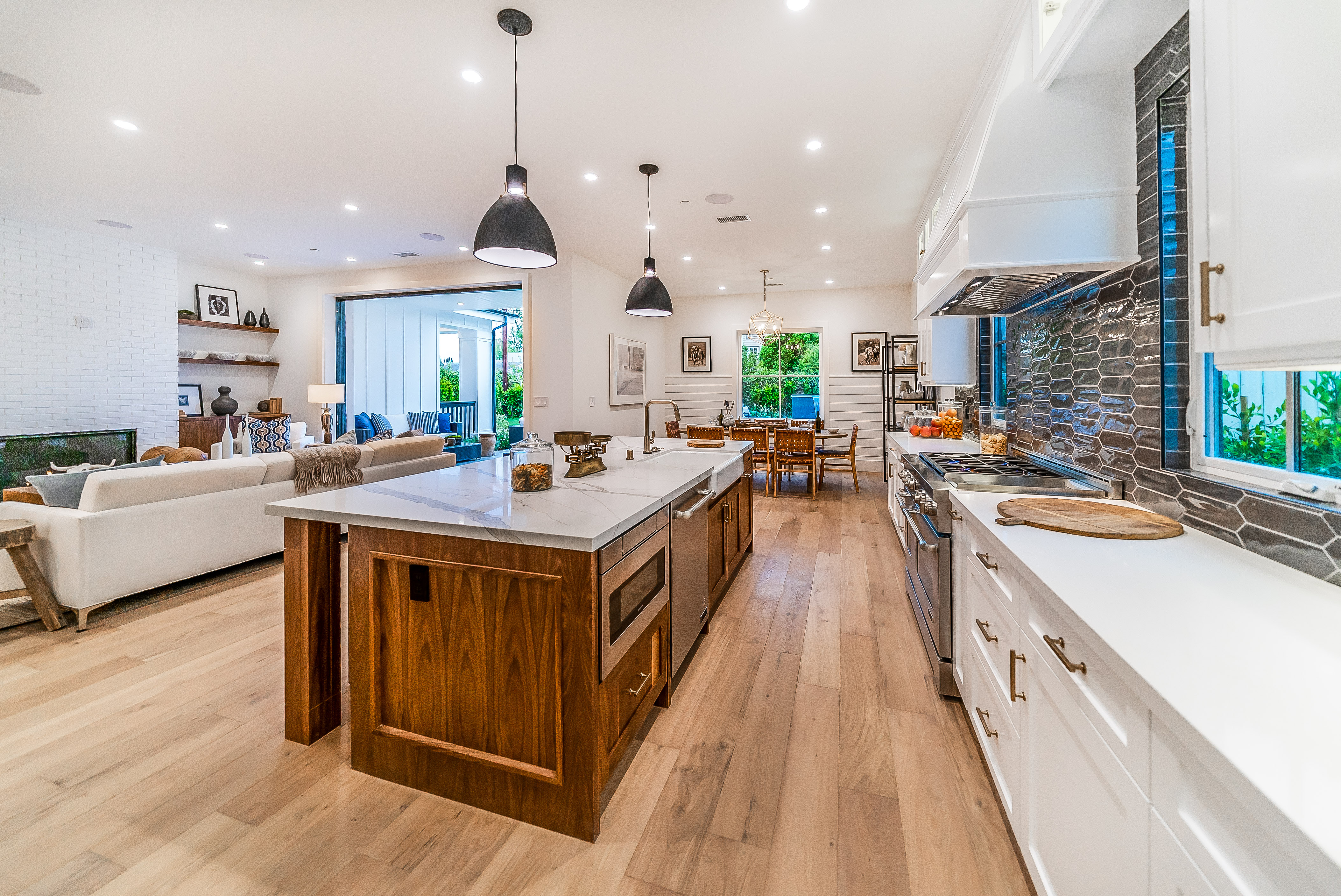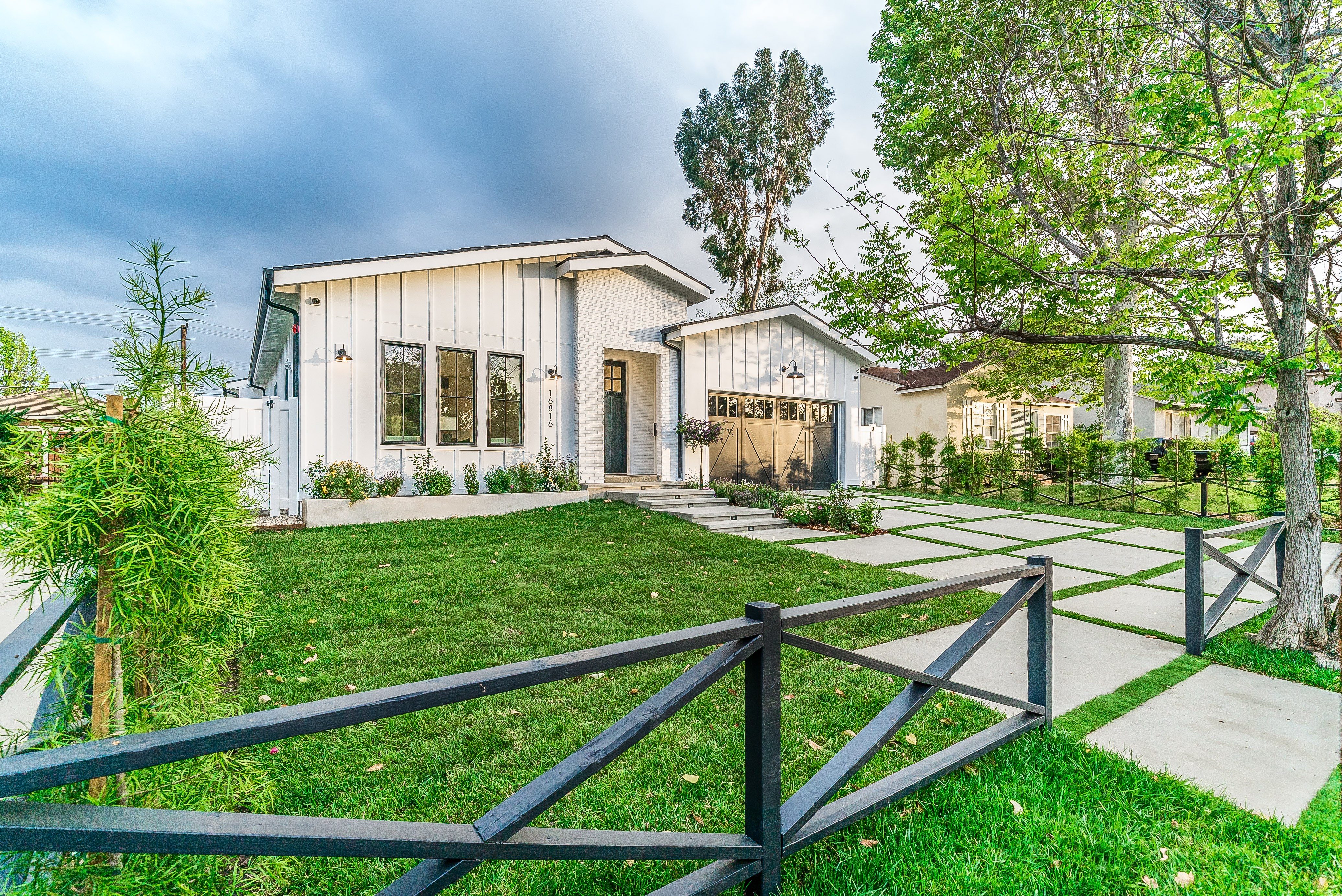 Situated in a quaint family neighborhood in Encino, this striking new custom designed home perfectly balances modern sophistication and timeless classic style. Pass lush landscaped grounds as you walk through the front doors and are greeted by soaring ceilings, white oak flooring, a bright open floor plan that flows seamlessly across all main living areas. A grand formal living room for entertaining with large windows that bring in natural light. With approx. 3,600 square-feet of designer living space boasting 4 ensuite bedrooms with built-in closets, 4.5 bathrooms all laid out on a 9,000 square-foot lot! Amenities include a custom glass-enclosed wine cellar, dining area with paneled wall+ceiling details, industrial style light fixtures and beautiful flooring. The living room hosts a sleek white brick fireplace accompanied by custom built-ins & tall glass sliding doors. The chef’s kitchen comes complete with high-end appliances, stone countertops & center island with farmhouse sink, separate breakfast area, & a butler’s pantry. The master bedroom is one to boast about, with a custom walk-in closet, high pitched ceilings and elegant master bathroom. Perfect single story family home!